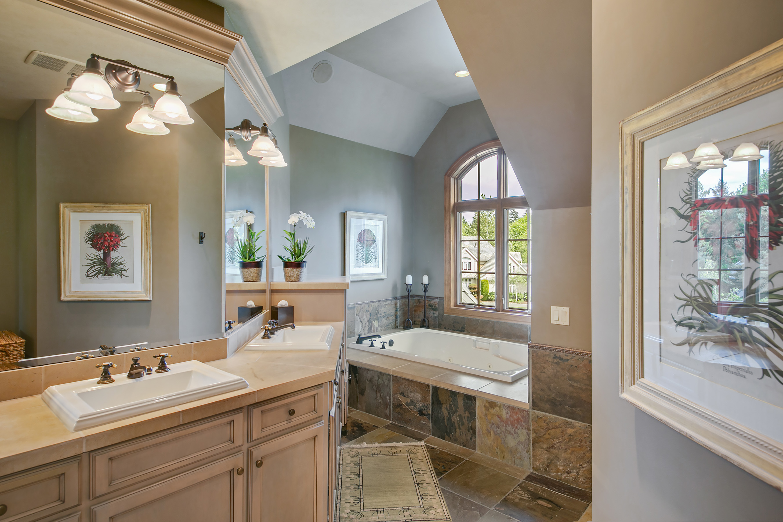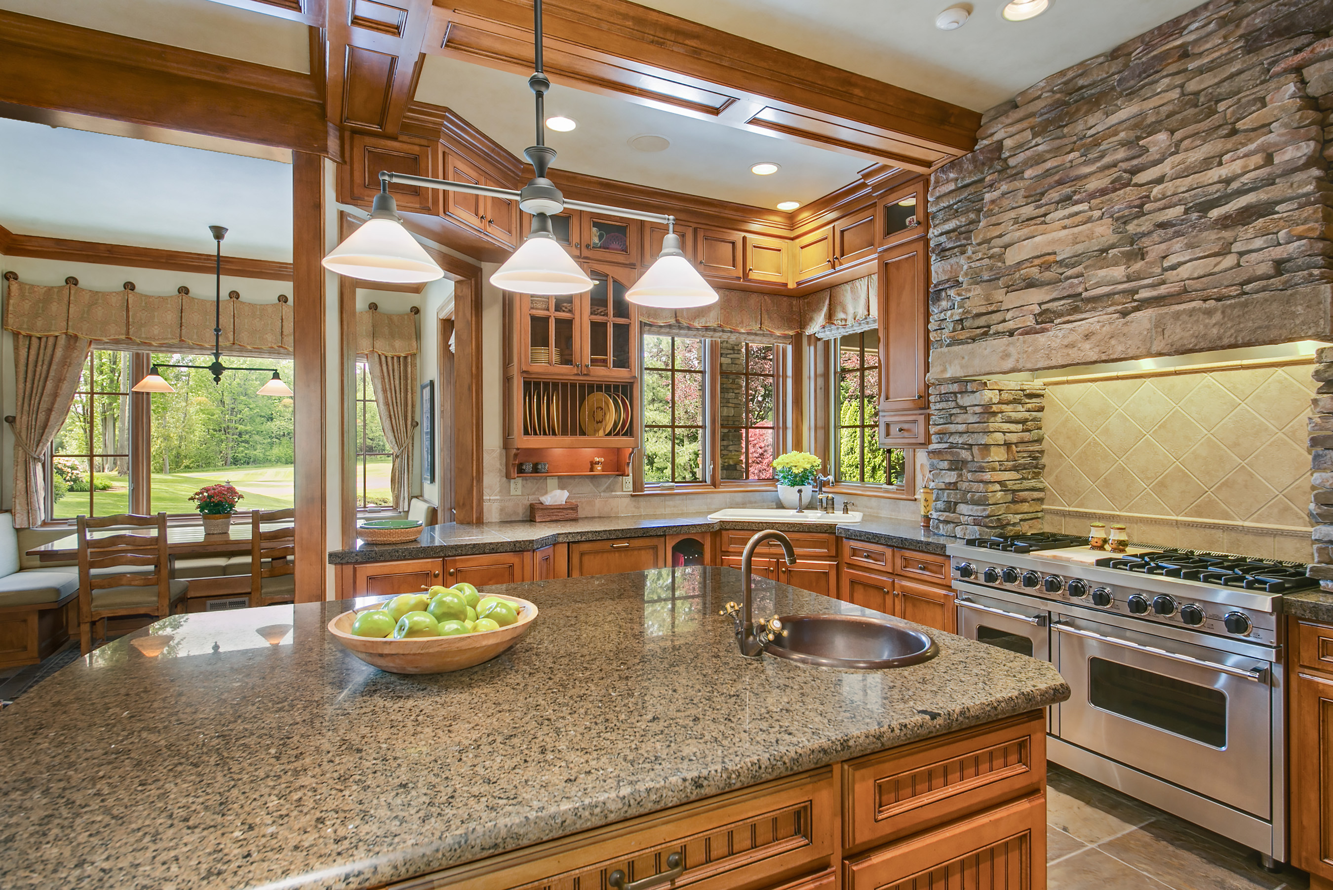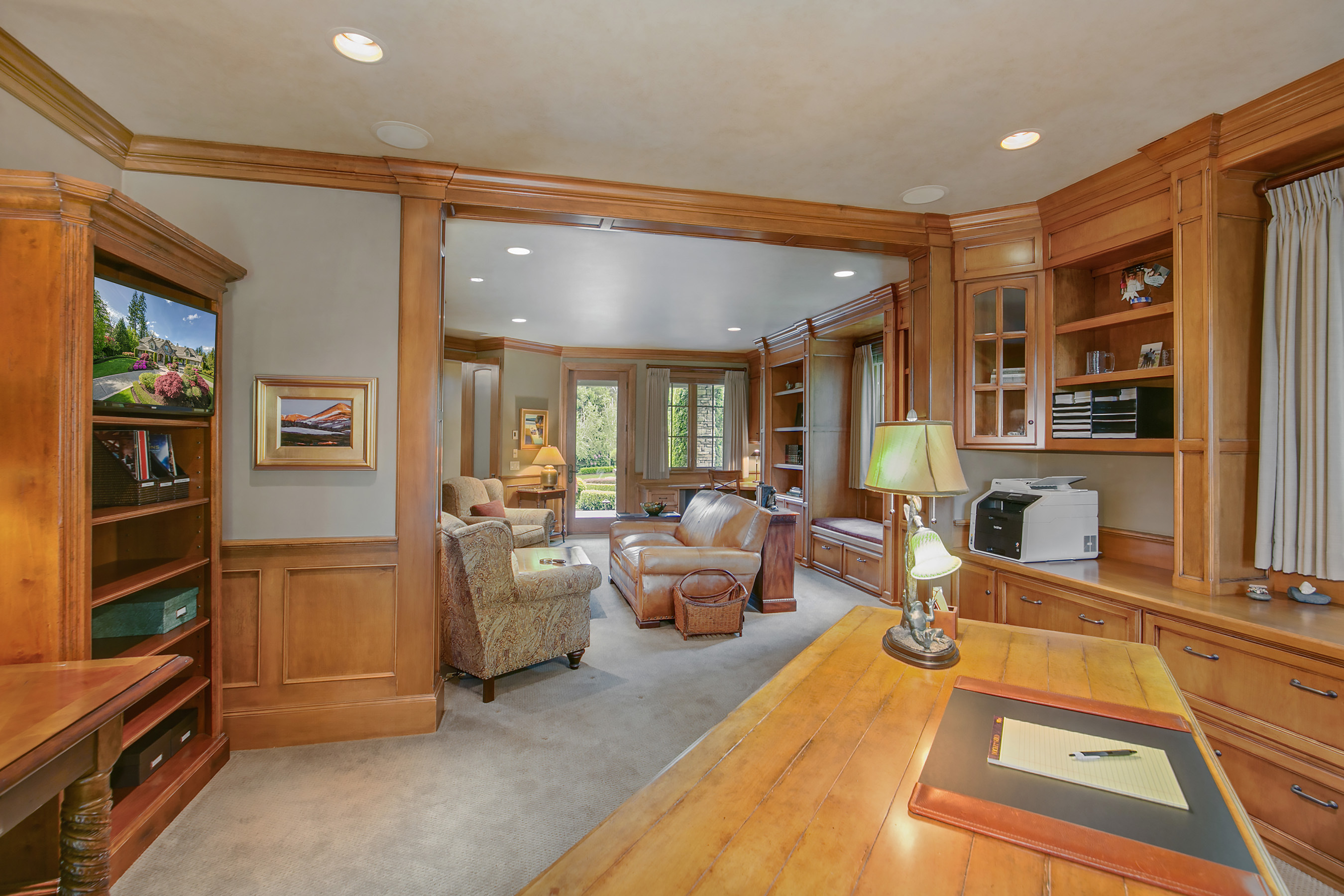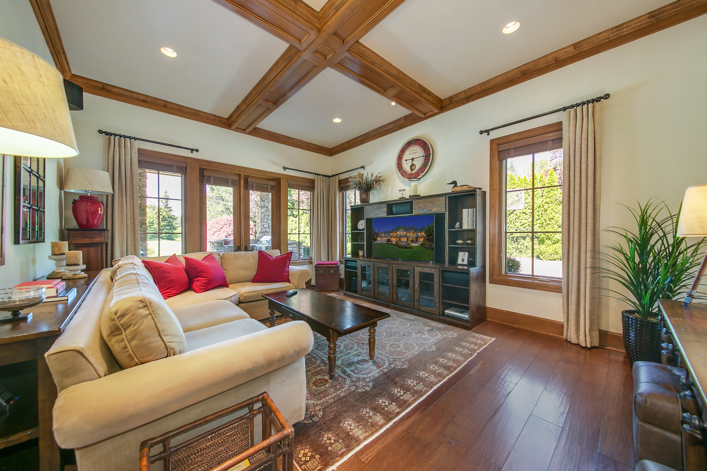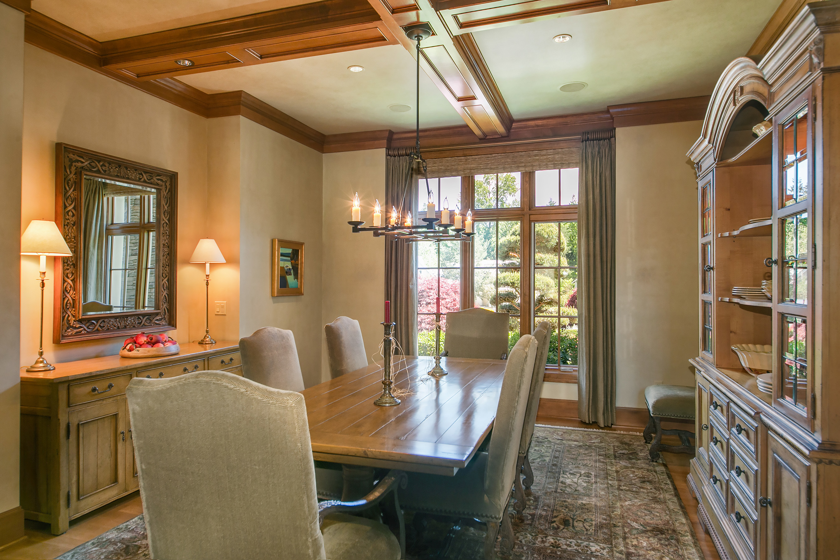Walk out onto the 12th green from this sophisticated Windsor Greens estate, rich in architectural detailing with soaring coffered ceilings and refined woodwork surrounded by perfectly manicured landscaping. Distinctly NW in character and grand in scale. Chef's kitchen w/Viking gas range, slate floors and granite slab counters. Take in tranquil golf course views and expansive patio from the private master wing w/soaking tub and walk-in shower. Spacious lower level complete w/game rm and wine cellar.