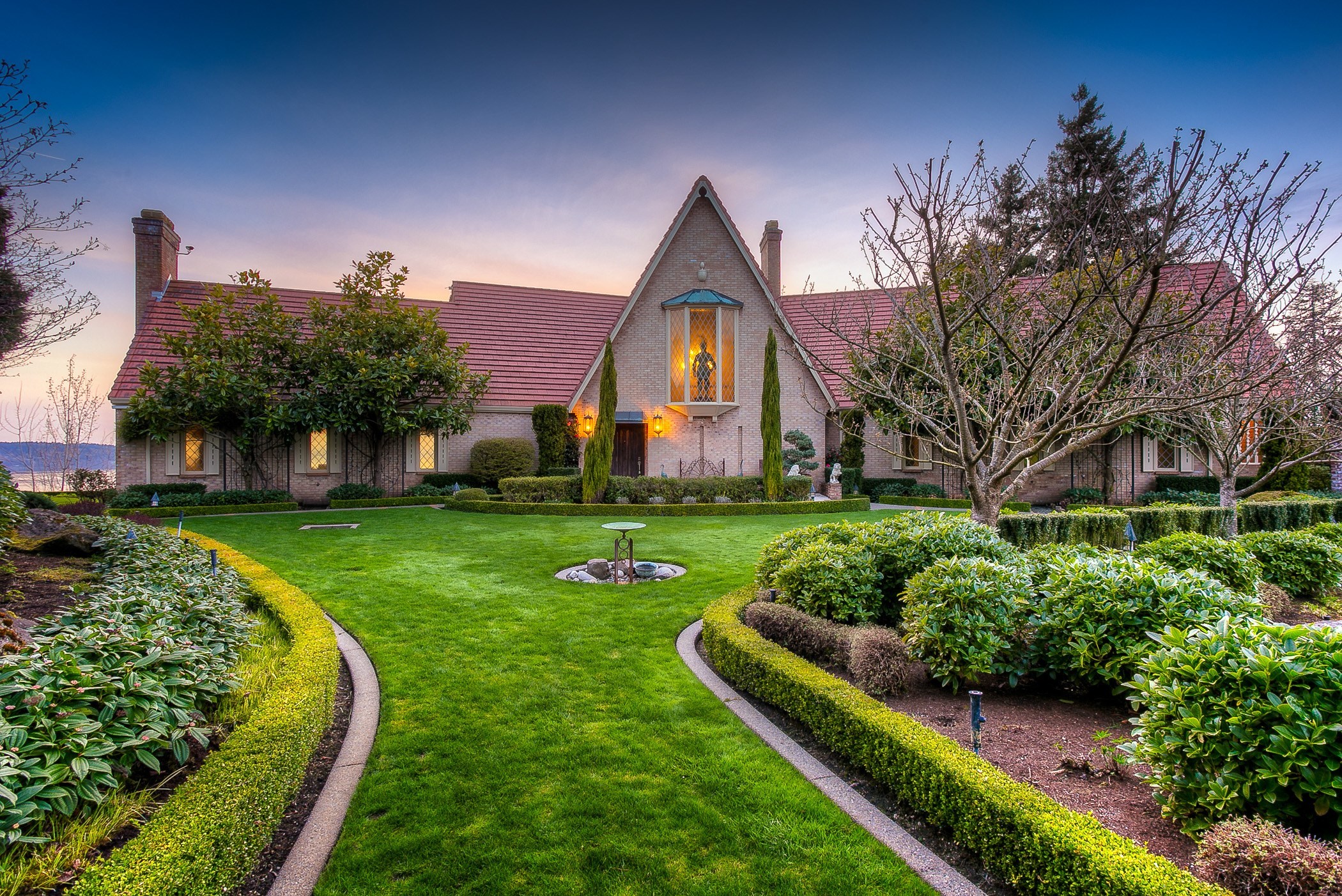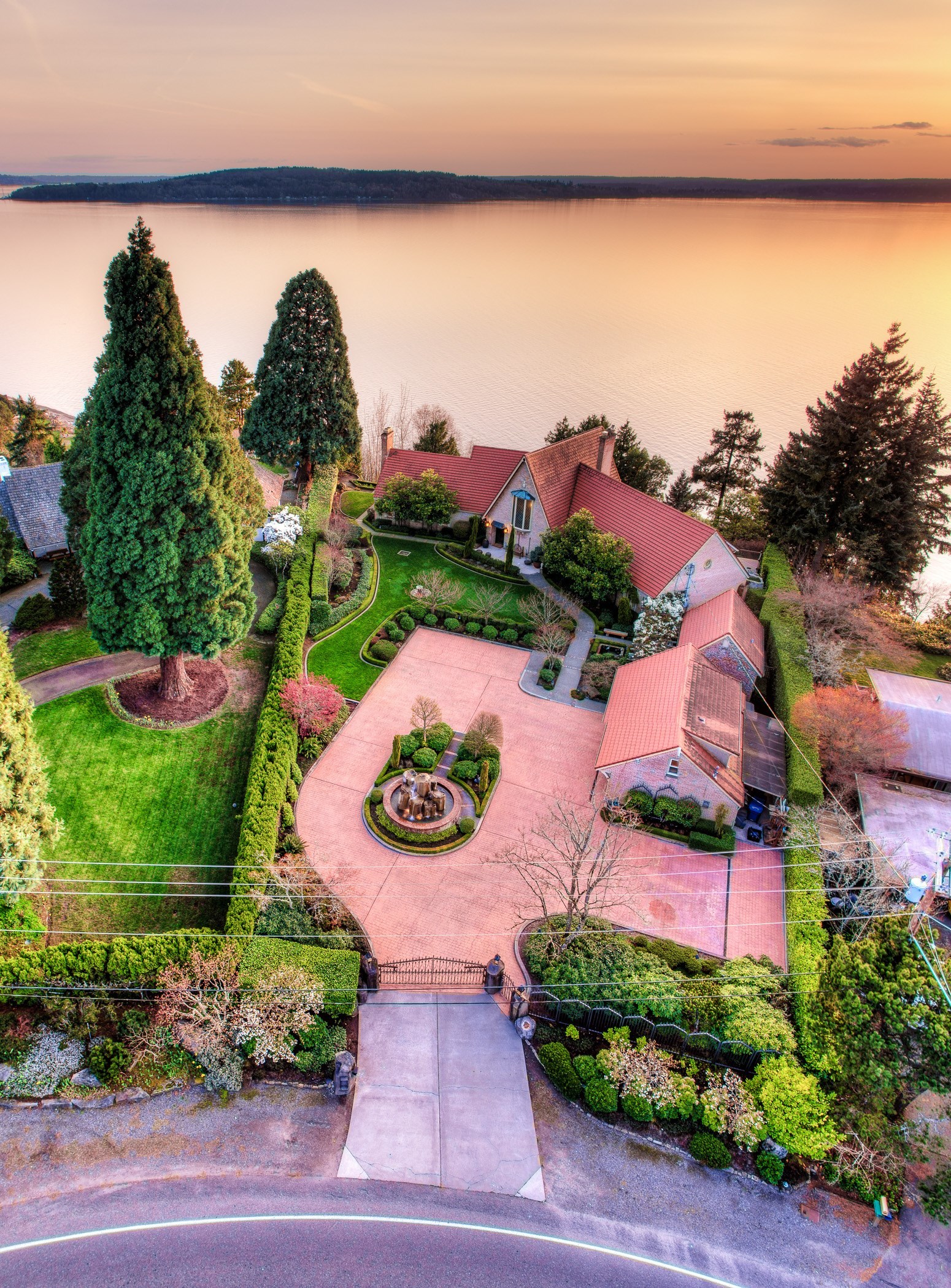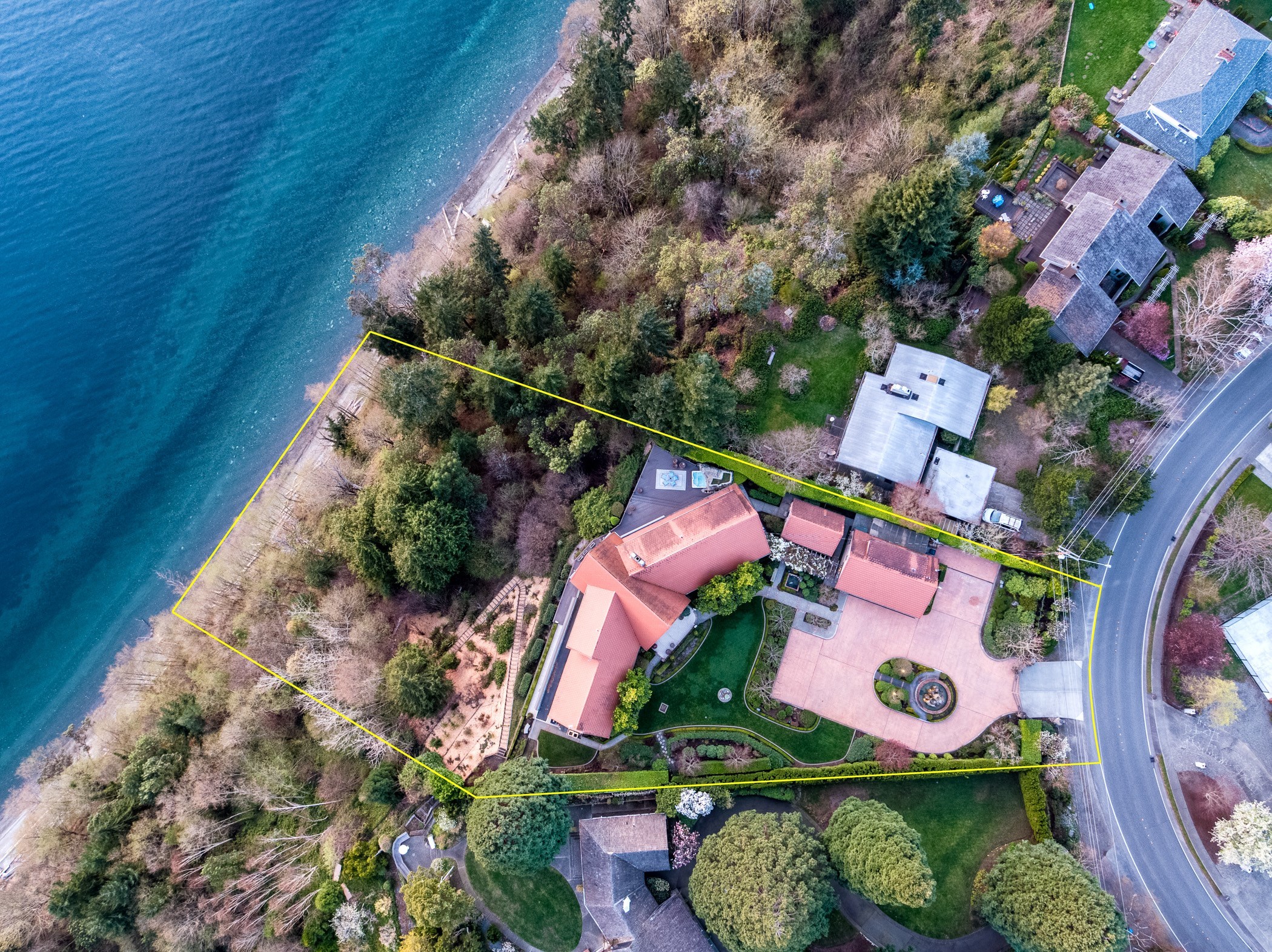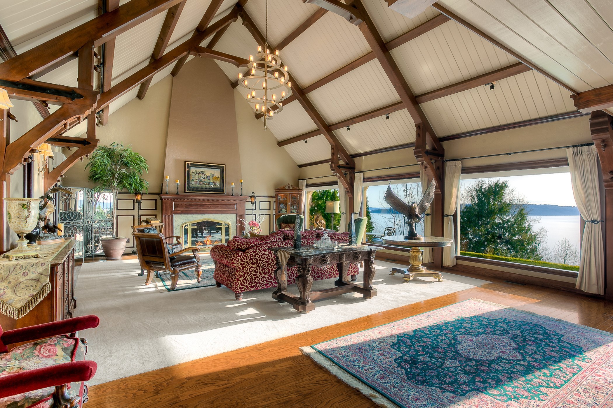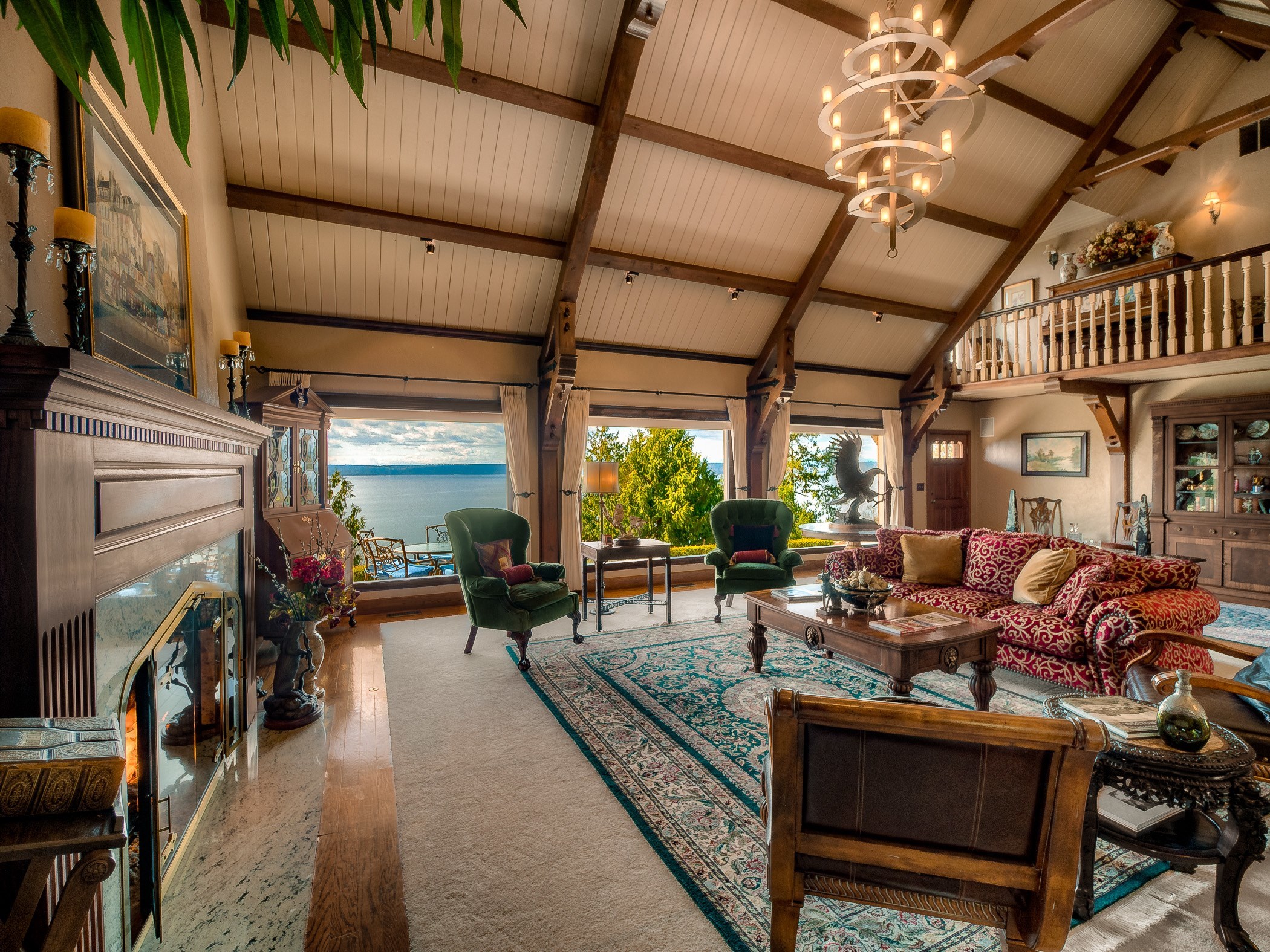 European Tudoresque architectural flair, meets NW luxury WATERFRONT living. Commanding Puget Sound and Mountain views. Massive boulders to splashing fountains captivate; while the work of master craftsmen shows everywhere The grand ballroom sized living room with soaring ceilings is perfect for entertaining. Main floor master suite plus upstairs master suite just off the billiards room. Park-like grounds, hot tub grotto, bath house with wet and dry saunas, full guest apartment and so much more.