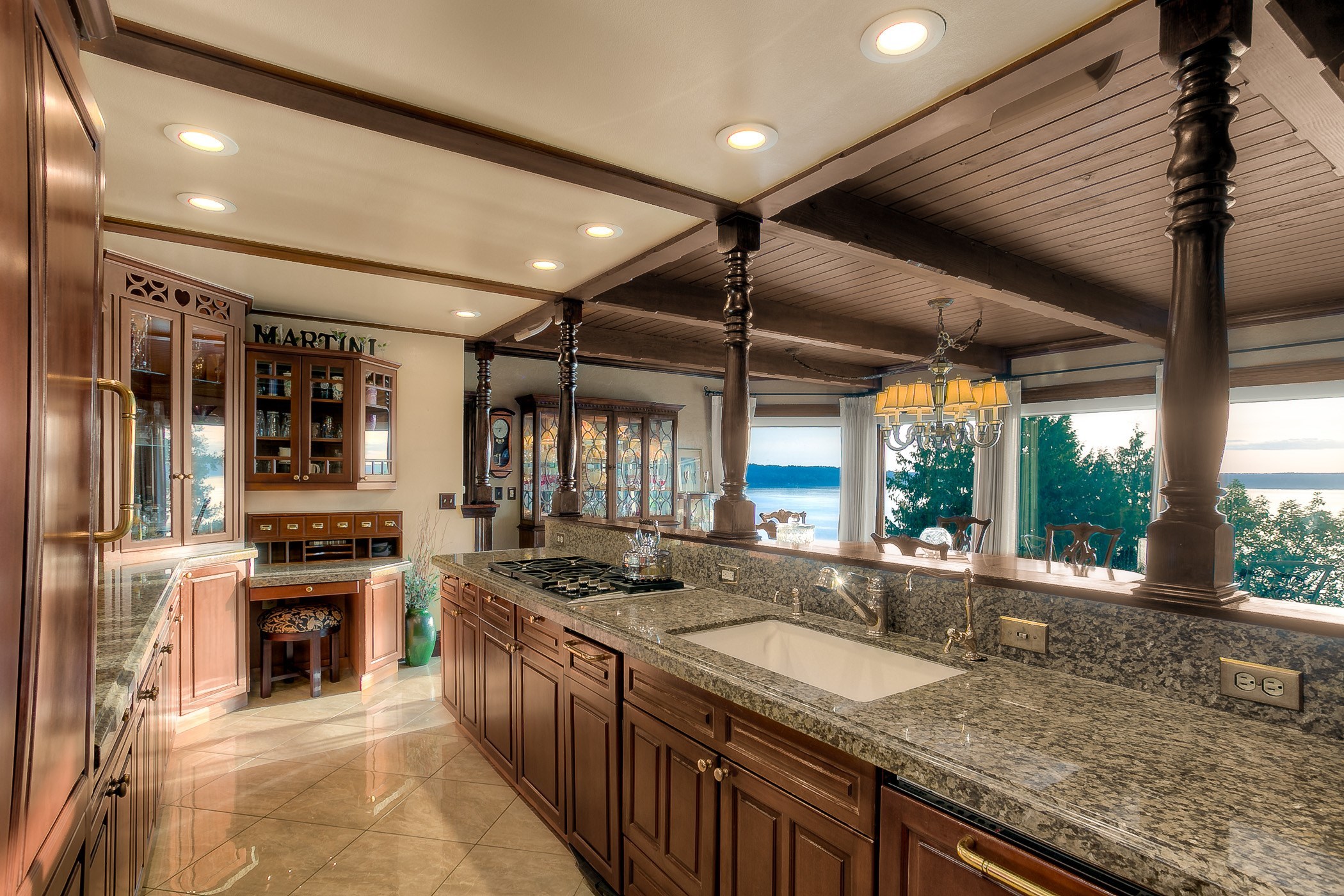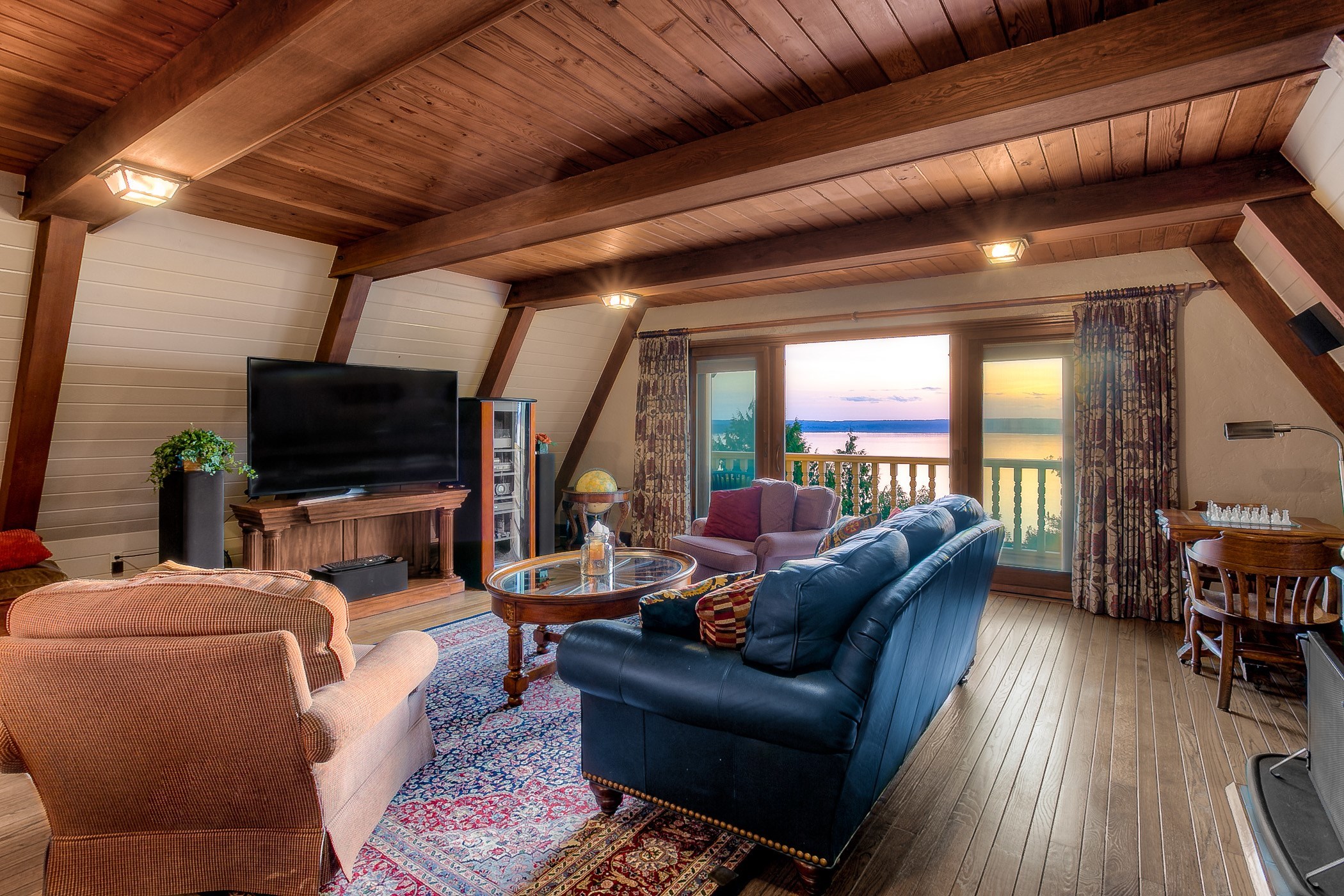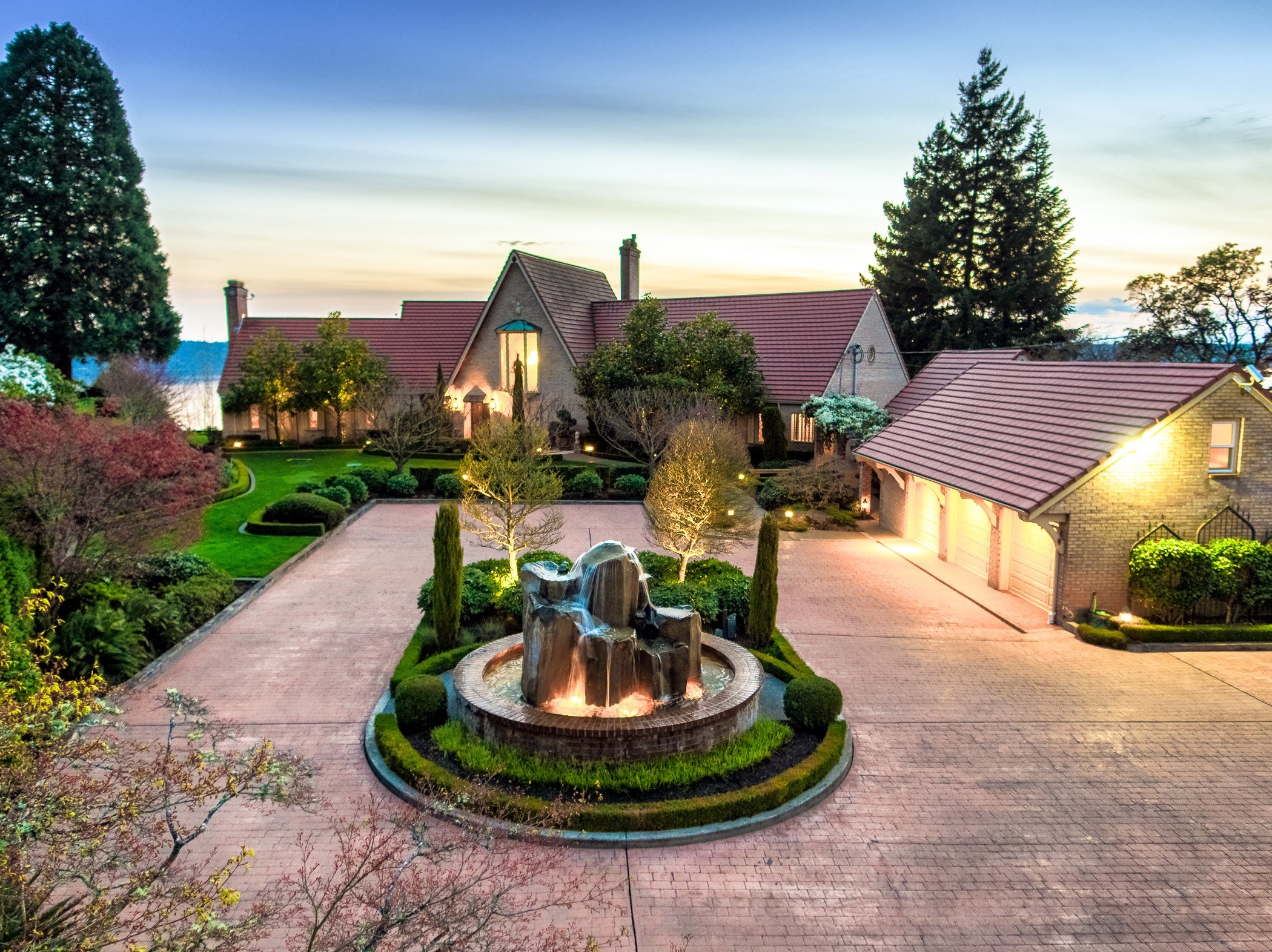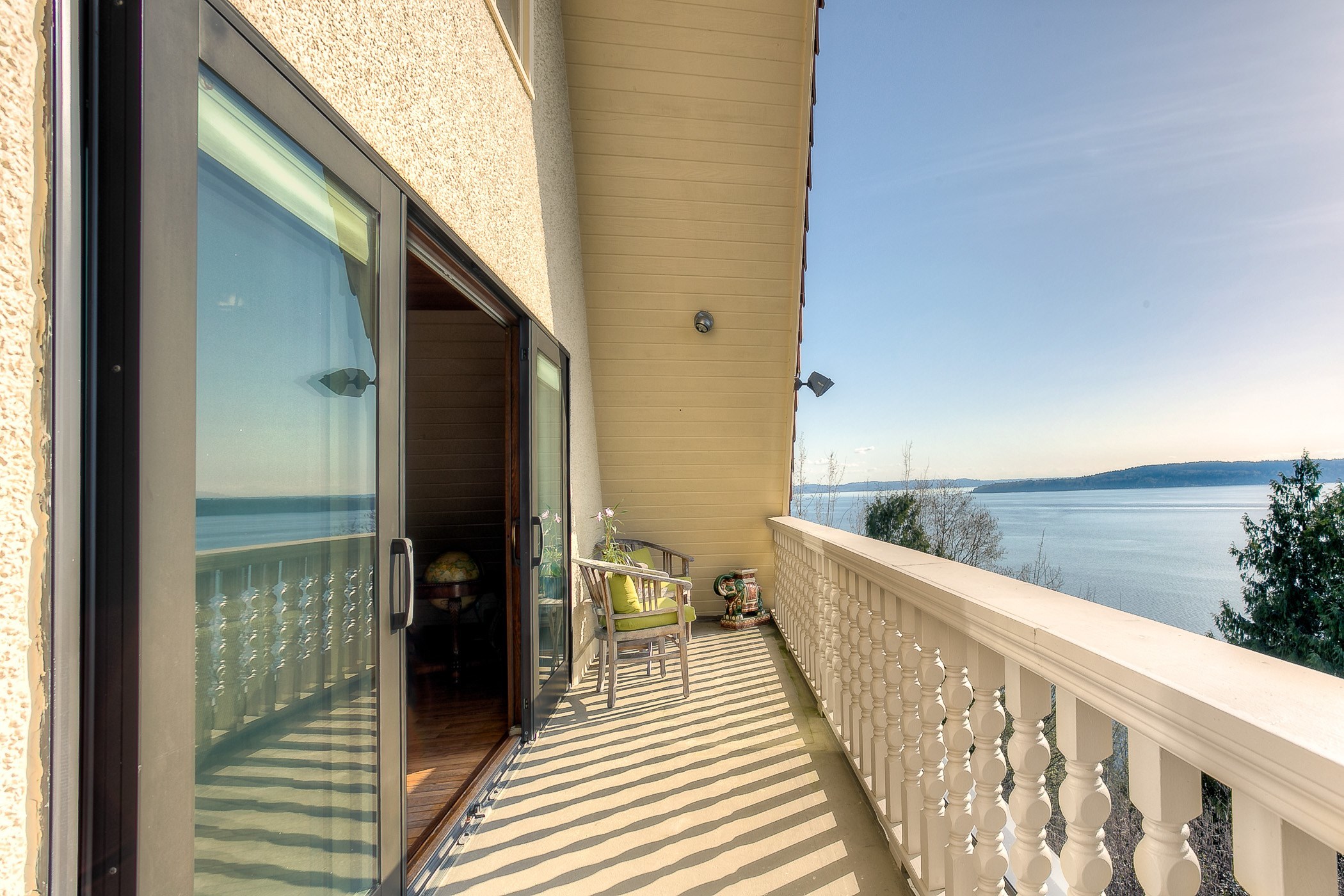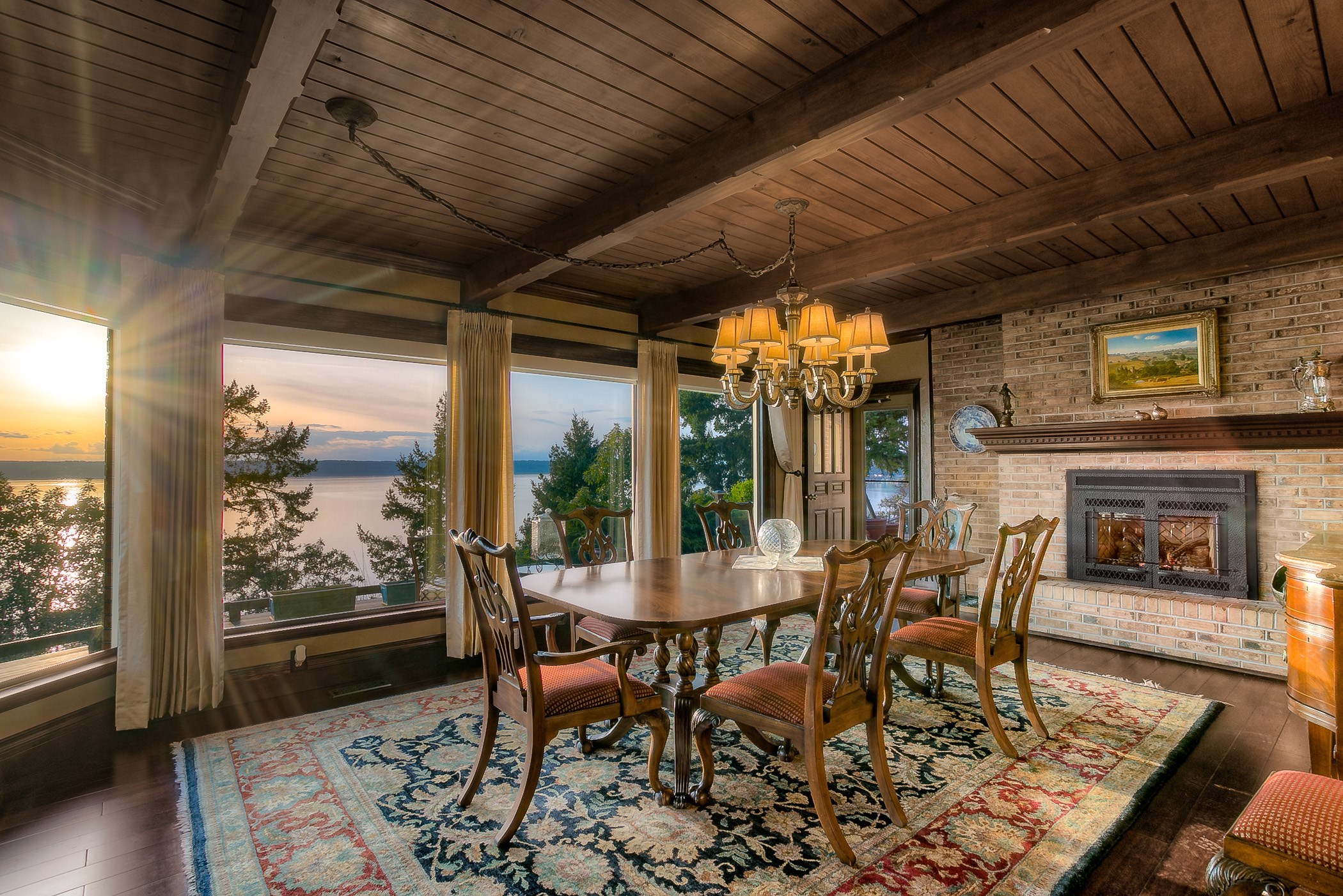 European Tudoresque architectural flair, meets NW luxury WATERFRONT living. Commanding Puget Sound and Mountain views. Massive boulders to splashing fountains captivate; while the work of master craftsmen shows everywhere The grand ballroom sized living room with soaring ceilings is perfect for entertaining. Main floor master suite plus upstairs master suite just off the billiards room. Park-like grounds, hot tub grotto, bath house with wet and dry saunas, full guest apartment and so much more.