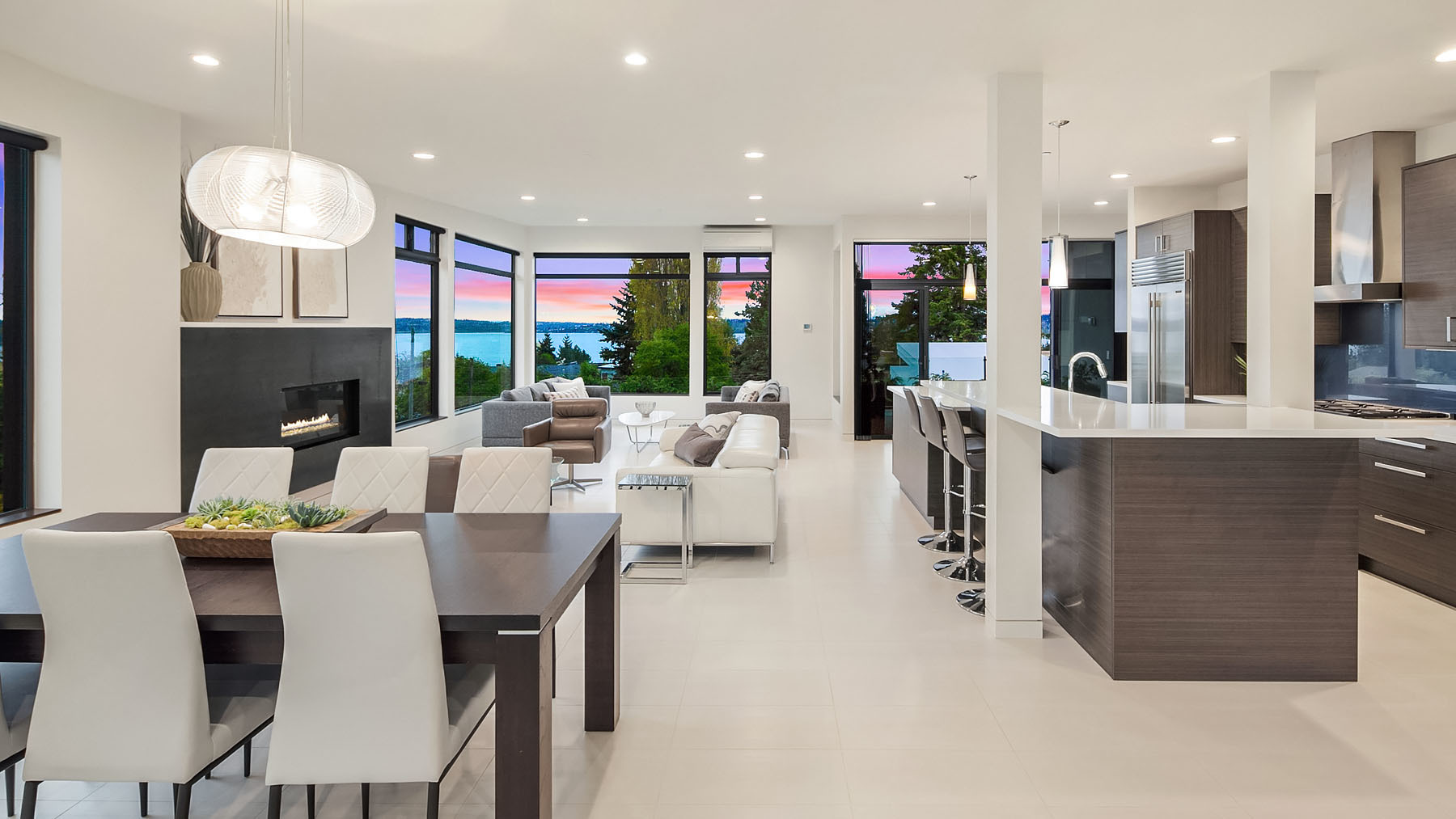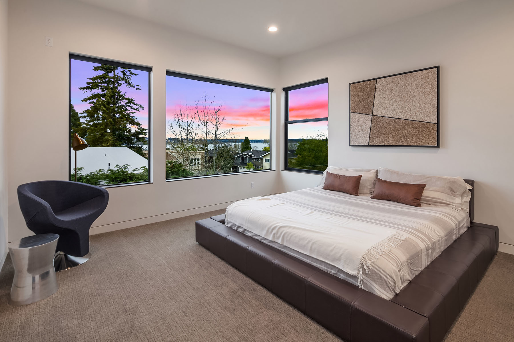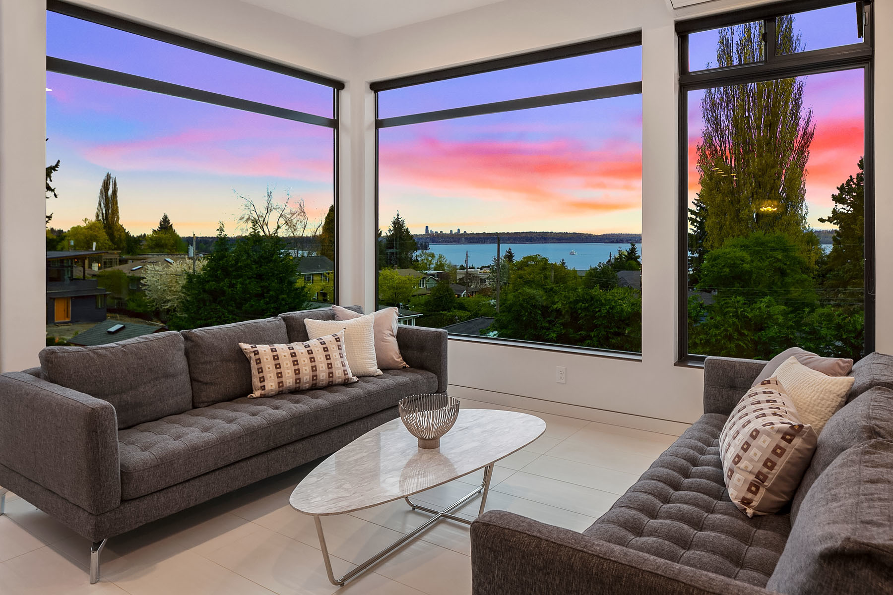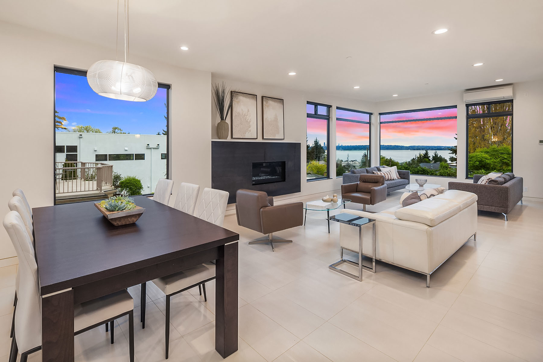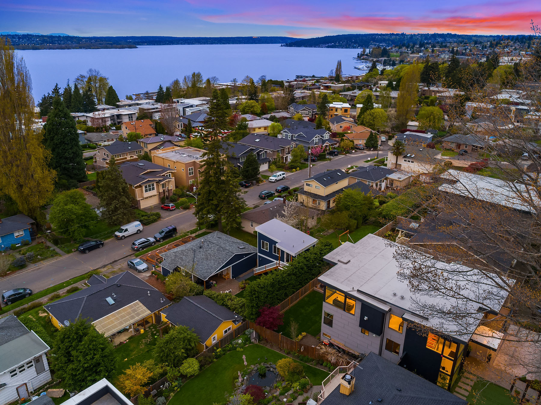 In a premier location, this Lakeview Modern is an easy walk to waterfront, Google and award winning Lakeview Elem. Steel pivot door opens to sleek, sophisticated interiors that have been expertly curated. Floating steel staircase w frameless glass railing leads to a sprawling upper floor. Walls of windows throughout frame sweeping views of Lake Washington, Seattle skyline, and Olympic Mountains. Ample outdoor spaces, 4 decks and fenced yard. Lower level, 1646sf ADU w 2 bed/1ba, full kitchen and w/d.
