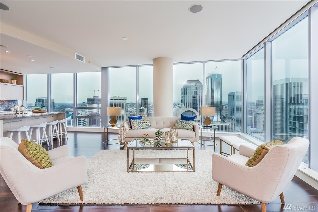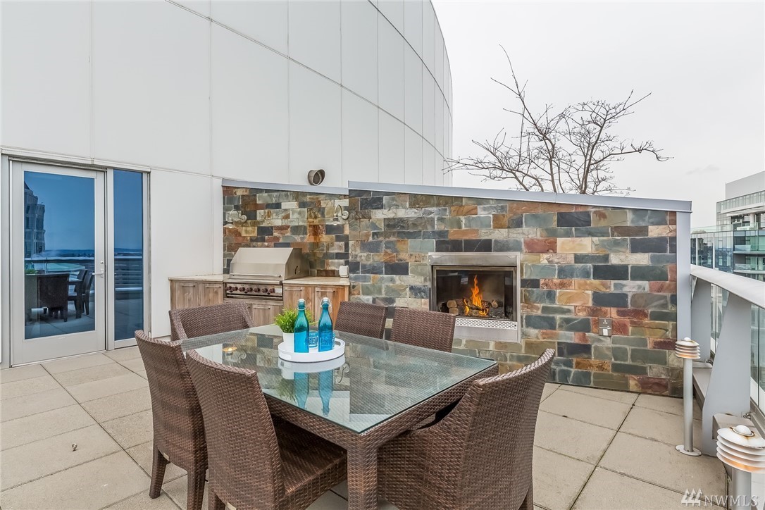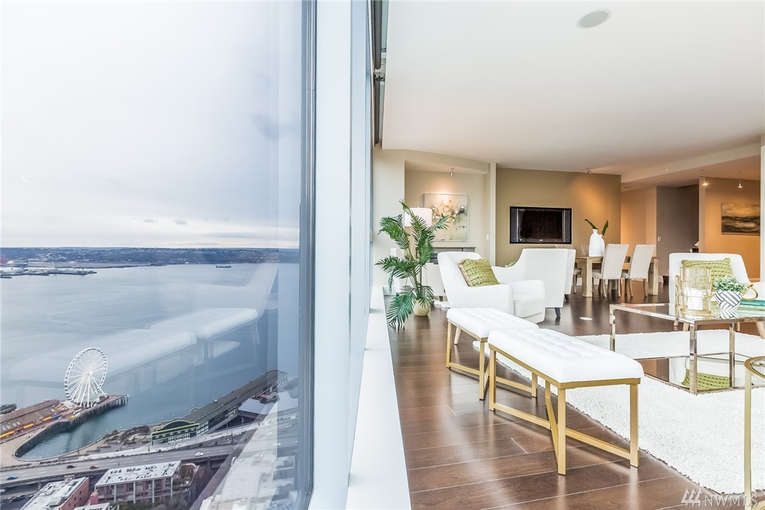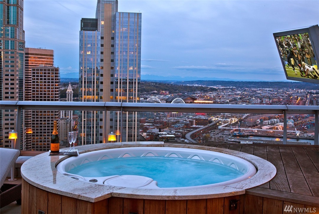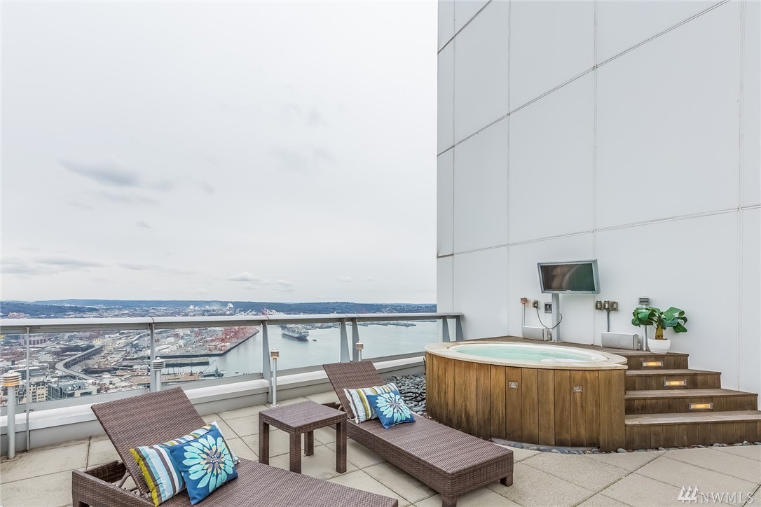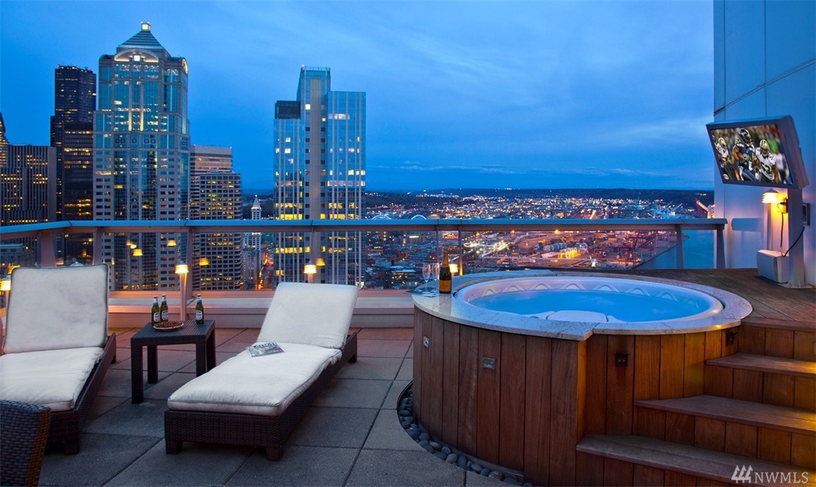 Seattle Point of View- High atop one of the most coveted buildings within the vibrant heart of the city awaits a singularly spectacular two bedroom penthouse residence- uncompromised luxury appointments throughout. A truly inspiring entertaining experience awaits on the second level- emerge to immersive views of Elliott Bay & cityscape from your own private rooftop deck- complete with hot tub, TV, sound system, fireplace & BBQ. Steps to the Market, dining, retail district, museums & light rail.
