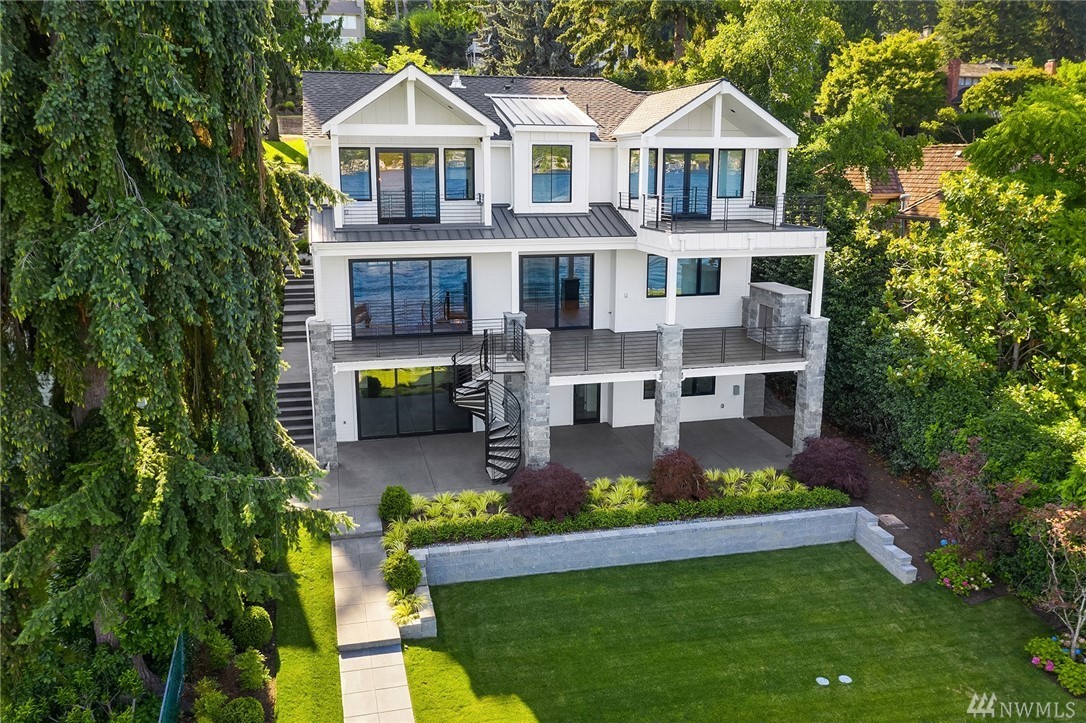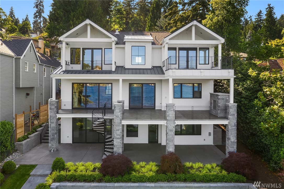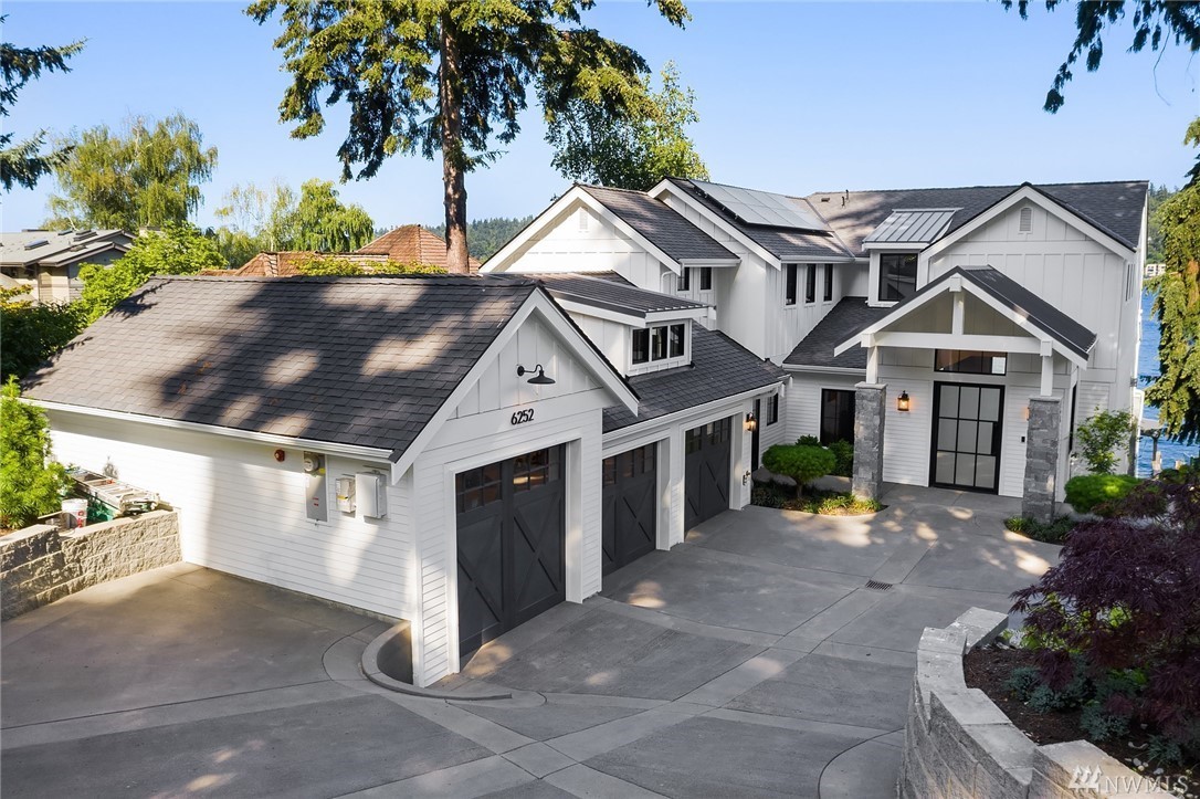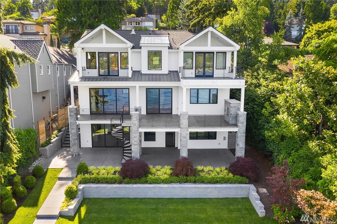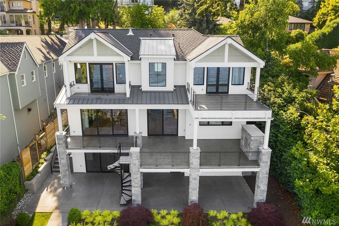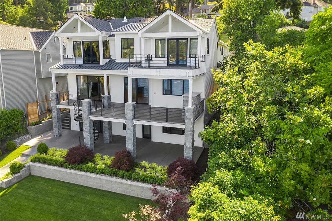 Mercer Island waterfront with new construction modern farmhouse.The home has a beautiful open design ideal for entertaining Great room & stunning kitchen open to the deck with lake & mountain views. Wonderful fixtures accent the home, gorgeous cabinetry,quartz counters,steel accents,floating stair, & custom two sided wine wall.Master suite is luxurious with a spa like bath, fireplace & private balcony. Media, game room & guest suite. Private setting. Docks for large & small boats.May Completion