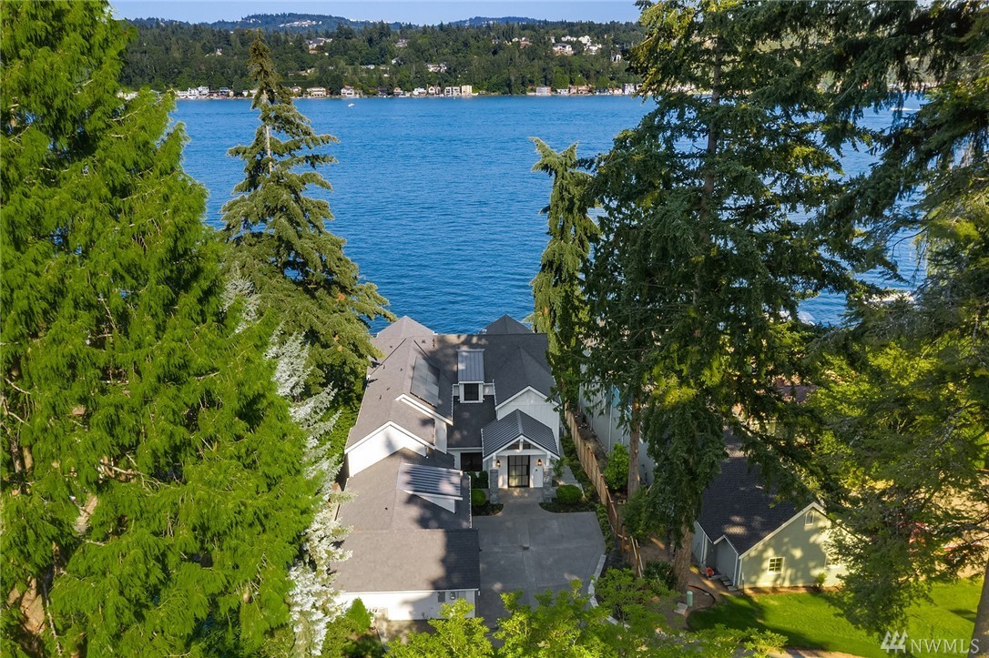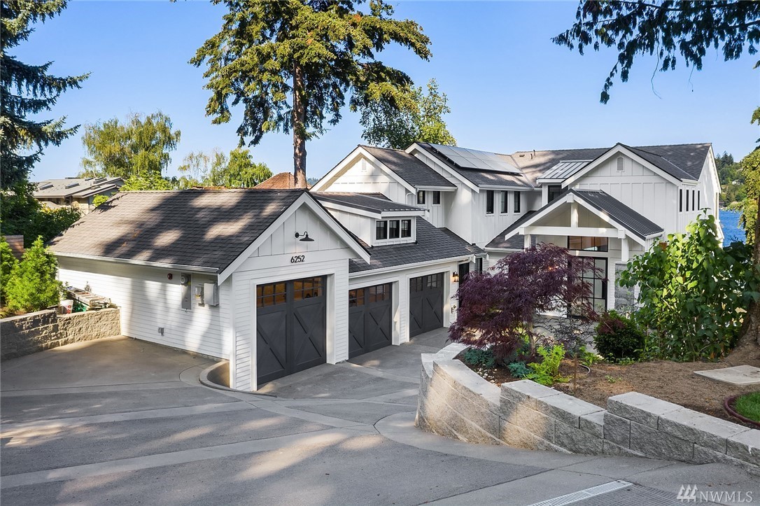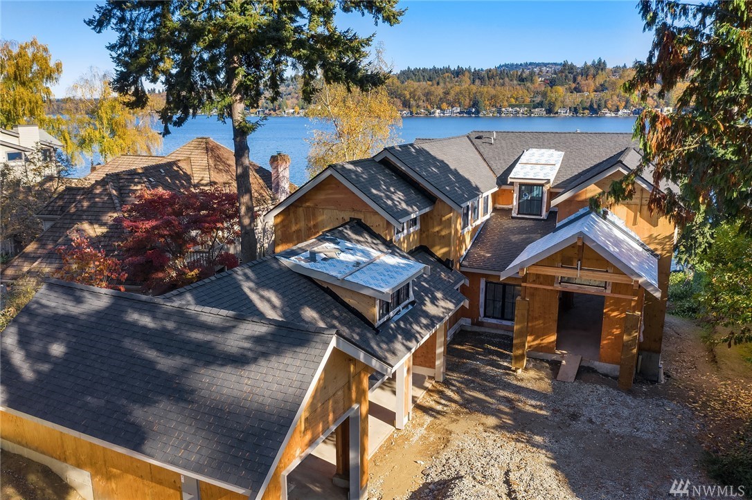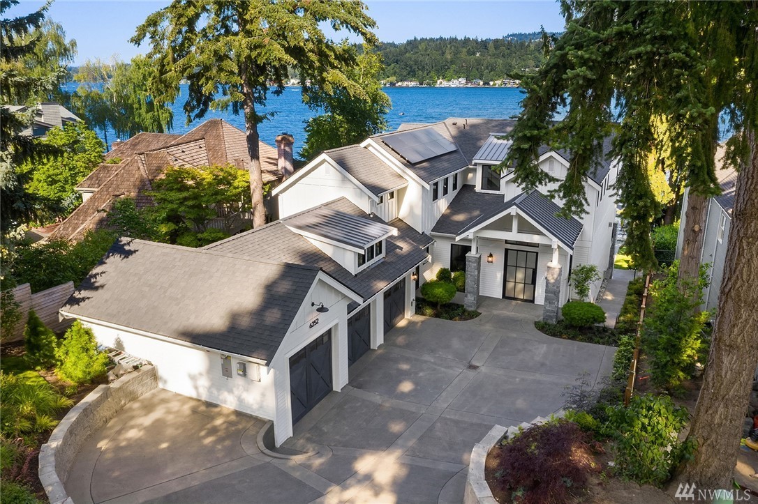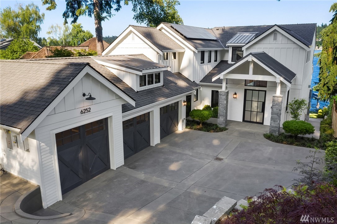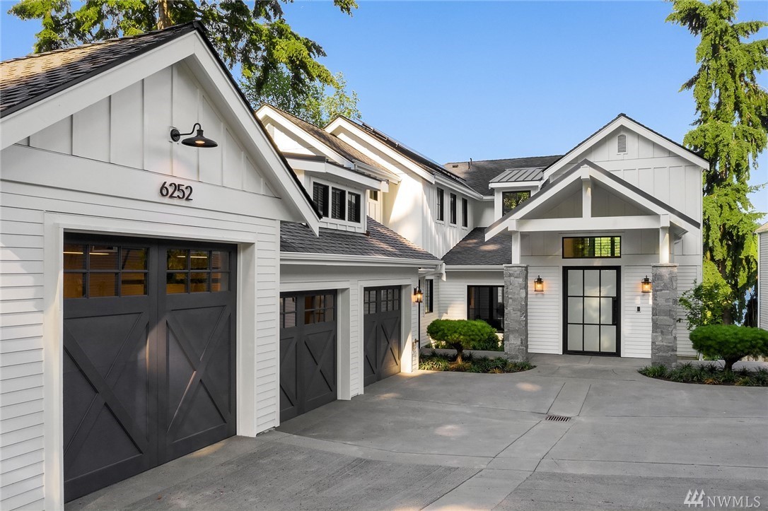 Mercer Island waterfront with new construction modern farmhouse.The home has a beautiful open design ideal for entertaining Great room & stunning kitchen open to the deck with lake & mountain views. Wonderful fixtures accent the home, gorgeous cabinetry,quartz counters,steel accents,floating stair, & custom two sided wine wall.Master suite is luxurious with a spa like bath, fireplace & private balcony. Media, game room & guest suite. Private setting. Docks for large & small boats.May Completion
