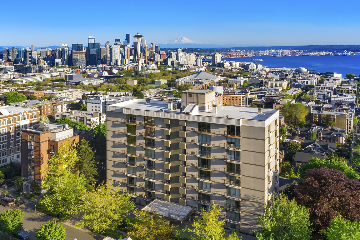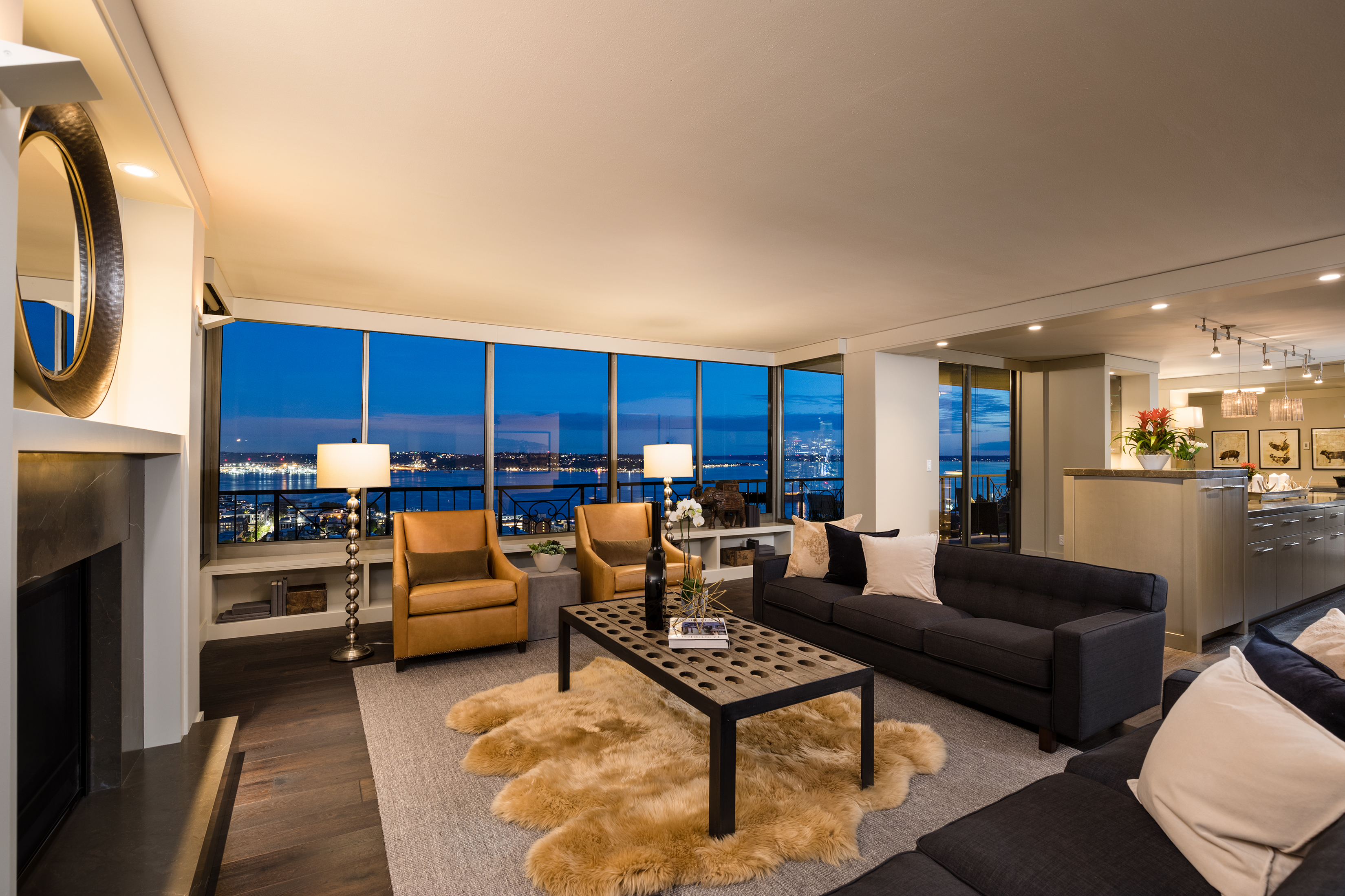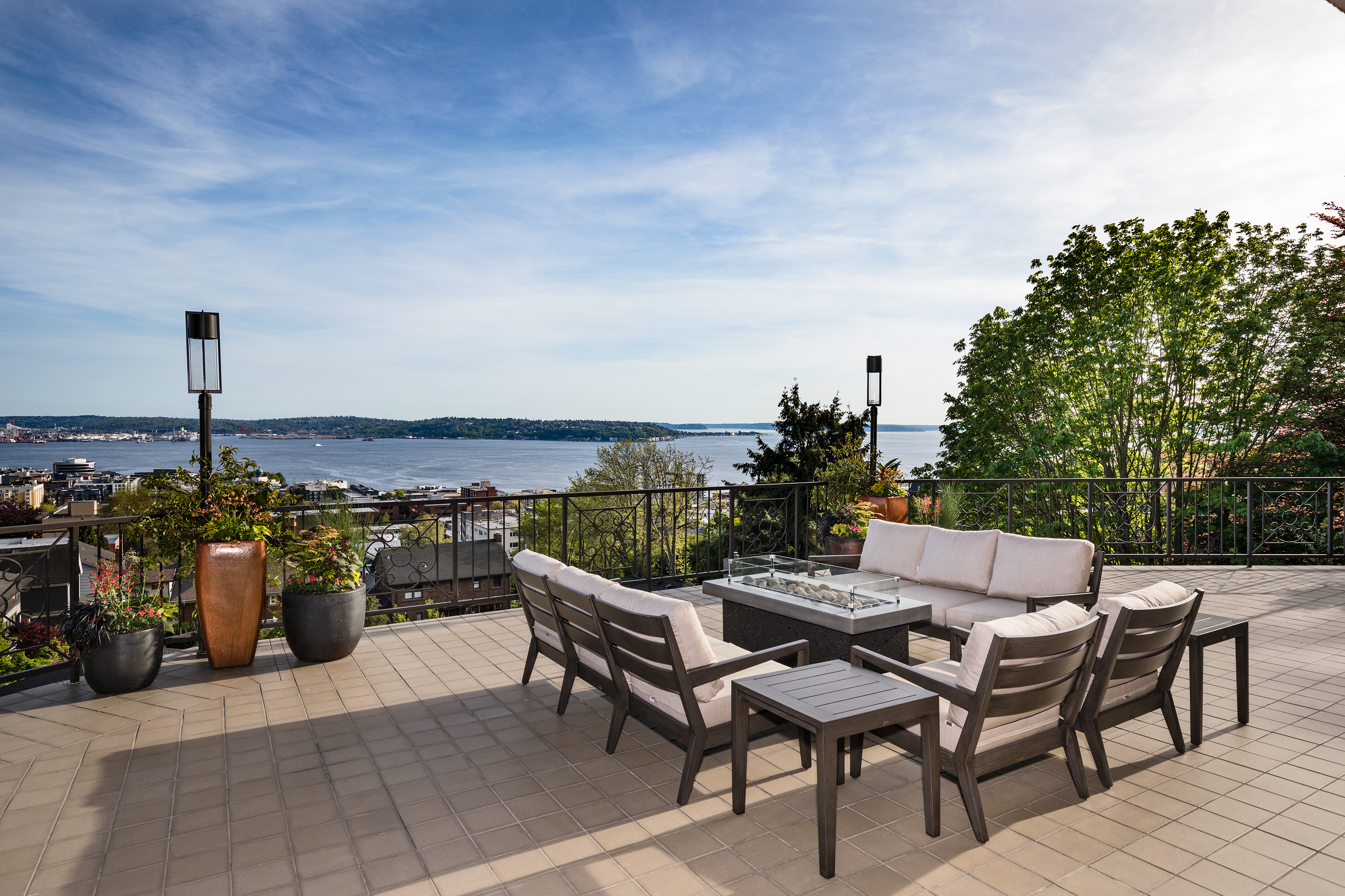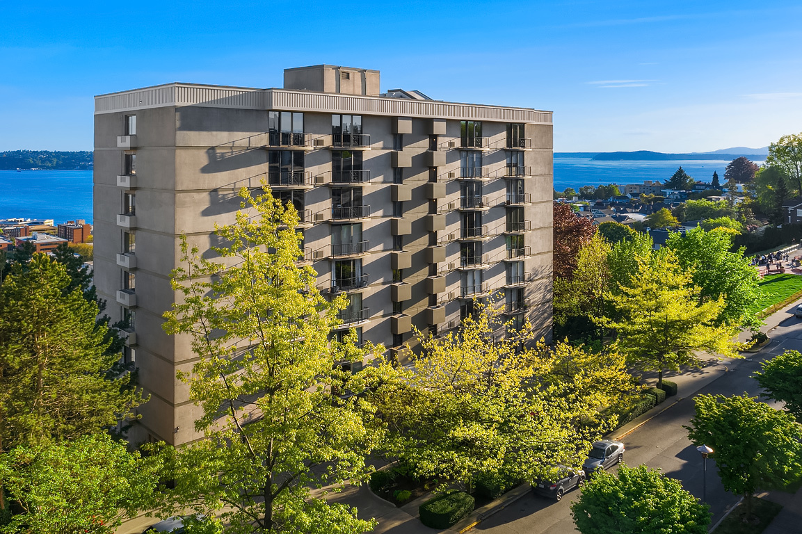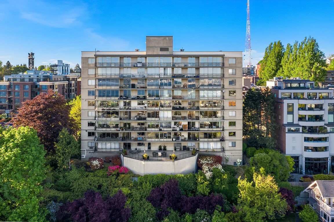 Elegant condominium with panoramic vistas of the Cascades, Olympics, Seattles skyline, Puget Sound and Mt. Rainier Outstanding 2011-12 remodel created open concept spaces, updated systems and added luxury surfaces. Living/dining area with fireplace has access to wide view terrace; stunning chef's kitchen with top-notch appliances and breakfast nook; 2 master suites with balconies and marble baths; 3rd bedroom or study; paneled office. Boutique building, on-site manager, storage, 2 garage spaces