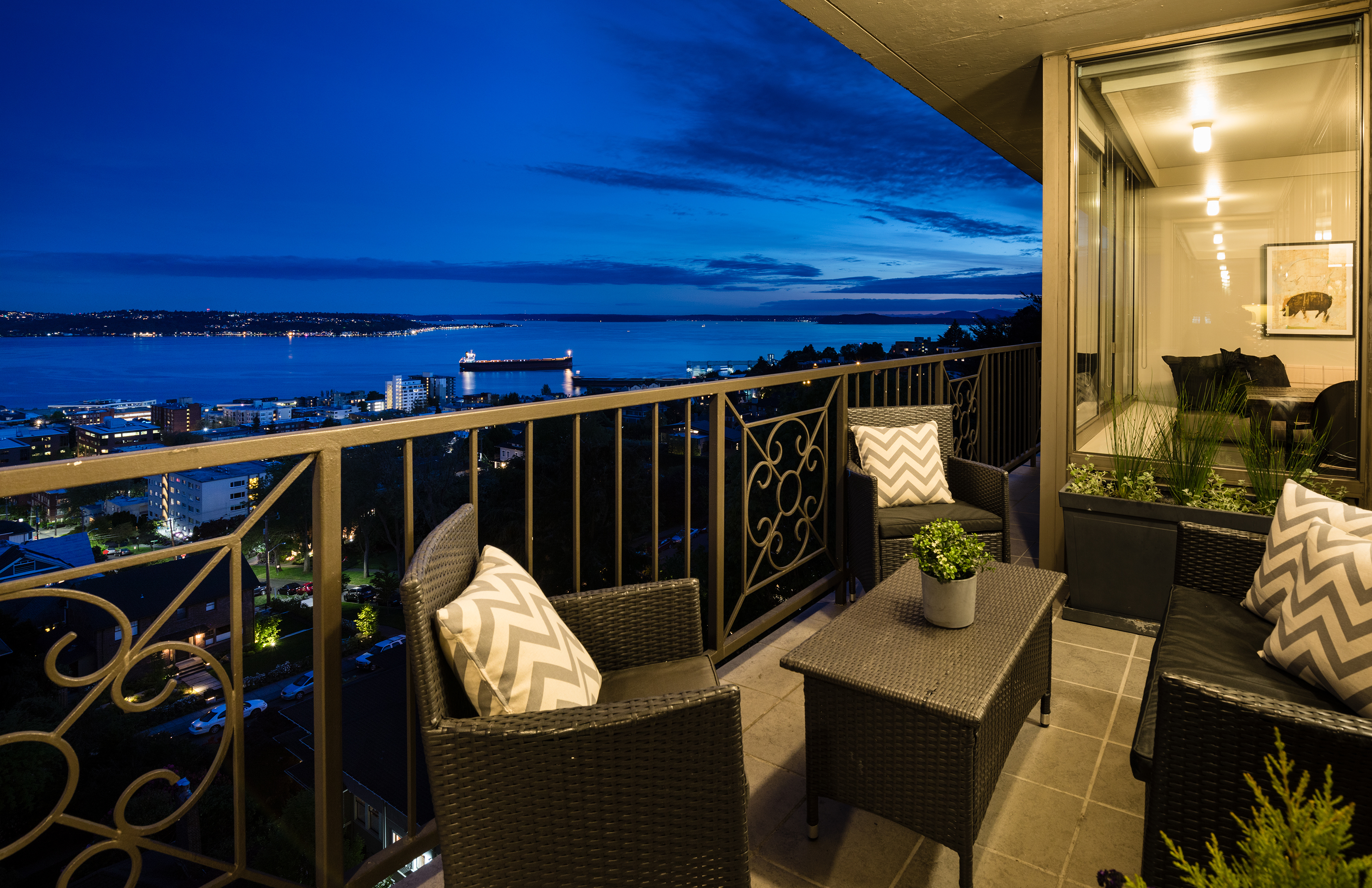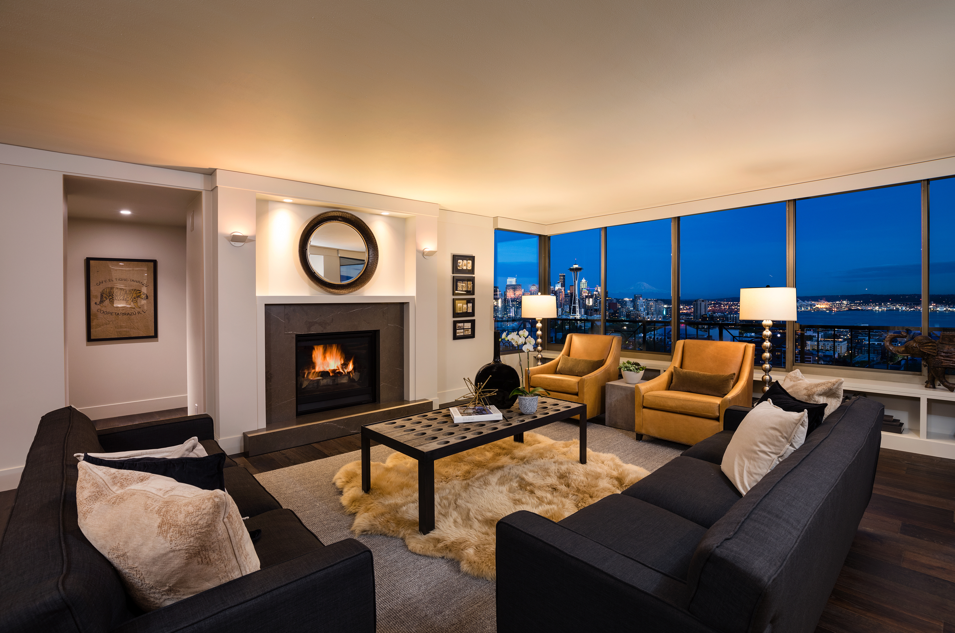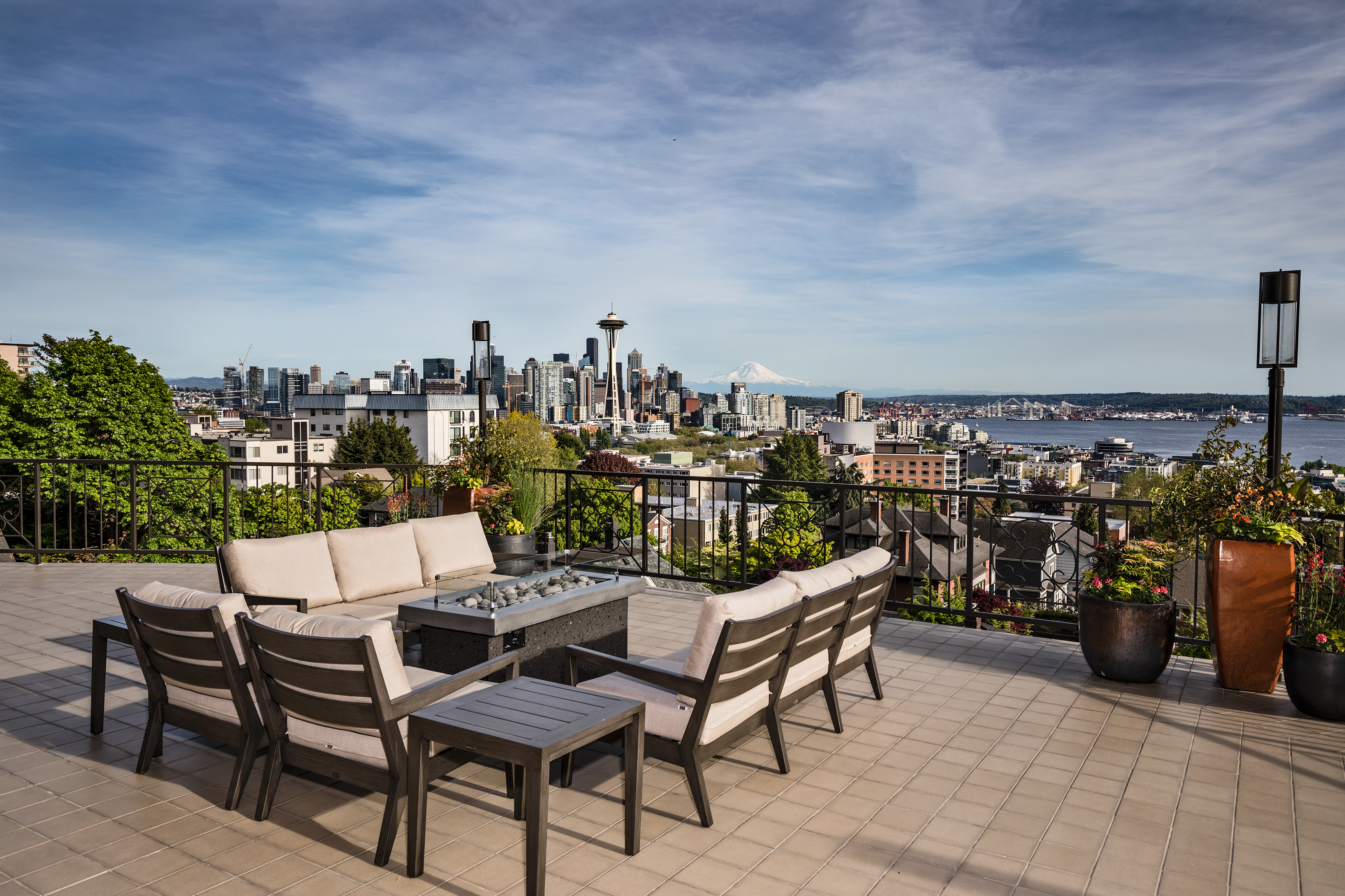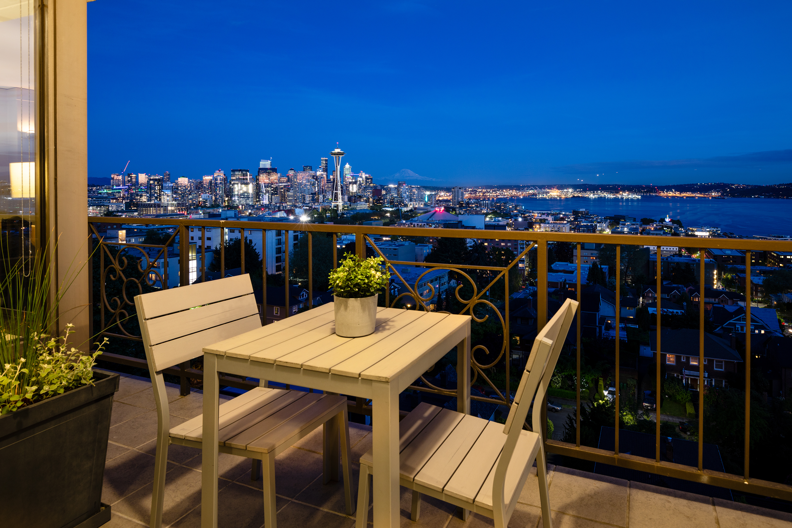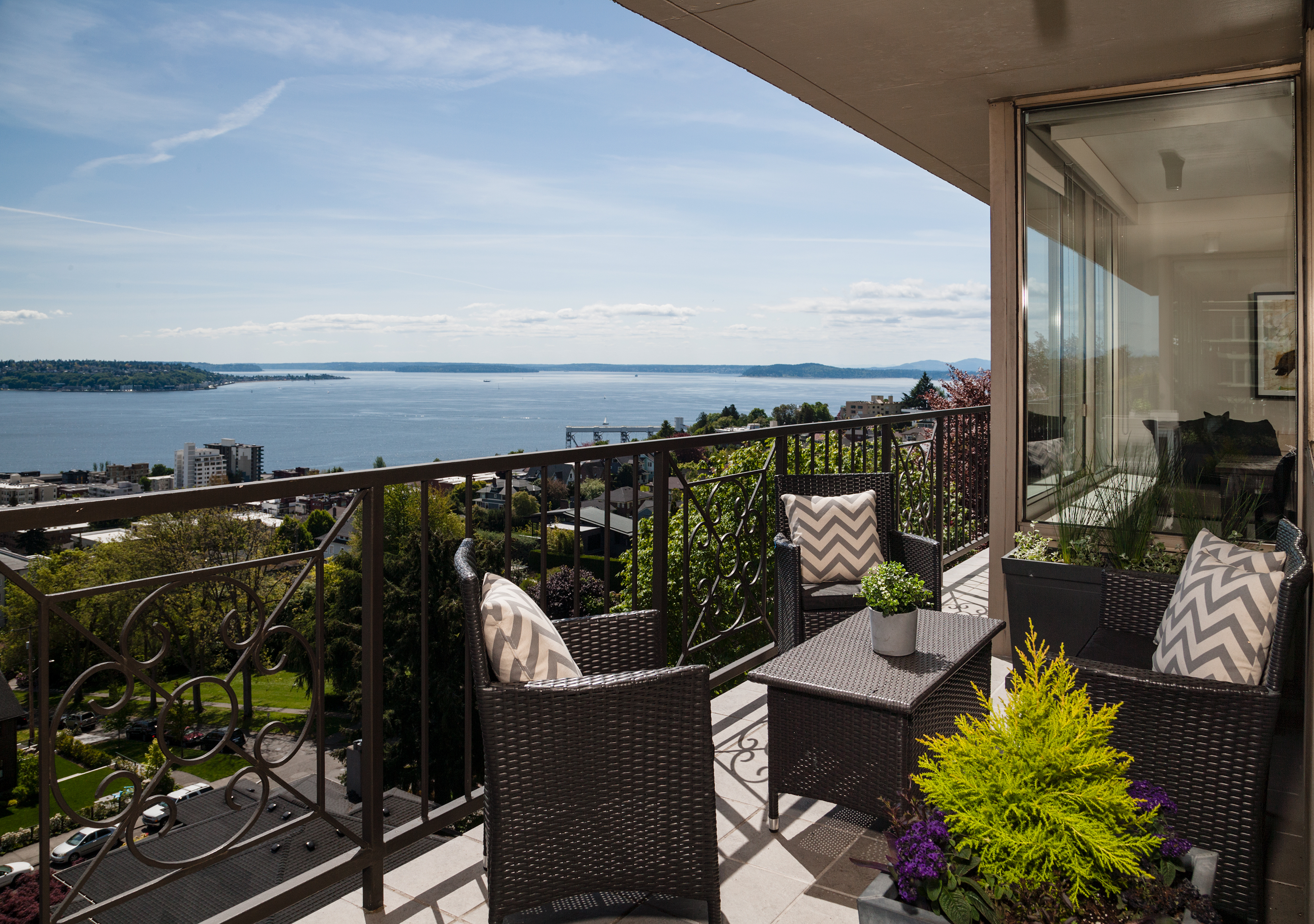 Elegant condominium with panoramic vistas of the Cascades, Olympics, Seattles skyline, Puget Sound and Mt. Rainier Outstanding 2011-12 remodel created open concept spaces, updated systems and added luxury surfaces. Living/dining area with fireplace has access to wide view terrace; stunning chef's kitchen with top-notch appliances and breakfast nook; 2 master suites with balconies and marble baths; 3rd bedroom or study; paneled office. Boutique building, on-site manager, storage, 2 garage spaces