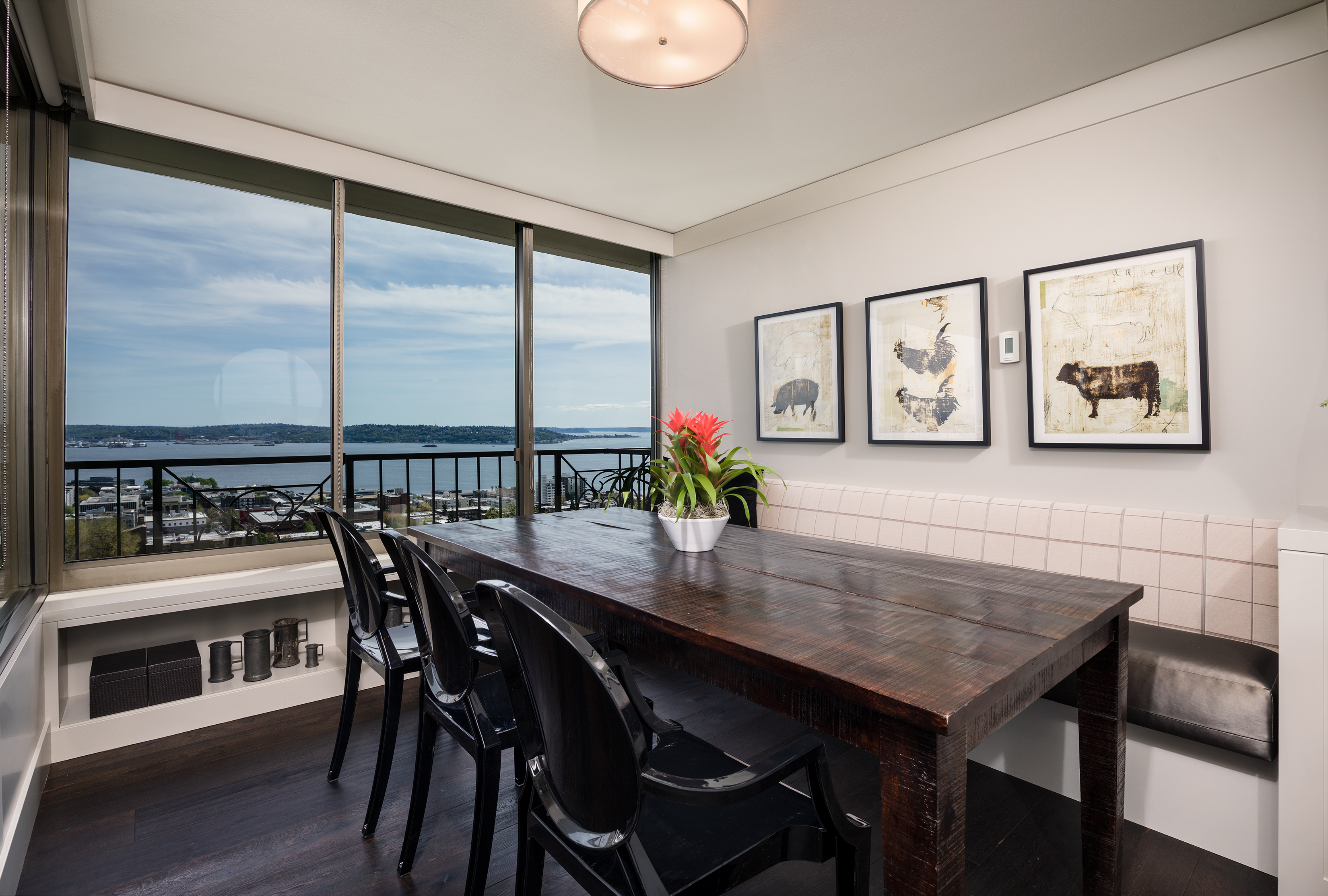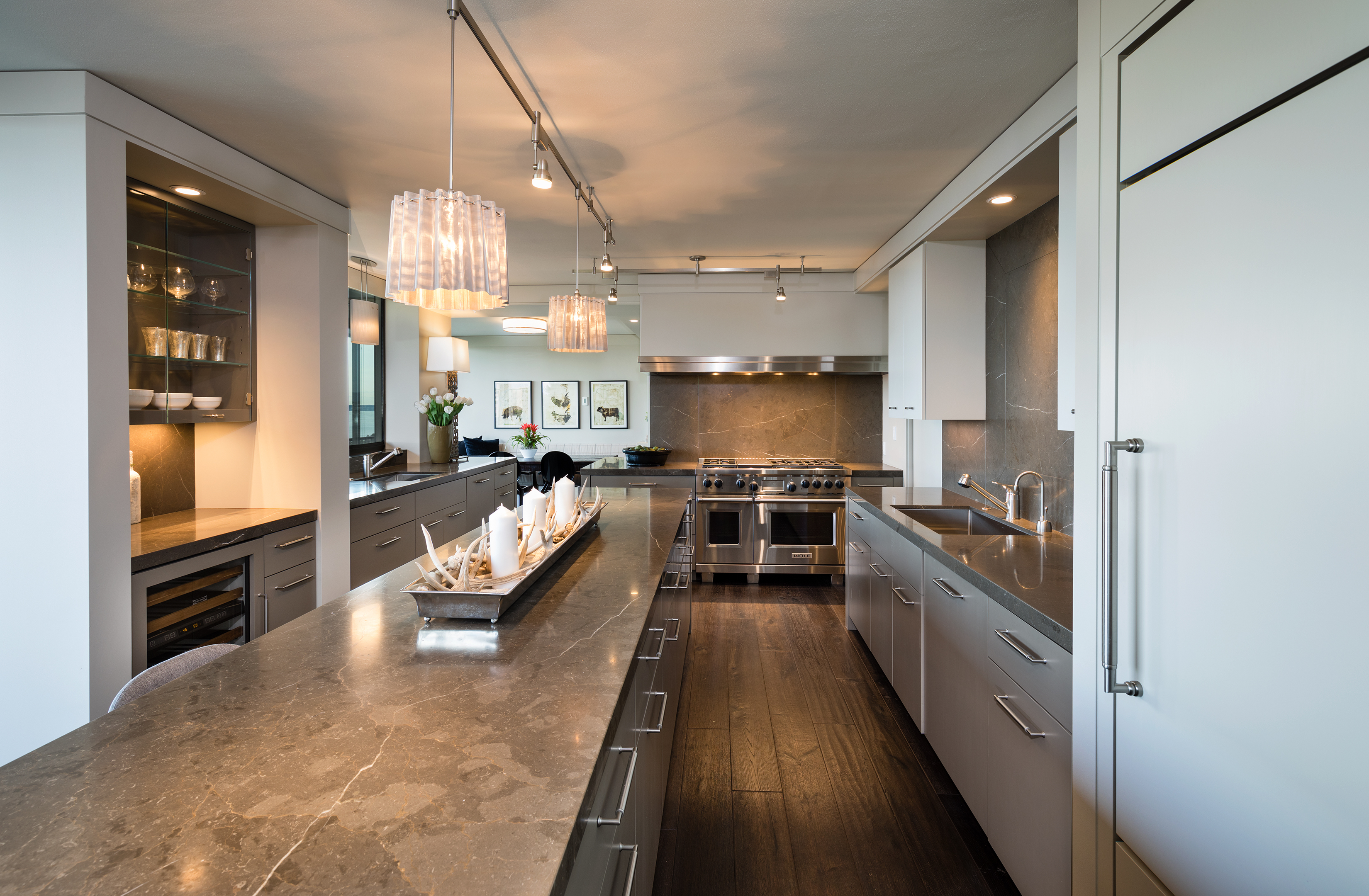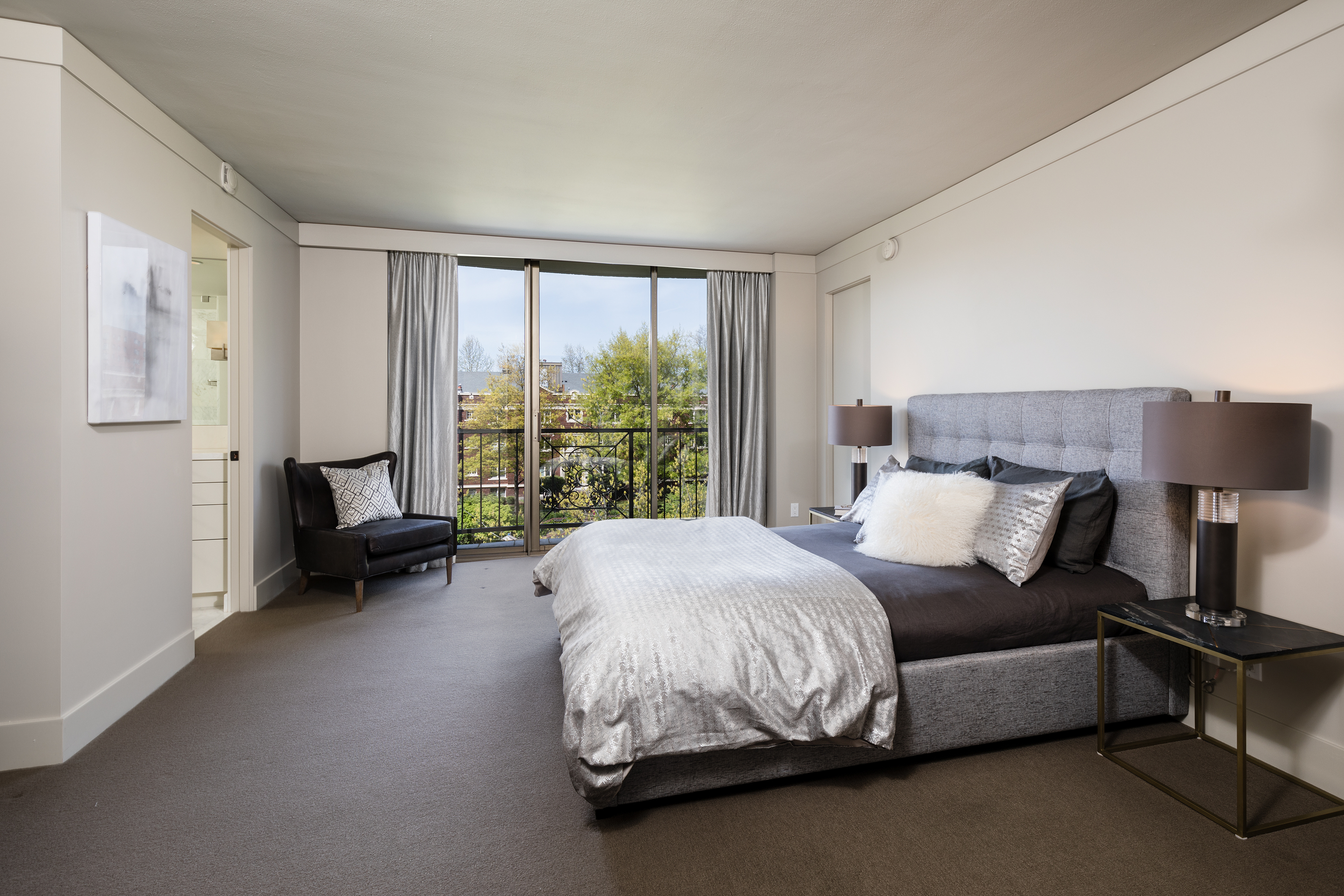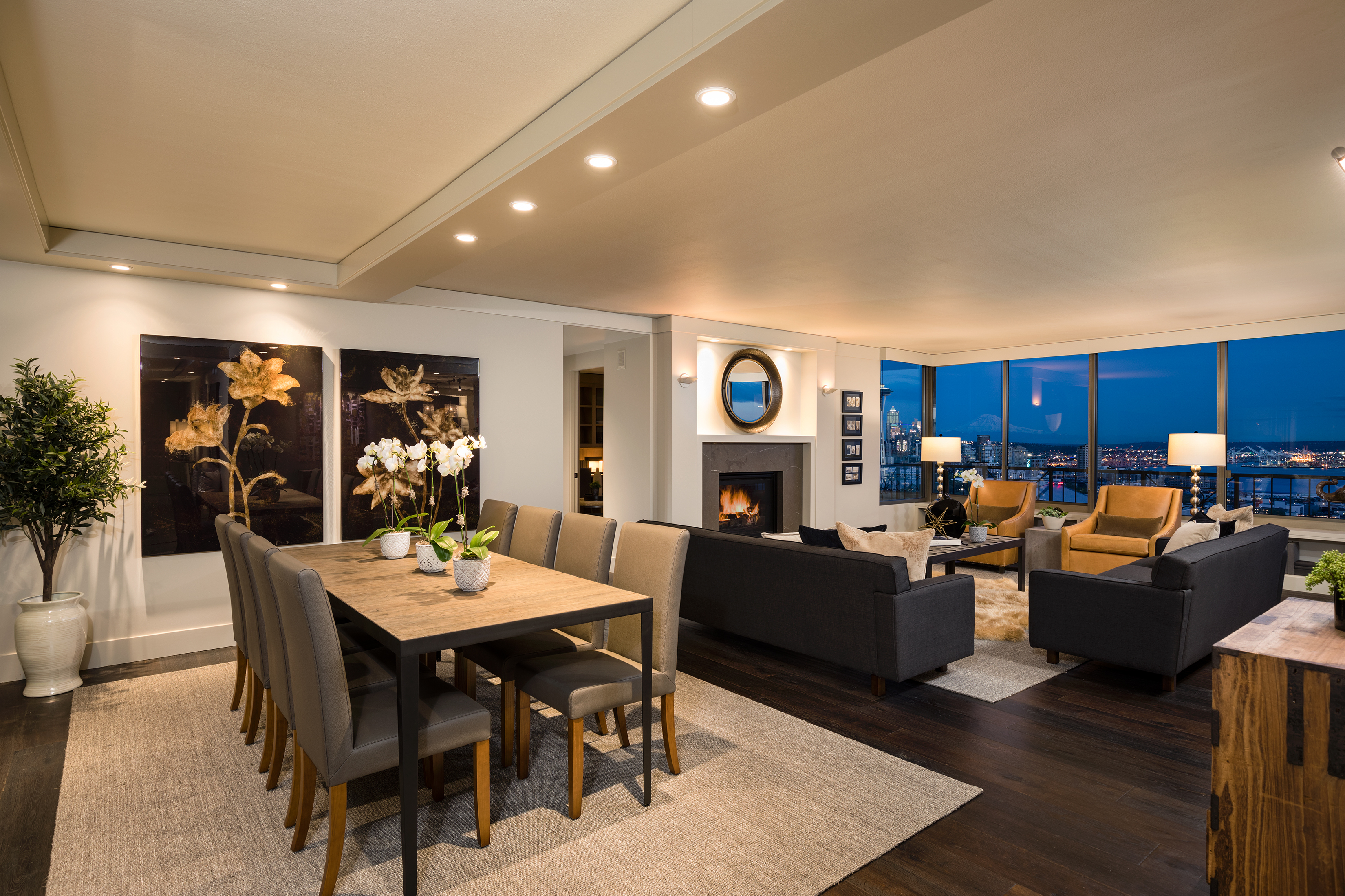 Elegant condominium with panoramic vistas of the Cascades, Olympics, Seattles skyline, Puget Sound and Mt. Rainier Outstanding 2011-12 remodel created open concept spaces, updated systems and added luxury surfaces. Living/dining area with fireplace has access to wide view terrace; stunning chef's kitchen with top-notch appliances and breakfast nook; 2 master suites with balconies and marble baths; 3rd bedroom or study; paneled office. Boutique building, on-site manager, storage, 2 garage spaces