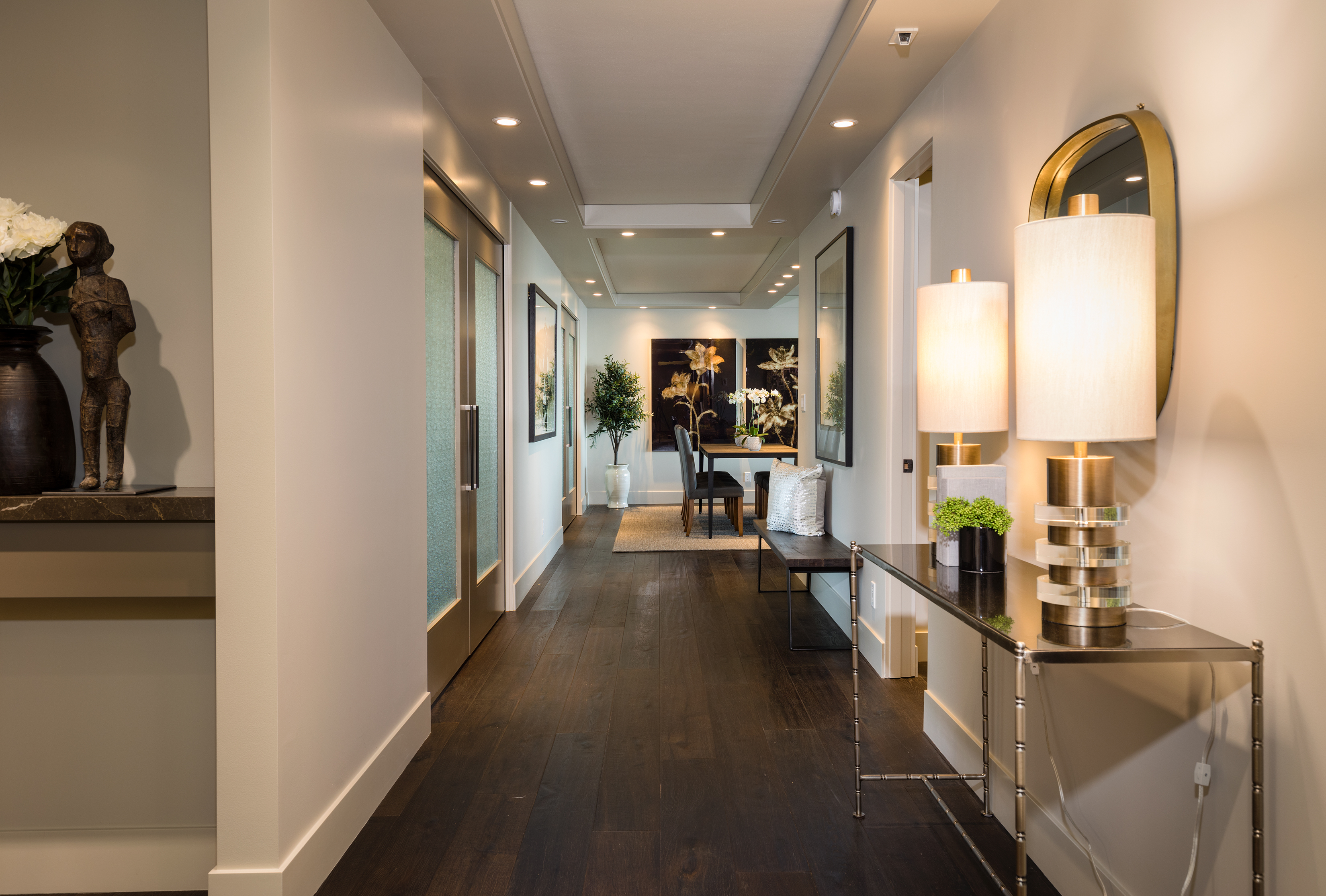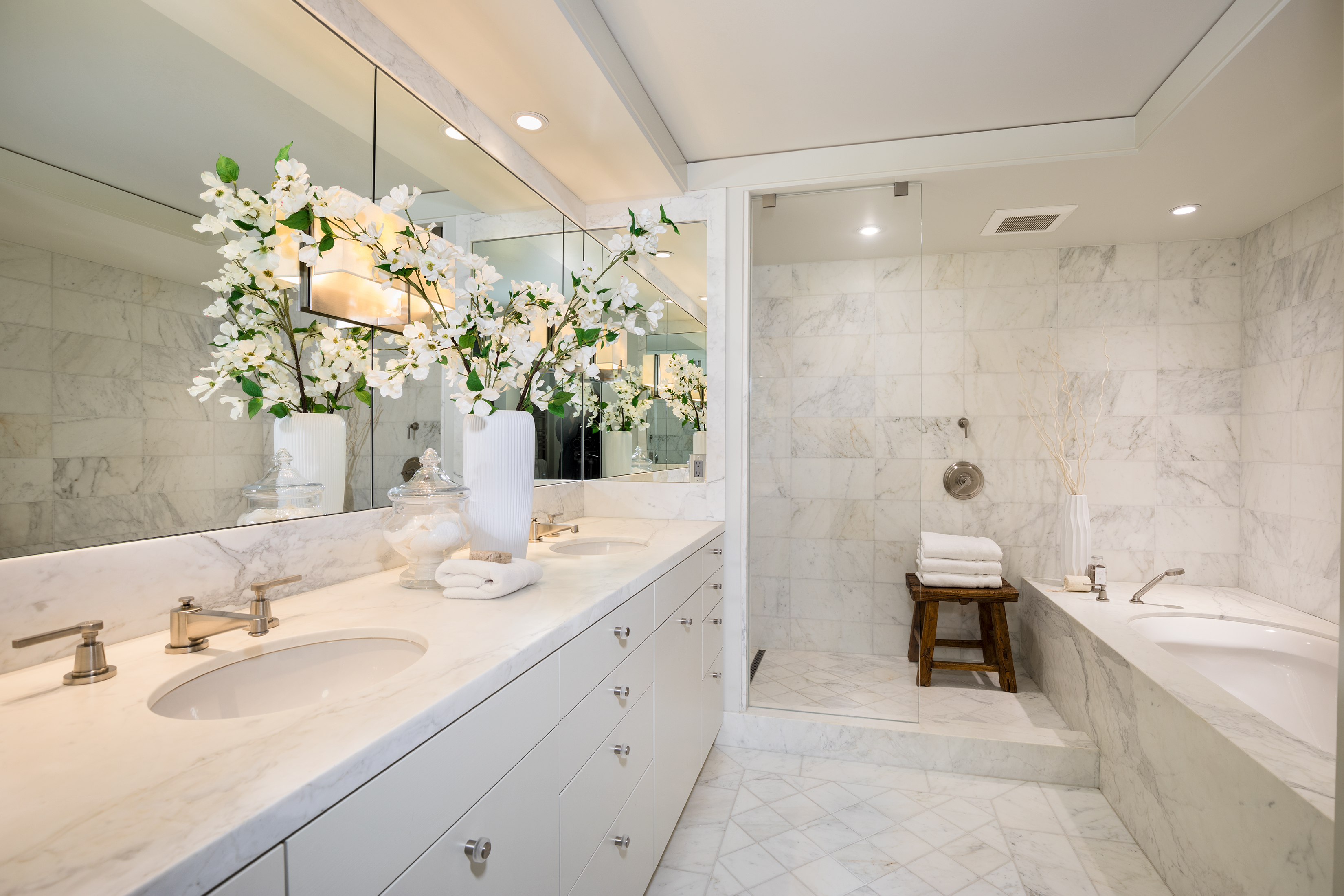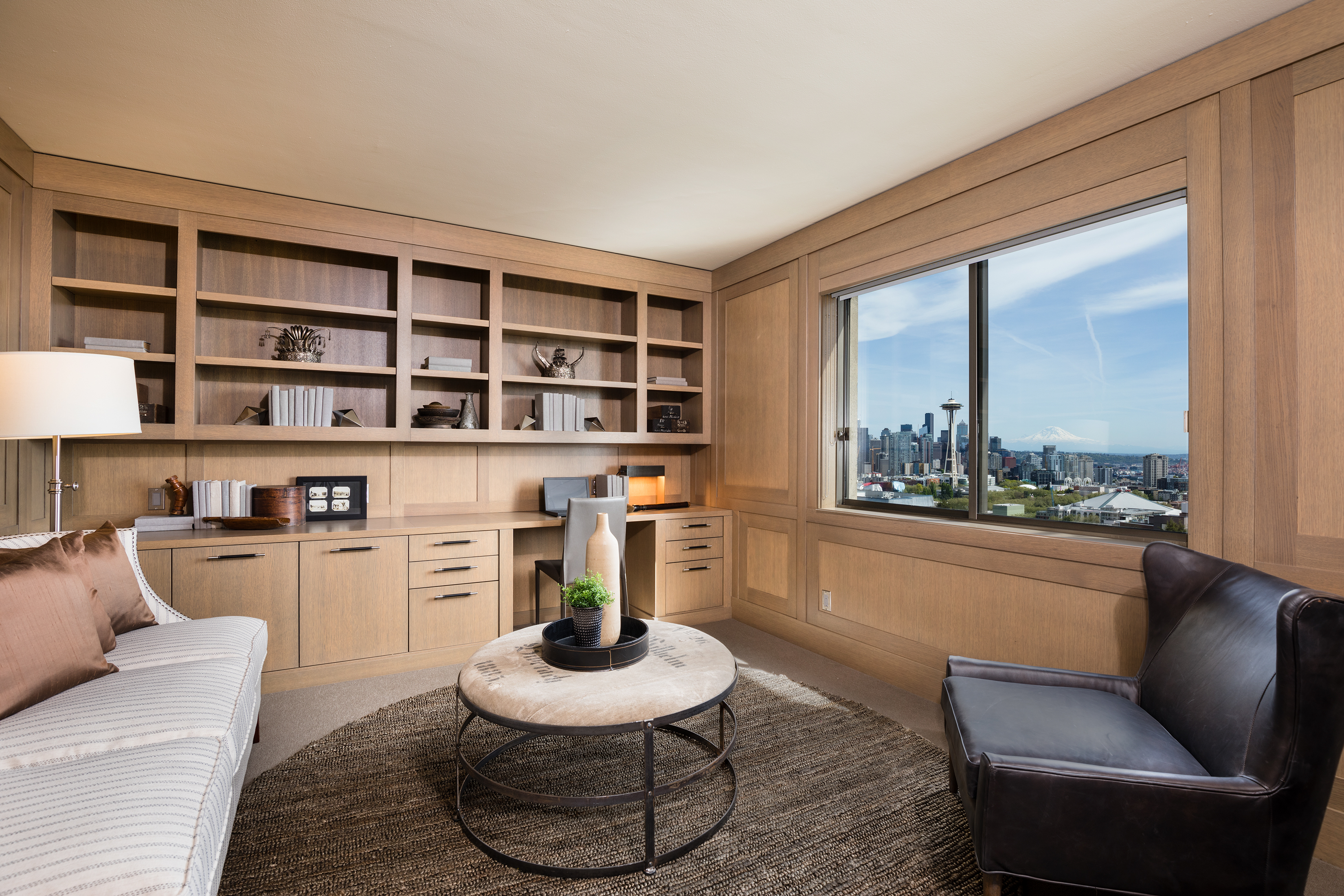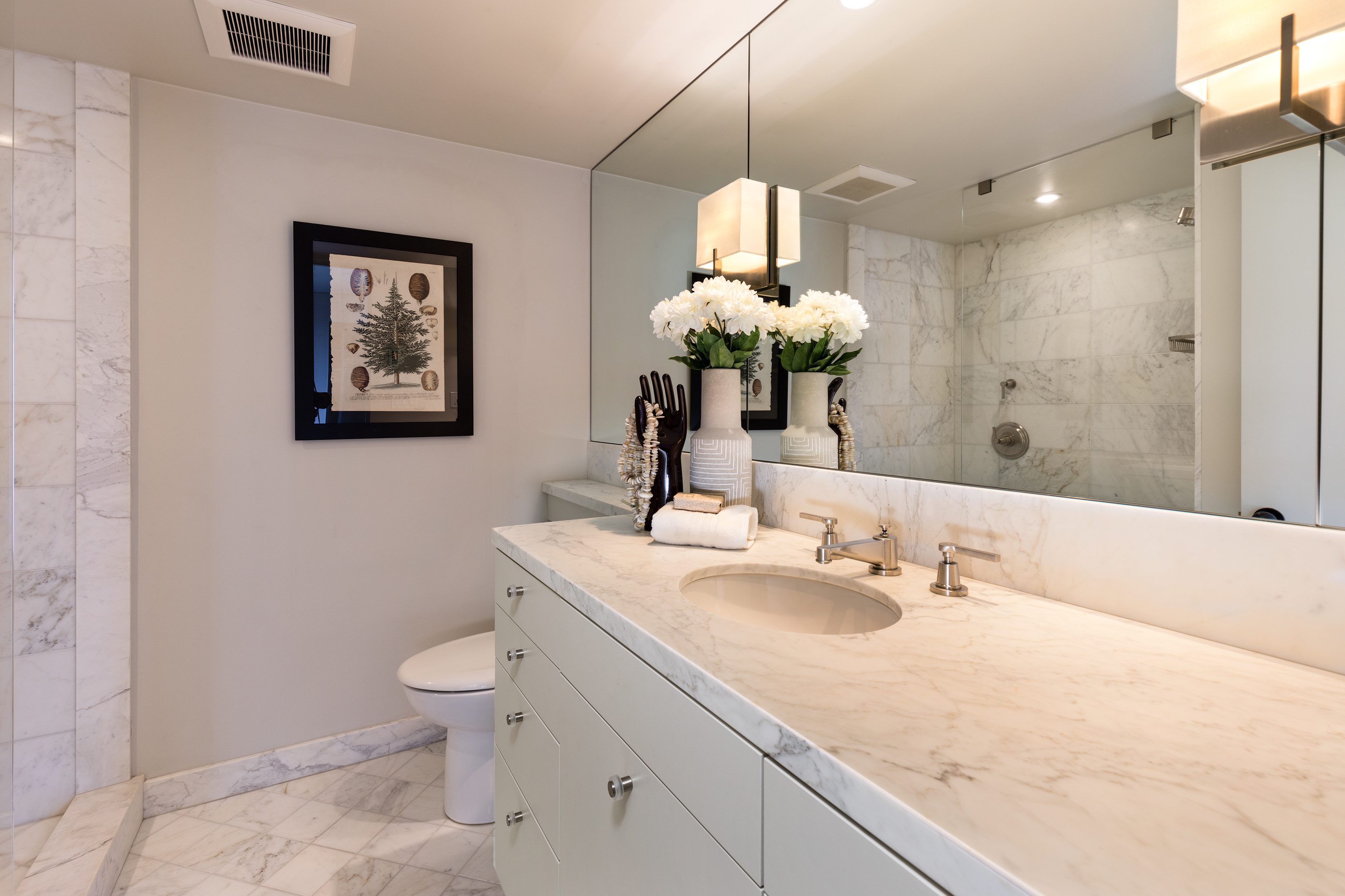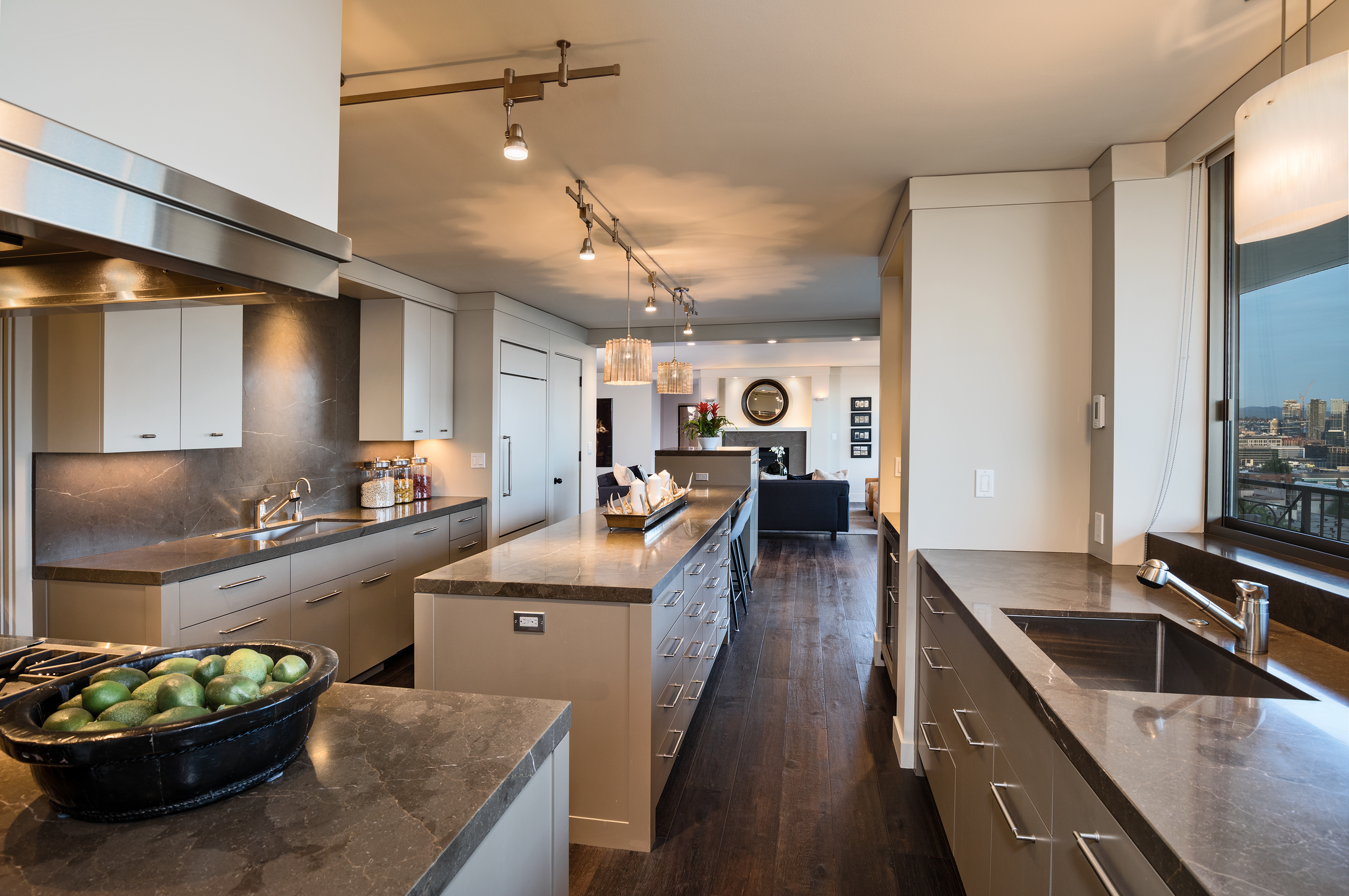 Elegant condominium with panoramic vistas of the Cascades, Olympics, Seattles skyline, Puget Sound and Mt. Rainier Outstanding 2011-12 remodel created open concept spaces, updated systems and added luxury surfaces. Living/dining area with fireplace has access to wide view terrace; stunning chef's kitchen with top-notch appliances and breakfast nook; 2 master suites with balconies and marble baths; 3rd bedroom or study; paneled office. Boutique building, on-site manager, storage, 2 garage spaces