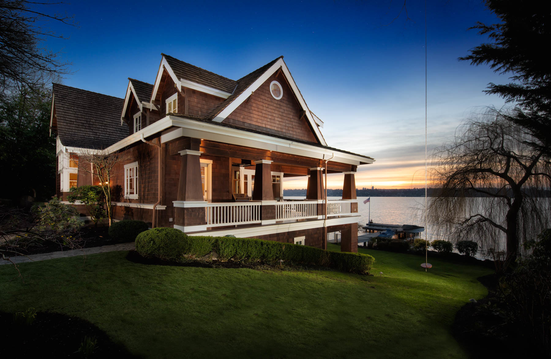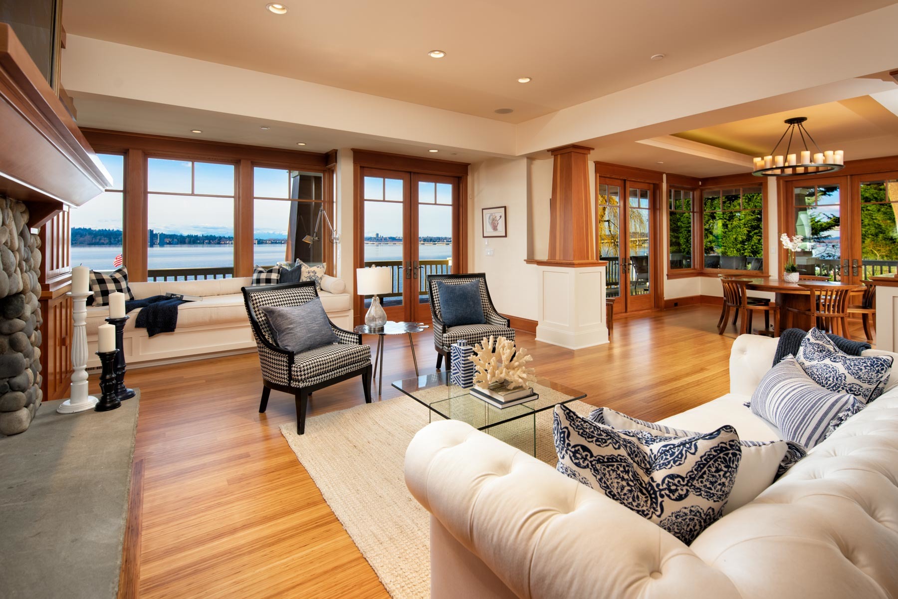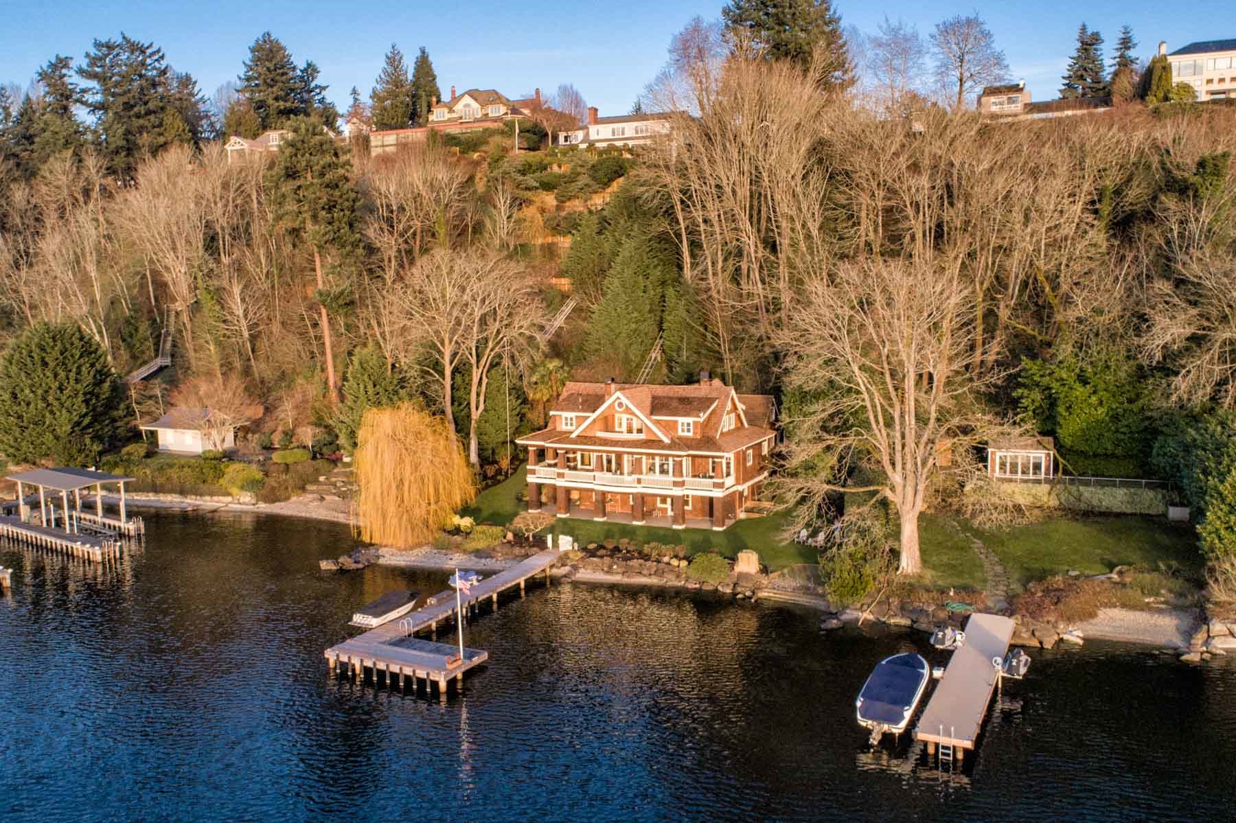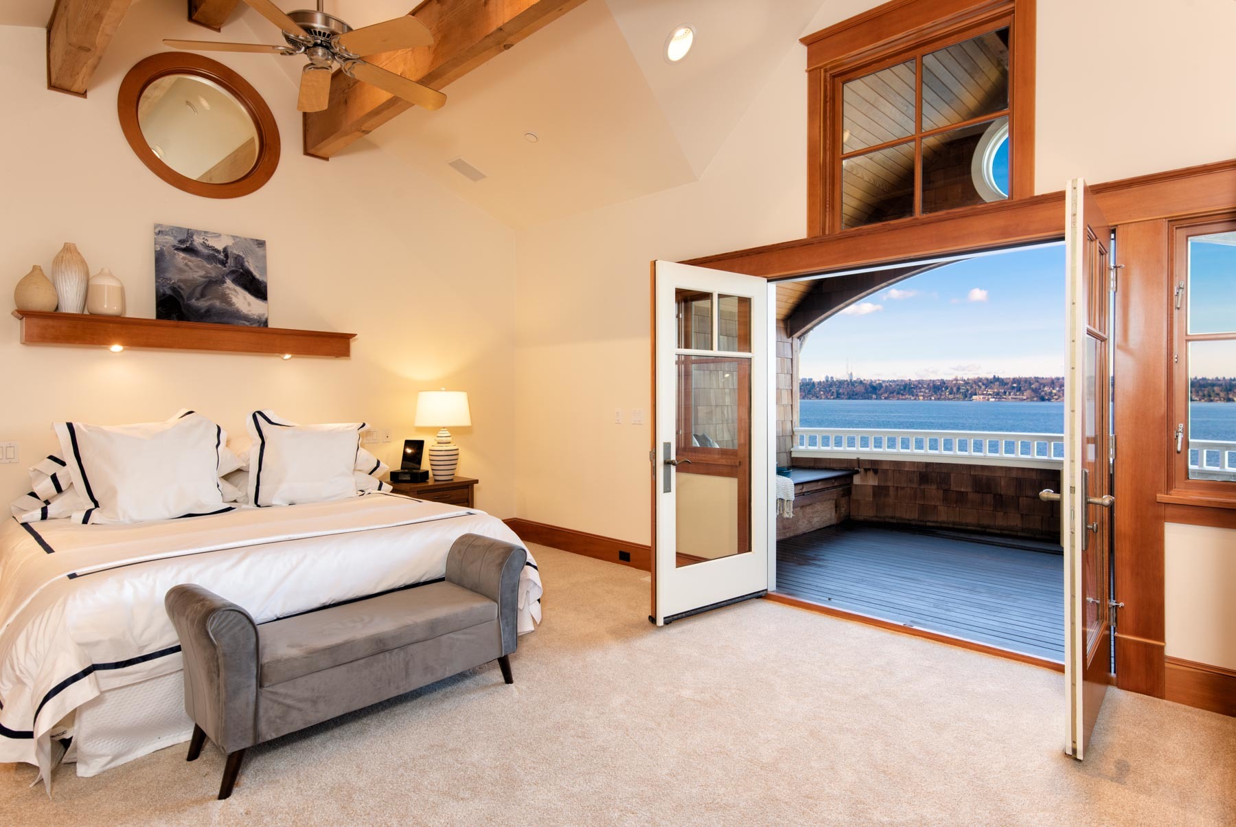 Vacation year round on the shores of Lake Washington.One of the most private & secure retreats along the lake, a rare waterfront treasure. From the auto courtyard w/Private Guest House, take an enchanting tram ride to a masterfully crafted beach house, great room living at its best w/unending views & just ten steps to the shore.Enjoy outdoor living on the covered wrap around deck,sweeping lawns,an impressive dock,125' of wft,stand-alone artists studio & so much more.Youll never want to leave.