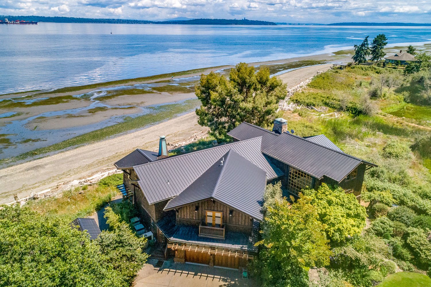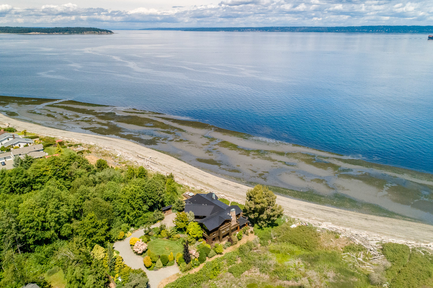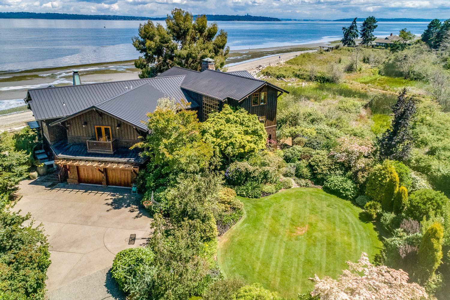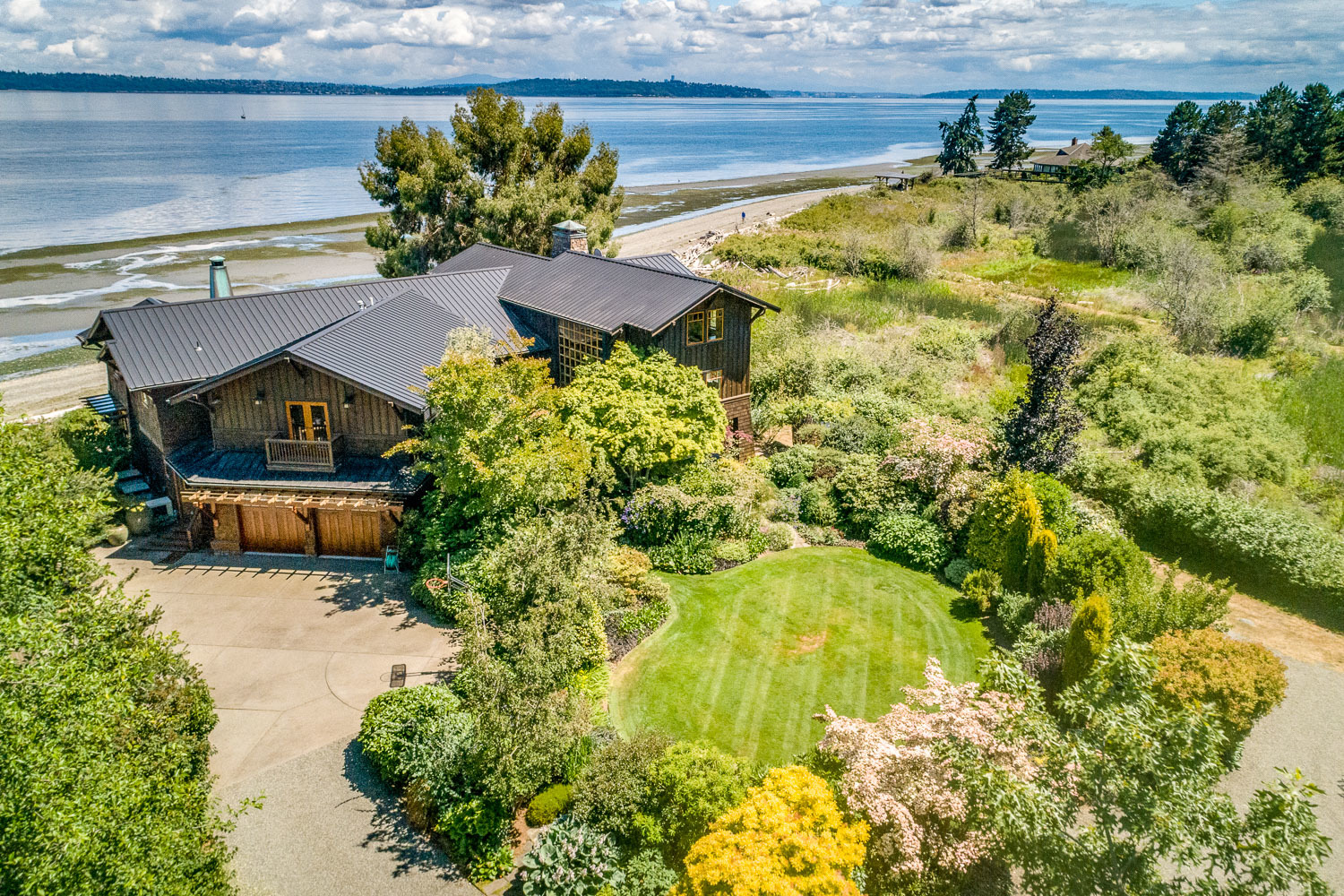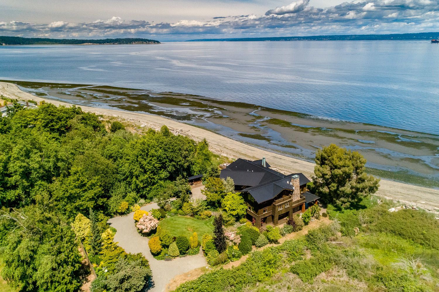 Luxurious beachfront home with Architectural Digest quality finishes. You could travel the world looking for something like this! 180 feet of no bank sandy beach with spectacular Sound views from Mt. Baker to Mt. Rainier with open space to either side. Beautiful developed gardens with a lovely patio & large decks, a hot tub & spa, & privacy with all day sun. 4 bdrm, 4.75 bath home with exquisite local artist touches & handsome built-ins. 2 generous offices, & a soundproof music studio/gym.