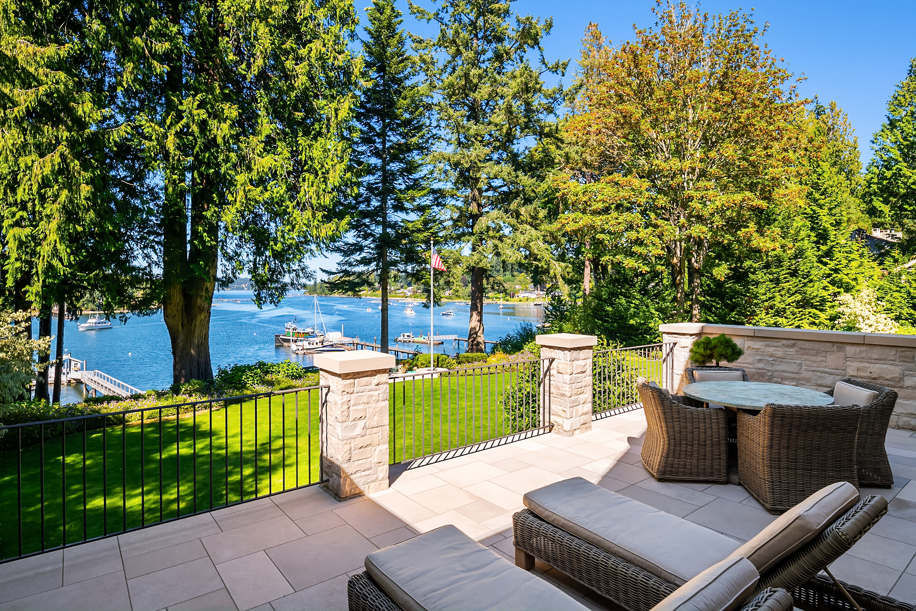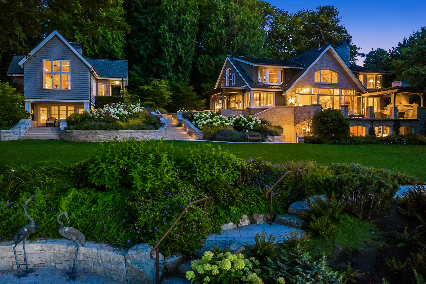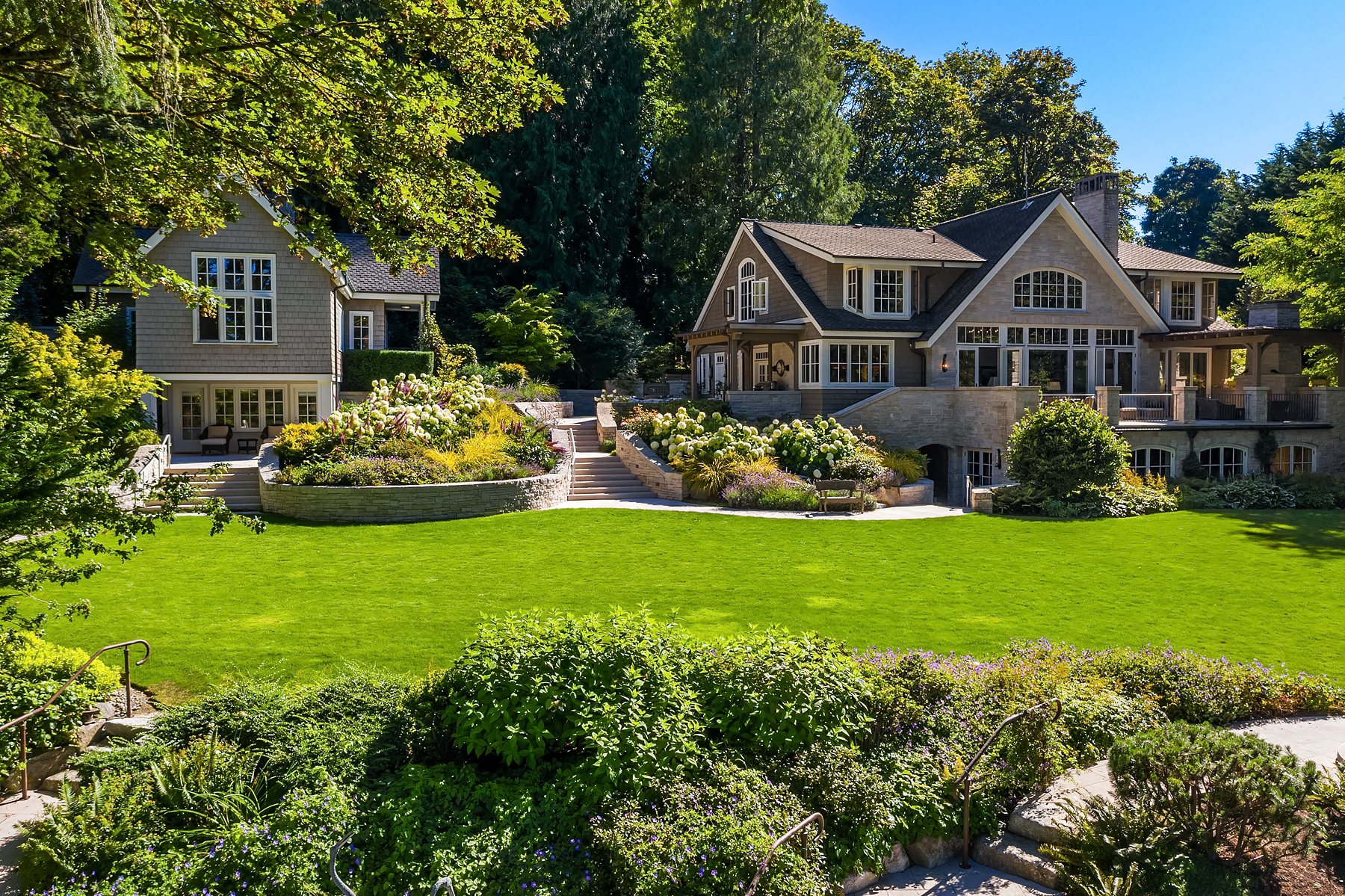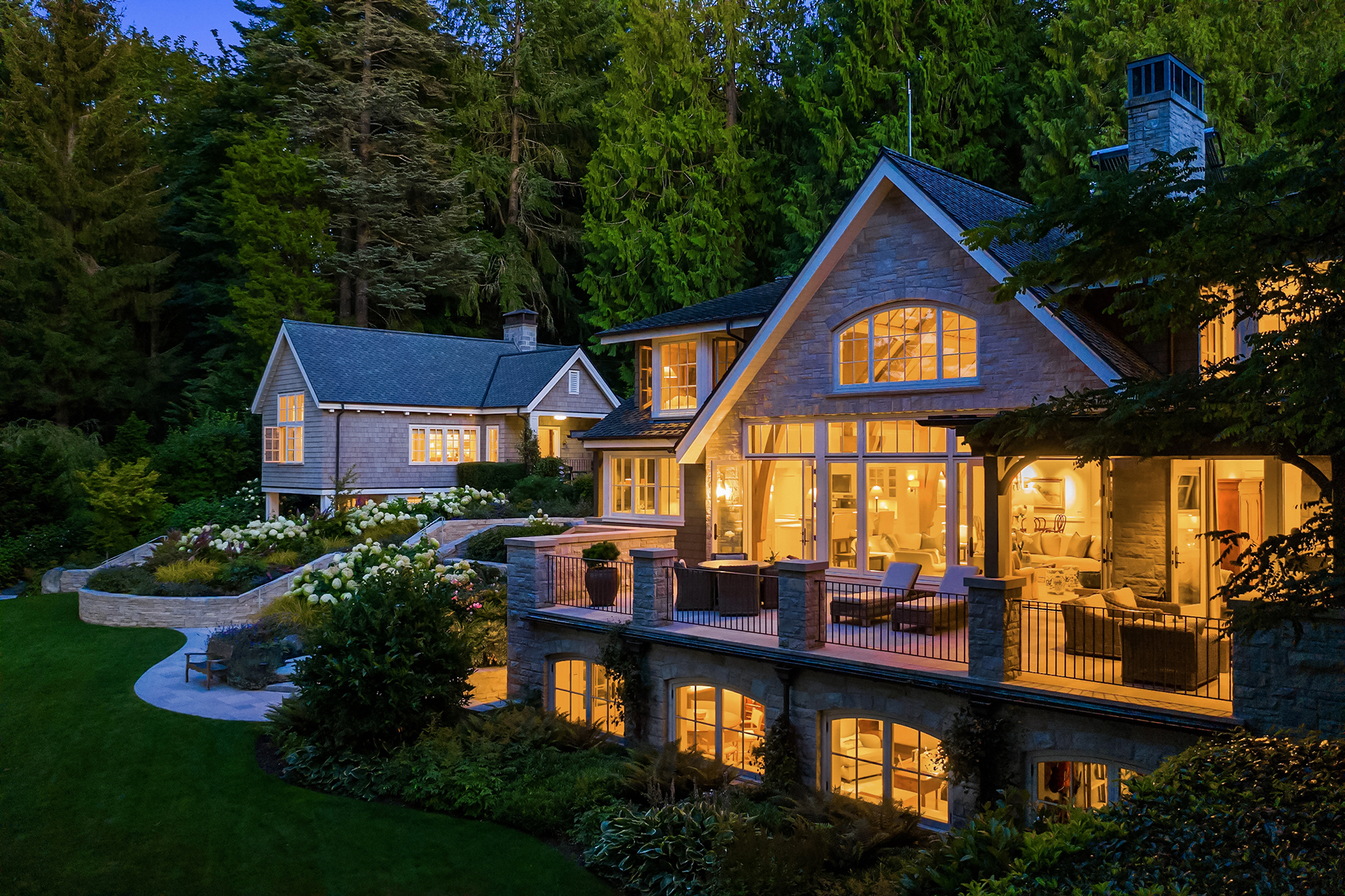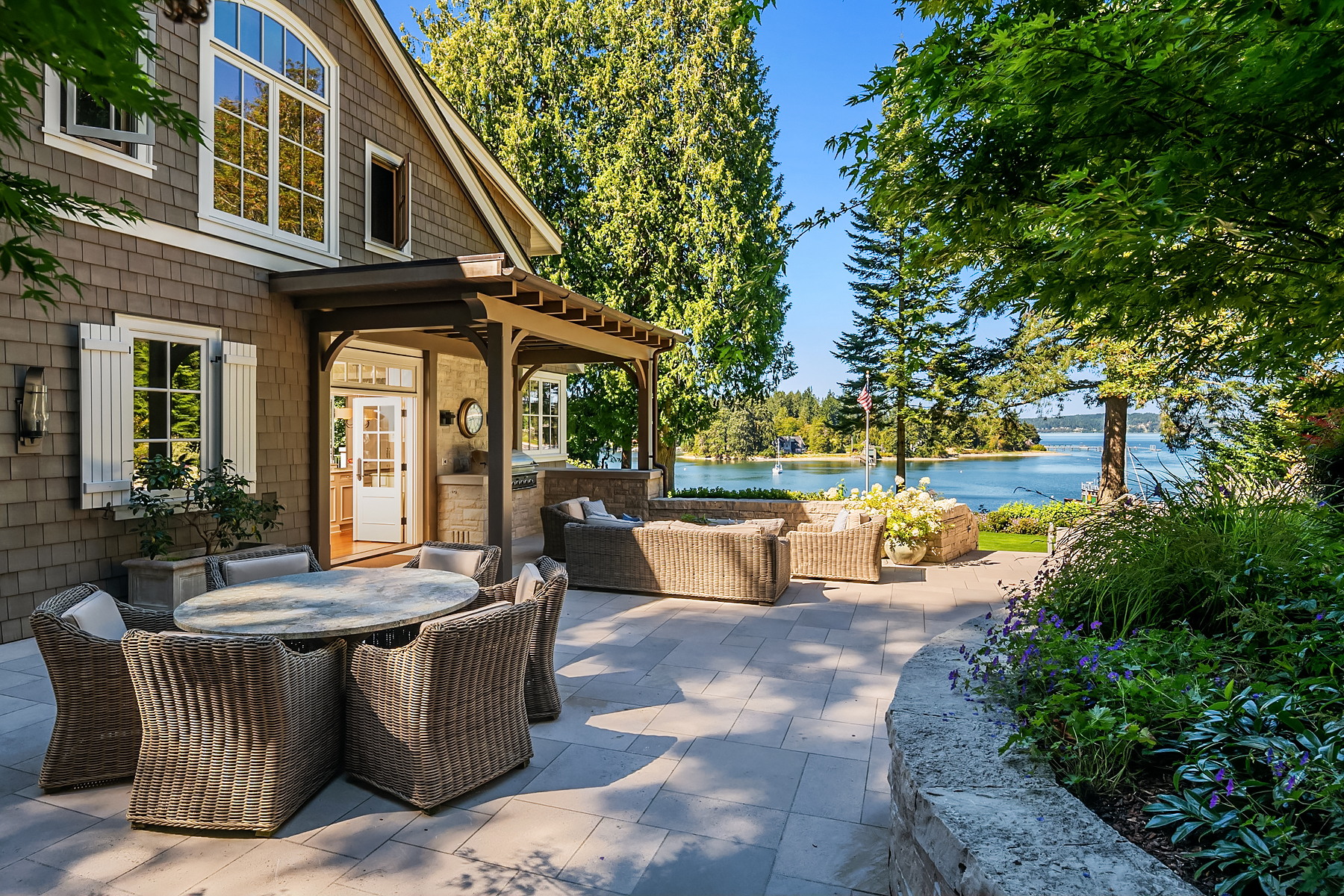 This magnificent custom home is beautifully nestled on the shores of Port Madison. Meticulously designed by the sellers and architect Robert Maloney, Fairbank Construction completed the home in 2013. Lush landscaping with stately rock wall and stone walkways lead to the deepwater dock that includes two buoys. Two private offices, gym, fly fishing room, and wine cellar. A private guest house with French doors out to the gardens with peaceful island views completes this breathtaking island estate.