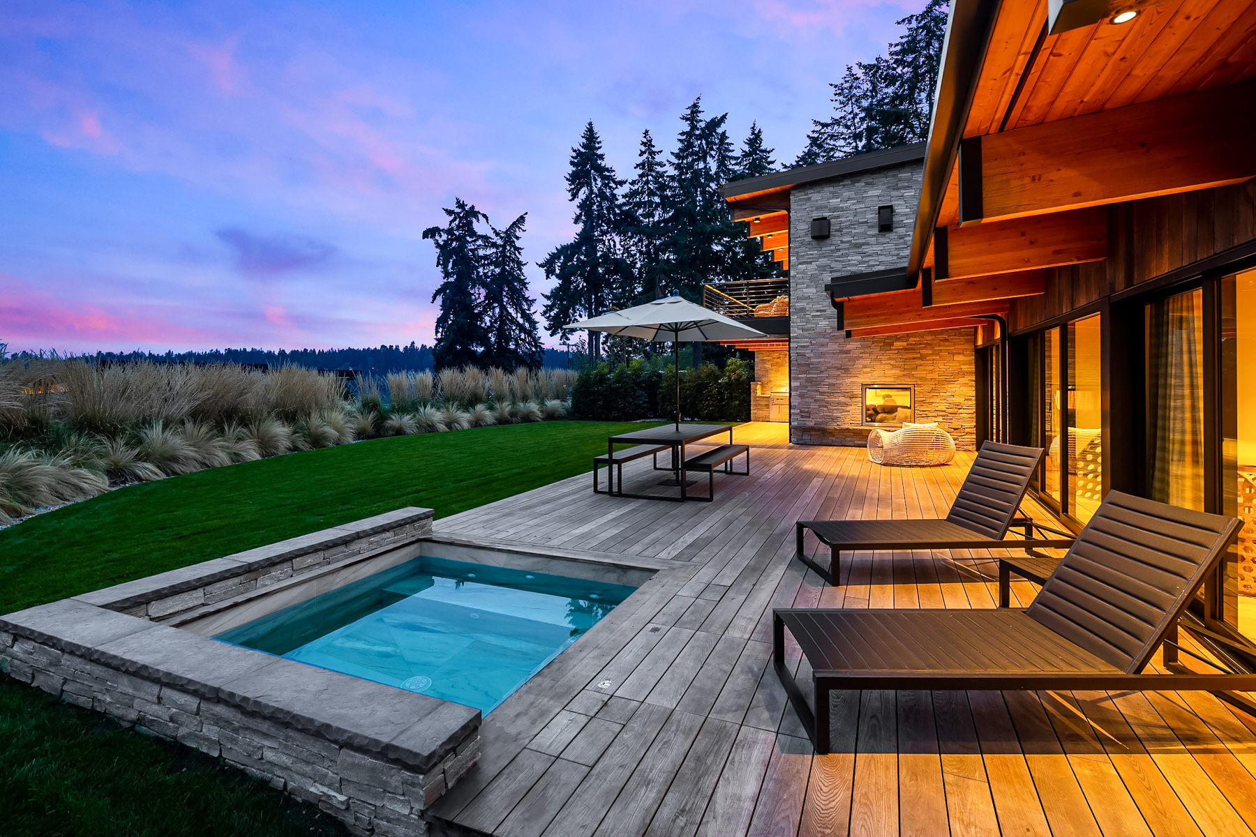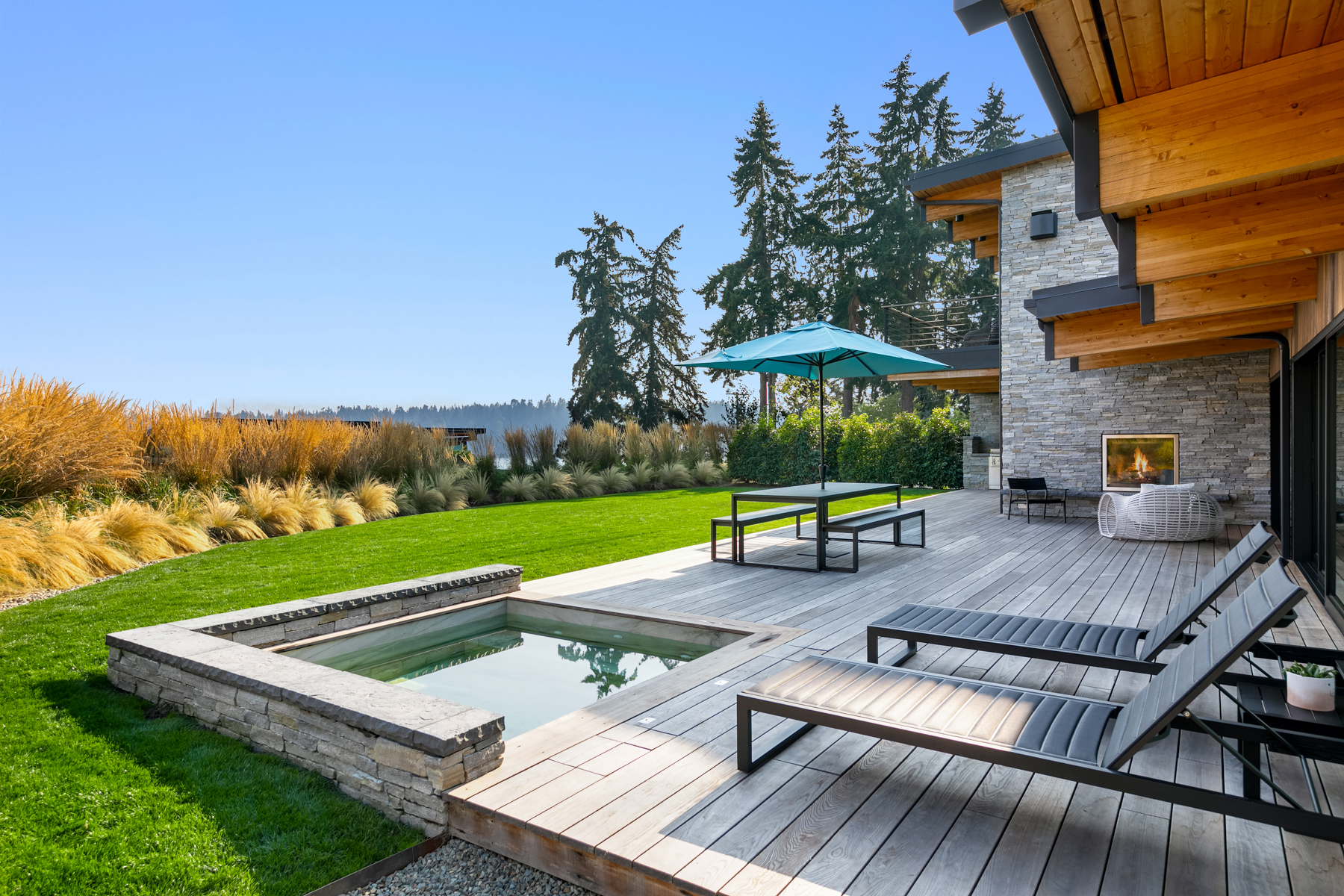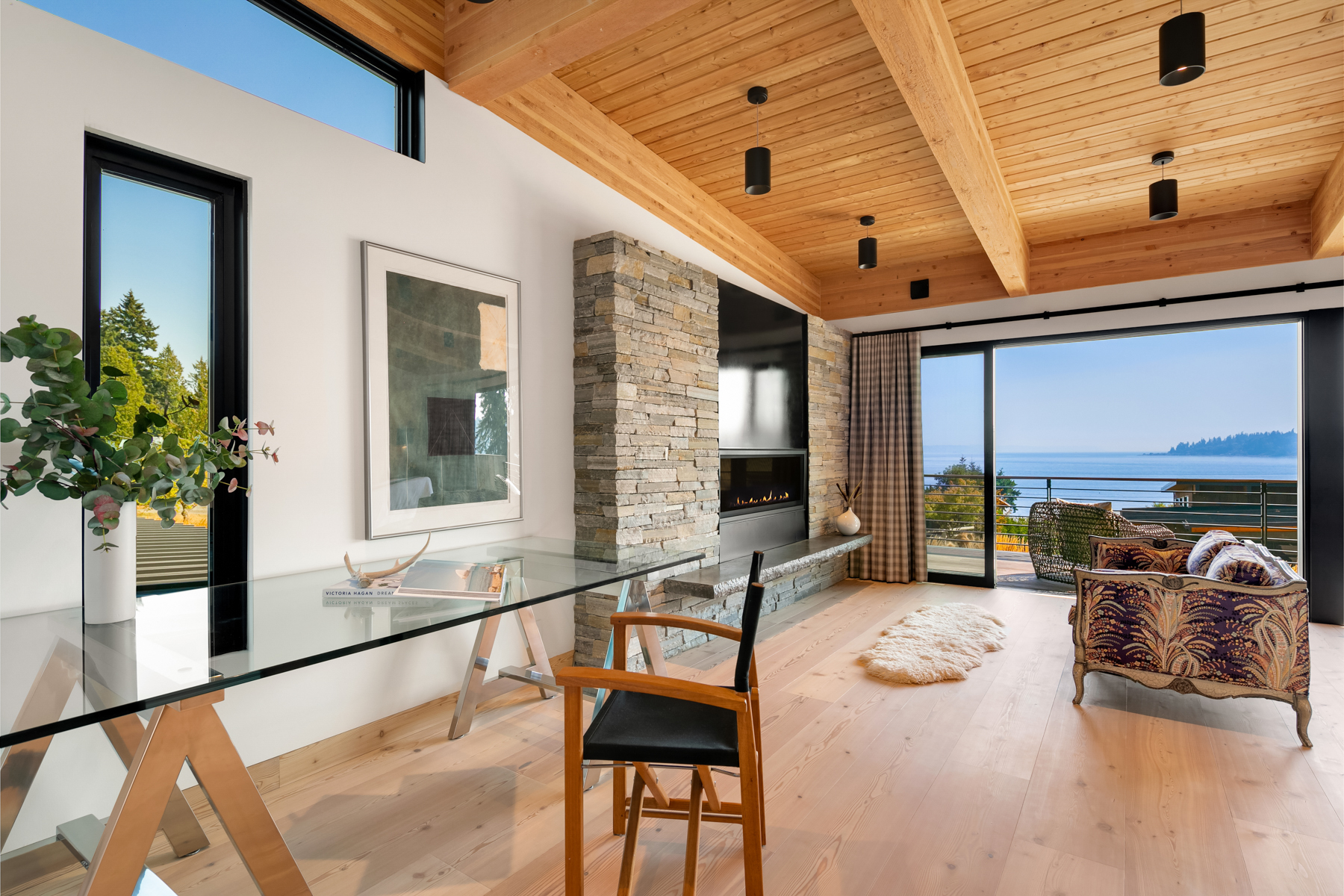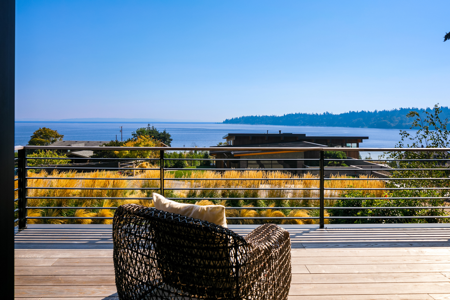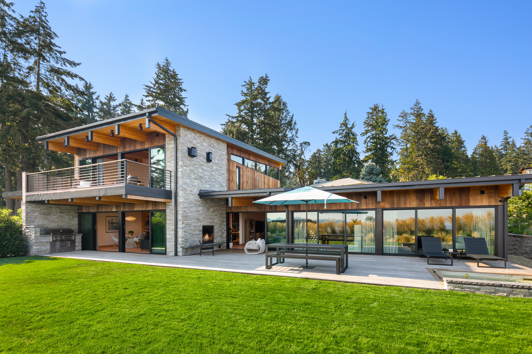 Welcome home to this stunning custom designed contemporary retreat and the peaceful water, island and city outlook. Thoughtfully built with exquisite attention to detail, filled with coveted south facing sunlight, the house features 3 en suite bedrooms and a chef's kitchen. Walls of glass open to an expansive wood deck with a heated saltwater plunge pool, a double sided gas fireplace and a built-in grill. Nestled in a small enclave of luxury homes with private deeded beach access, close to the shops in vibrant Rolling Bay, settle in and enjoy views of the serene gardens, the boating activity in Puget Sound, Mt. Rainier and the sparkling lights of the Seattle skyline.