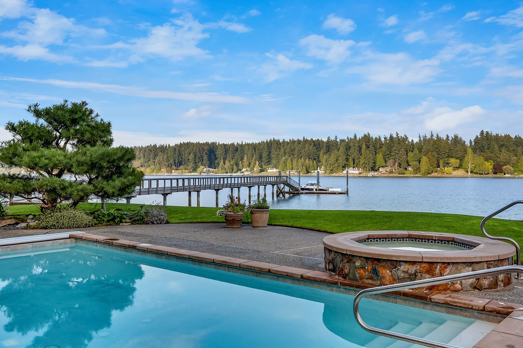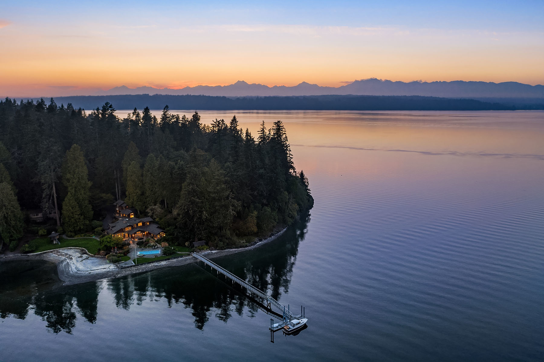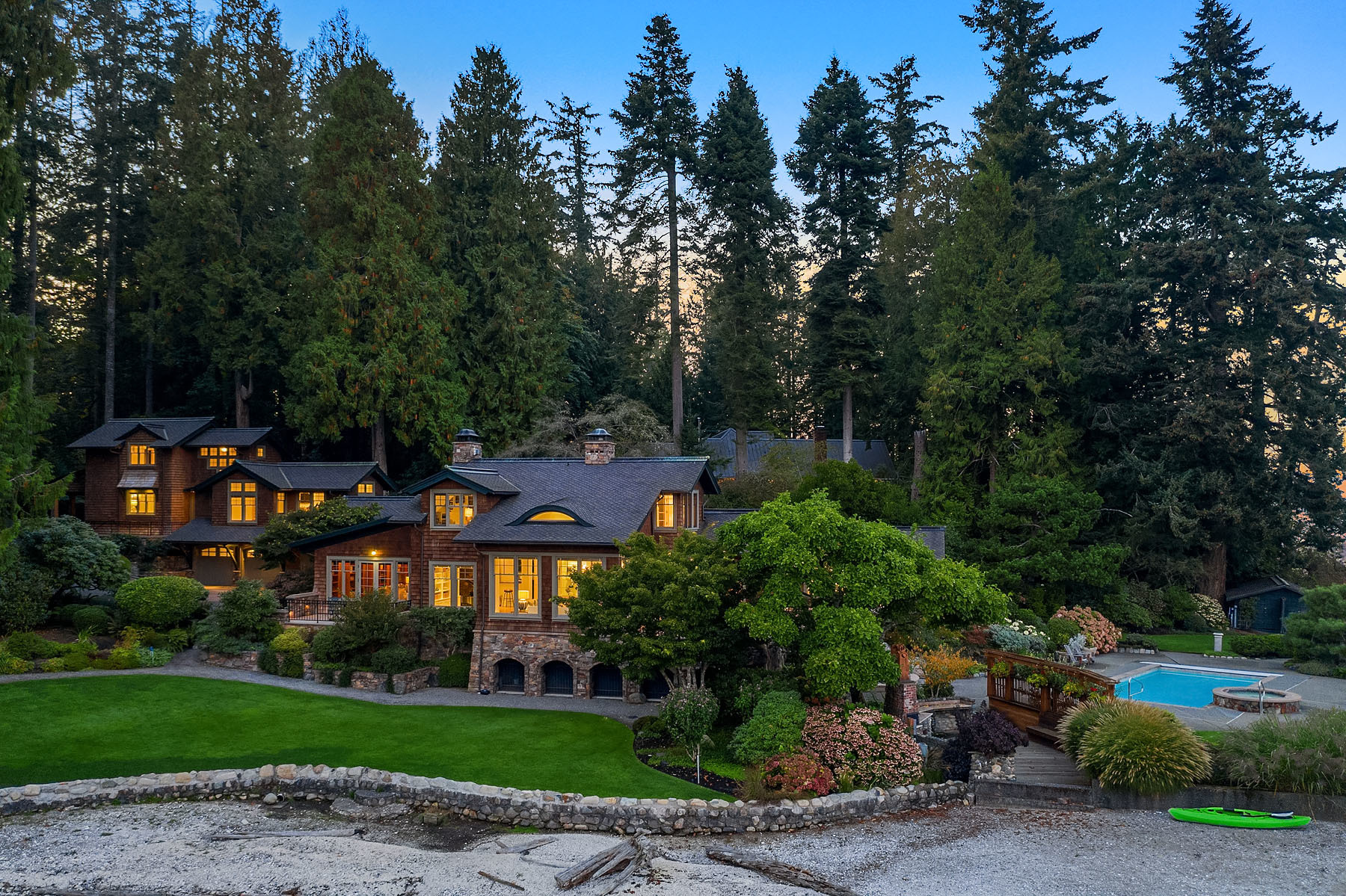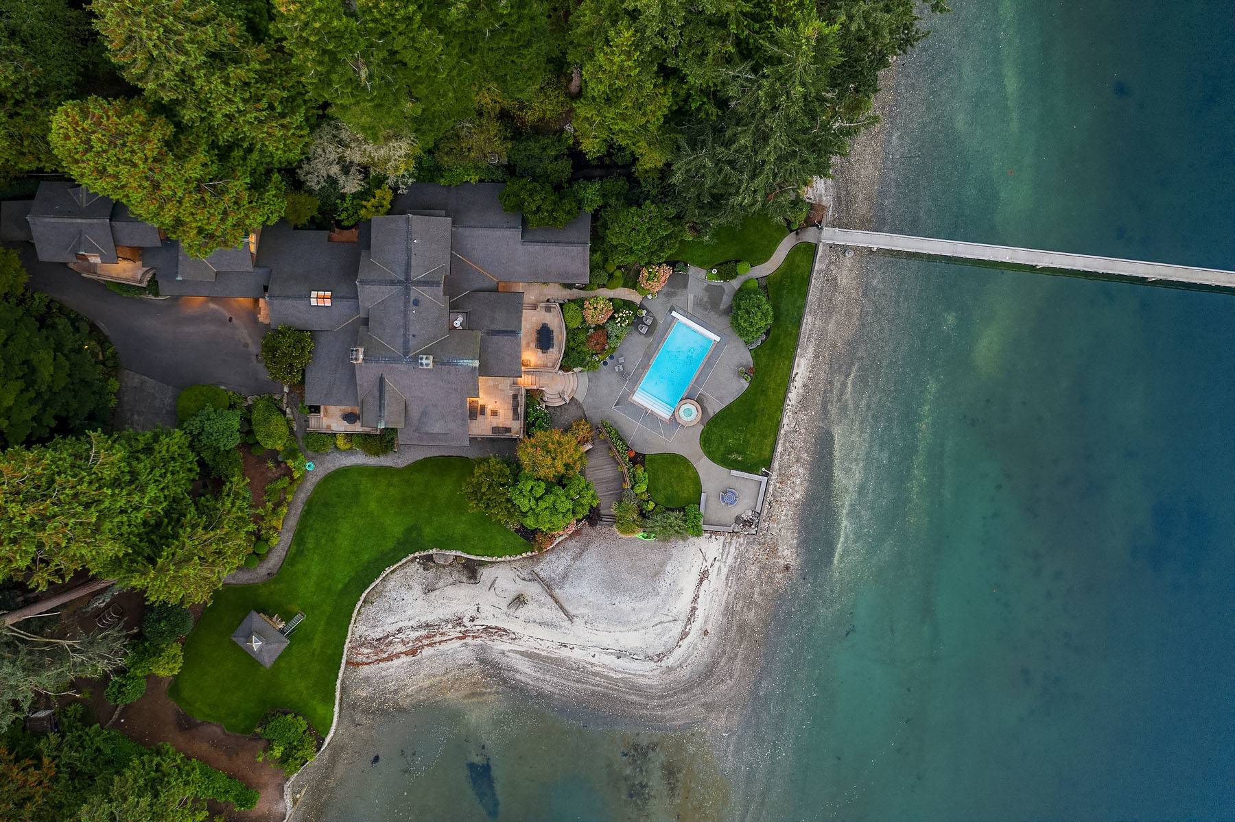This magnificent, custom-designed home sits on the shores of Manzanita Bay with hundreds of feet of no-bank waterfront and a deep water dock. A private drive meanders past the caretakers house to the main home surrounded by stunning landscaping. Attached to the main home is a carriage house for guests. Multiple sets of French doors lead to the pool, fire pit, and white sandy beach. Its simply magical. Classically inviting...and a perfect place to get away from it all. Island living