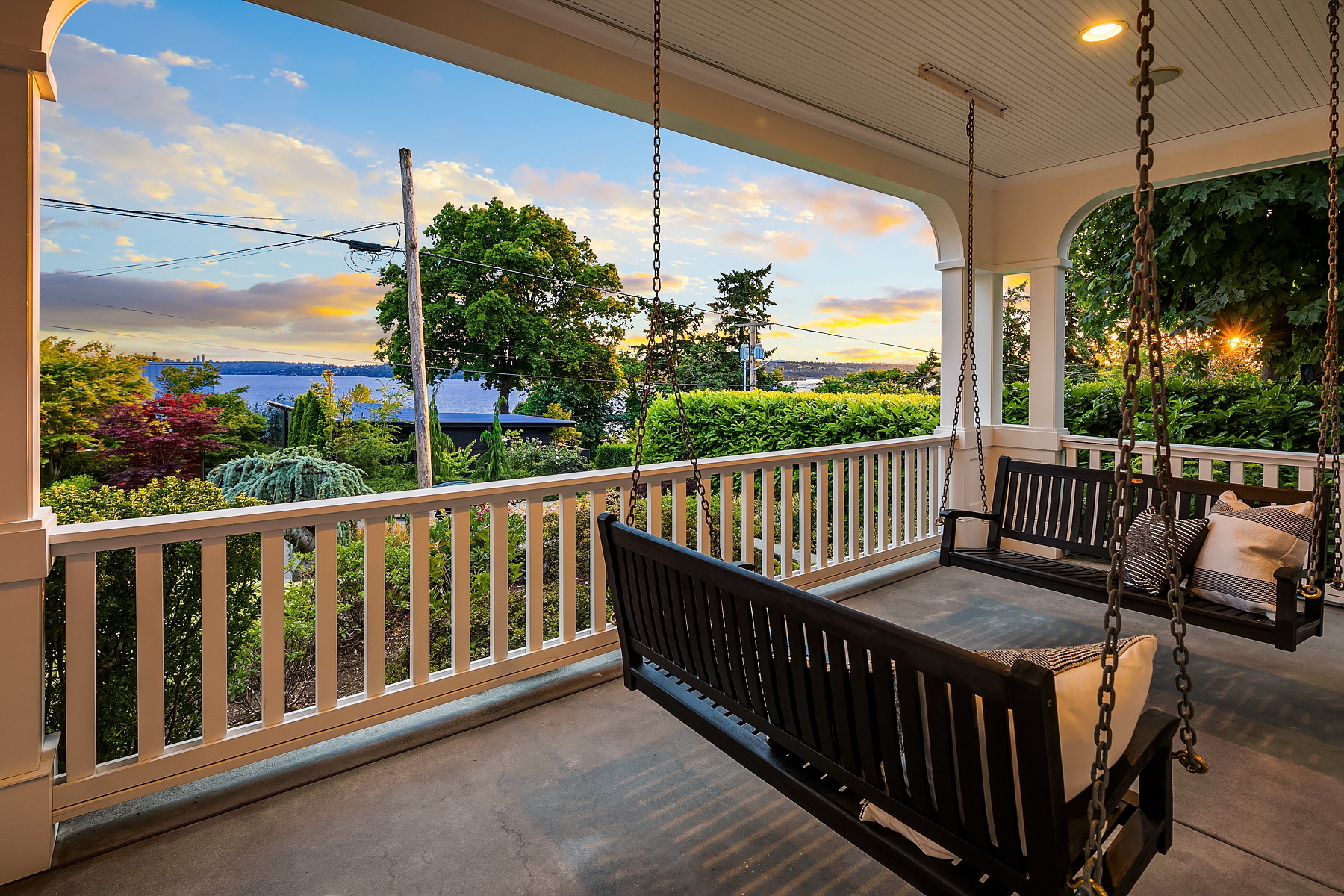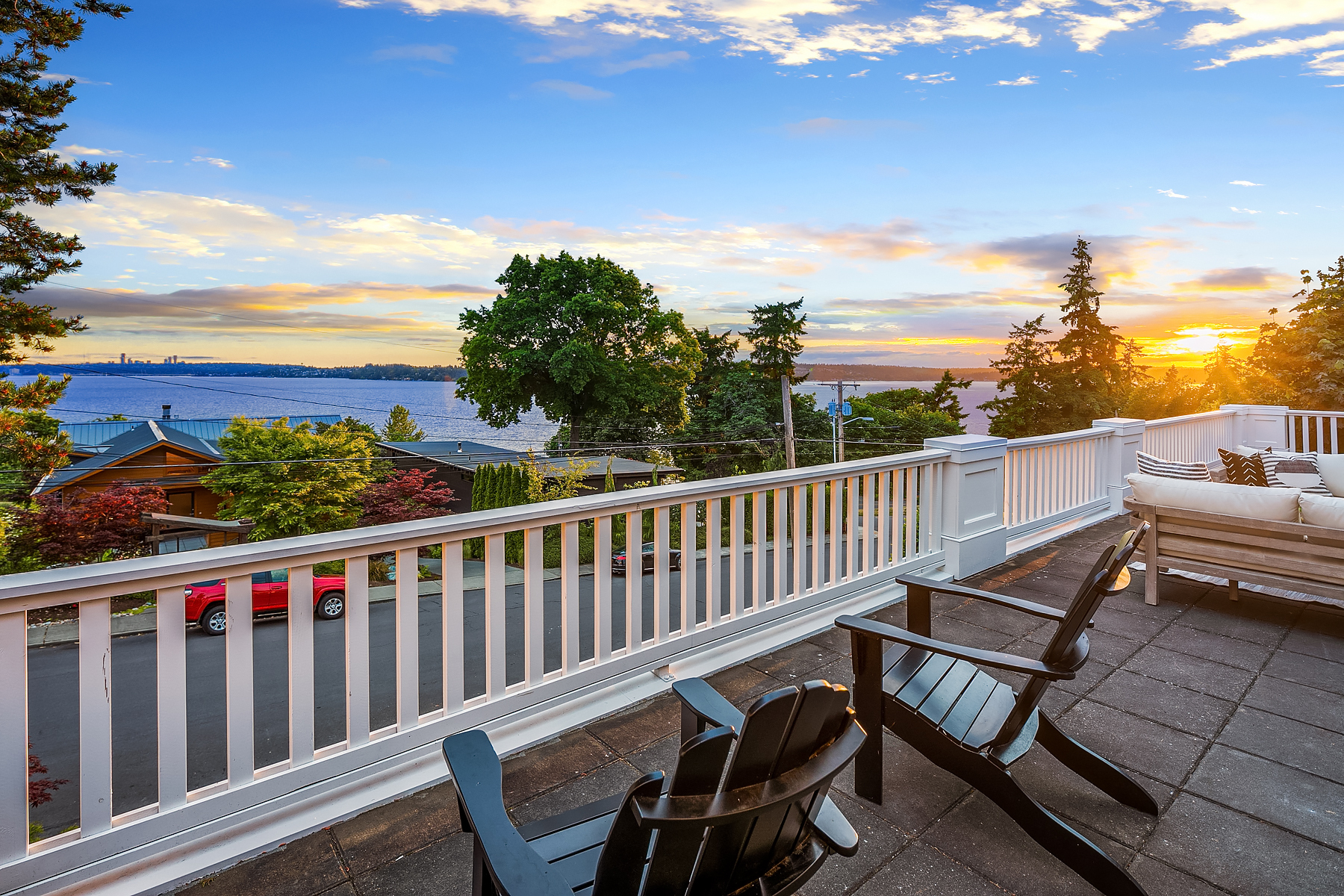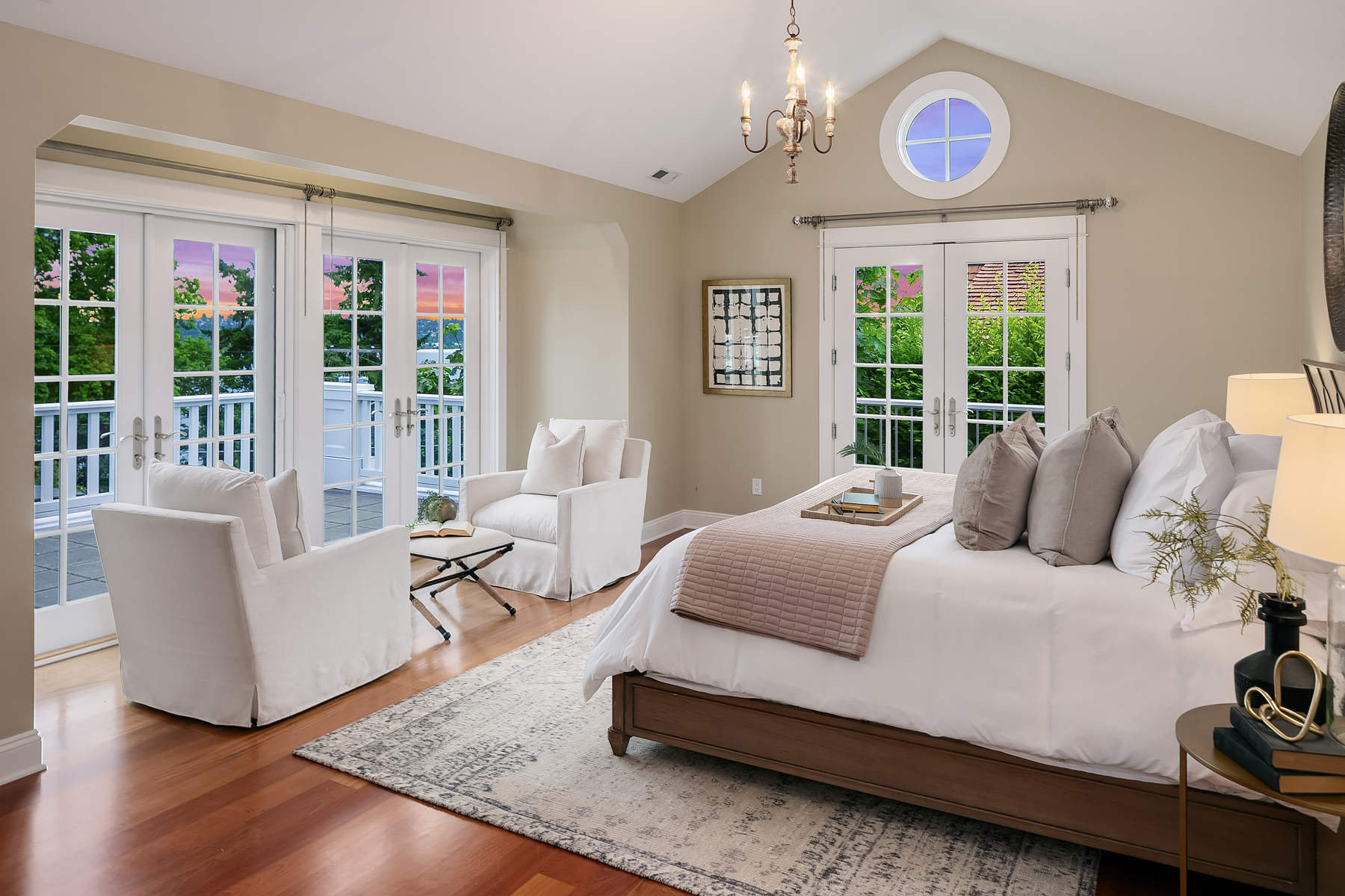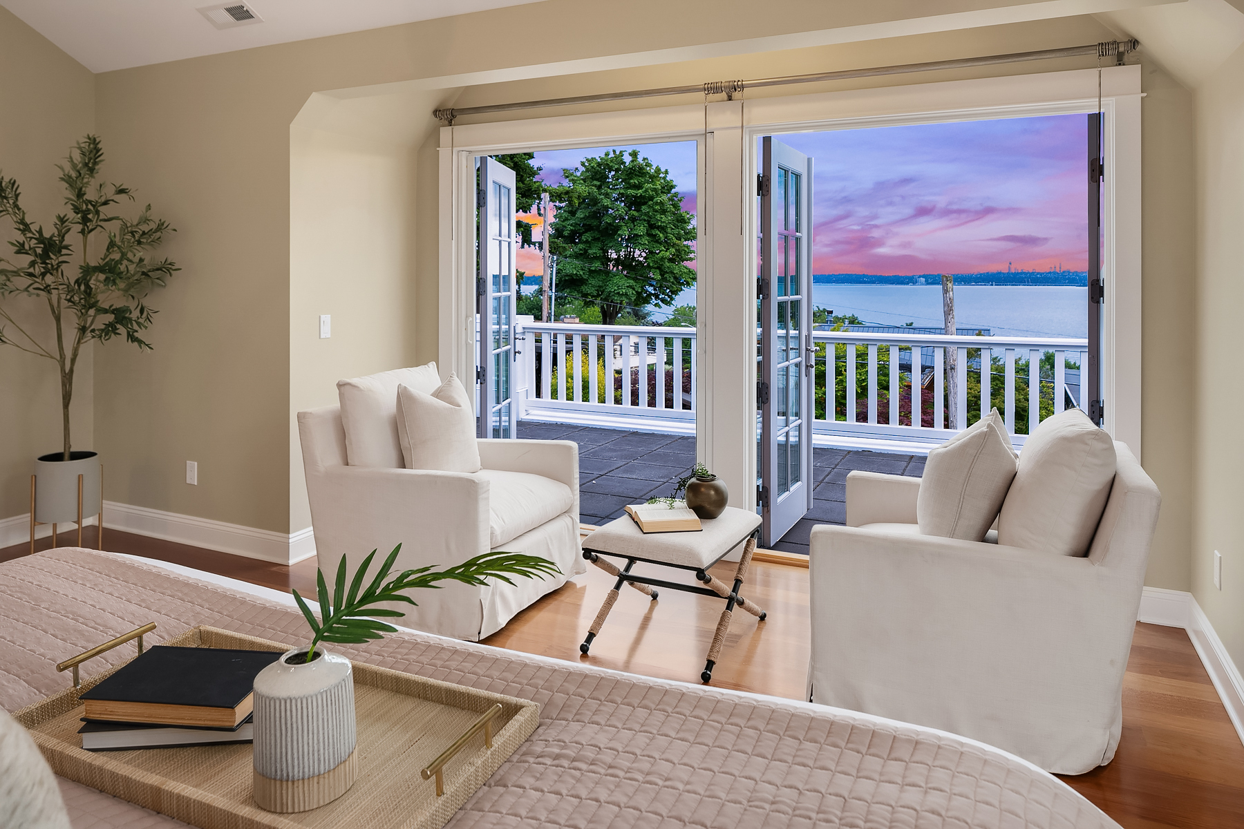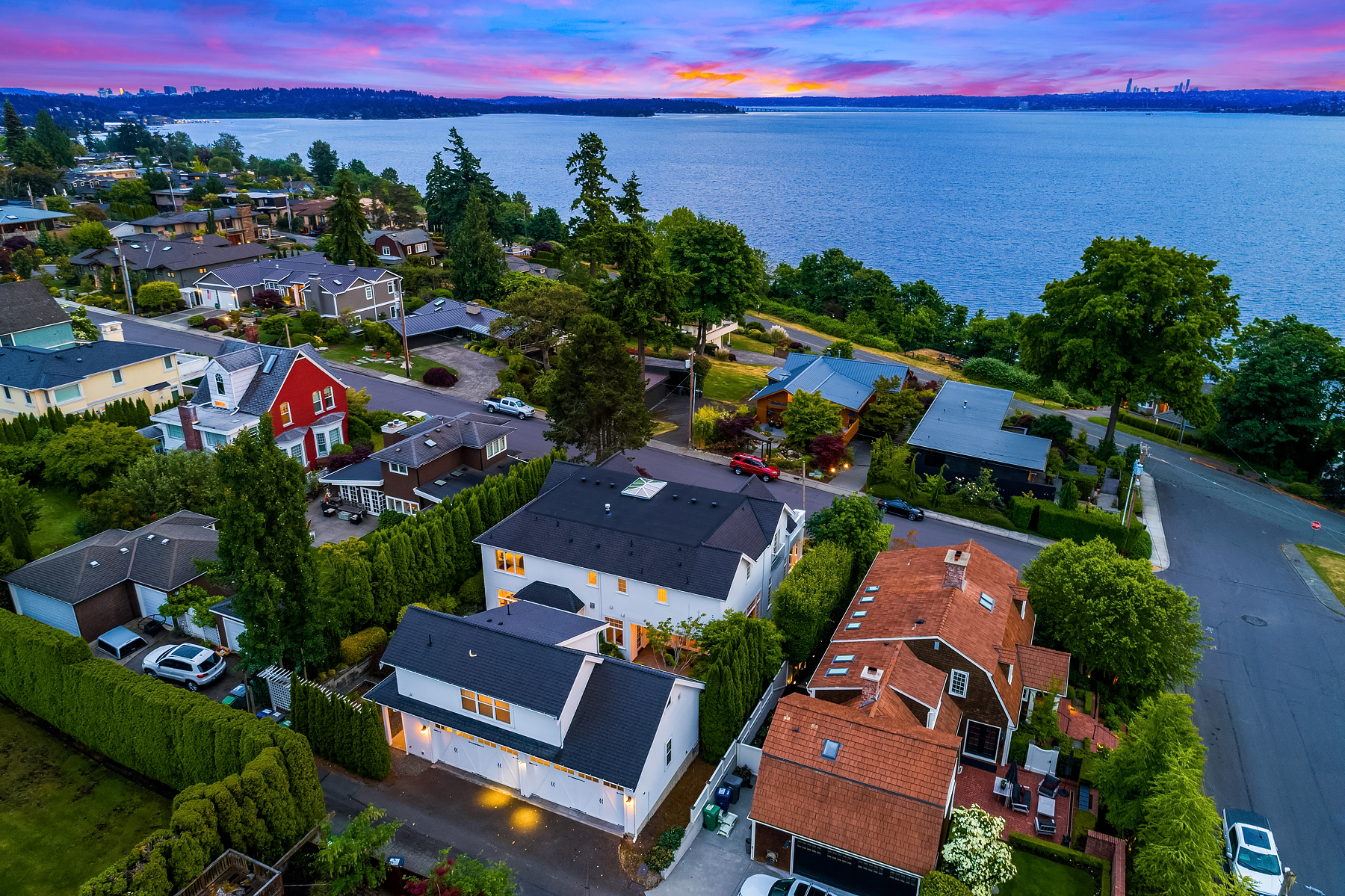 Exceptional Hamptons-inspired view residence located in the heart of West of Market. This exquisite home boasts over 5300sf of luxurious living with a rare-to-find side-by-side 4-car garage + ADU above--perfect for an office/guest quarters. The main home offers expansive entertaining spaces with magnificent west-facing view decks on both floors of the home. A classic white kitchen featuring top-of-the-line appliances including an impressive 72 range. Upstairs you'll discover three bedrooms, including the luxurious primary suite with a well-appointed spa bath wrapped in Carrara Marble, a view deck, and so much more. Lower-level includes 2 bedrooms, 3/4 bath, and a well-equipped media room. Easy stroll to lively DT, waterfront, parks + more.
