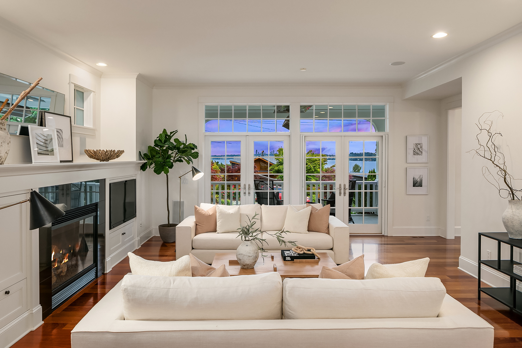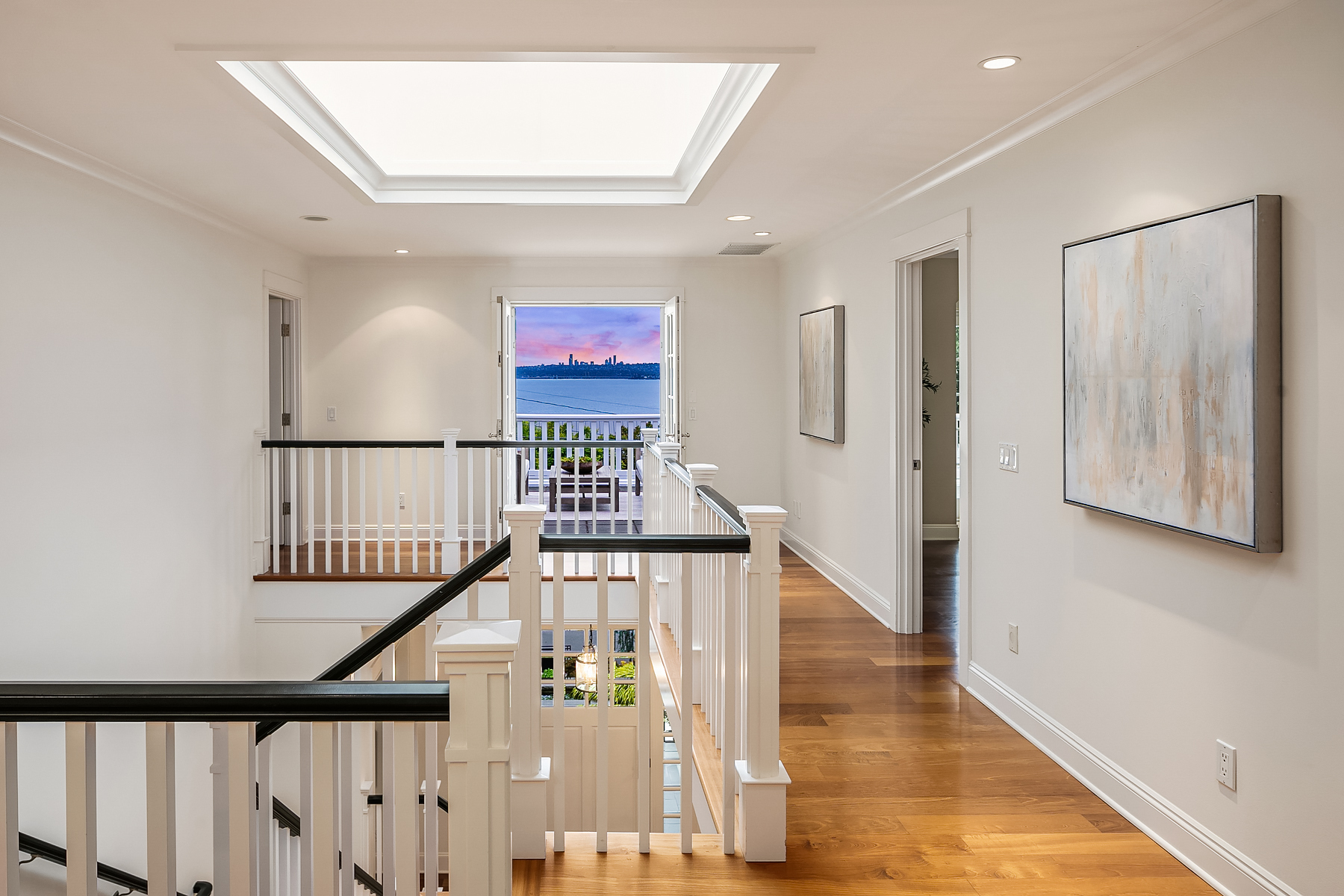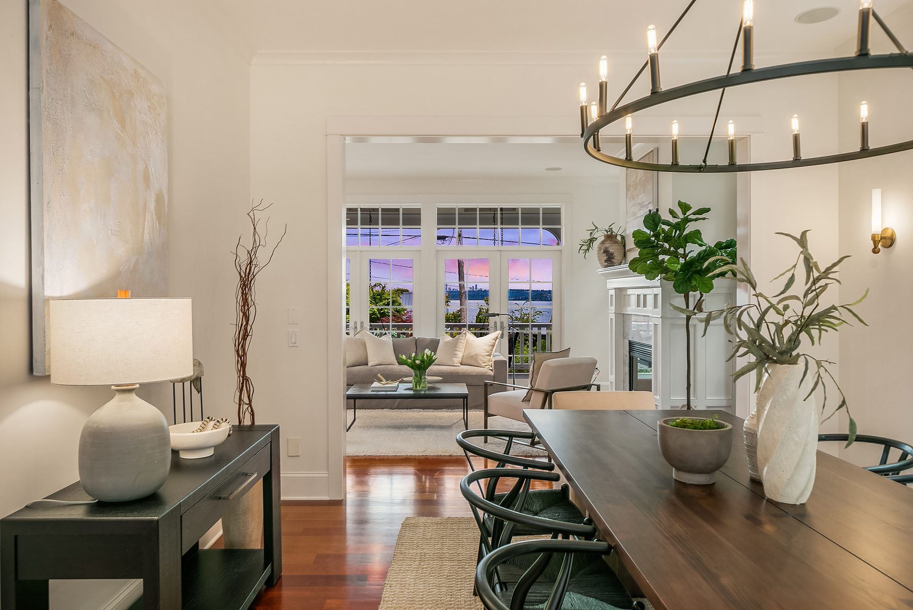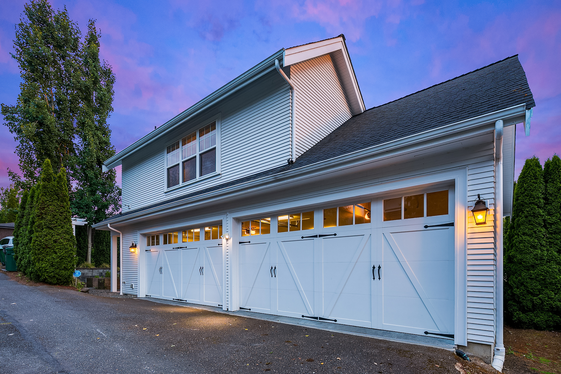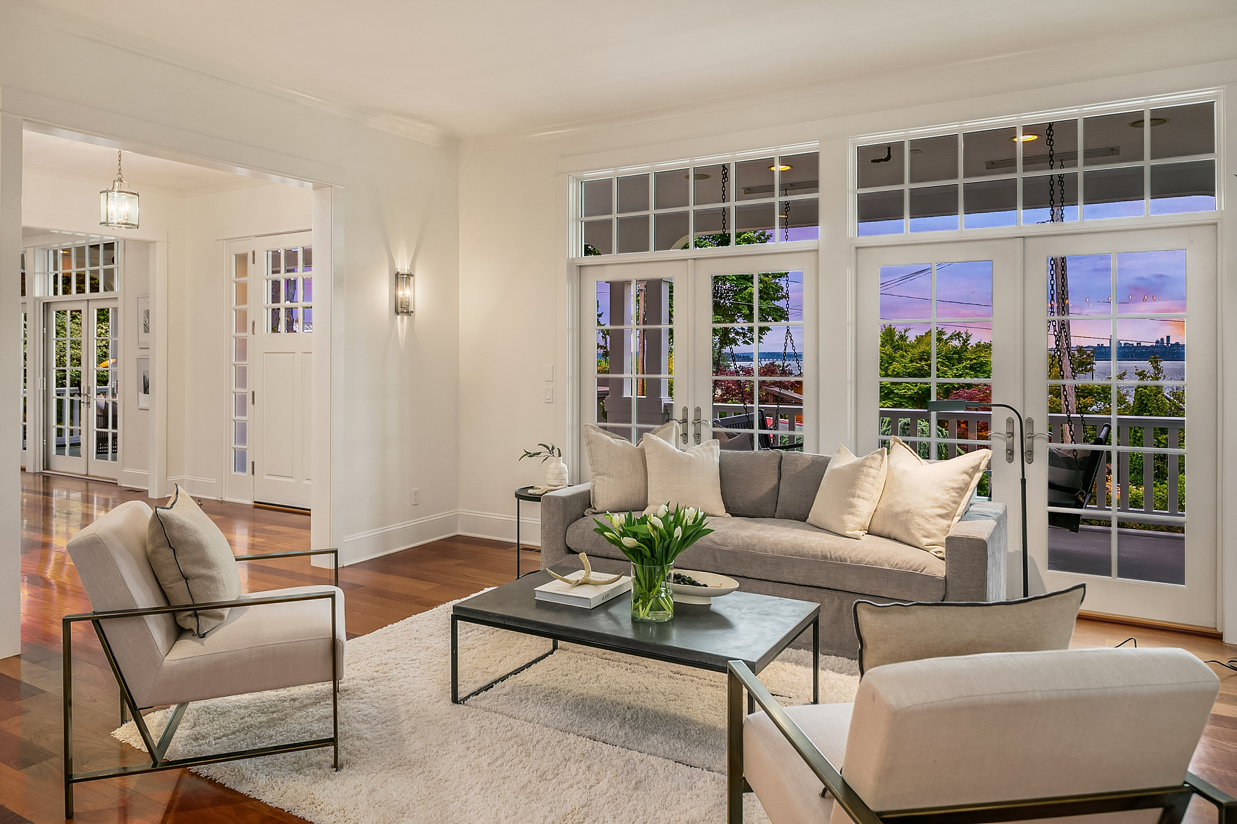 Exceptional Hamptons-inspired view residence located in the heart of West of Market. This exquisite home boasts over 5300sf of luxurious living with a rare-to-find side-by-side 4-car garage + ADU above--perfect for an office/guest quarters. The main home offers expansive entertaining spaces with magnificent west-facing view decks on both floors of the home. A classic white kitchen featuring top-of-the-line appliances including an impressive 72 range. Upstairs you'll discover three bedrooms, including the luxurious primary suite with a well-appointed spa bath wrapped in Carrara Marble, a view deck, and so much more. Lower-level includes 2 bedrooms, 3/4 bath, and a well-equipped media room. Easy stroll to lively DT, waterfront, parks + more.
