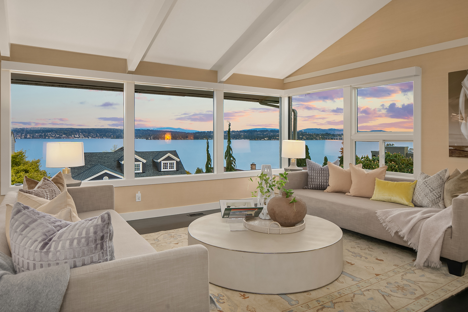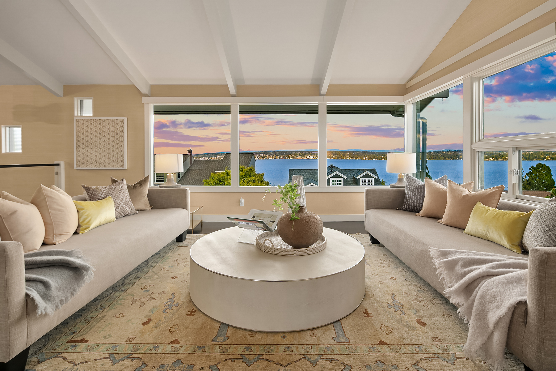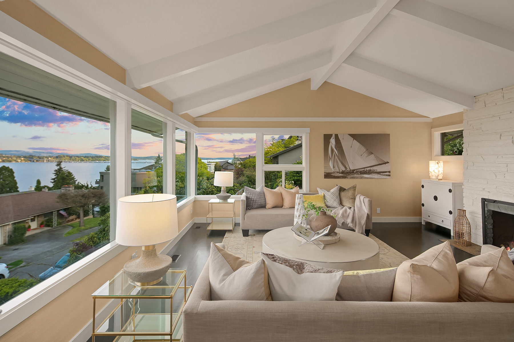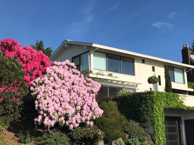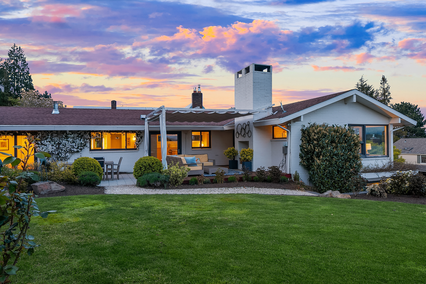 Rare opportunity to own treasured mid-century modern home in Laurelhurst, sited on 9362 sq ft lot with spectacular views of Mount Rainier, Lake Washington and Cascades. Sophisticated remodel features one level living, elevator, vaulted ceiling w/exposed beams, limestone flooring, Ann Sacks tile, stained alder cabinetry and Calacatta marble counter-tops. Owner’s suite offers fireplace, bookshelves, bathroom w/ soaking tub, walk-in closet, laundry, and garden. Enjoy endless entertaining from covered patio w/fireplace, large level lawn; all w/lake views! Professionally designed garden blooms in succession, featuring peonies, curated dahlia collection and lavender. Two additional bedrooms, office, garage, beach club membership and much more!