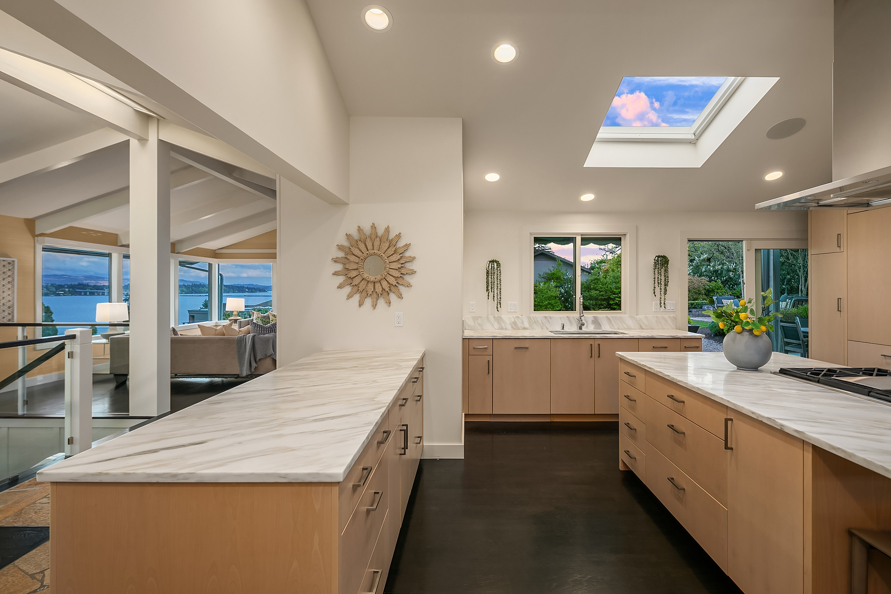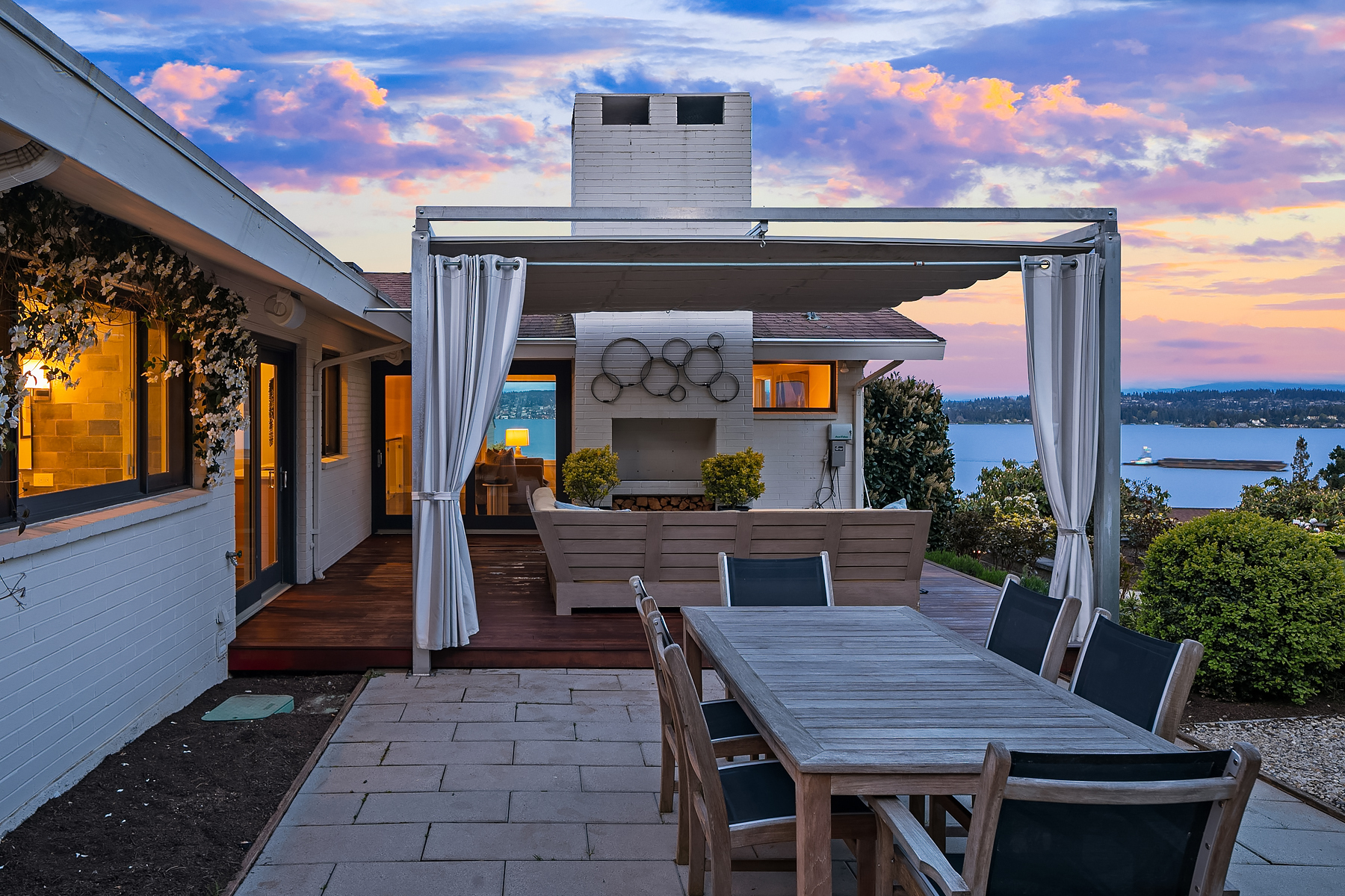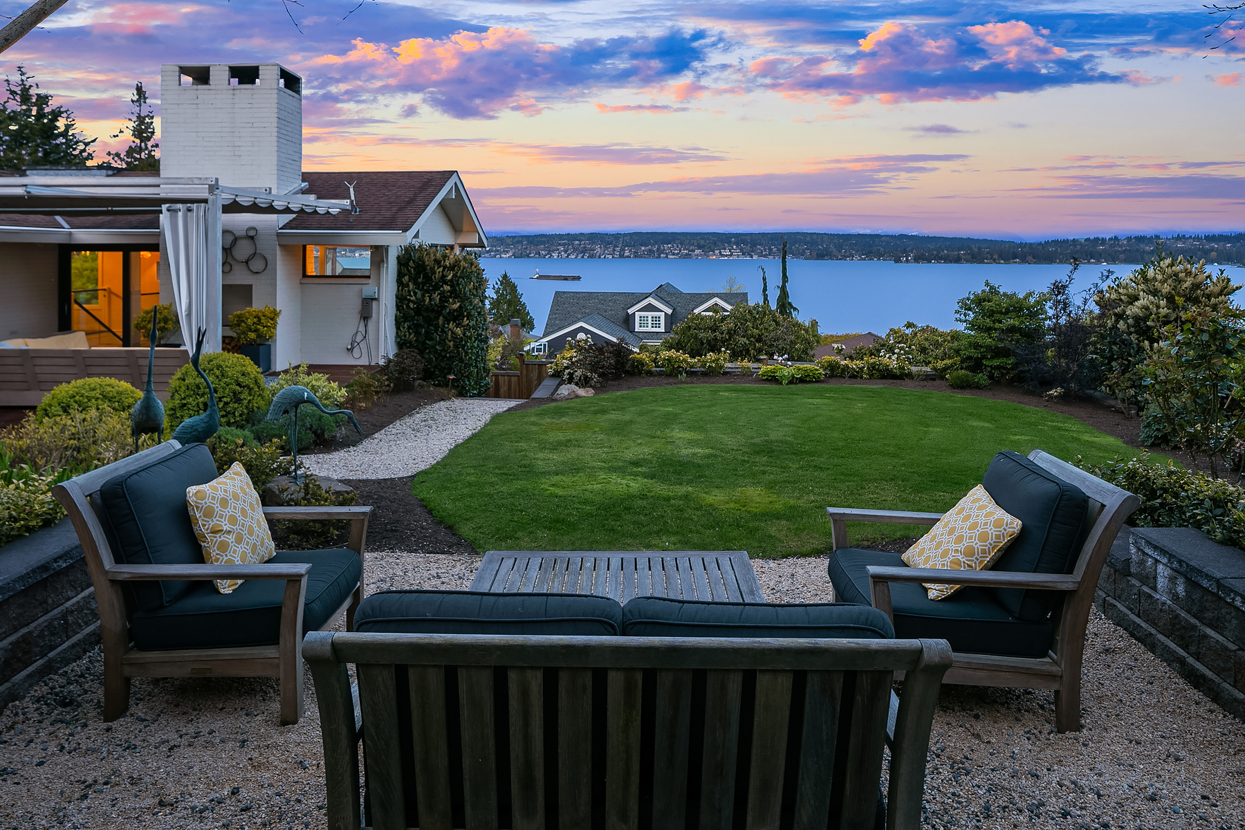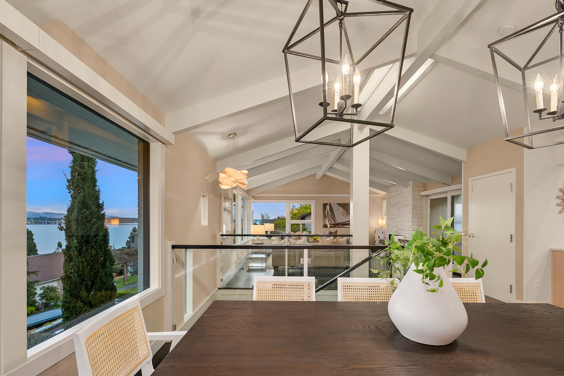 Rare opportunity to own treasured mid-century modern home in Laurelhurst, sited on 9362 sq ft lot with spectacular views of Mount Rainier, Lake Washington and Cascades. Sophisticated remodel features one level living, elevator, vaulted ceiling w/exposed beams, limestone flooring, Ann Sacks tile, stained alder cabinetry and Calacatta marble counter-tops. Owner’s suite offers fireplace, bookshelves, bathroom w/ soaking tub, walk-in closet, laundry, and garden. Enjoy endless entertaining from covered patio w/fireplace, large level lawn; all w/lake views! Professionally designed garden blooms in succession, featuring peonies, curated dahlia collection and lavender. Two additional bedrooms, office, garage, beach club membership and much more!