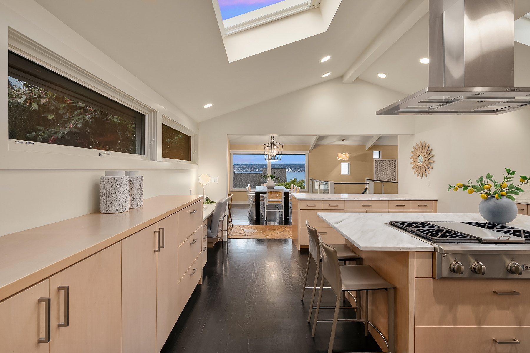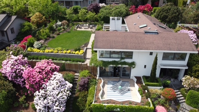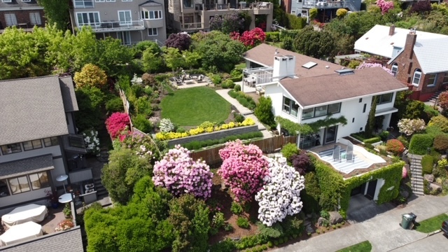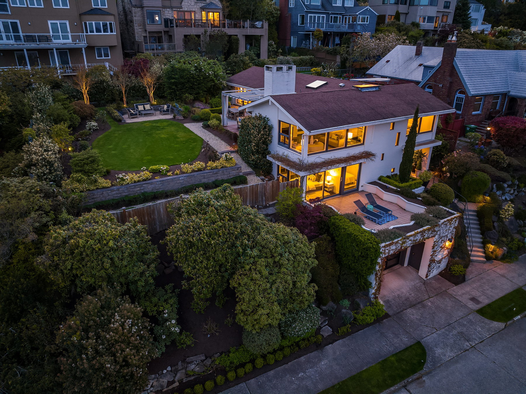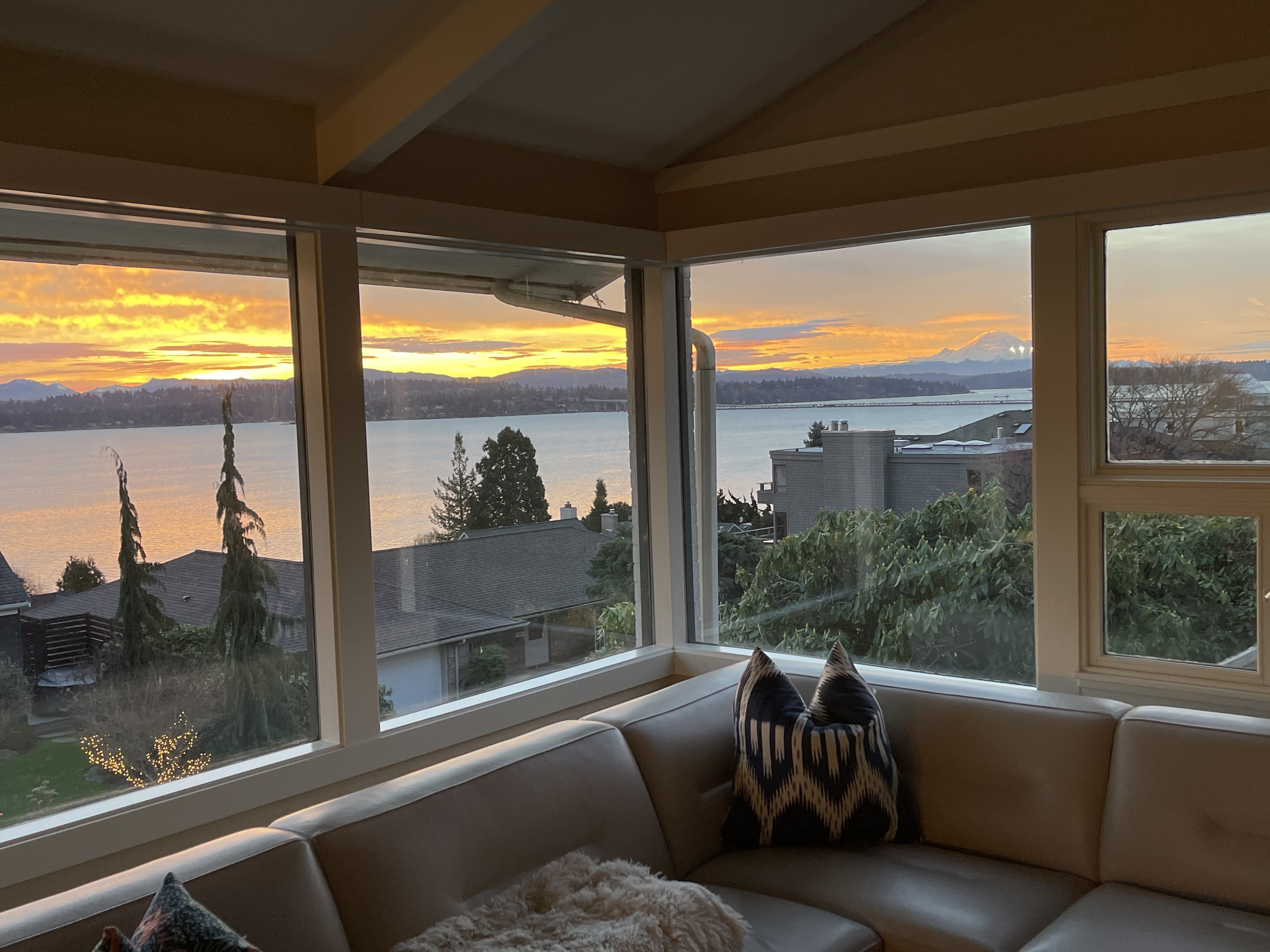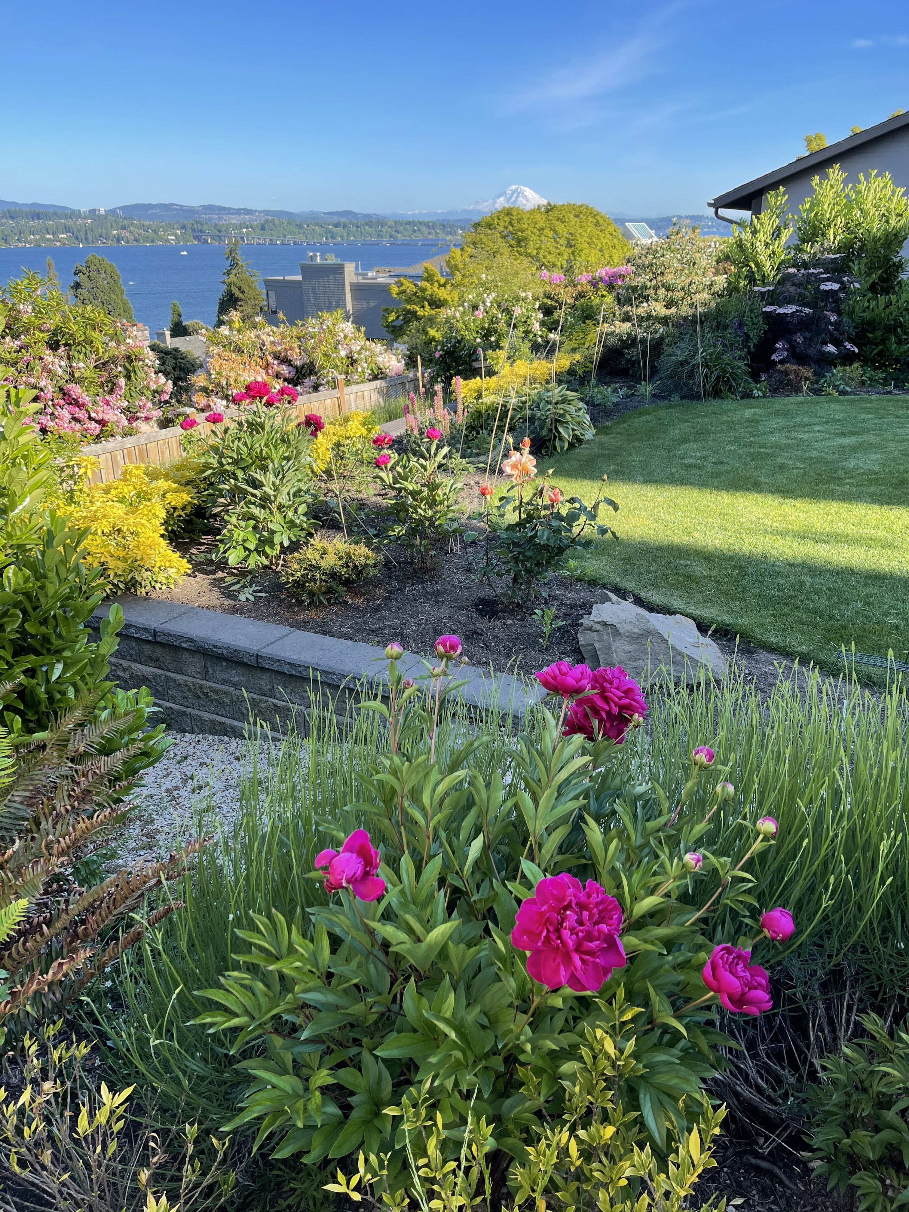 Rare opportunity to own treasured mid-century modern home in Laurelhurst, sited on 9362 sq ft lot with spectacular views of Mount Rainier, Lake Washington and Cascades. Sophisticated remodel features one level living, elevator, vaulted ceiling w/exposed beams, limestone flooring, Ann Sacks tile, stained alder cabinetry and Calacatta marble counter-tops. Owner’s suite offers fireplace, bookshelves, bathroom w/ soaking tub, walk-in closet, laundry, and garden. Enjoy endless entertaining from covered patio w/fireplace, large level lawn; all w/lake views! Professionally designed garden blooms in succession, featuring peonies, curated dahlia collection and lavender. Two additional bedrooms, office, garage, beach club membership and much more!