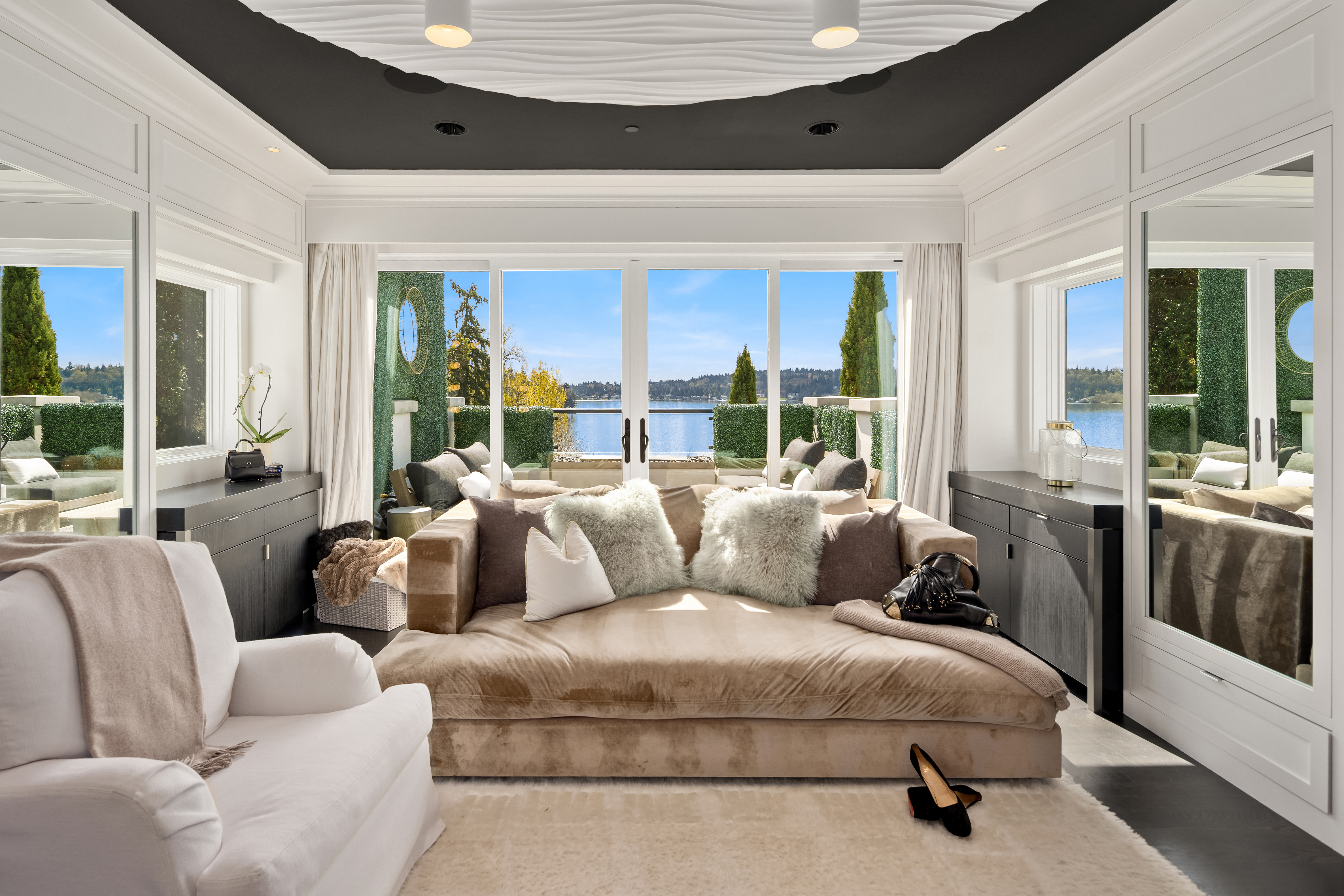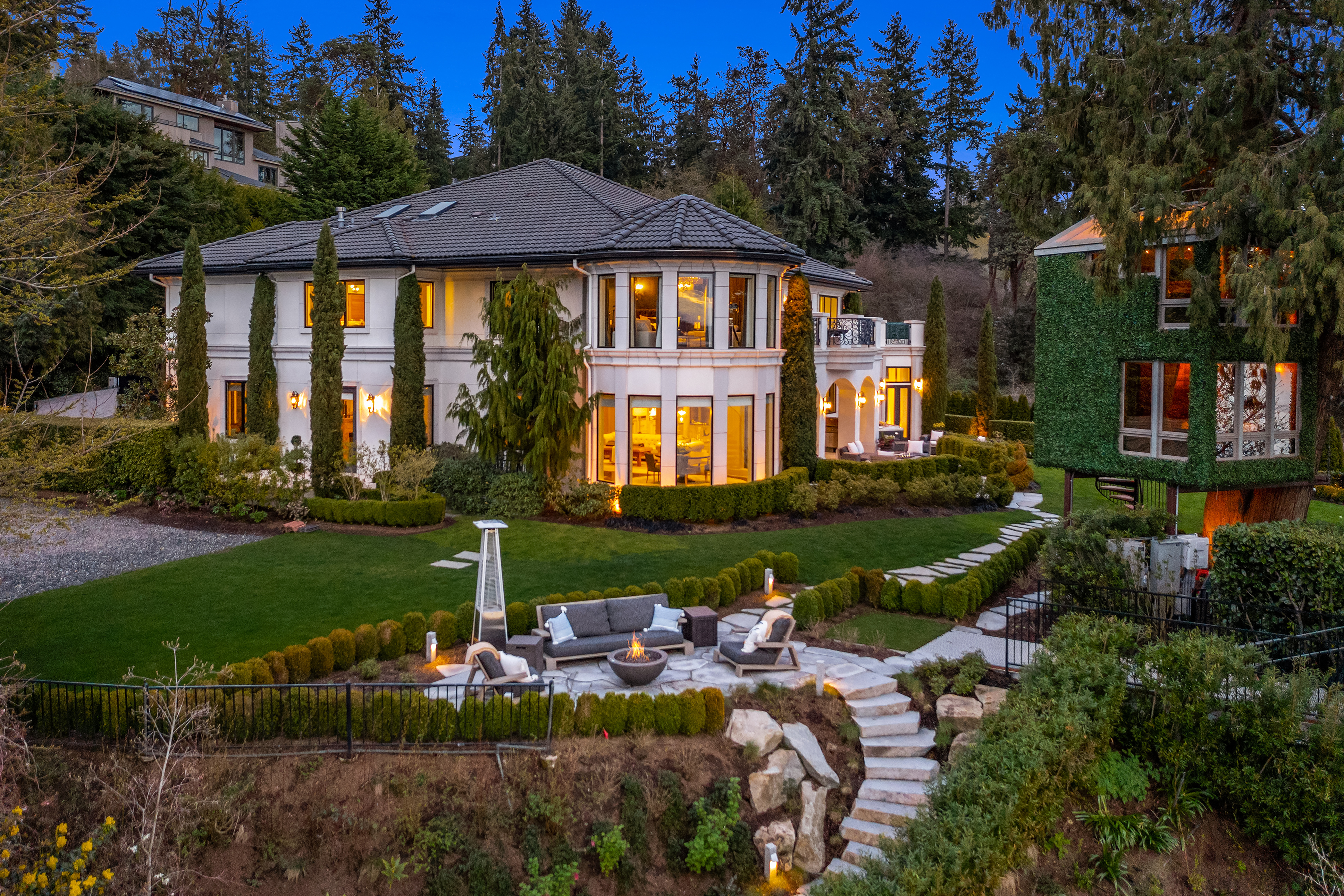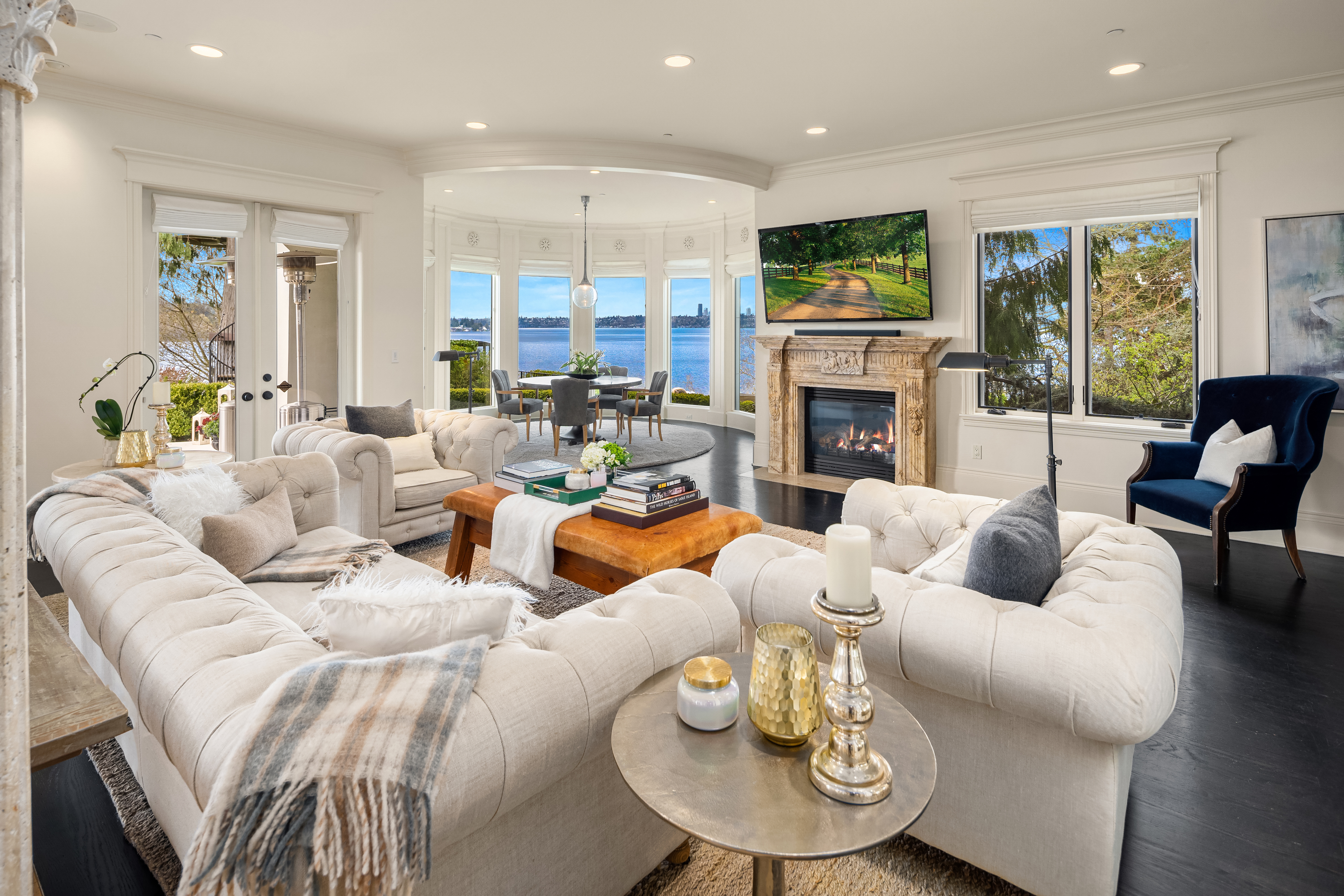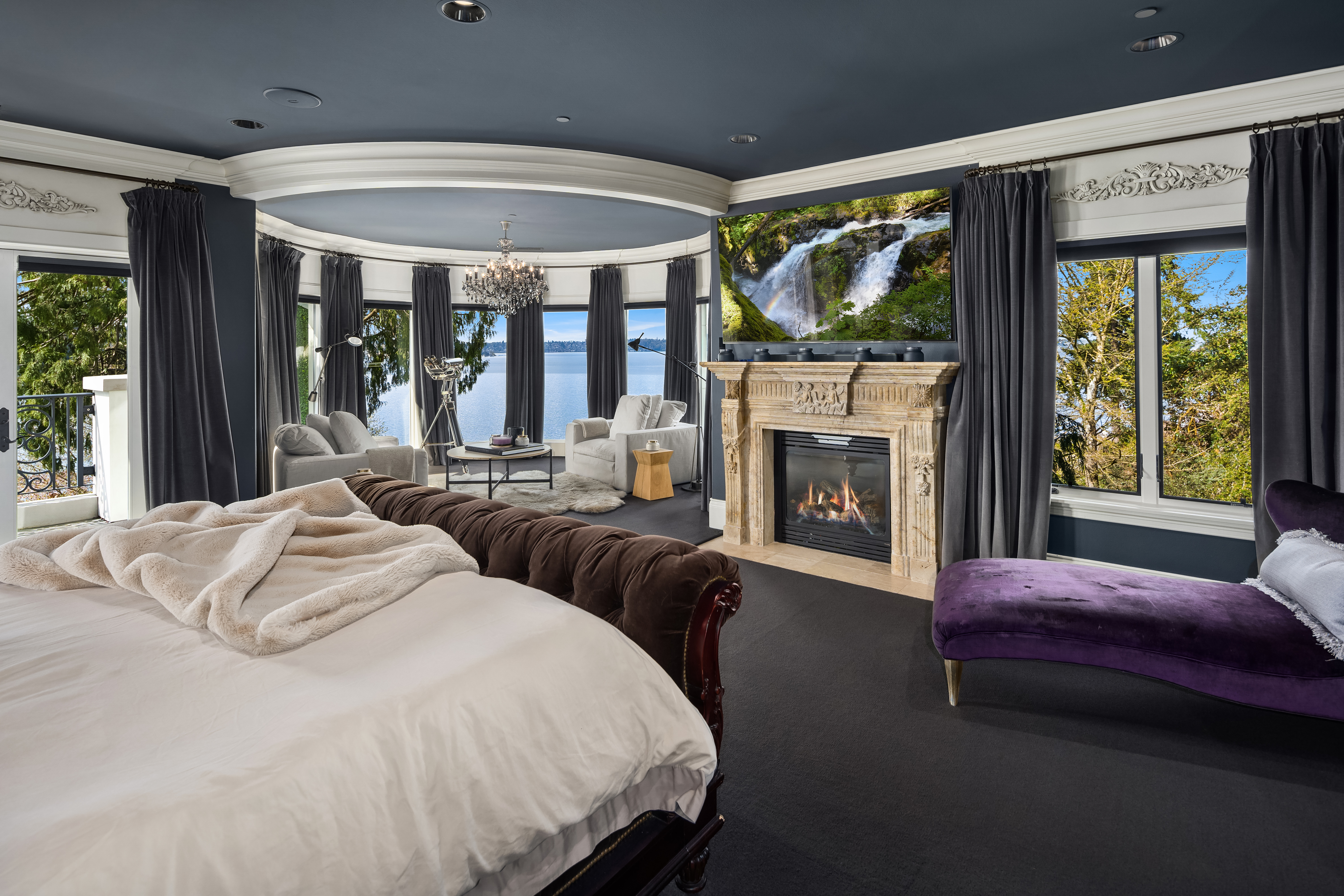 A signature waterfront estate offering elevated living, exquisite design and exceptional views. Bask in bluff-top privacy and beachside fun. Luxury, by the numbers: Main level has flawless 180° views; 20-ft tall entry rotunda; 2 dining spaces; epicurean kitchen with 8-burner stove + 14-ft prep island; pro gym off the 3-bay garage. Upper level has 4 en-suite bedrooms, 2 balconies, 200+ square feet of closet space, 1 Hollywood-worthy glam room. Lower level has 1 bedroom, 1 cinema, 1 dance/yoga studio, a 3-story elevator and 3 large play spaces. The exterior has 3 patios, 12 parking spots, a 2-story treehouse, 3-slip dock, 2 jet ski lifts. Experience 164' of waterfront w/ extraordinary views. It all adds up to a champion’s life.