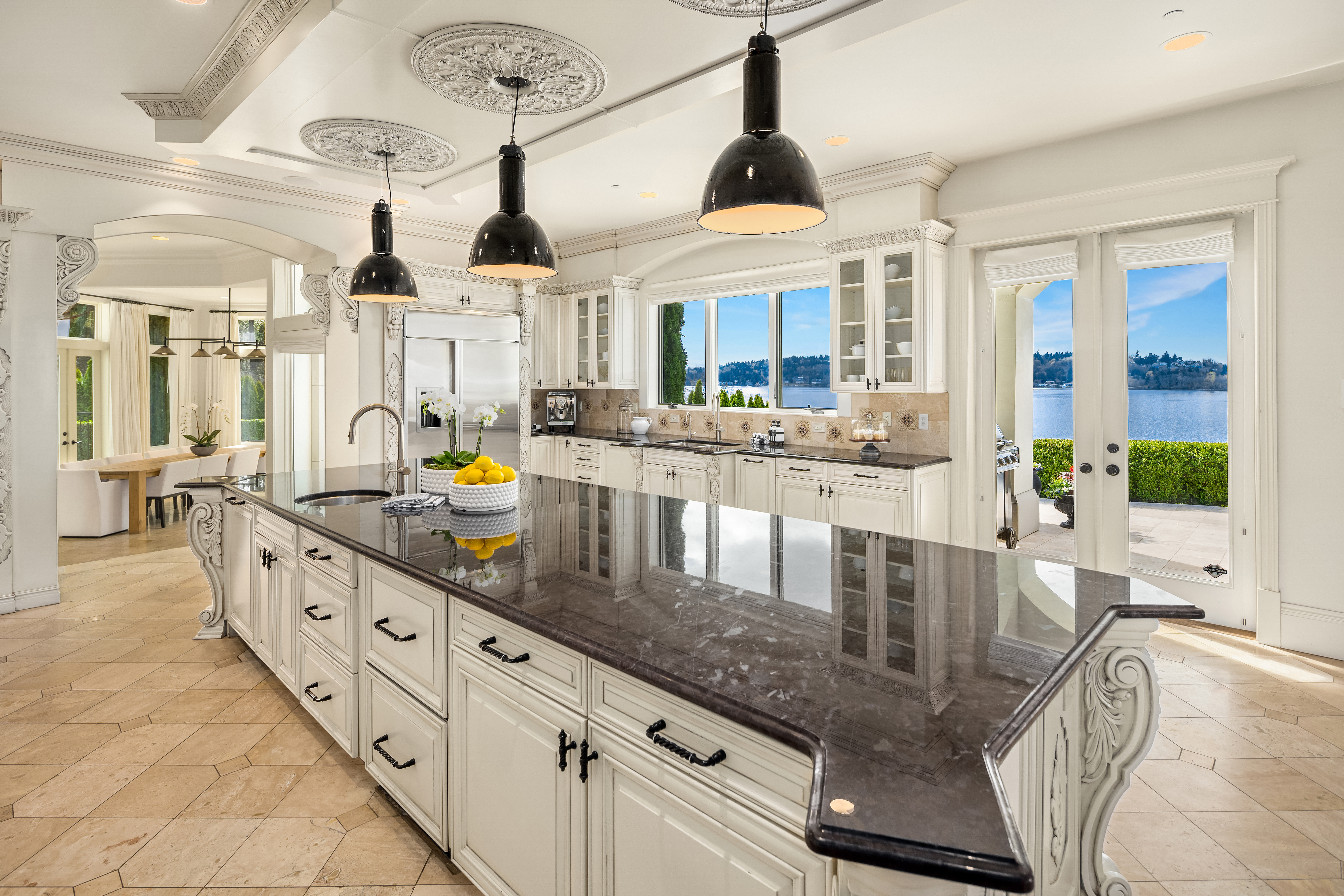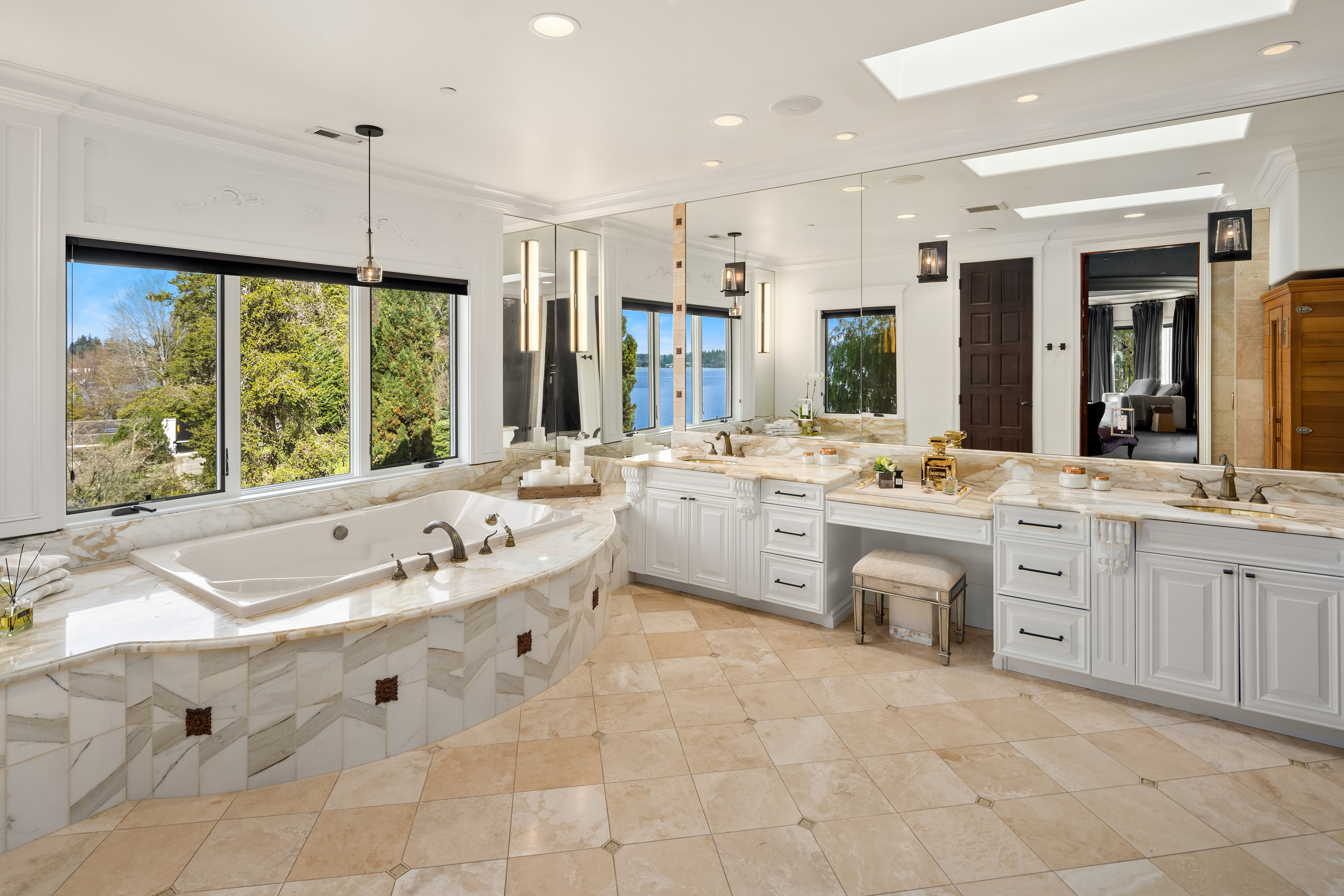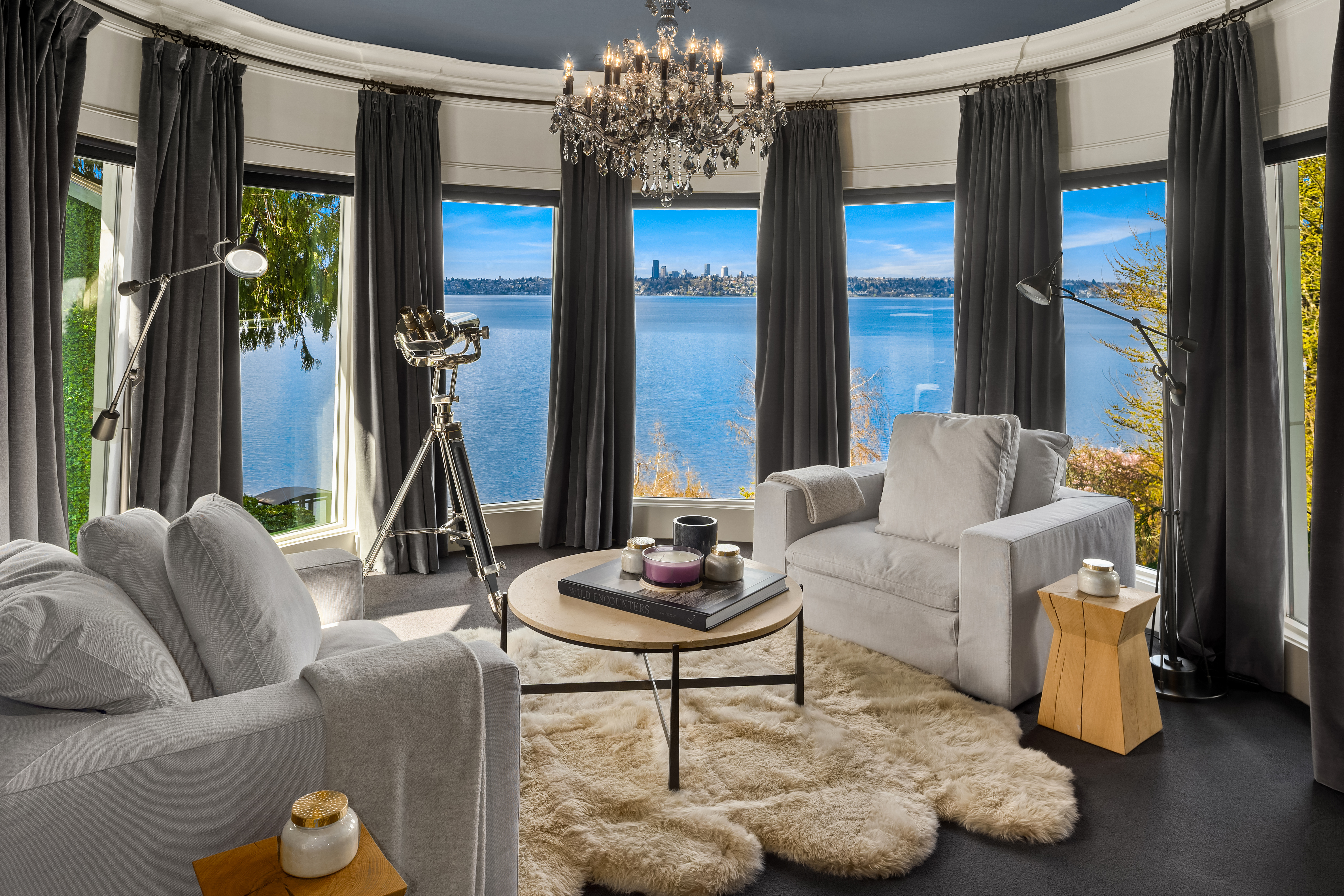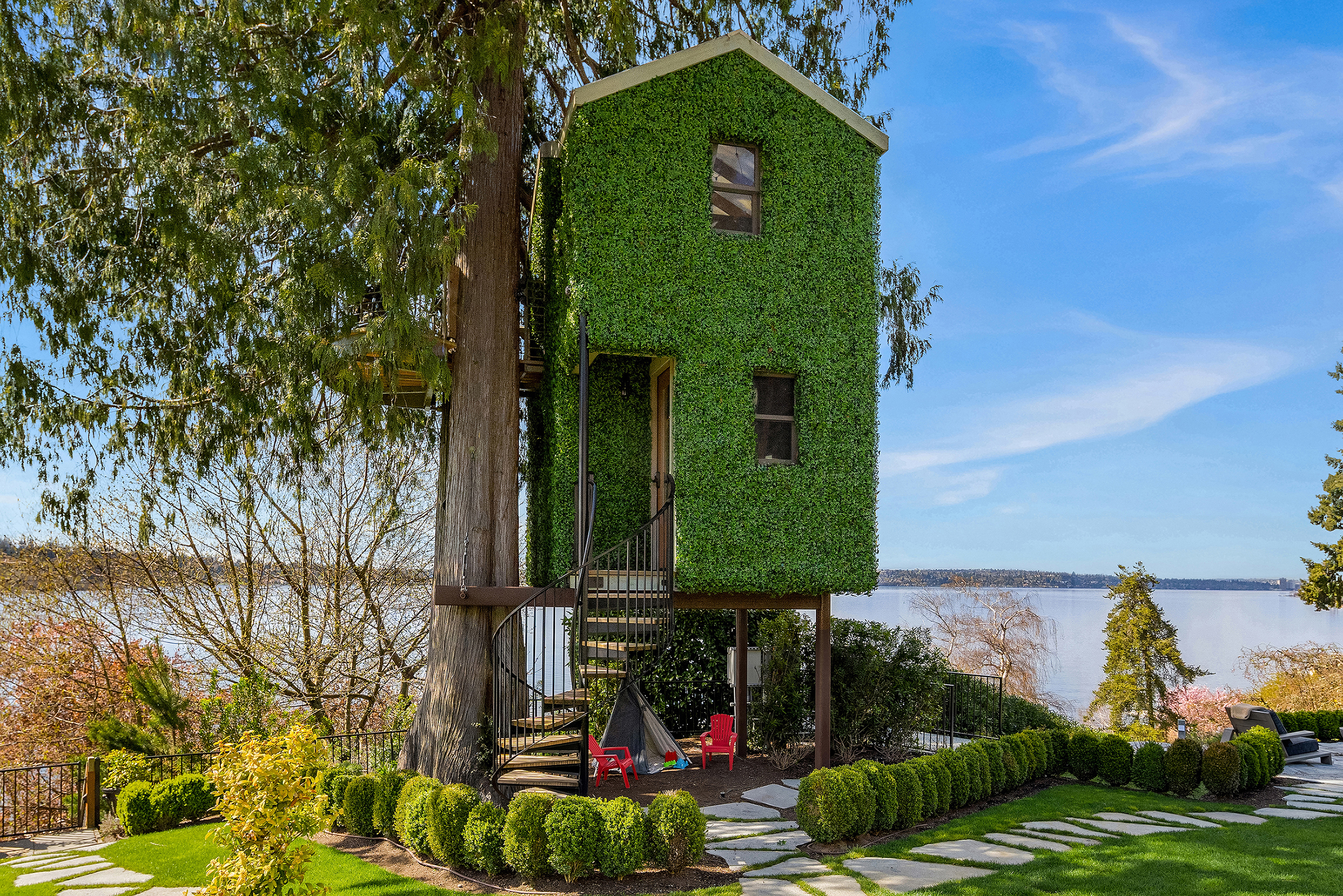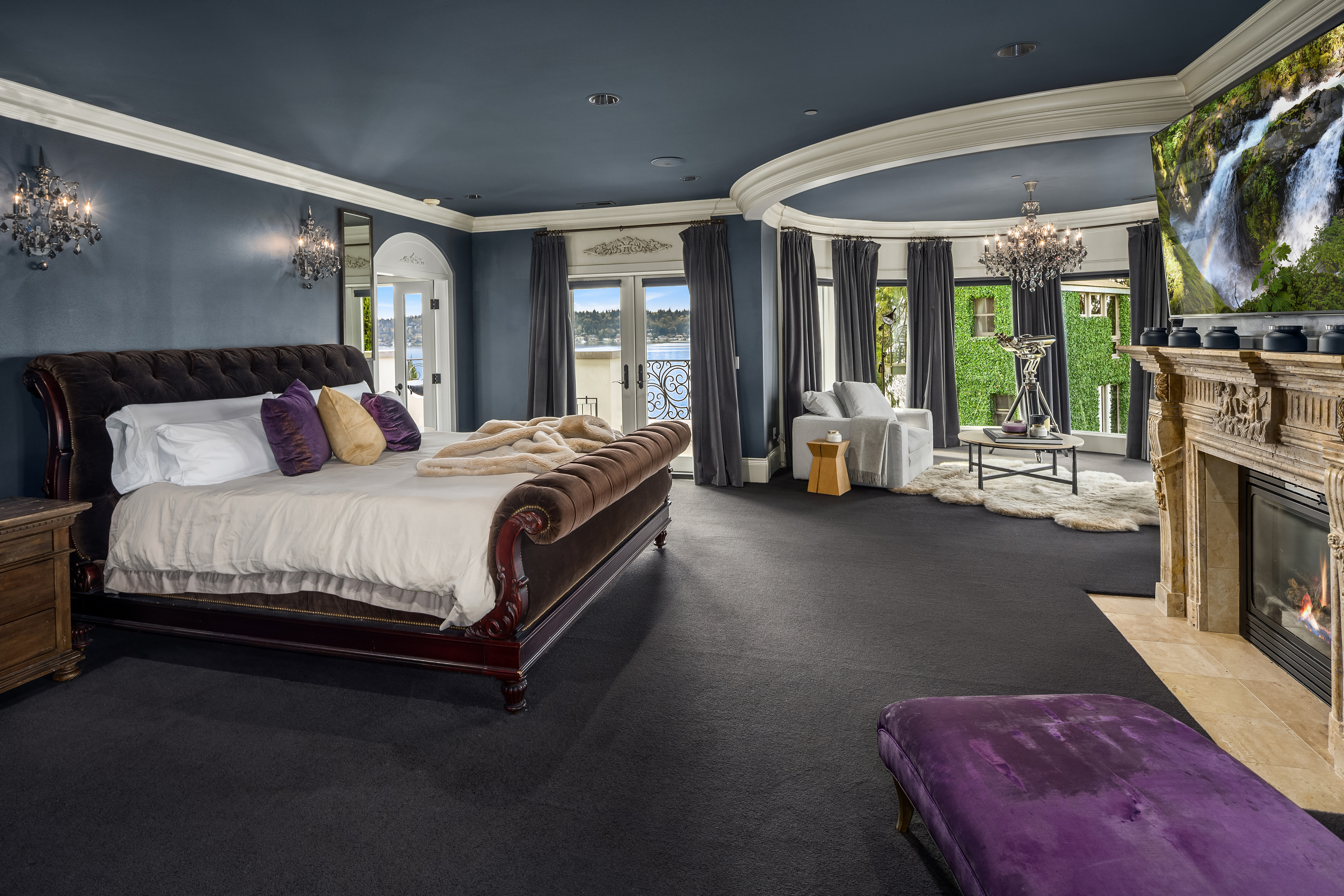 A signature waterfront estate offering elevated living, exquisite design and exceptional views. Bask in bluff-top privacy and beachside fun. Luxury, by the numbers: Main level has flawless 180° views; 20-ft tall entry rotunda; 2 dining spaces; epicurean kitchen with 8-burner stove + 14-ft prep island; pro gym off the 3-bay garage. Upper level has 4 en-suite bedrooms, 2 balconies, 200+ square feet of closet space, 1 Hollywood-worthy glam room. Lower level has 1 bedroom, 1 cinema, 1 dance/yoga studio, a 3-story elevator and 3 large play spaces. The exterior has 3 patios, 12 parking spots, a 2-story treehouse, 3-slip dock, 2 jet ski lifts. Experience 164' of waterfront w/ extraordinary views. It all adds up to a champion’s life.