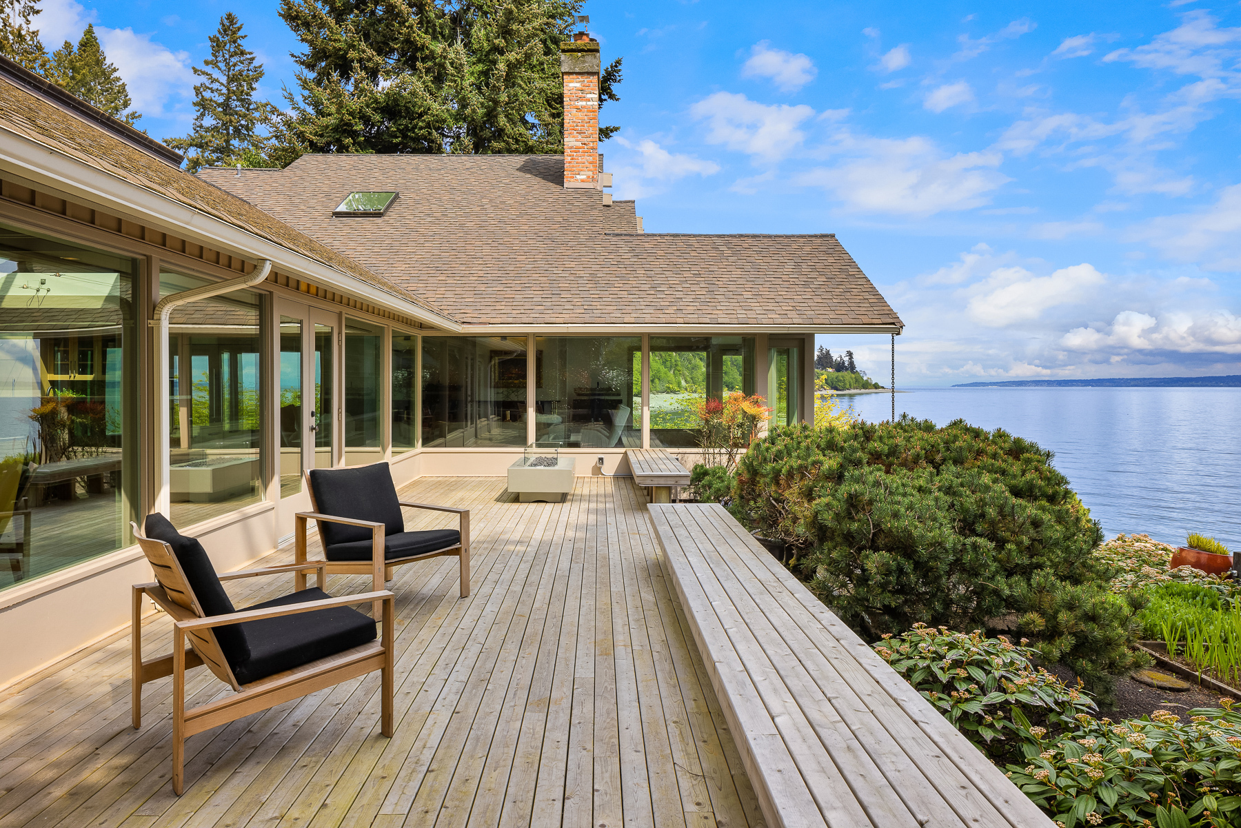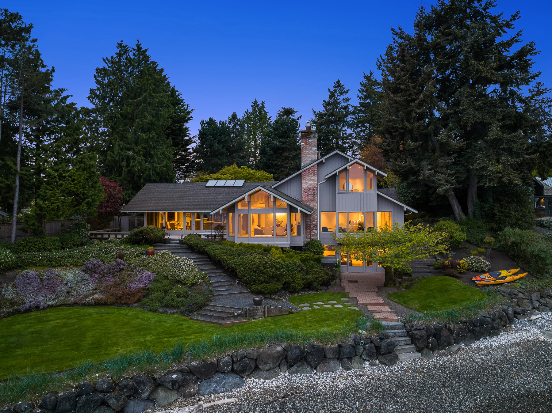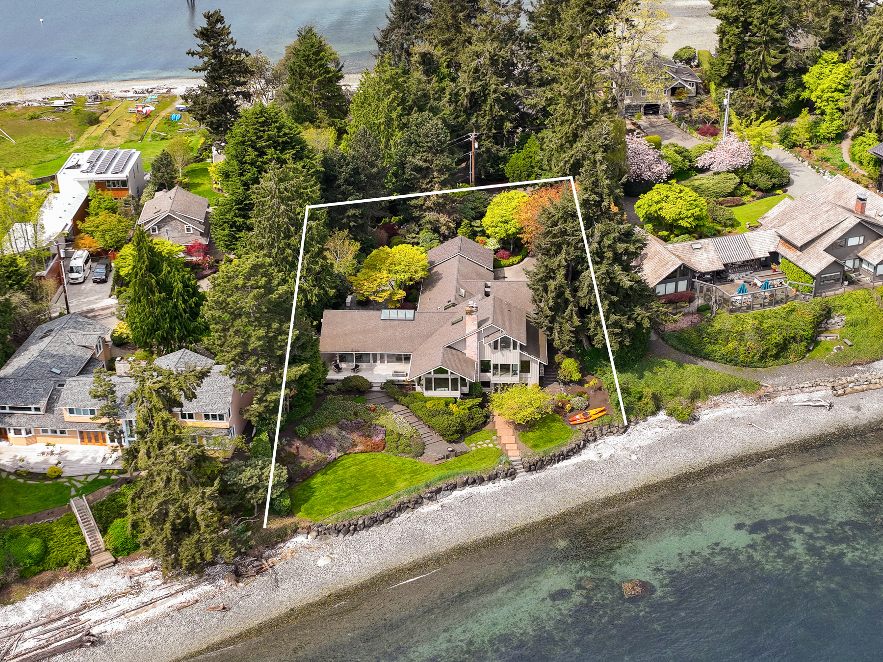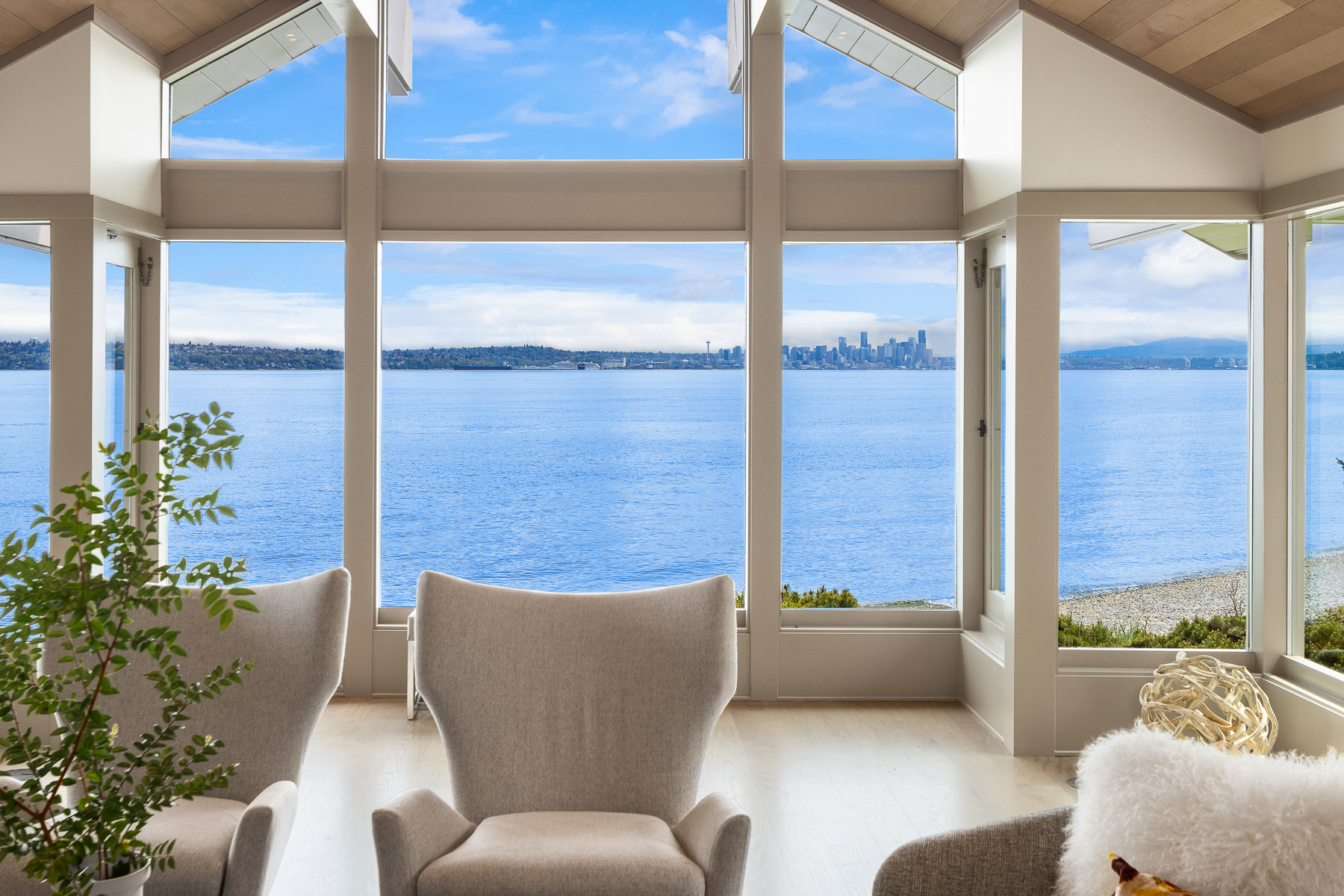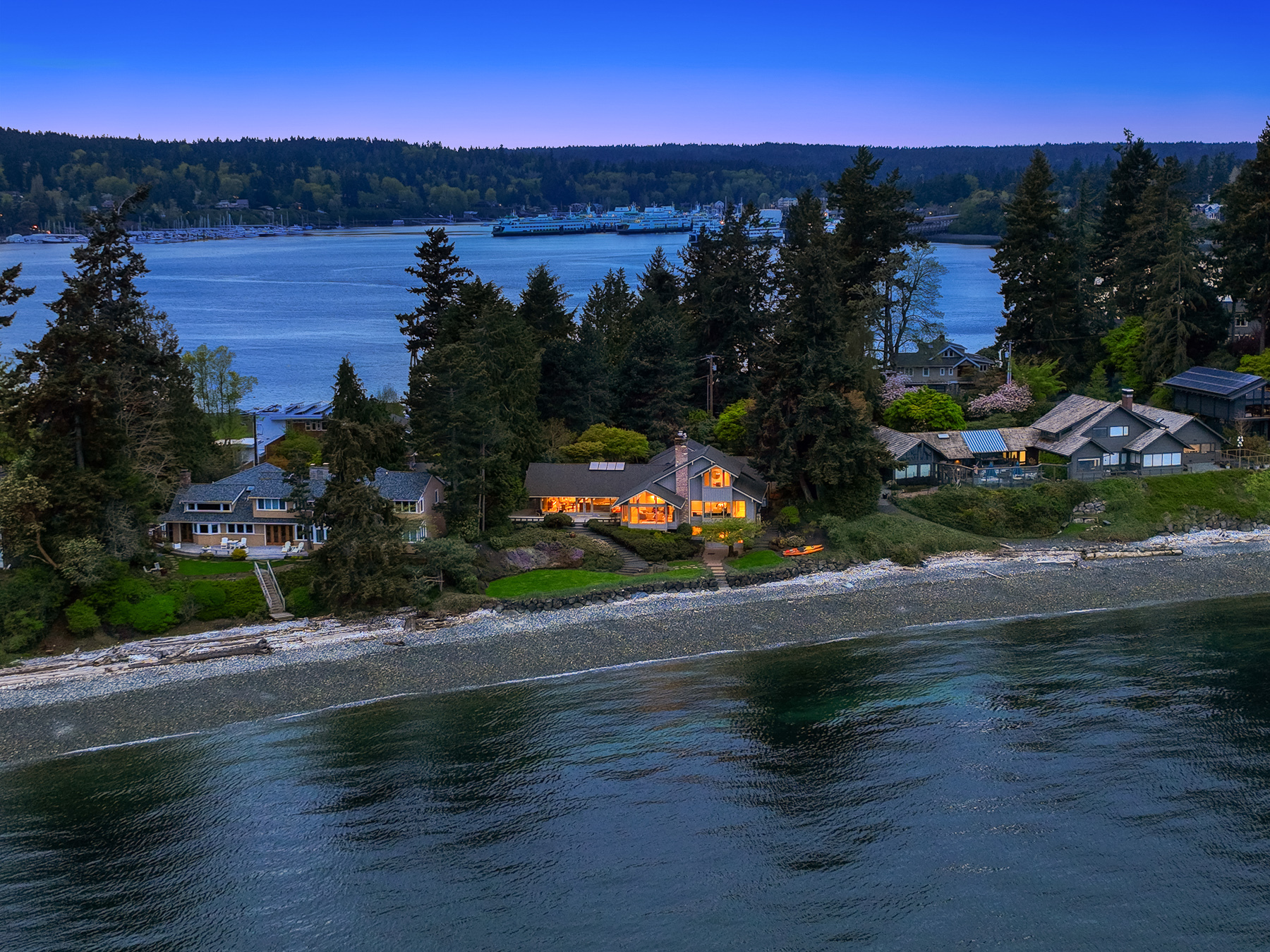This beautifully designed home celebrates the genius of NW icon Ralph Anderson and his ability to create a perfect marriage between architecture and land. This elegantly appointed low-bank waterfront home captures sweeping views of the Seattle skyline from Mt. Baker to Mt. Rainier in the coveted Wing Point community. The open floor plan offers 3 levels of luxury living that boast water views from almost every room. Enjoy a wrap-around west-facing bluestone courtyard with mature private gardens, as well as the pristine beach for a morning stroll or kayak paddle. Fairbanks Construction has just completed a major remodel and a new garage is being built for electric vehicles. No detail has been missed. This truly is island living at its best!