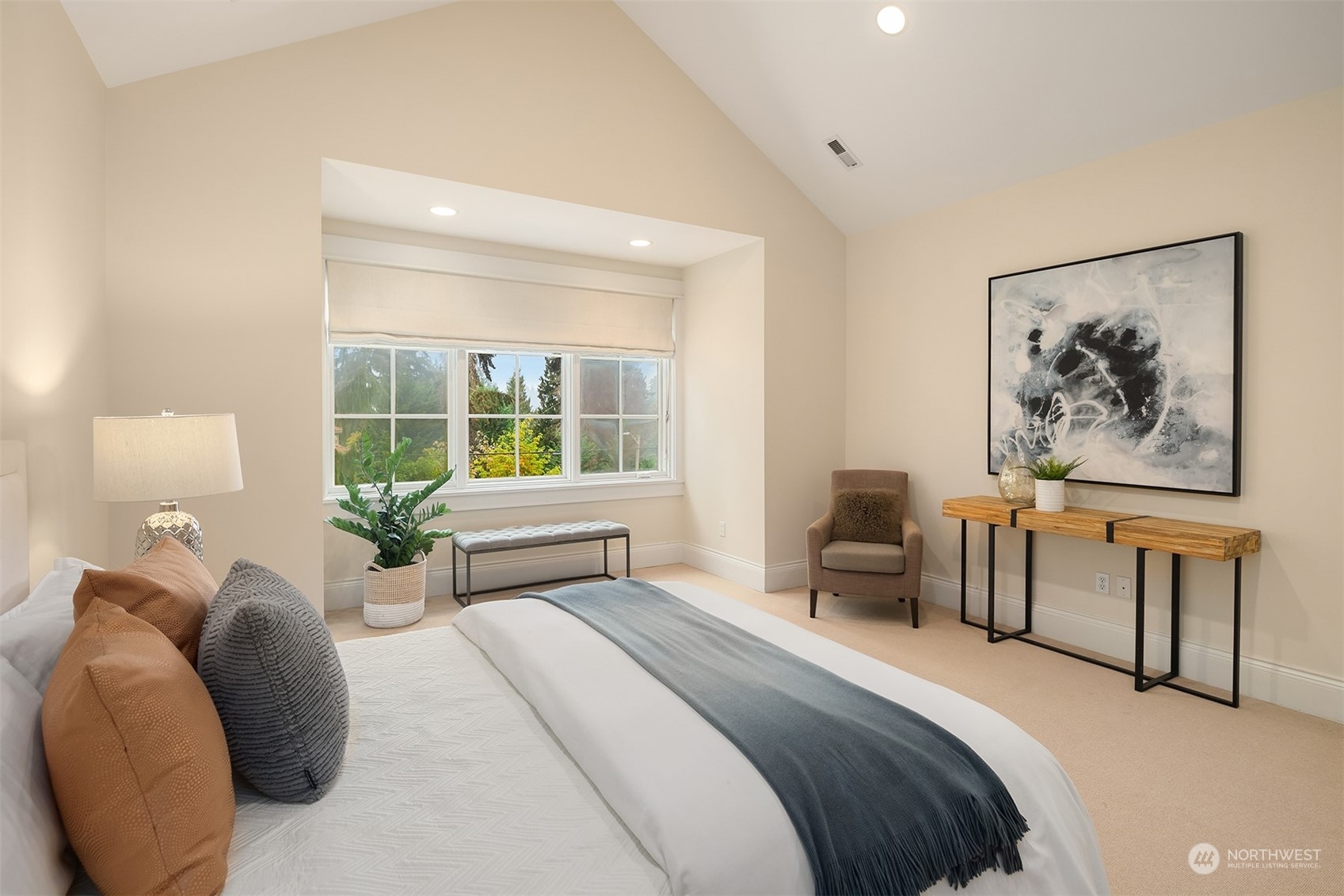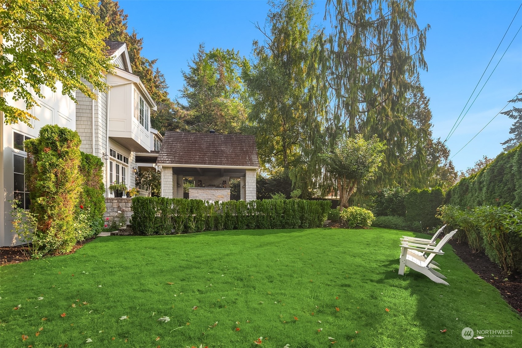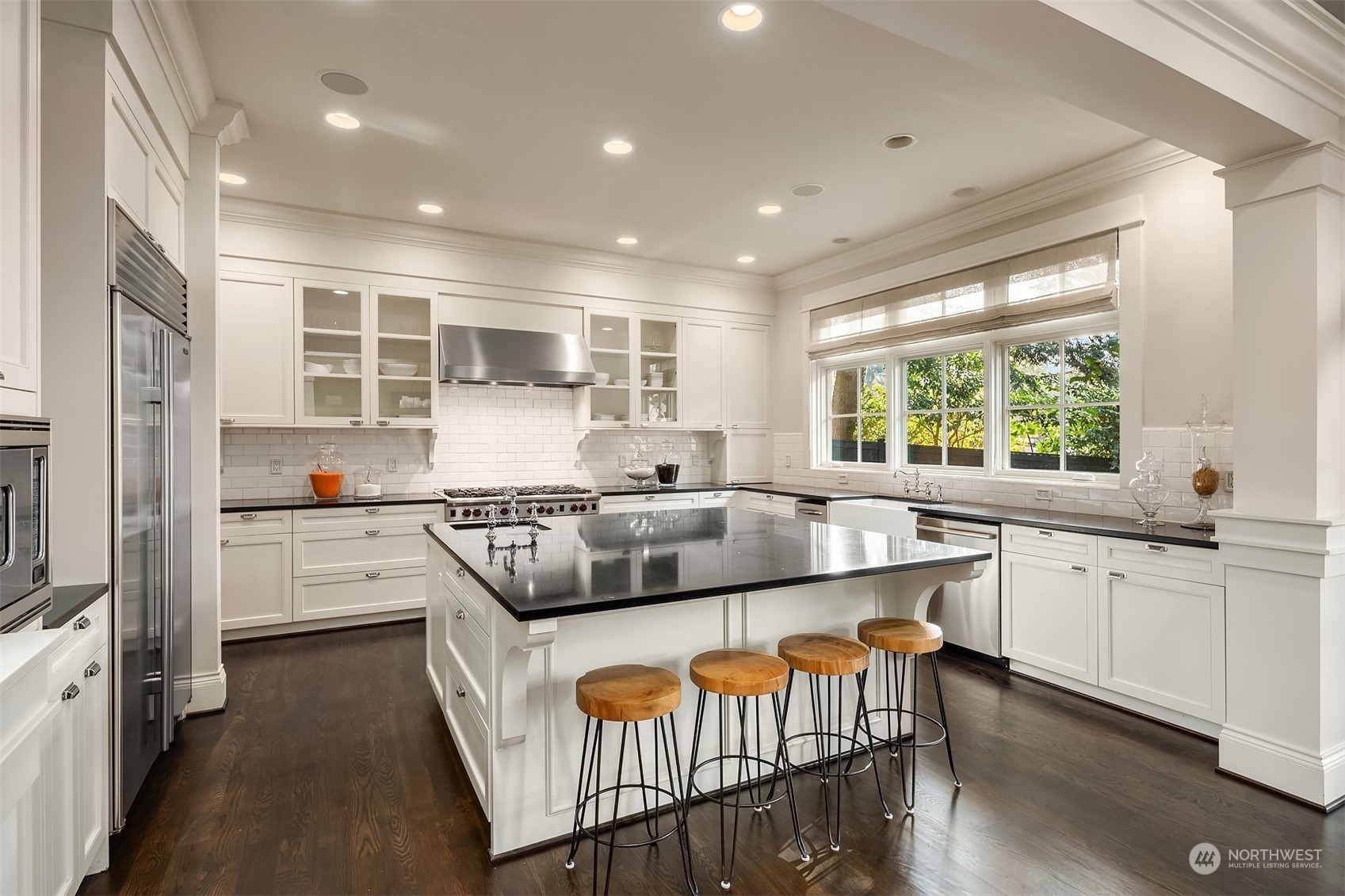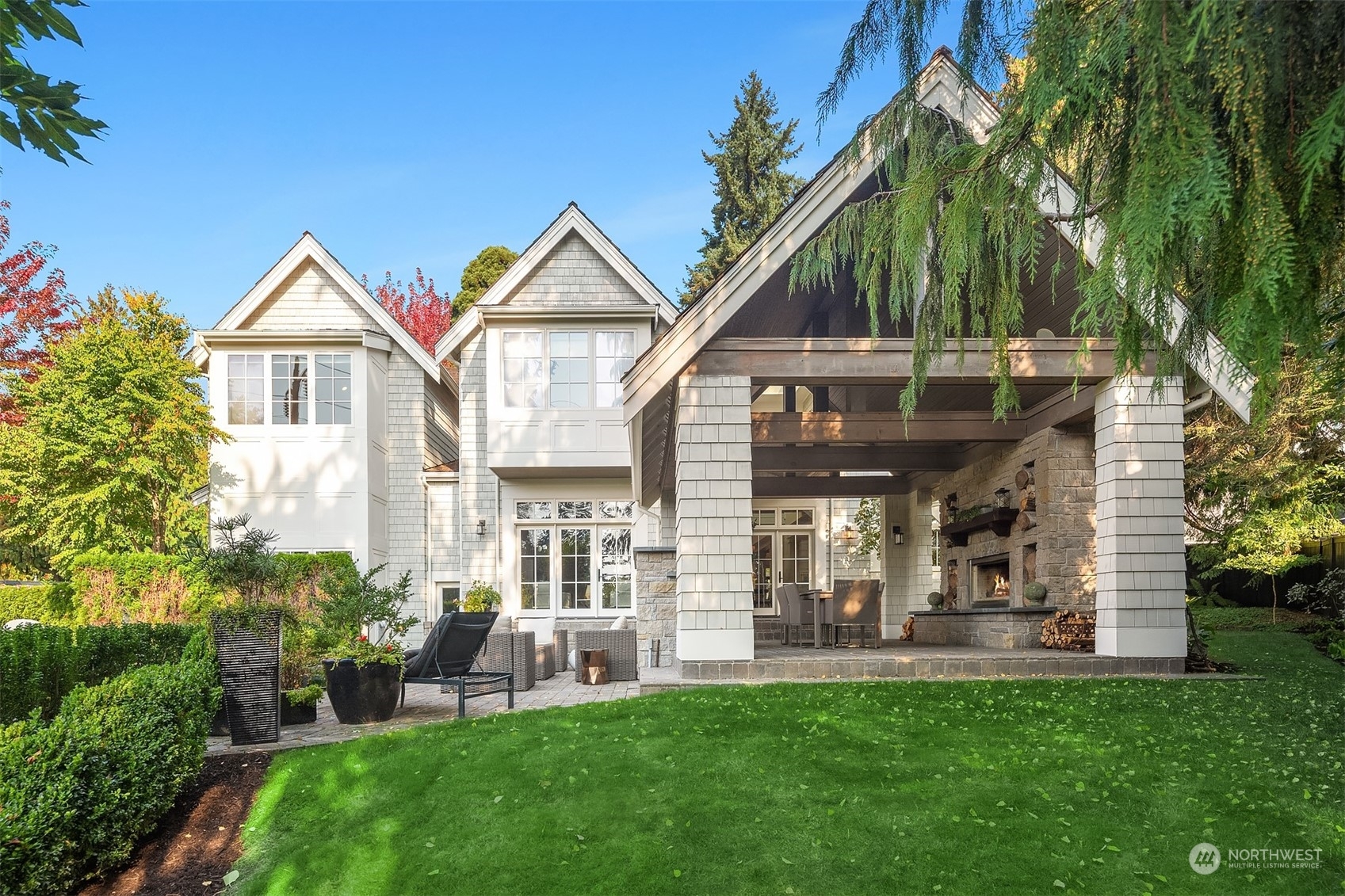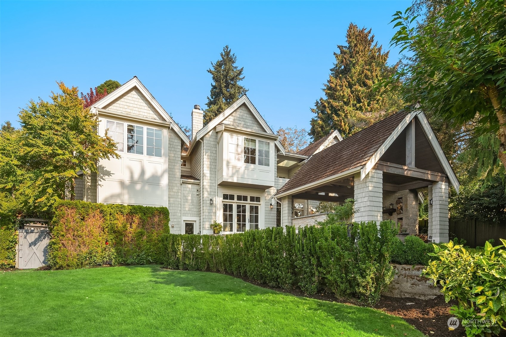 In the heart of West Bellevue, this 2006 custom-built blends NW architecture w/ clean lines, light-filled rooms & attention to detail. Highlighted by 5” white oak floors & 10’ to 20' ceilings, the design is timeless. Main floor features an open living/dining room, home office, chefs kitchen w/ black granite island & family room w/ built-in bookshelves. Private primary suite w/ 2 walk-in closets, spa bath w/ white carrrera slab & deck. Another en suite bdrm, jack-&-jill w/ full bath & upstairs rec room. Mature landscaping creates a private & estate-like feel w/ 373 sqft covered gazebo. Wine cellar, workout room, ample storage & sports room w/ direct access from garage. Walk to local beach parks, Bellevue Collection & Old Bellevue!