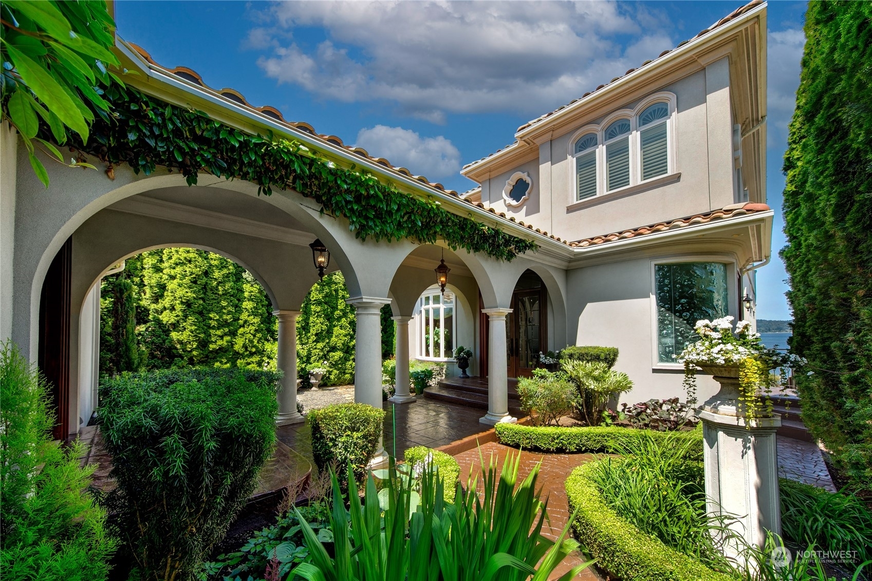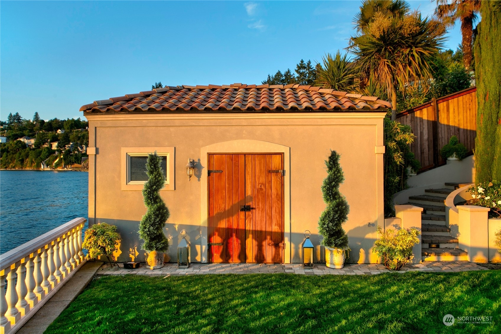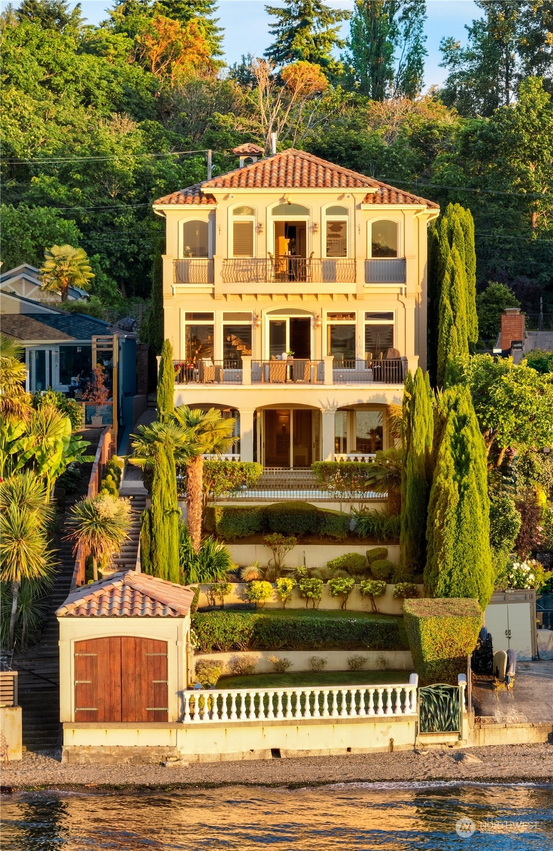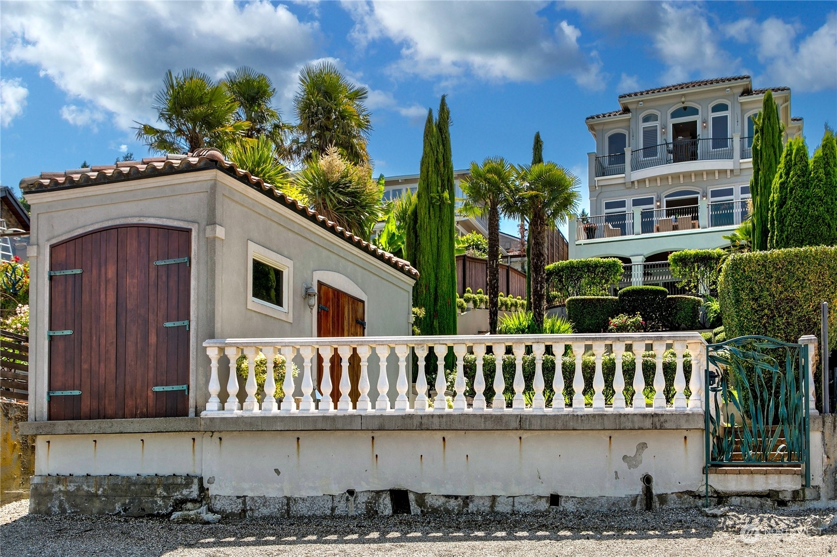 Il Palazzo Incantato/The Enchanted Palace. Worthy of Lake Como or the Italian Riviera, this lavish Caledonia Cove compound has it all. Rarely available low-bank waterfront with private beach and envy-inducing westerly vistas. Terraced formal gardens studded with cypresses, palms, and fragrant roses. A boathouse to stash your supersonic Belassi jet skis. A spacious guest lodge for fortunate long-term visitors. A statement automobile lodge fit to house your Berlinetta Lusso. An entertainment loggia with inground pool. A dazzling, monumentally proportioned palazzo oozing movie-set glamour, rich with exotic stone, replete with no-expense-spared comforts, including a residential elevator. Old World grandeur meets effortless West Coast elegance.