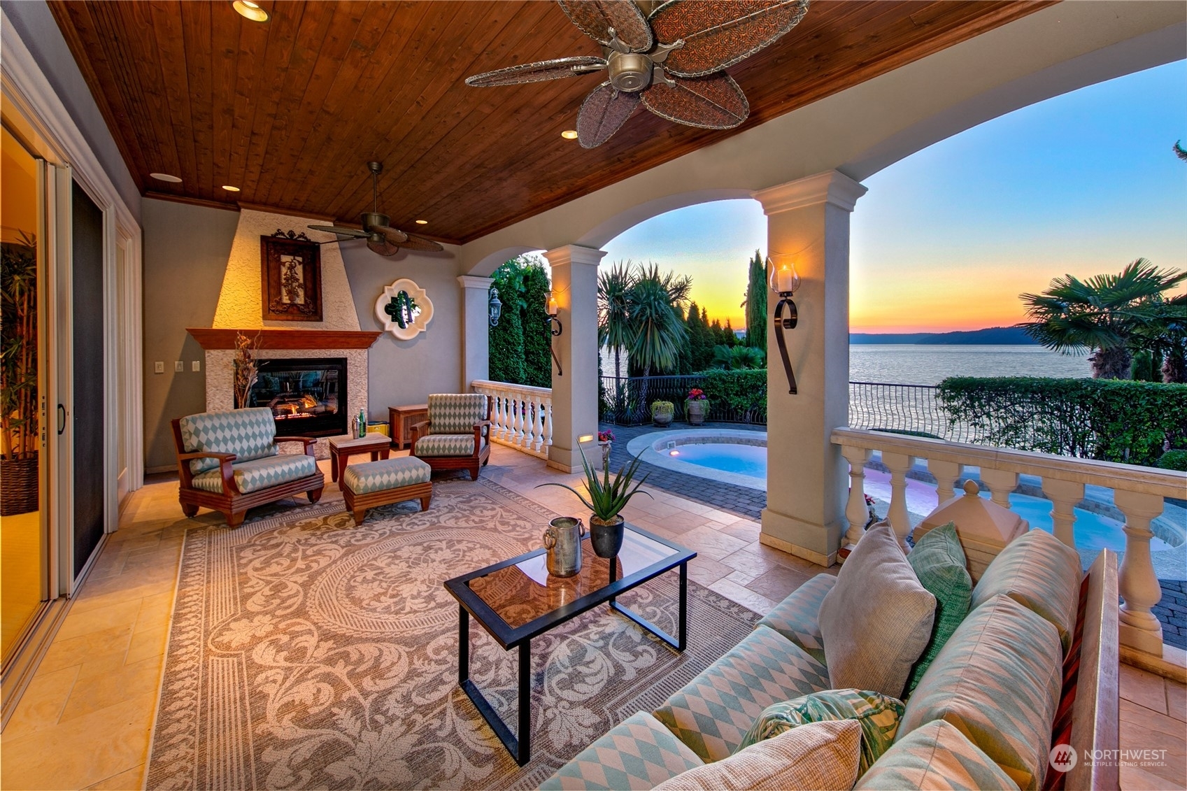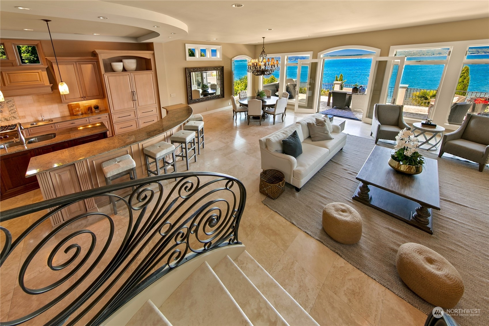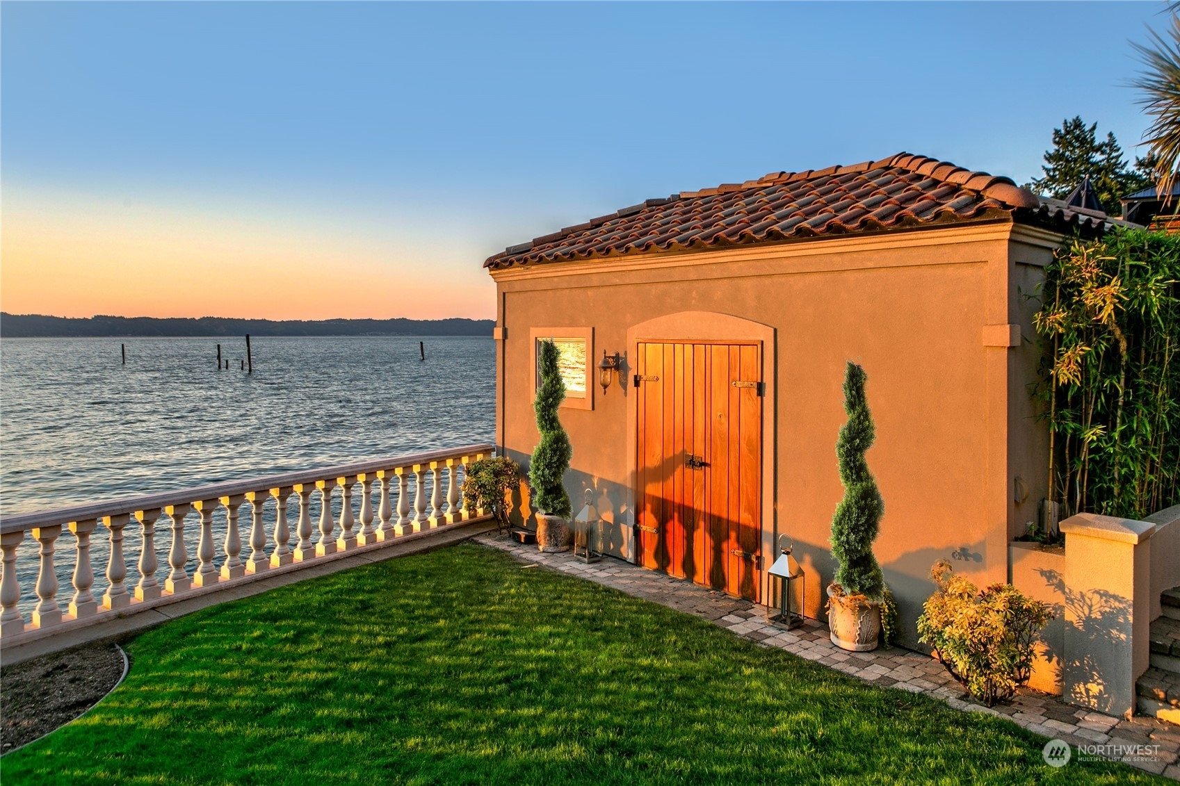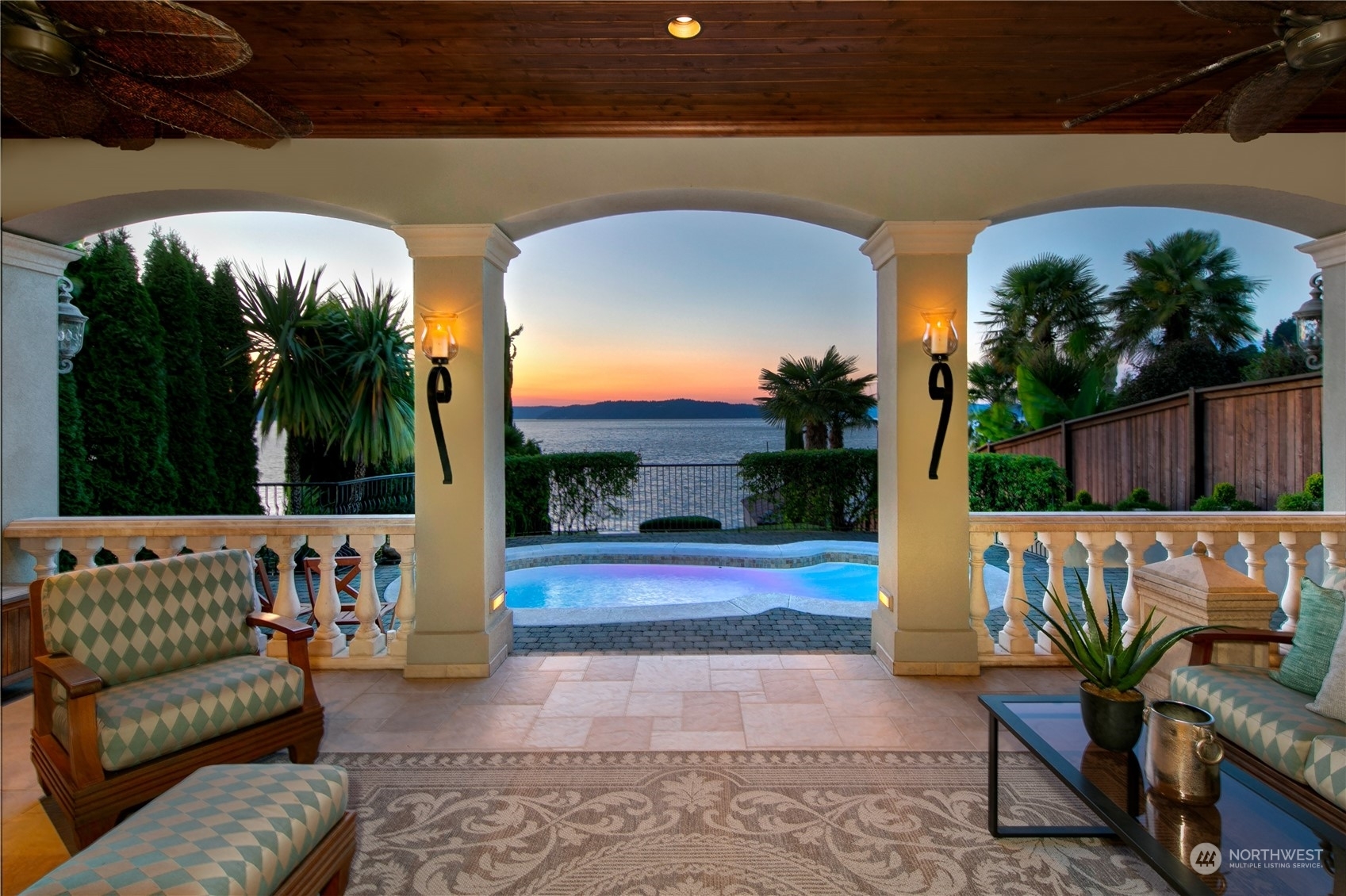 Il Palazzo Incantato/The Enchanted Palace. Worthy of Lake Como or the Italian Riviera, this lavish Caledonia Cove compound has it all. Rarely available low-bank waterfront with private beach and envy-inducing westerly vistas. Terraced formal gardens studded with cypresses, palms, and fragrant roses. A boathouse to stash your supersonic Belassi jet skis. A spacious guest lodge for fortunate long-term visitors. A statement automobile lodge fit to house your Berlinetta Lusso. An entertainment loggia with inground pool. A dazzling, monumentally proportioned palazzo oozing movie-set glamour, rich with exotic stone, replete with no-expense-spared comforts, including a residential elevator. Old World grandeur meets effortless West Coast elegance.