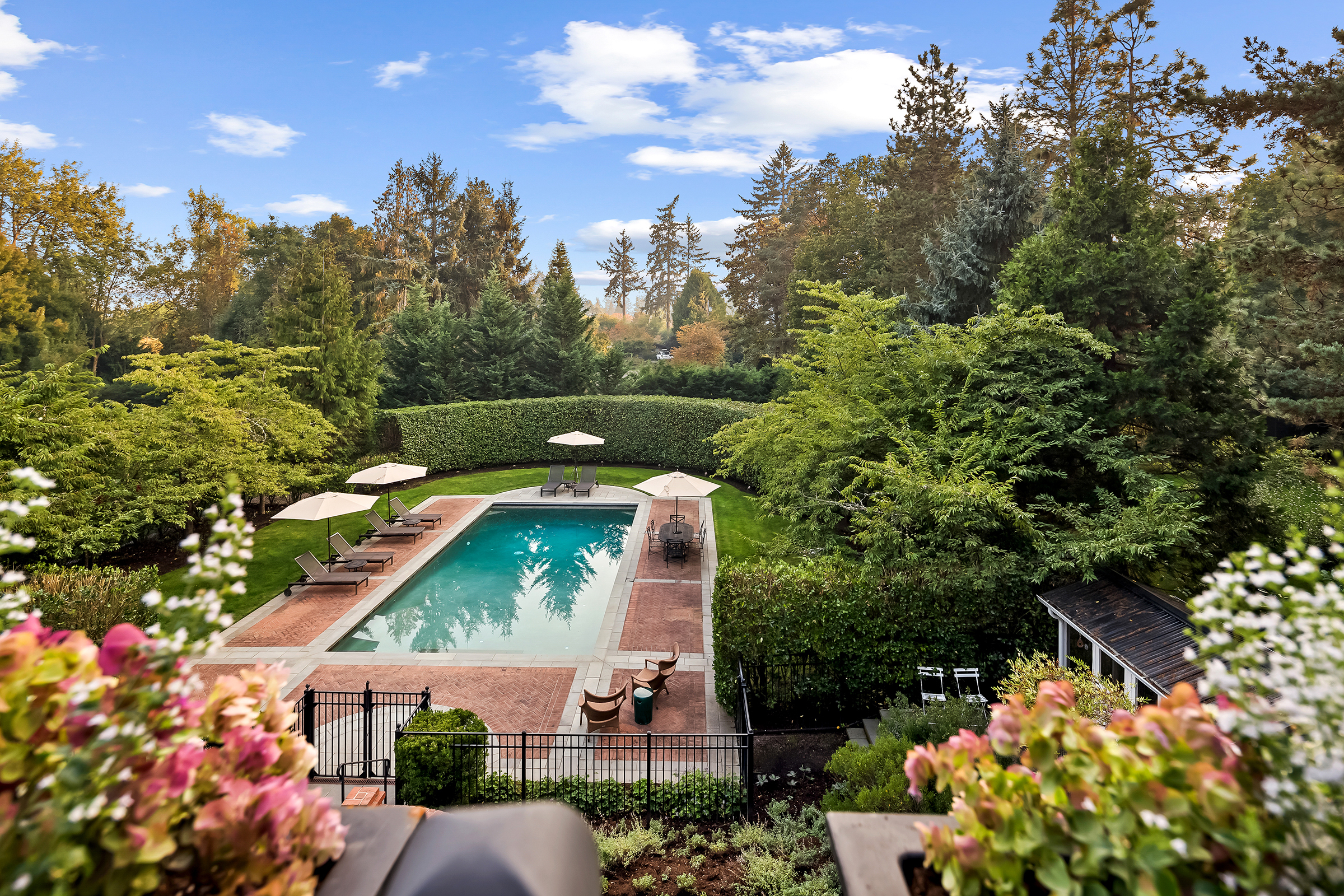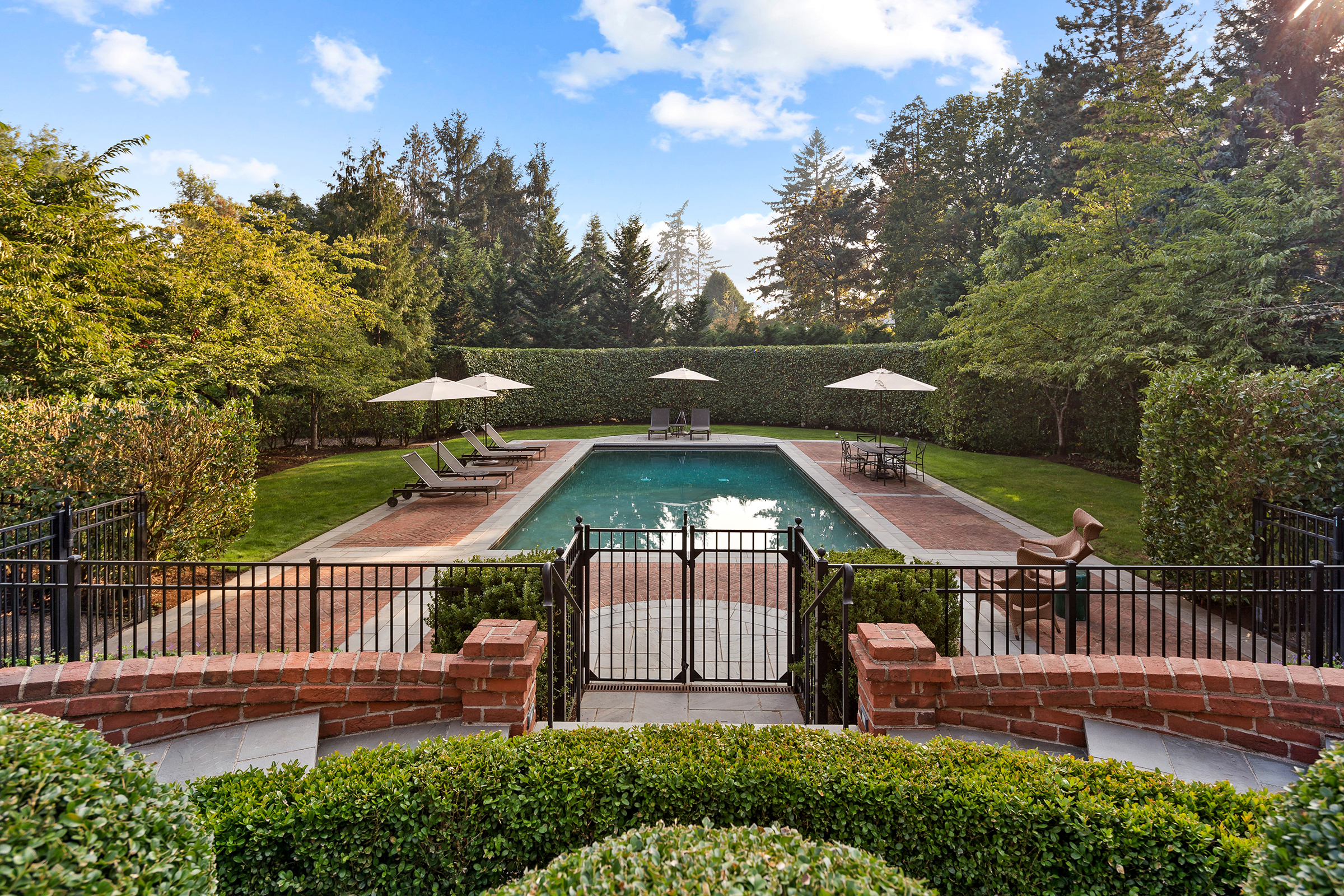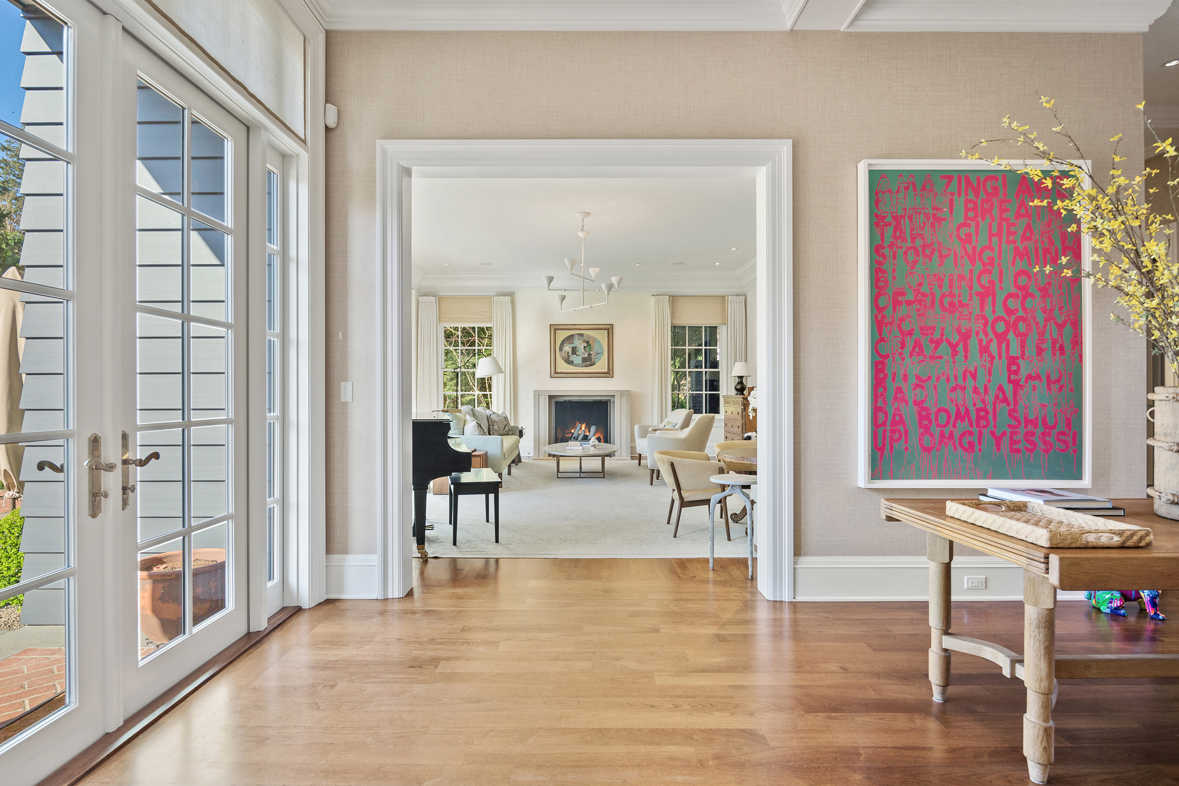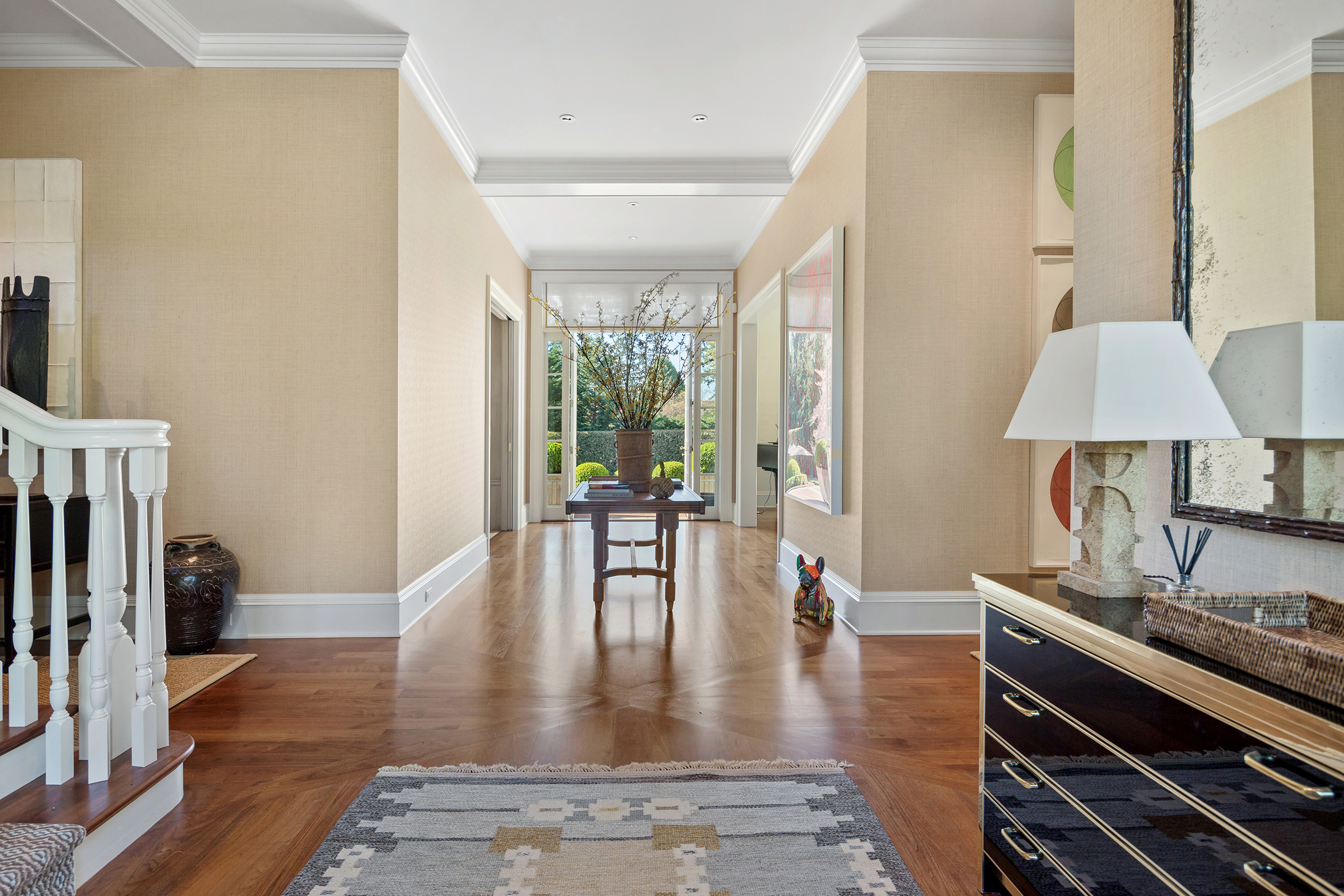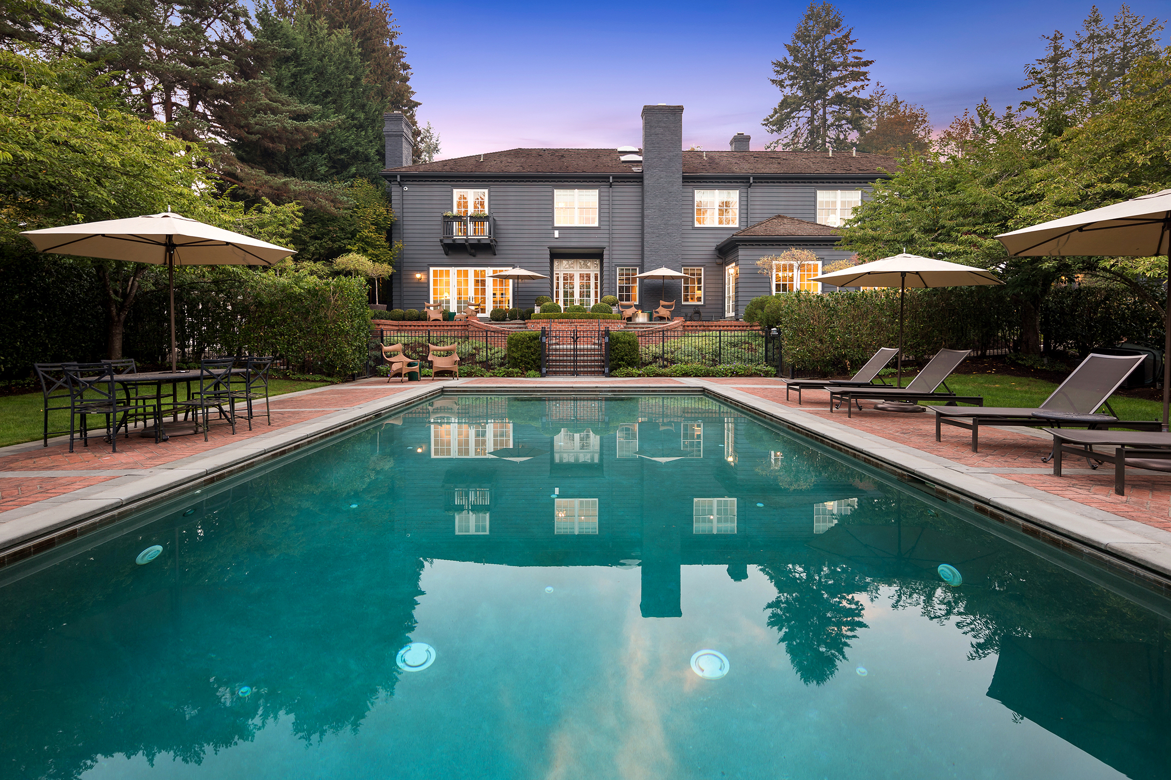 This stunning and luxurious Dunthorpe estate is an architectural and design work of art that exudes elegance, grace, and sophistication in every detail. Step through the front door and into the grand foyer, and you are greeted by soaring ceilings, a breathtaking view of the grand swimming pool, and meticulously landscaped gardens of the private 1.1-acre lot. Beverly Hills designer Stephan Jones oversaw the home's extensive renovation. Every room showcases a collection of custom draperies and wallpapers, stunning designer light fixtures, and expertly curated colors and design materials that give this retreat a sense of cohesive serenity. The main floor features a grand living room, gas fireplace, and French doors opening to the patio overlooking the manicured grounds. Enjoy a quiet moment by the fireplace in the library or settle in for work in the spacious office with built-ins galore. Down the hall, the chef's kitchen with gourmet appliances and a new Sub-Zero refrigerator/freezer opens to the great room, perfect for family lounging, and a breakfast nook with French doors exiting to the backyard. The formal dining room offers abundant room to entertain. Head upstairs to the five spacious ensuite bedrooms and additional guest quarters. The primary suite is a haven of relaxation with breathtaking property views, a cozy fireplace, and custom wallpaper and draperies. Primary bathroom highlights include the soaking tub, heated floors, and extensive walk-in closet with private laundry/valet. Down the hall are four additional ensuite bedrooms, an oversized family laundry room, a large playroom, plus a guest/nanny suite with sleeping quarters and kitchenette, ensuring comfort and privacy. The home's lowest level is equally impressive, with a workout space, temperature-controlled wine room, multiple storage rooms, and fully updated top-of-the-line HVAC systems. Outdoor features include an expansive turf lawn, raised beds, a chicken coop, a dog run, and more.