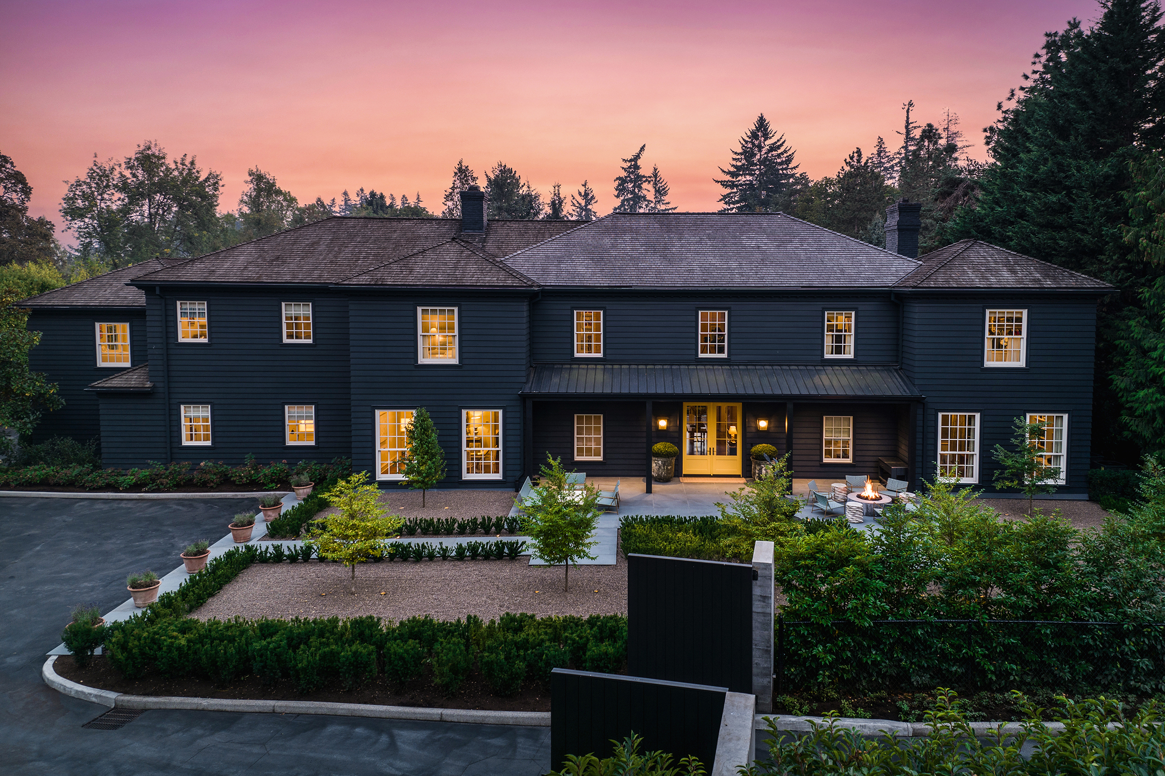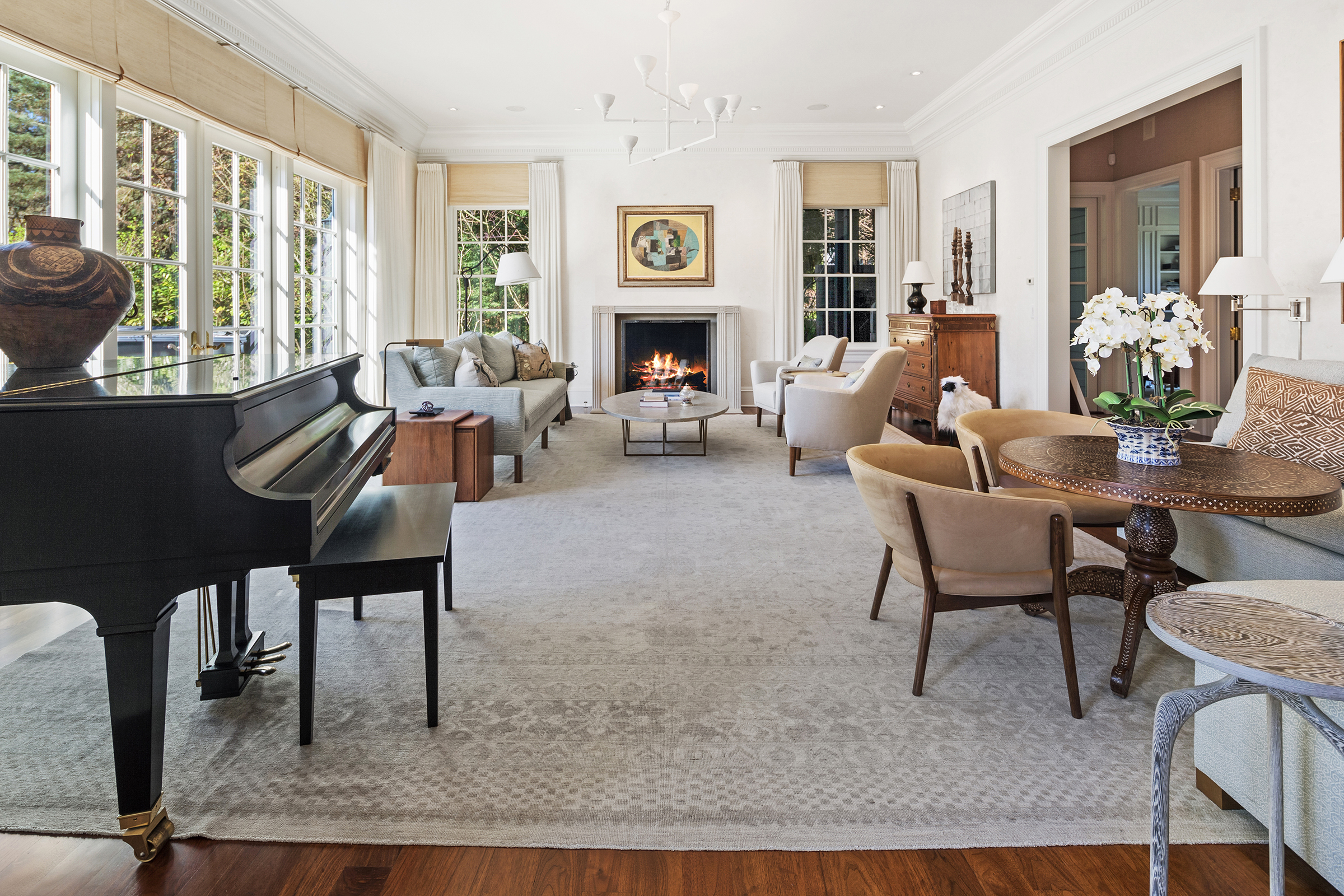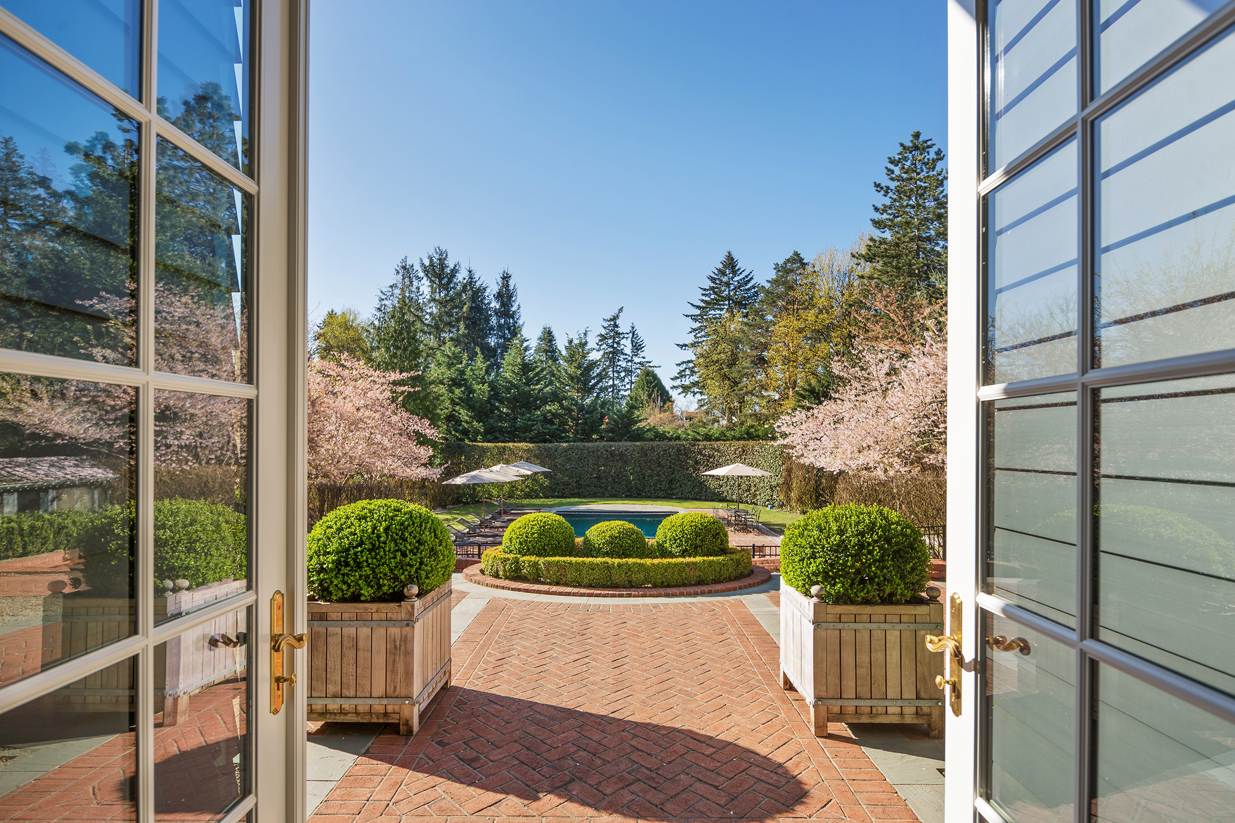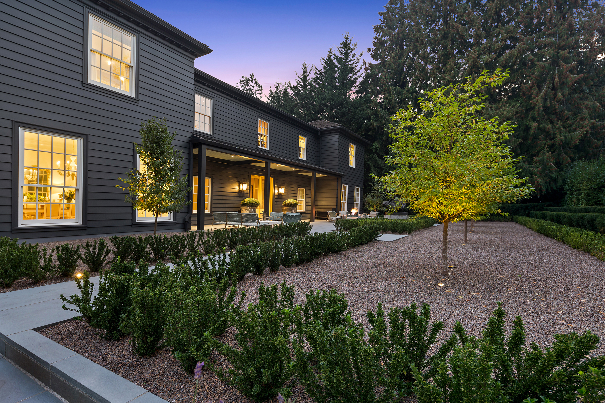 This stunning and luxurious Dunthorpe estate is an architectural and design work of art that exudes elegance, grace, and sophistication in every detail. Step through the front door and into the grand foyer, and you are greeted by soaring ceilings, a breathtaking view of the grand swimming pool, and meticulously landscaped gardens of the private 1.1-acre lot. Beverly Hills designer Stephan Jones oversaw the home's extensive renovation. Every room showcases a collection of custom draperies and wallpapers, stunning designer light fixtures, and expertly curated colors and design materials that give this retreat a sense of cohesive serenity. The main floor features a grand living room, gas fireplace, and French doors opening to the patio overlooking the manicured grounds. Enjoy a quiet moment by the fireplace in the library or settle in for work in the spacious office with built-ins galore. Down the hall, the chef's kitchen with gourmet appliances and a new Sub-Zero refrigerator/freezer opens to the great room, perfect for family lounging, and a breakfast nook with French doors exiting to the backyard. The formal dining room offers abundant room to entertain. Head upstairs to the five spacious ensuite bedrooms and additional guest quarters. The primary suite is a haven of relaxation with breathtaking property views, a cozy fireplace, and custom wallpaper and draperies. Primary bathroom highlights include the soaking tub, heated floors, and extensive walk-in closet with private laundry/valet. Down the hall are four additional ensuite bedrooms, an oversized family laundry room, a large playroom, plus a guest/nanny suite with sleeping quarters and kitchenette, ensuring comfort and privacy. The home's lowest level is equally impressive, with a workout space, temperature-controlled wine room, multiple storage rooms, and fully updated top-of-the-line HVAC systems. Outdoor features include an expansive turf lawn, raised beds, a chicken coop, a dog run, and more.