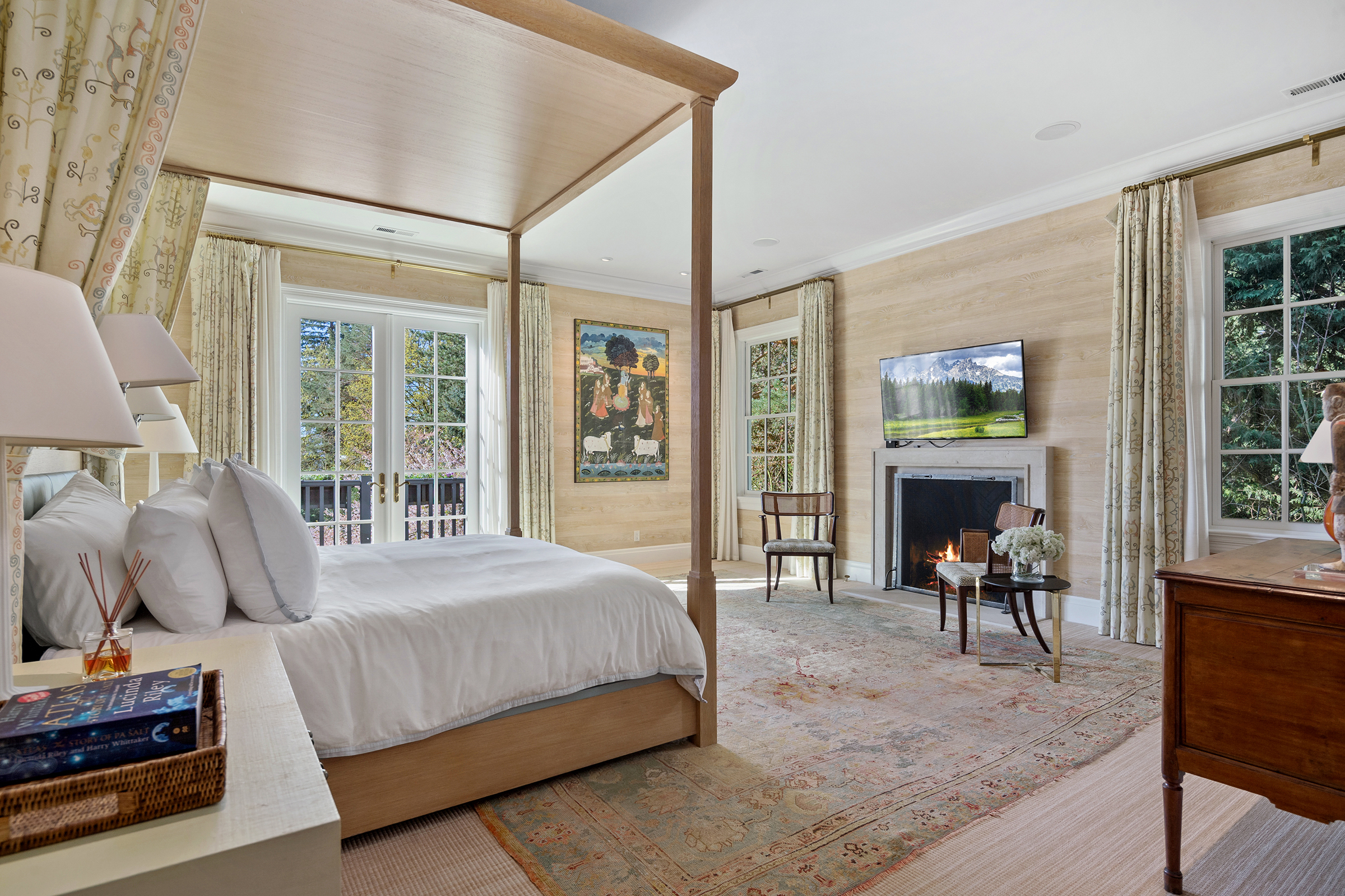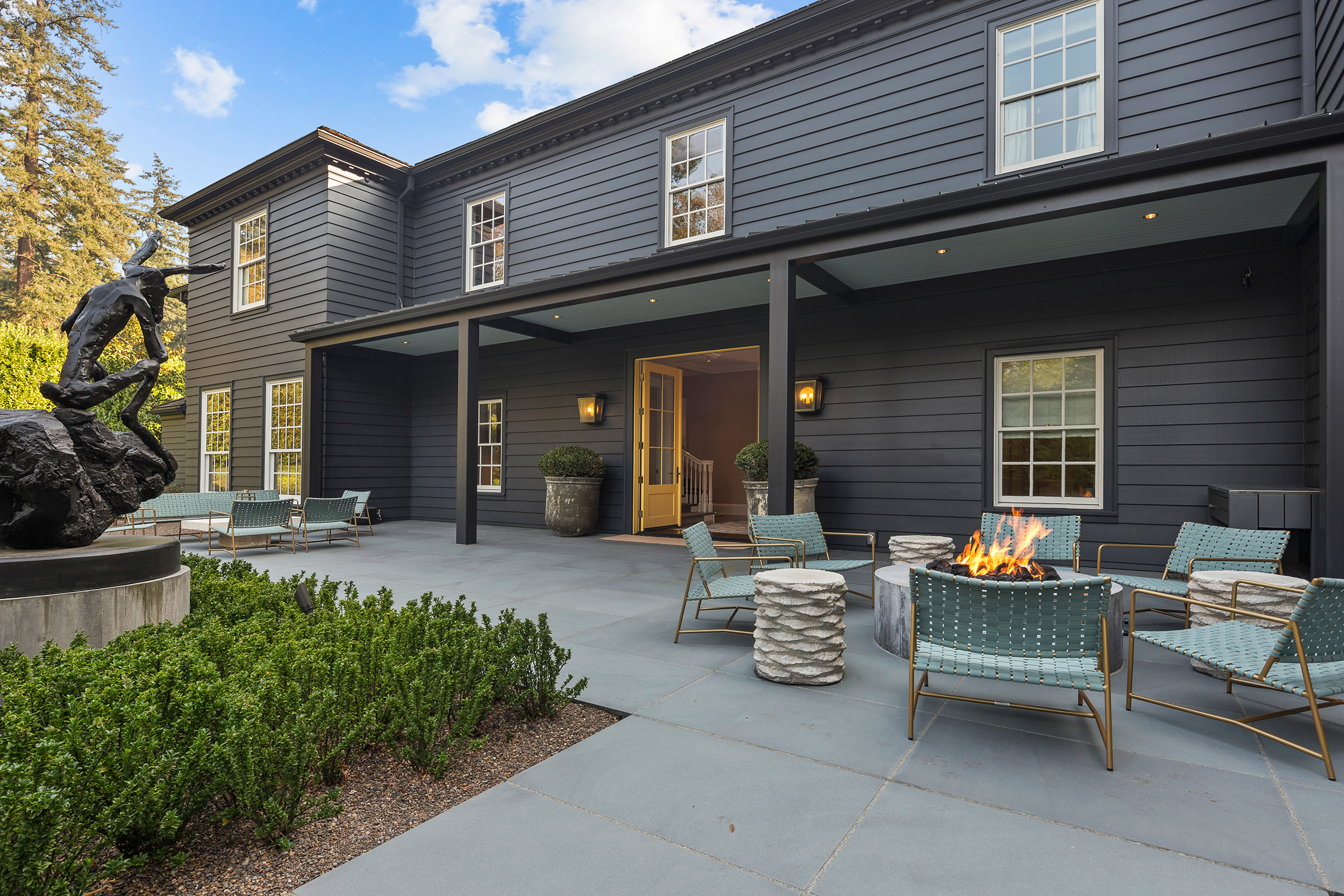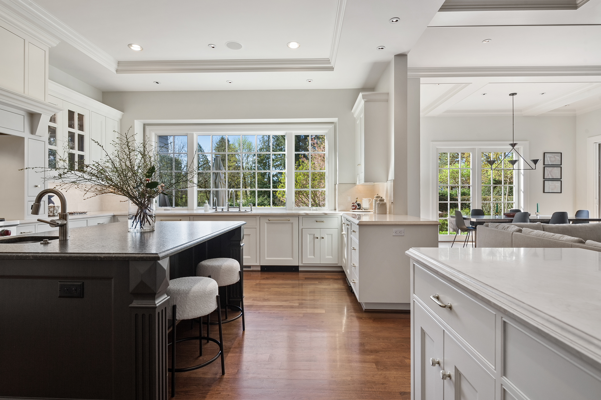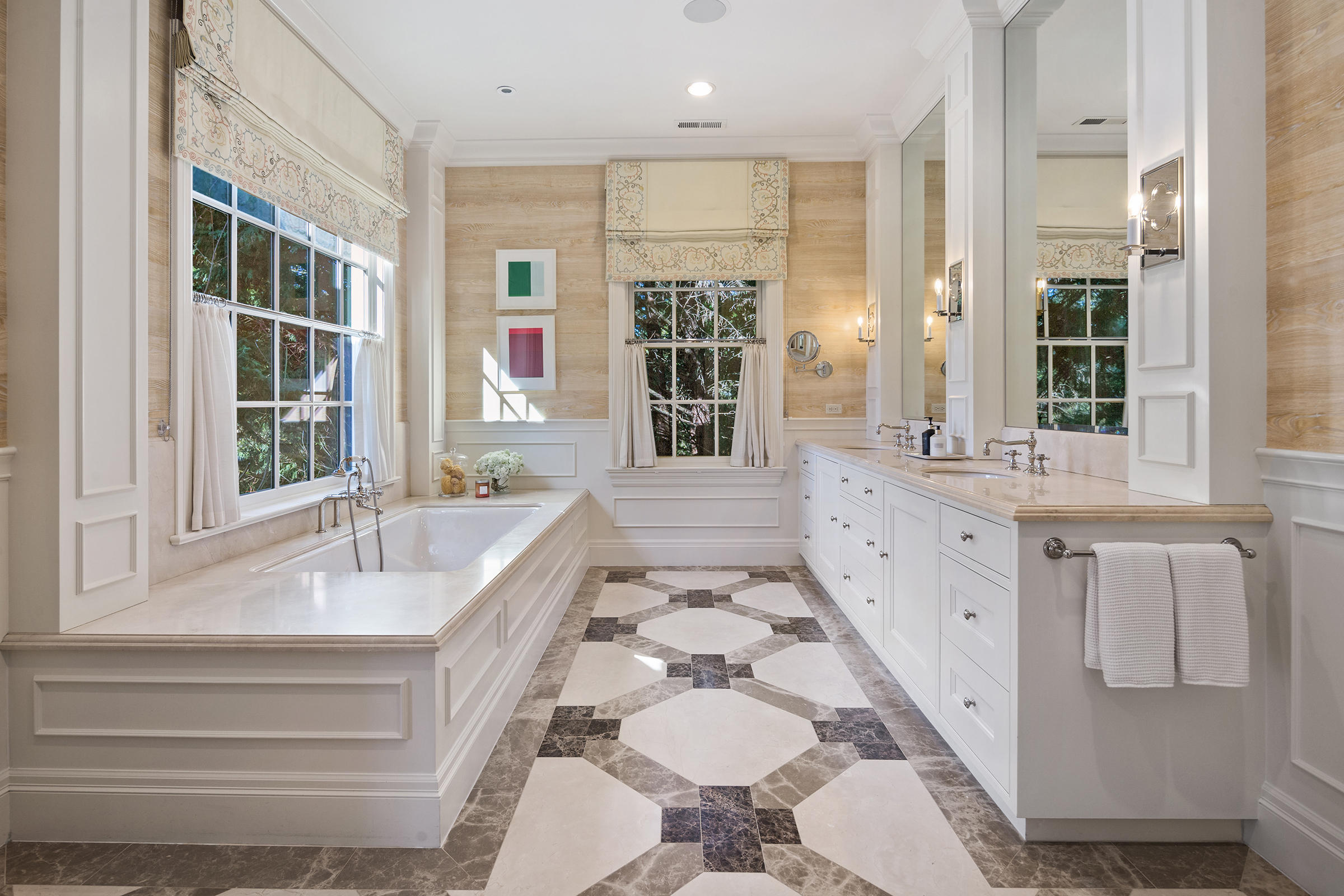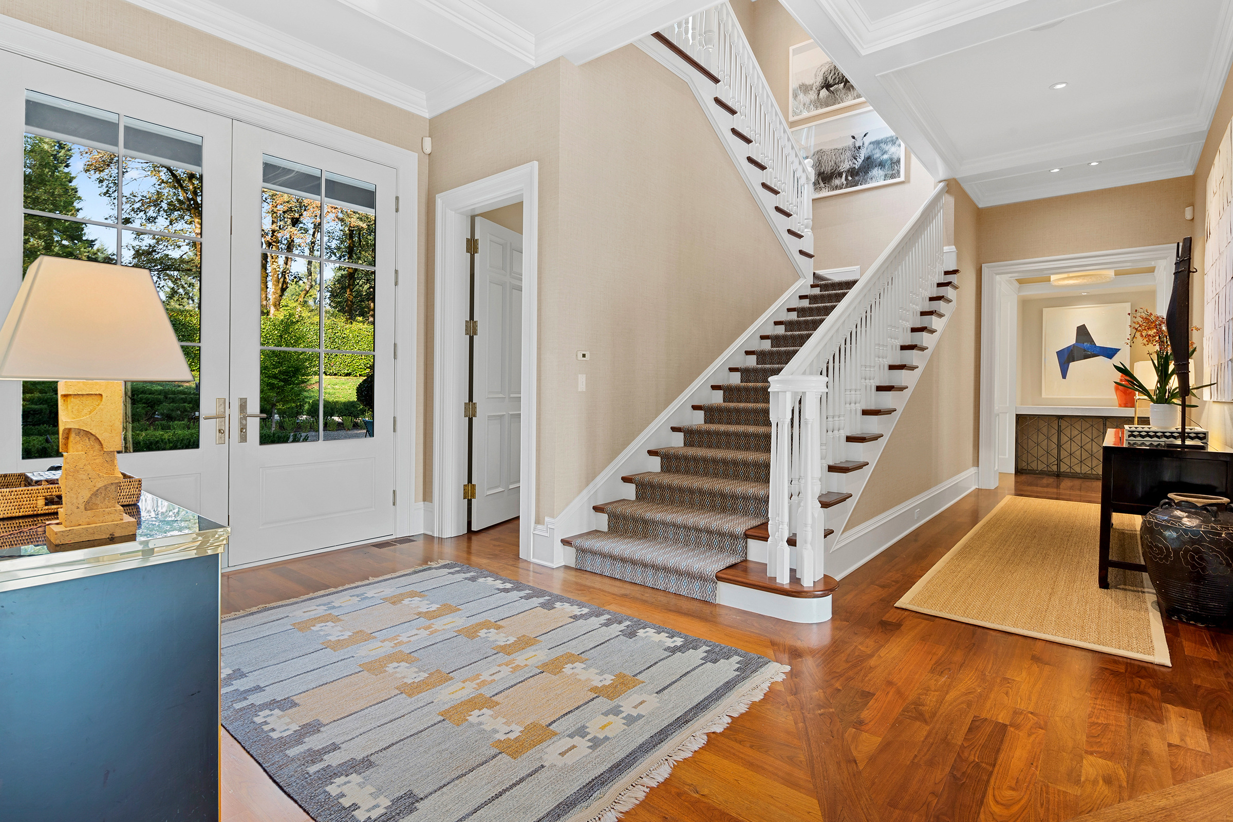 This stunning and luxurious Dunthorpe estate is an architectural and design work of art that exudes elegance, grace, and sophistication in every detail. Step through the front door and into the grand foyer, and you are greeted by soaring ceilings, a breathtaking view of the grand swimming pool, and meticulously landscaped gardens of the private 1.1-acre lot. Beverly Hills designer Stephan Jones oversaw the home's extensive renovation. Every room showcases a collection of custom draperies and wallpapers, stunning designer light fixtures, and expertly curated colors and design materials that give this retreat a sense of cohesive serenity. The main floor features a grand living room, gas fireplace, and French doors opening to the patio overlooking the manicured grounds. Enjoy a quiet moment by the fireplace in the library or settle in for work in the spacious office with built-ins galore. Down the hall, the chef's kitchen with gourmet appliances and a new Sub-Zero refrigerator/freezer opens to the great room, perfect for family lounging, and a breakfast nook with French doors exiting to the backyard. The formal dining room offers abundant room to entertain. Head upstairs to the five spacious ensuite bedrooms and additional guest quarters. The primary suite is a haven of relaxation with breathtaking property views, a cozy fireplace, and custom wallpaper and draperies. Primary bathroom highlights include the soaking tub, heated floors, and extensive walk-in closet with private laundry/valet. Down the hall are four additional ensuite bedrooms, an oversized family laundry room, a large playroom, plus a guest/nanny suite with sleeping quarters and kitchenette, ensuring comfort and privacy. The home's lowest level is equally impressive, with a workout space, temperature-controlled wine room, multiple storage rooms, and fully updated top-of-the-line HVAC systems. Outdoor features include an expansive turf lawn, raised beds, a chicken coop, a dog run, and more.