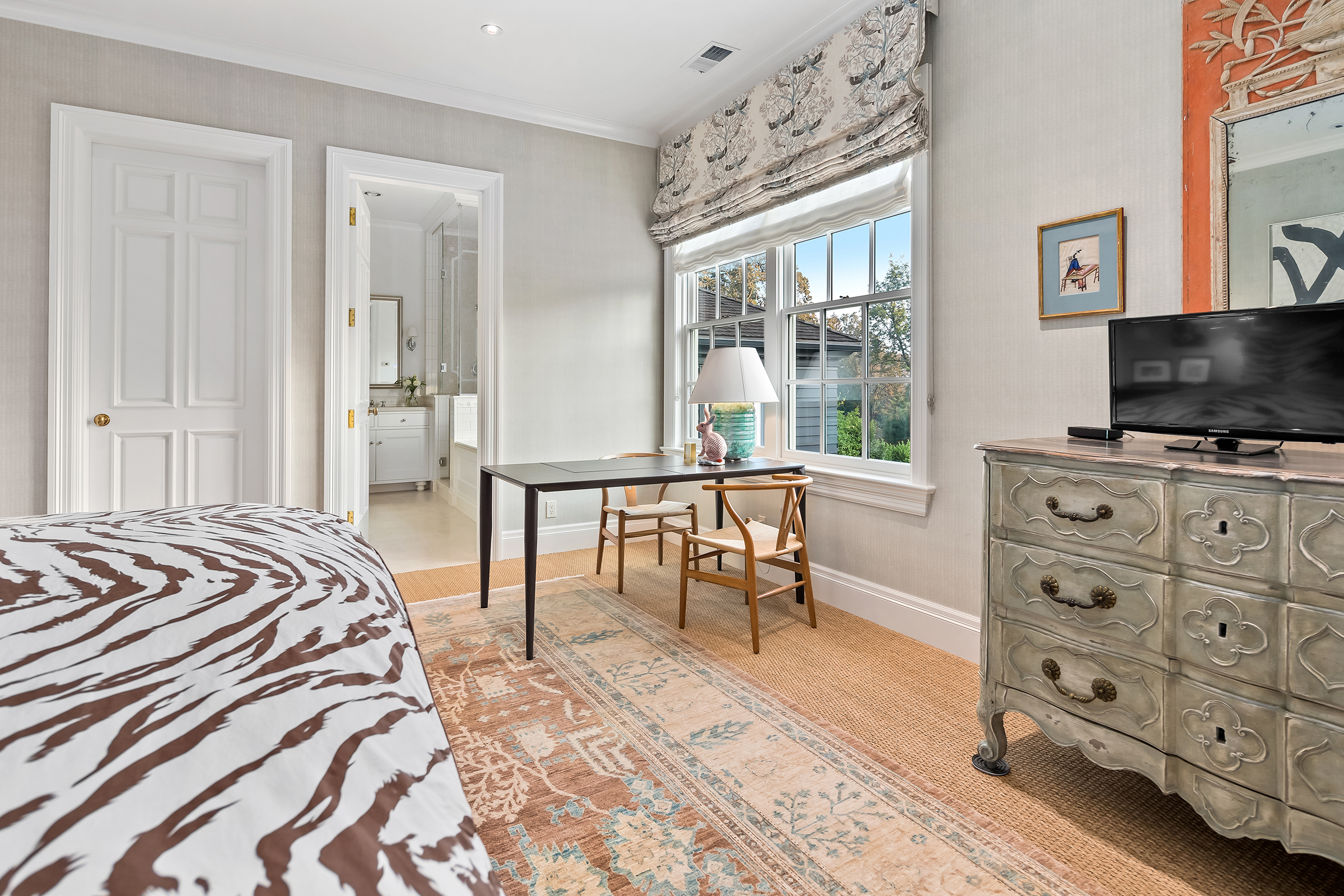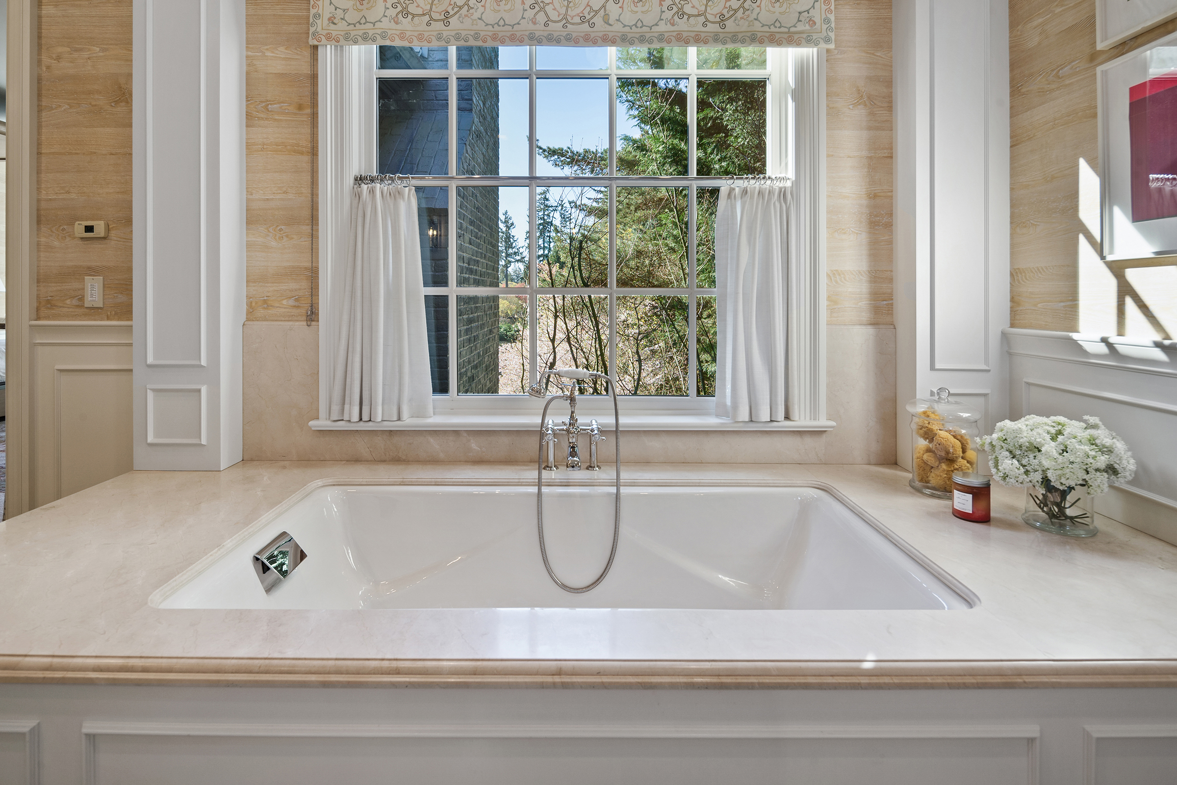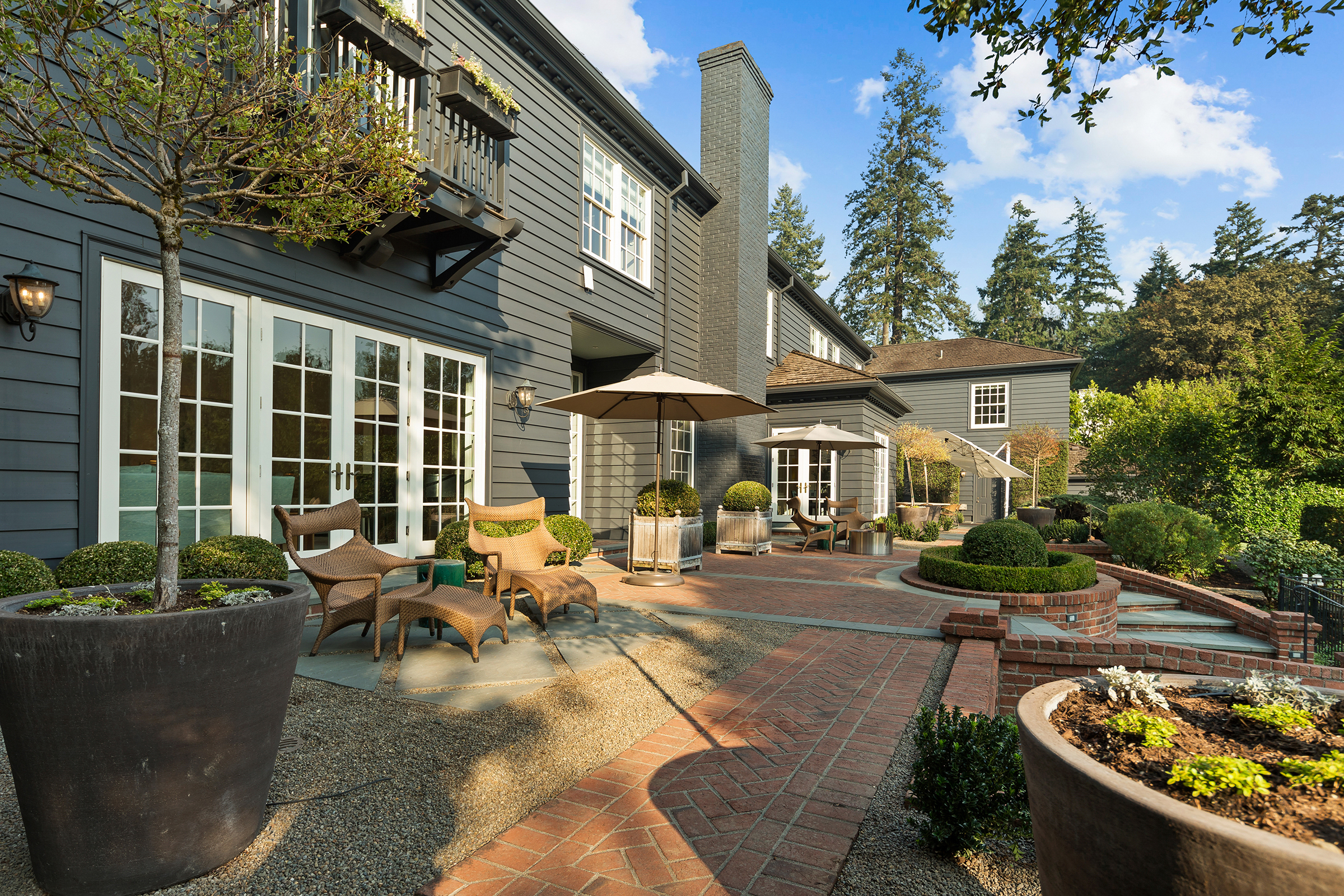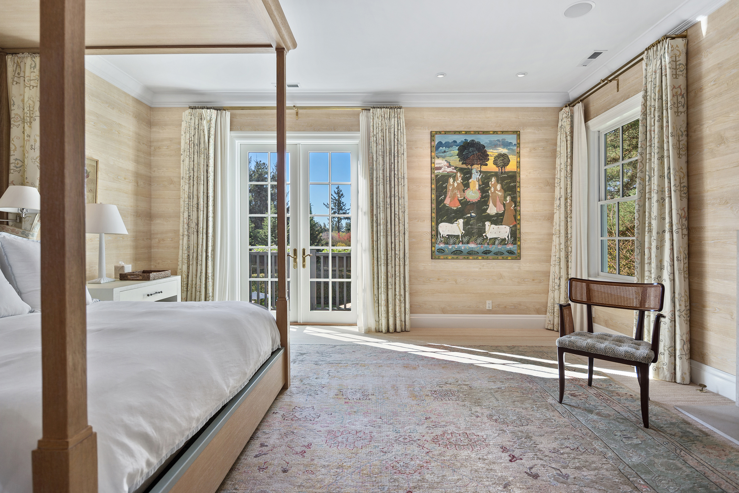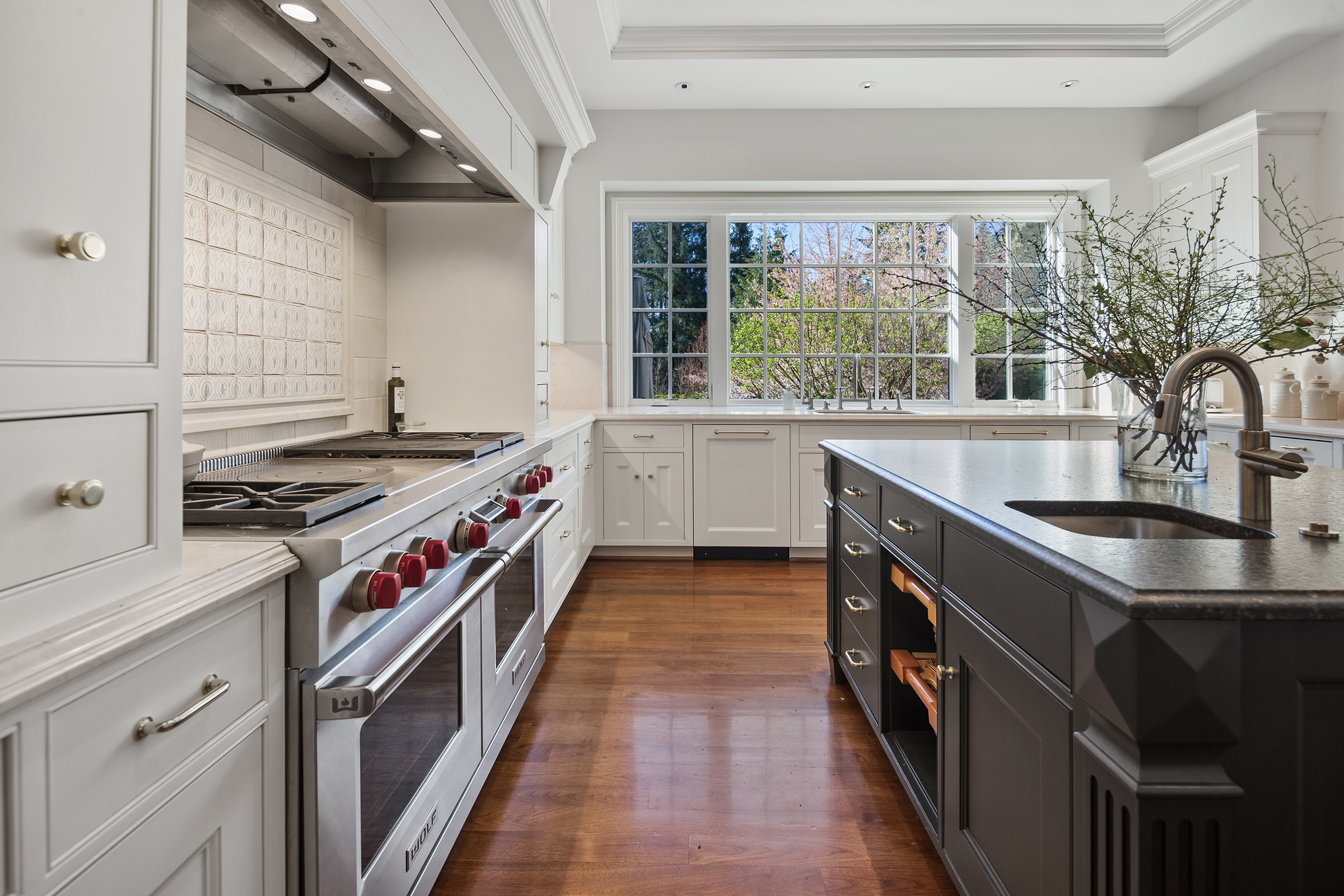 This stunning and luxurious Dunthorpe estate is an architectural and design work of art that exudes elegance, grace, and sophistication in every detail. Step through the front door and into the grand foyer, and you are greeted by soaring ceilings, a breathtaking view of the grand swimming pool, and meticulously landscaped gardens of the private 1.1-acre lot. Beverly Hills designer Stephan Jones oversaw the home's extensive renovation. Every room showcases a collection of custom draperies and wallpapers, stunning designer light fixtures, and expertly curated colors and design materials that give this retreat a sense of cohesive serenity. The main floor features a grand living room, gas fireplace, and French doors opening to the patio overlooking the manicured grounds. Enjoy a quiet moment by the fireplace in the library or settle in for work in the spacious office with built-ins galore. Down the hall, the chef's kitchen with gourmet appliances and a new Sub-Zero refrigerator/freezer opens to the great room, perfect for family lounging, and a breakfast nook with French doors exiting to the backyard. The formal dining room offers abundant room to entertain. Head upstairs to the five spacious ensuite bedrooms and additional guest quarters. The primary suite is a haven of relaxation with breathtaking property views, a cozy fireplace, and custom wallpaper and draperies. Primary bathroom highlights include the soaking tub, heated floors, and extensive walk-in closet with private laundry/valet. Down the hall are four additional ensuite bedrooms, an oversized family laundry room, a large playroom, plus a guest/nanny suite with sleeping quarters and kitchenette, ensuring comfort and privacy. The home's lowest level is equally impressive, with a workout space, temperature-controlled wine room, multiple storage rooms, and fully updated top-of-the-line HVAC systems. Outdoor features include an expansive turf lawn, raised beds, a chicken coop, a dog run, and more.