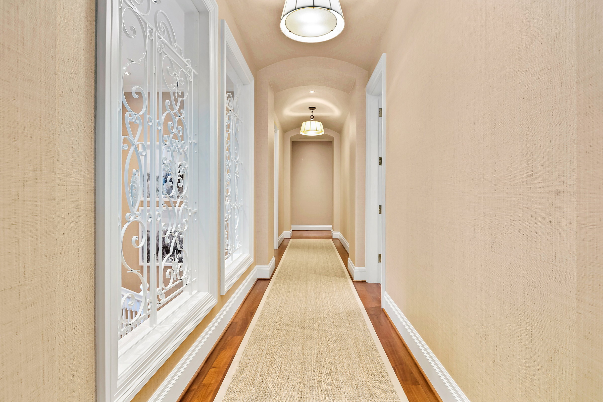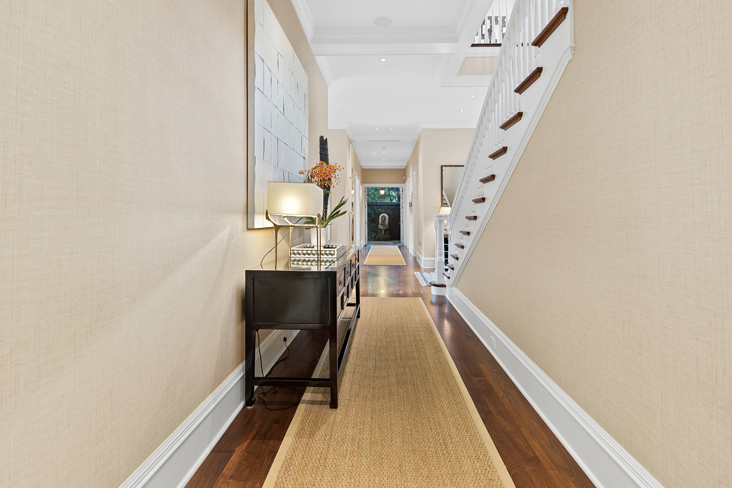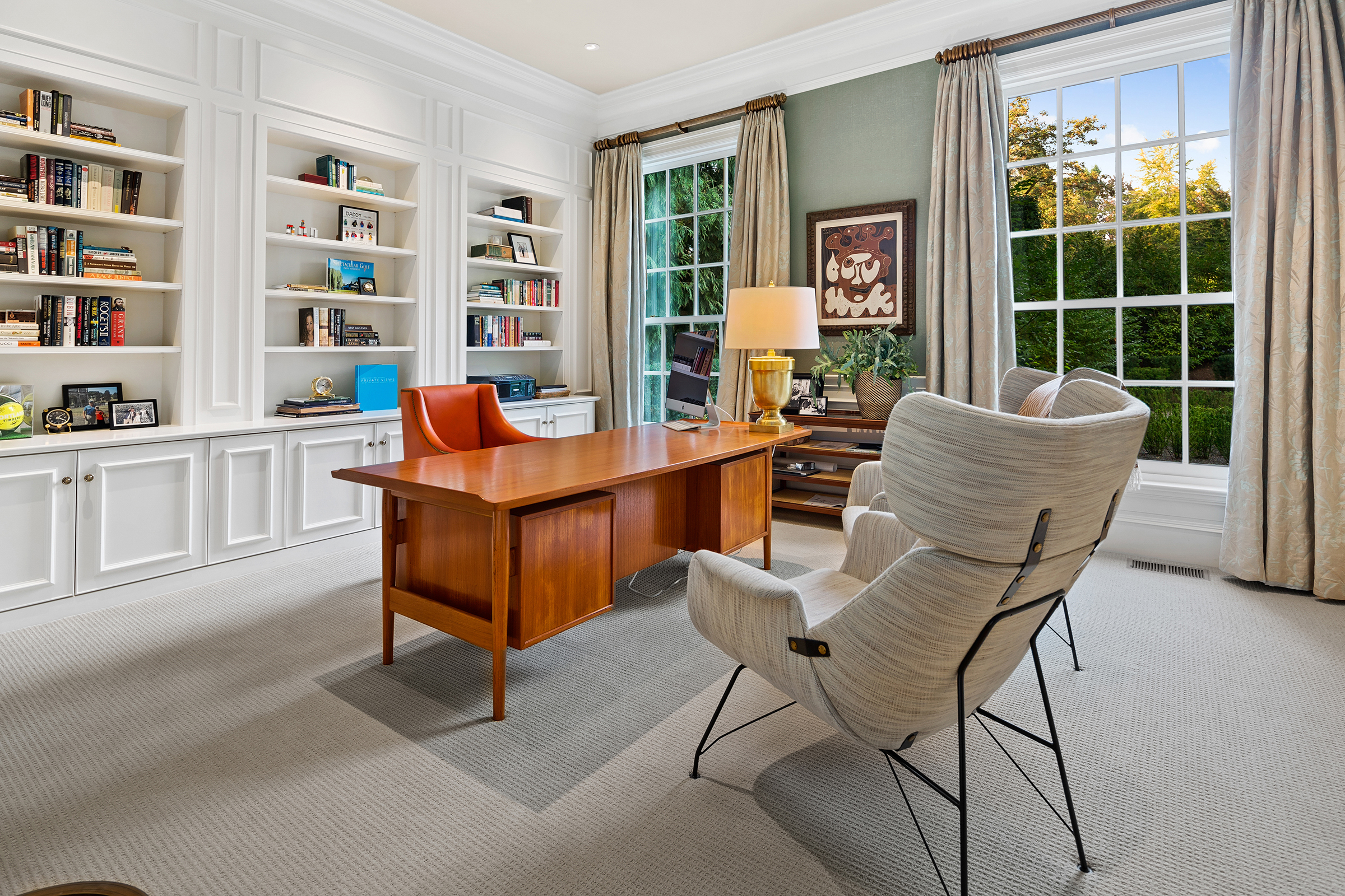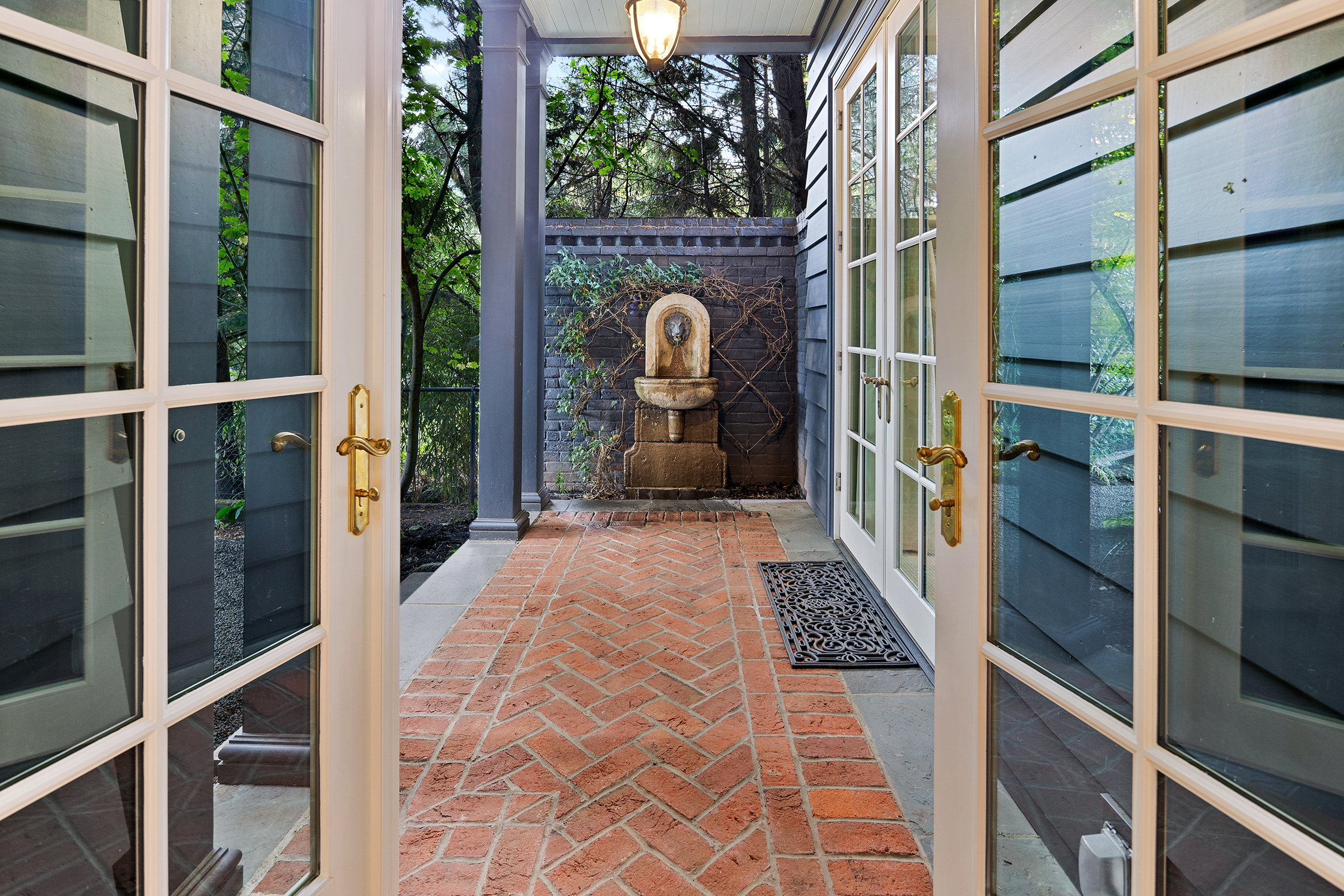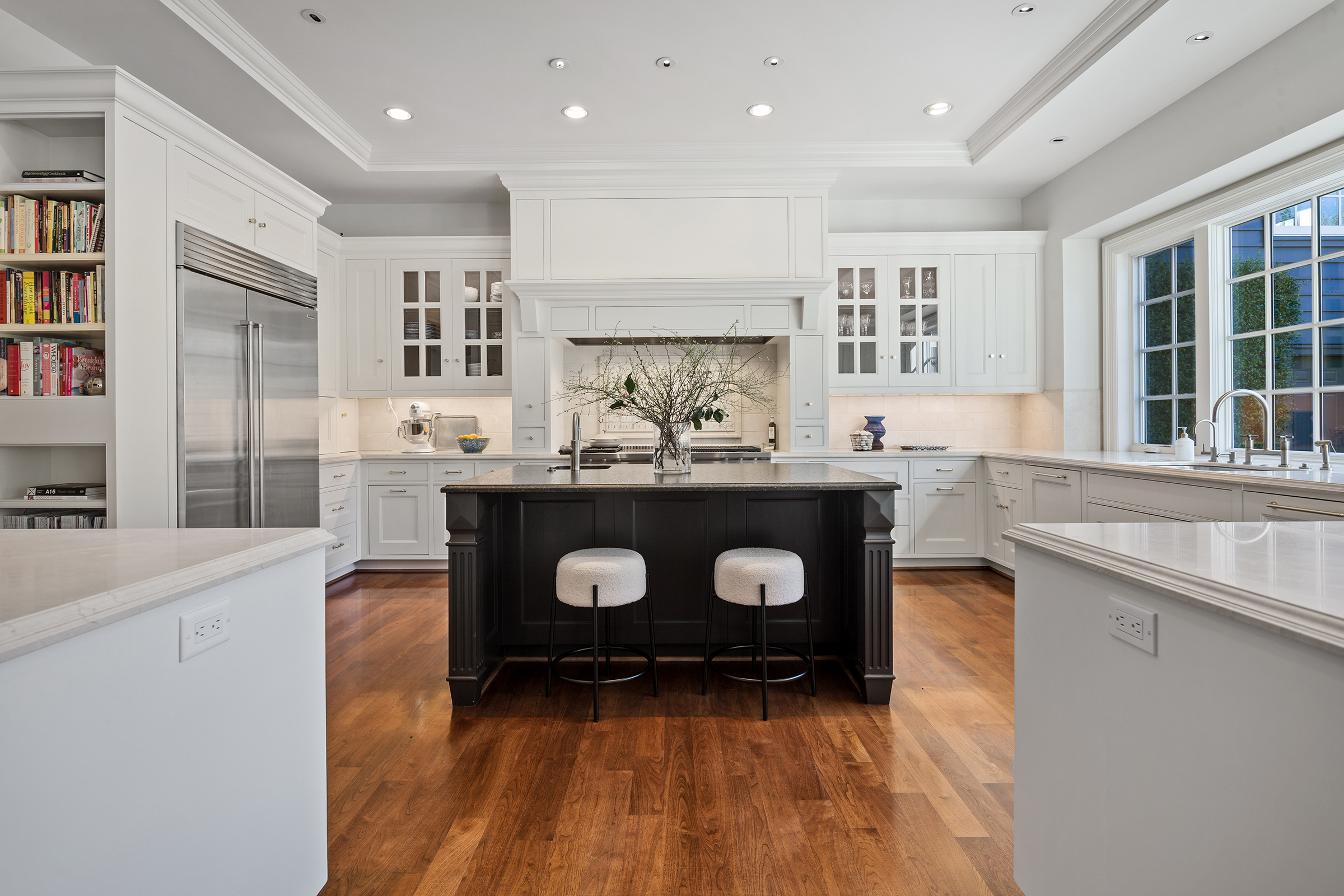 This stunning and luxurious Dunthorpe estate is an architectural and design work of art that exudes elegance, grace, and sophistication in every detail. Step through the front door and into the grand foyer, and you are greeted by soaring ceilings, a breathtaking view of the grand swimming pool, and meticulously landscaped gardens of the private 1.1-acre lot. Beverly Hills designer Stephan Jones oversaw the home's extensive renovation. Every room showcases a collection of custom draperies and wallpapers, stunning designer light fixtures, and expertly curated colors and design materials that give this retreat a sense of cohesive serenity. The main floor features a grand living room, gas fireplace, and French doors opening to the patio overlooking the manicured grounds. Enjoy a quiet moment by the fireplace in the library or settle in for work in the spacious office with built-ins galore. Down the hall, the chef's kitchen with gourmet appliances and a new Sub-Zero refrigerator/freezer opens to the great room, perfect for family lounging, and a breakfast nook with French doors exiting to the backyard. The formal dining room offers abundant room to entertain. Head upstairs to the five spacious ensuite bedrooms and additional guest quarters. The primary suite is a haven of relaxation with breathtaking property views, a cozy fireplace, and custom wallpaper and draperies. Primary bathroom highlights include the soaking tub, heated floors, and extensive walk-in closet with private laundry/valet. Down the hall are four additional ensuite bedrooms, an oversized family laundry room, a large playroom, plus a guest/nanny suite with sleeping quarters and kitchenette, ensuring comfort and privacy. The home's lowest level is equally impressive, with a workout space, temperature-controlled wine room, multiple storage rooms, and fully updated top-of-the-line HVAC systems. Outdoor features include an expansive turf lawn, raised beds, a chicken coop, a dog run, and more.