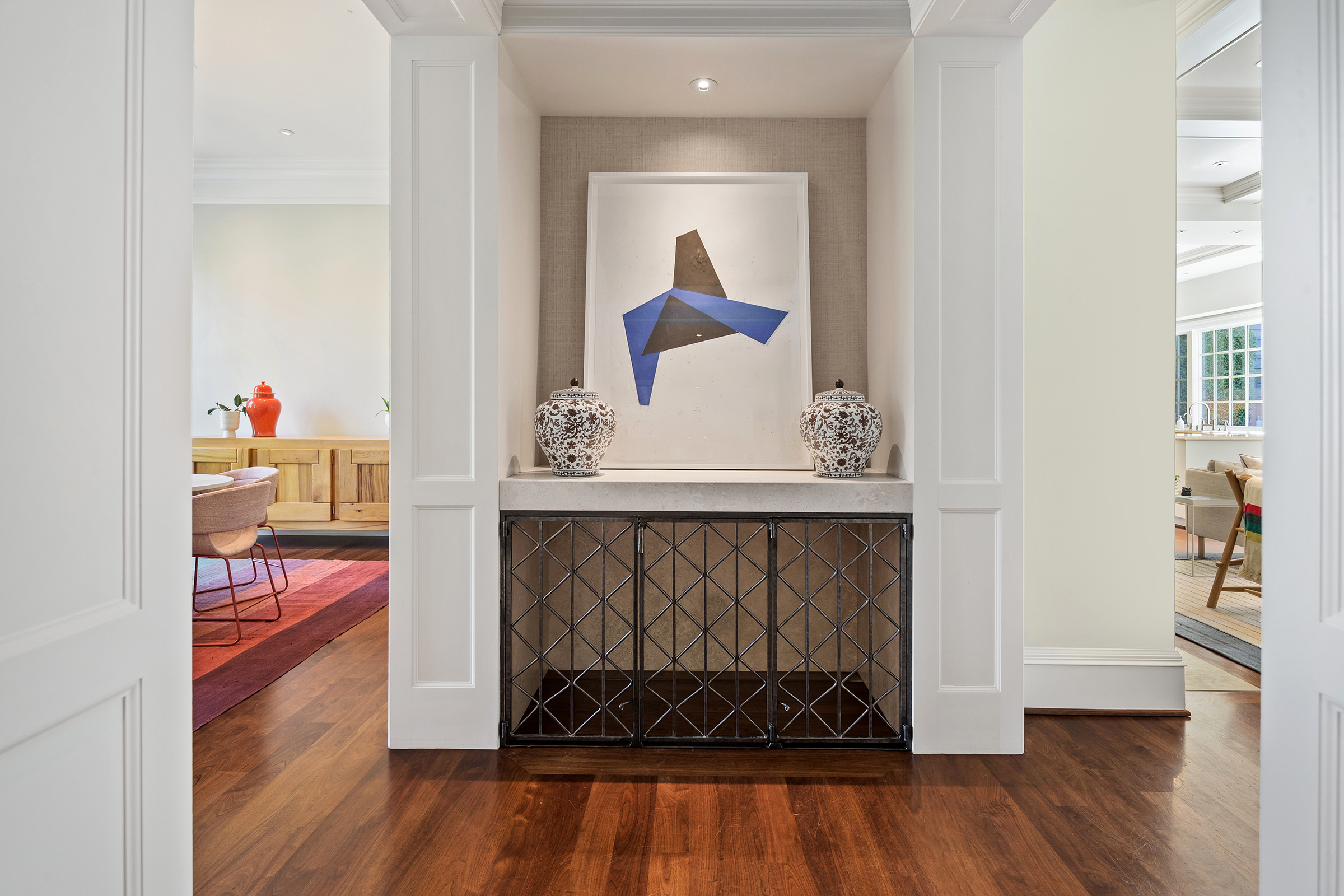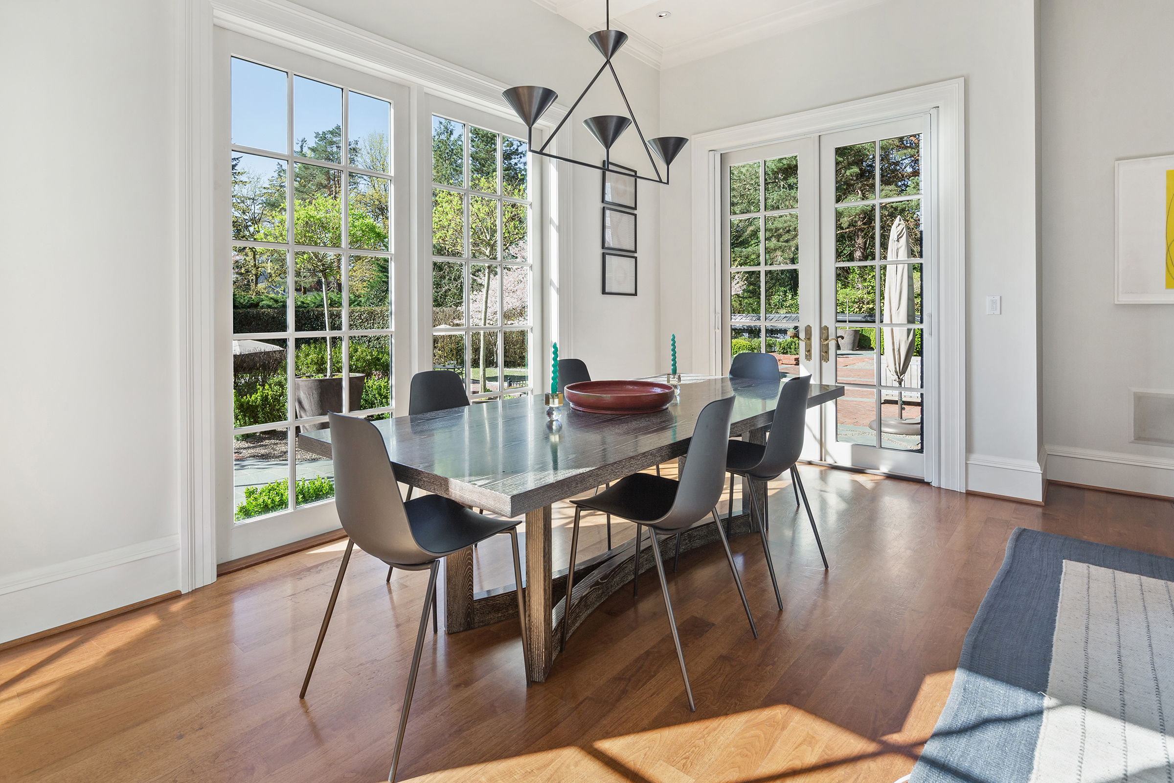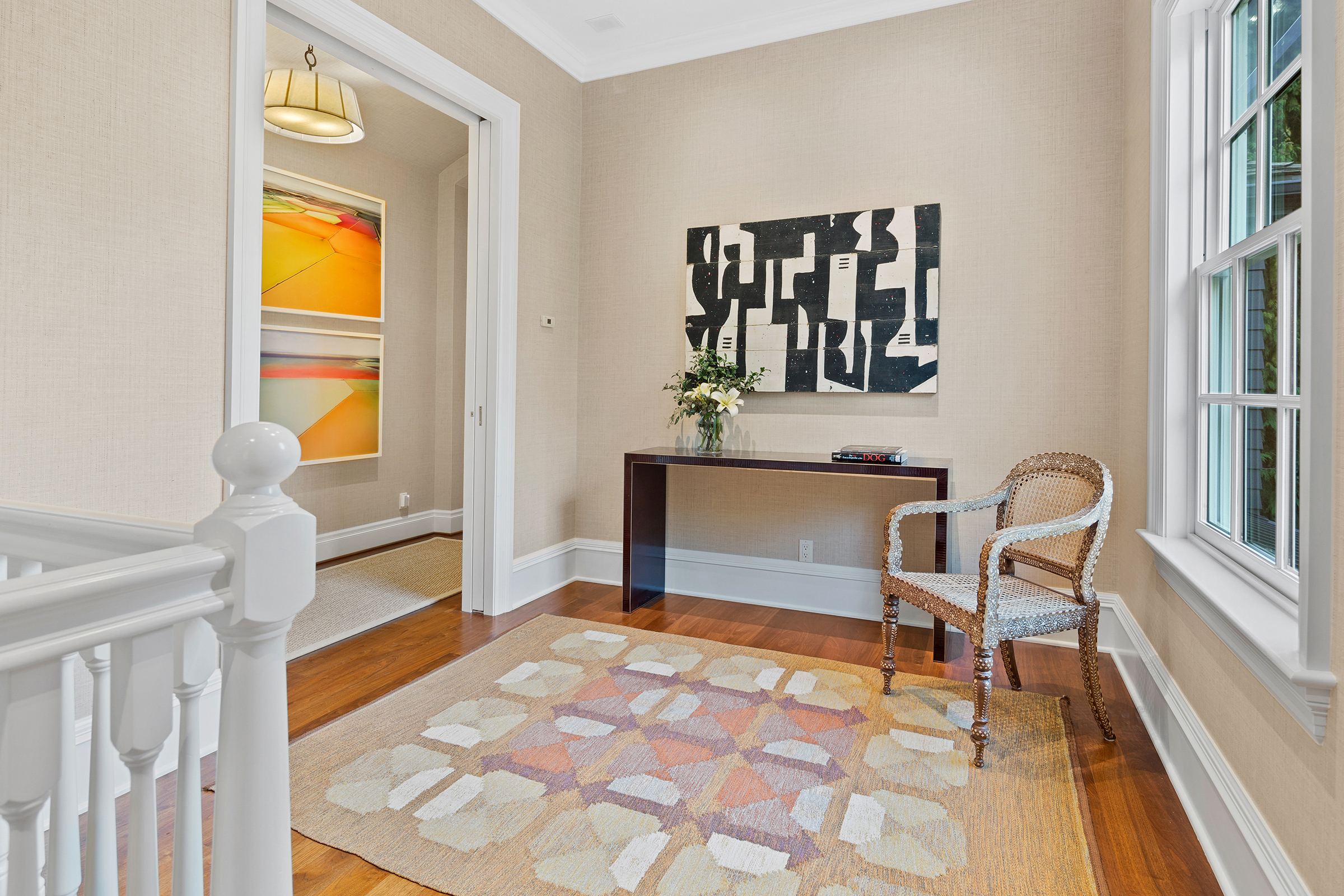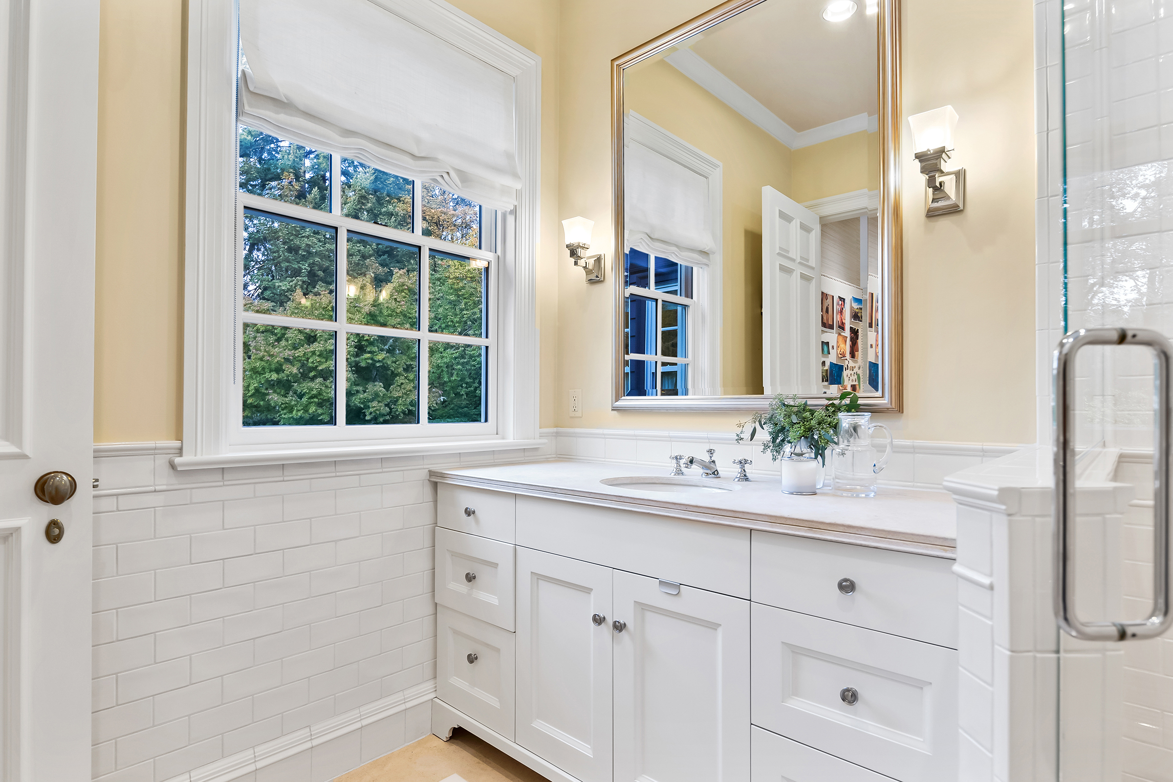 This stunning and luxurious Dunthorpe estate is an architectural and design work of art that exudes elegance, grace, and sophistication in every detail. Step through the front door and into the grand foyer, and you are greeted by soaring ceilings, a breathtaking view of the grand swimming pool, and meticulously landscaped gardens of the private 1.1-acre lot. Beverly Hills designer Stephan Jones oversaw the home's extensive renovation. Every room showcases a collection of custom draperies and wallpapers, stunning designer light fixtures, and expertly curated colors and design materials that give this retreat a sense of cohesive serenity. The main floor features a grand living room, gas fireplace, and French doors opening to the patio overlooking the manicured grounds. Enjoy a quiet moment by the fireplace in the library or settle in for work in the spacious office with built-ins galore. Down the hall, the chef's kitchen with gourmet appliances and a new Sub-Zero refrigerator/freezer opens to the great room, perfect for family lounging, and a breakfast nook with French doors exiting to the backyard. The formal dining room offers abundant room to entertain. Head upstairs to the five spacious ensuite bedrooms and additional guest quarters. The primary suite is a haven of relaxation with breathtaking property views, a cozy fireplace, and custom wallpaper and draperies. Primary bathroom highlights include the soaking tub, heated floors, and extensive walk-in closet with private laundry/valet. Down the hall are four additional ensuite bedrooms, an oversized family laundry room, a large playroom, plus a guest/nanny suite with sleeping quarters and kitchenette, ensuring comfort and privacy. The home's lowest level is equally impressive, with a workout space, temperature-controlled wine room, multiple storage rooms, and fully updated top-of-the-line HVAC systems. Outdoor features include an expansive turf lawn, raised beds, a chicken coop, a dog run, and more.