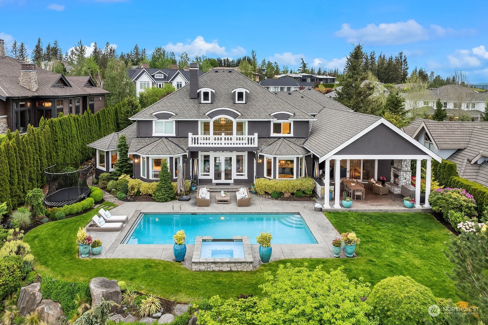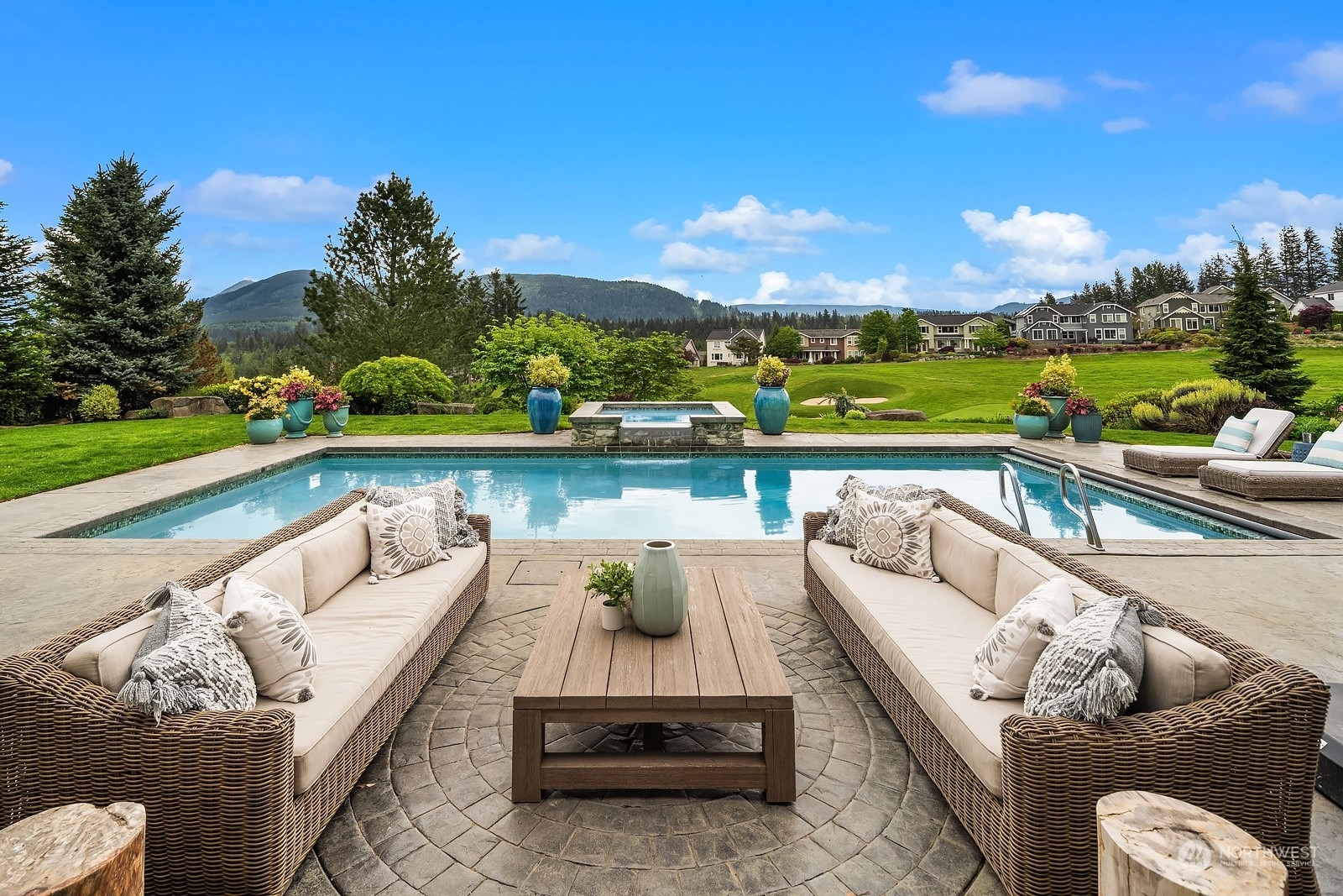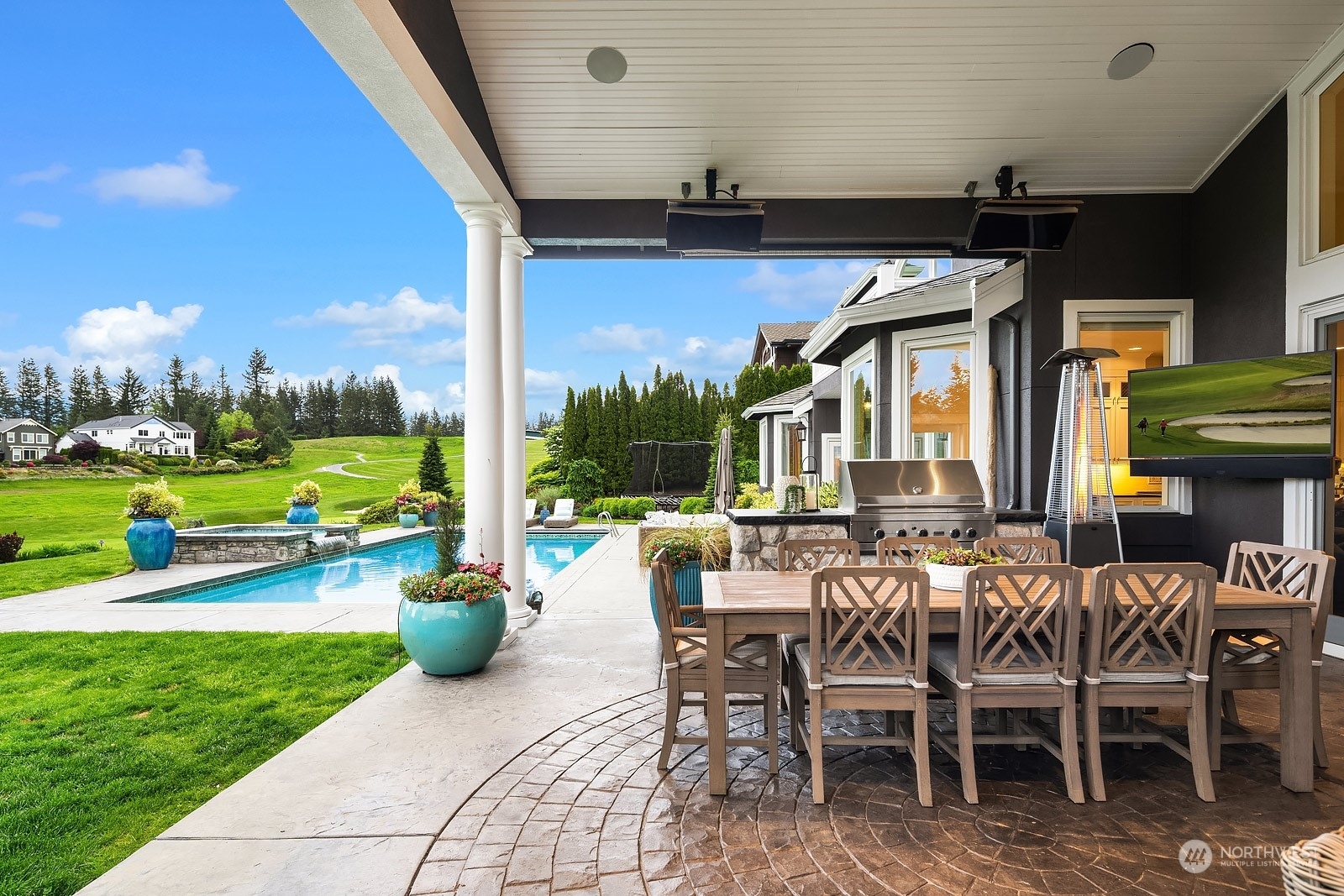 Set on the 18th fairway in Eagle Nest, this resort style home boasts panoramic mountain views and an interior that is unparalleled. The inviting home exudes charm and offers the perfect blend of privacy, fun, and comfortable luxurious living. Take a dip in the pool or spa, or relax in the outdoor room complete with a fireplace, heaters, BBQ and entertainment system. Main level primary suite boasts dual walk-in closets and gorgeous fireplace. All bedrooms are en-suite with walk-in closets. The upgrades are seamless, with stunning finishes that flow effortlessly from one space to another with warm textures, and top-of-the-line amenities. It's everything you've ever dreamed of - the epitome of living life to its fullest. This is one of a kind.