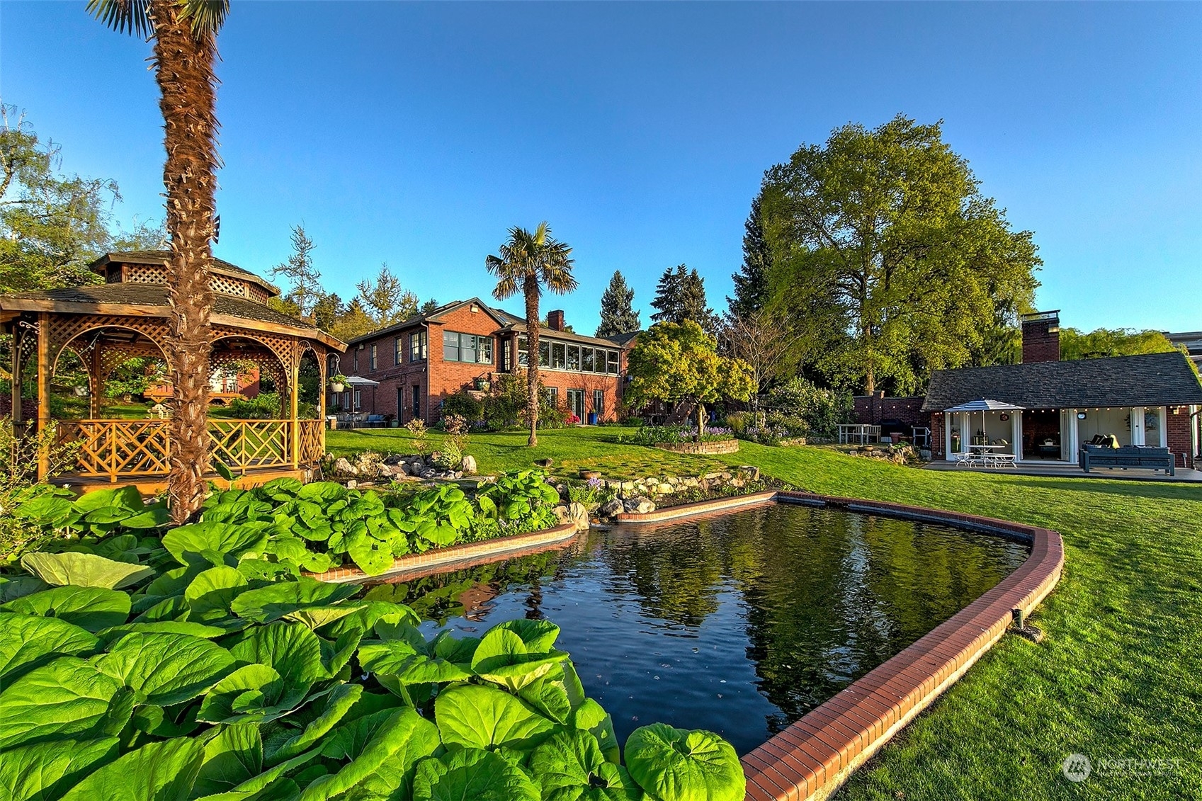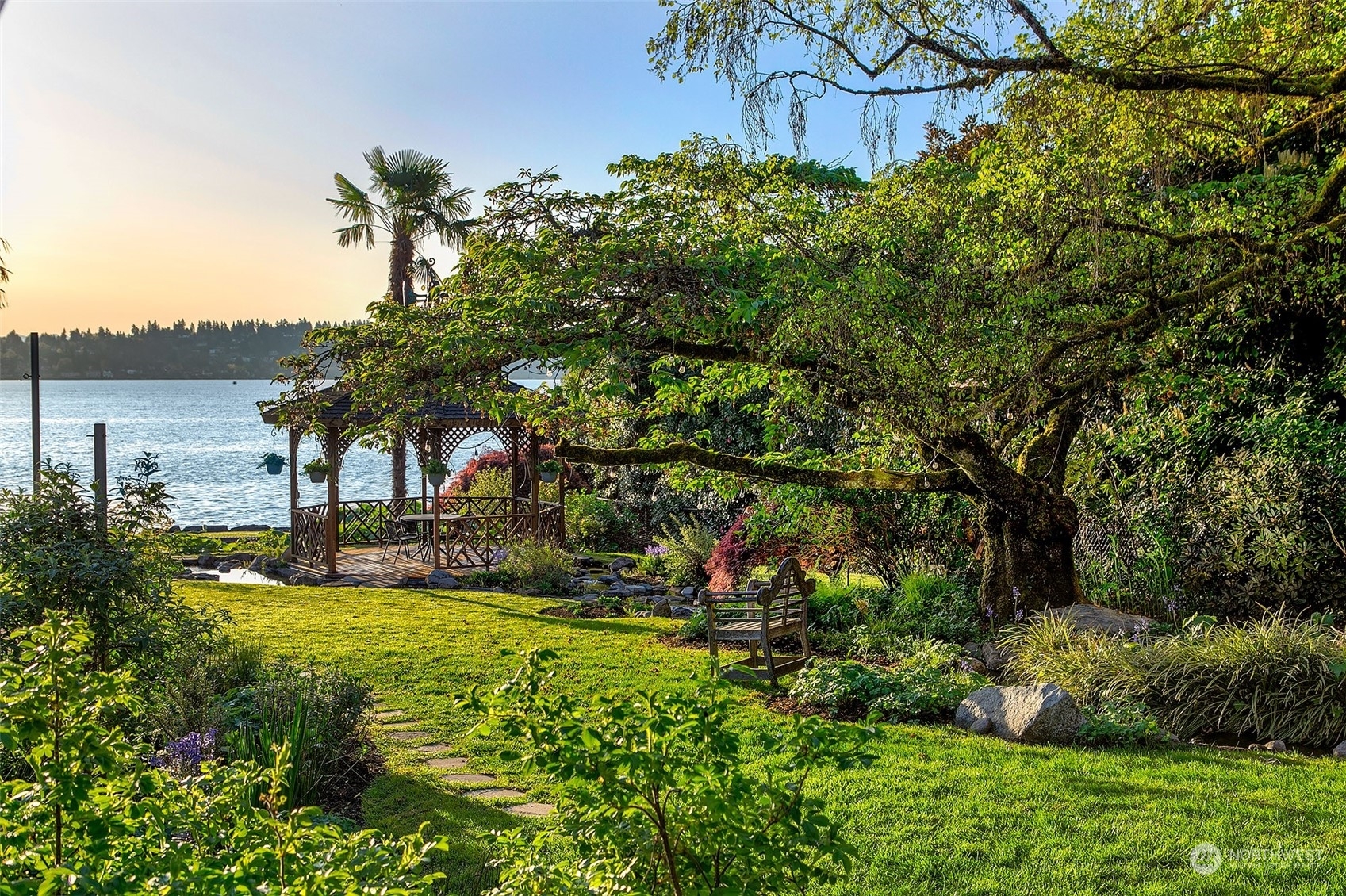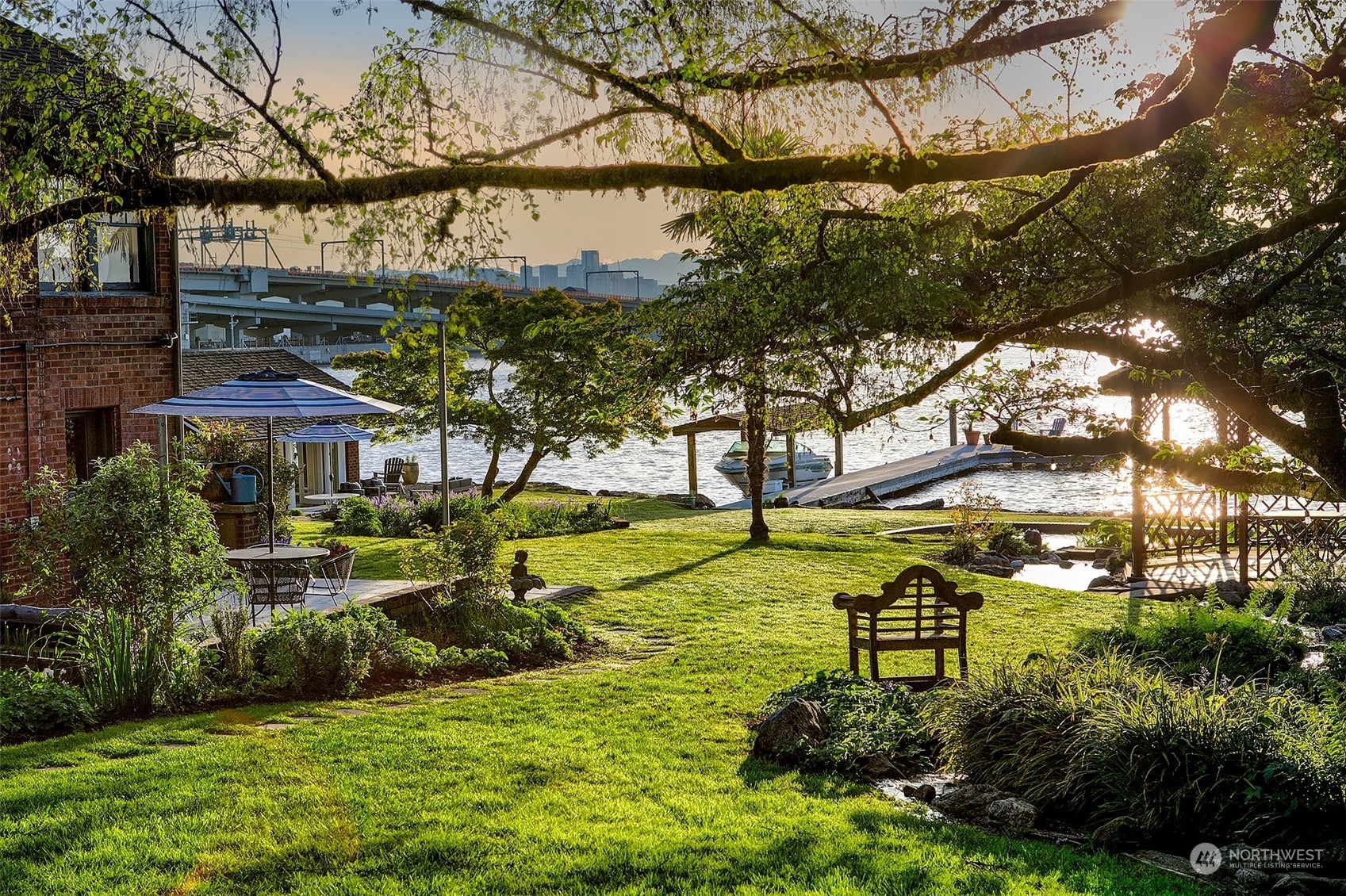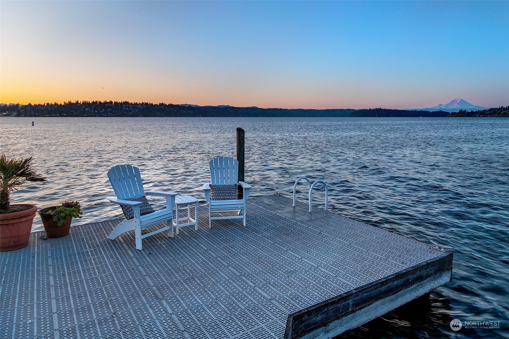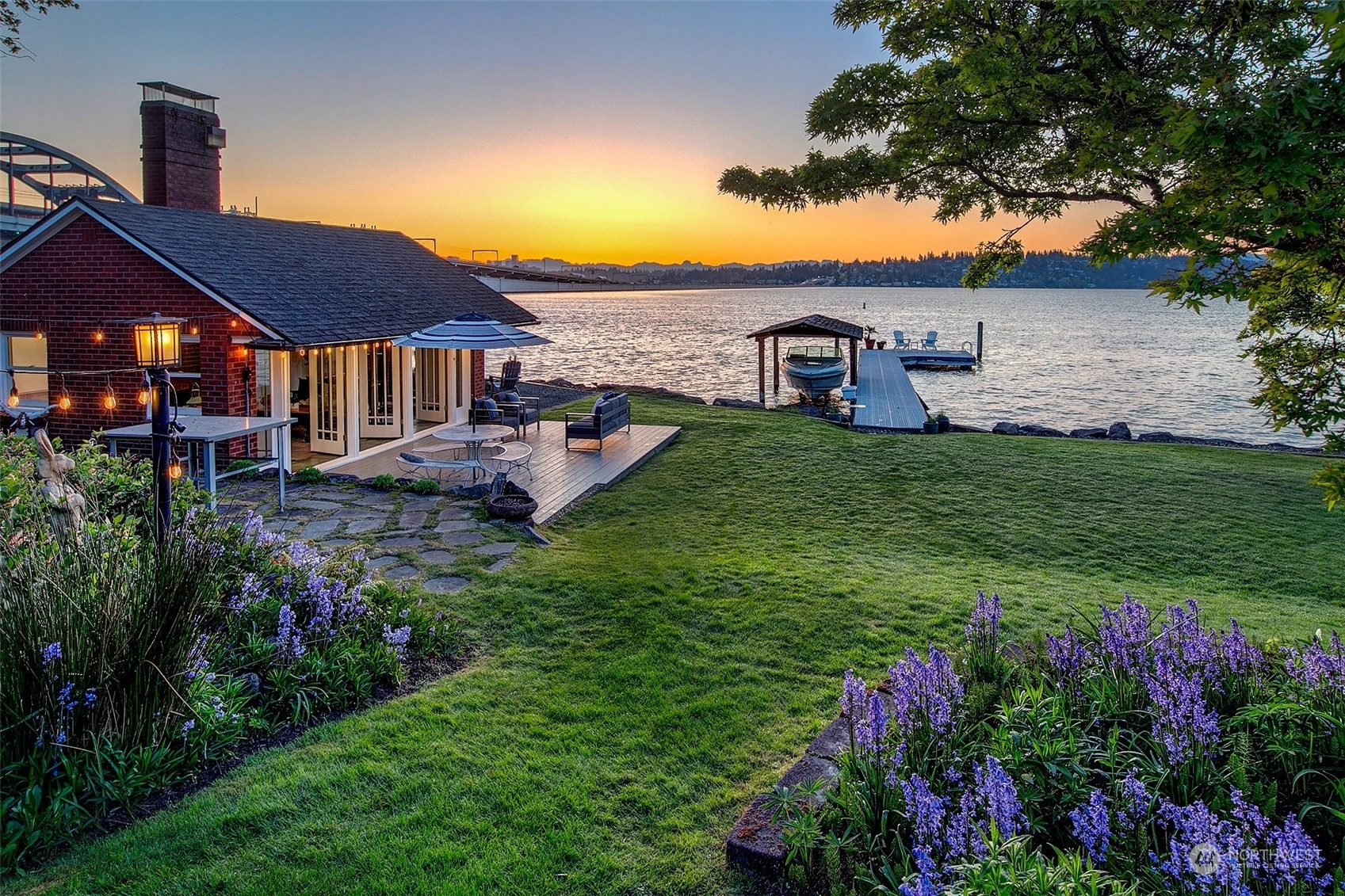 The lifestyle is easy, comfortable, and ready for your guest to arrive by boat and say hello. Your day begins with idyllic decisions to consider ... paddle, swim, sail, wakeboard or coffee on the 75' dock. At nearly an acre, this legacy property is spread across 120' of Lake Washington waterfront. The grounds are punctuated with established gardens, meandering creek, reflecting pool, and enclosed with a handsome brick wall for the utmost privacy. Inside, walls of windows invite natural light and mesmerizing lake and mountain views. Flexible living spaces are ideal for entertaining groups of all sizes. The lower level presents an expansive family room which opens to the east lawn and guest suite, an ideal home for multi-generational living.