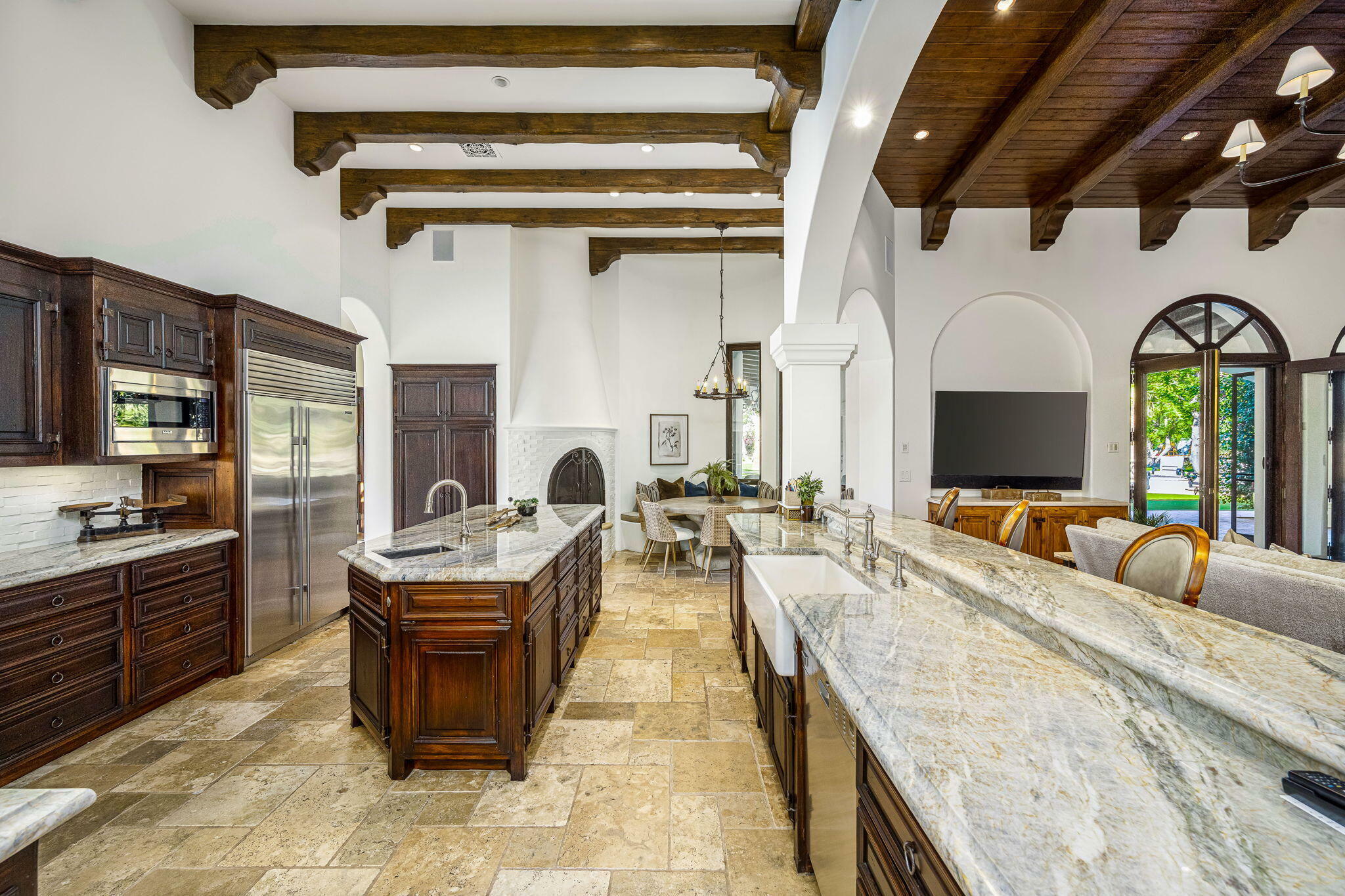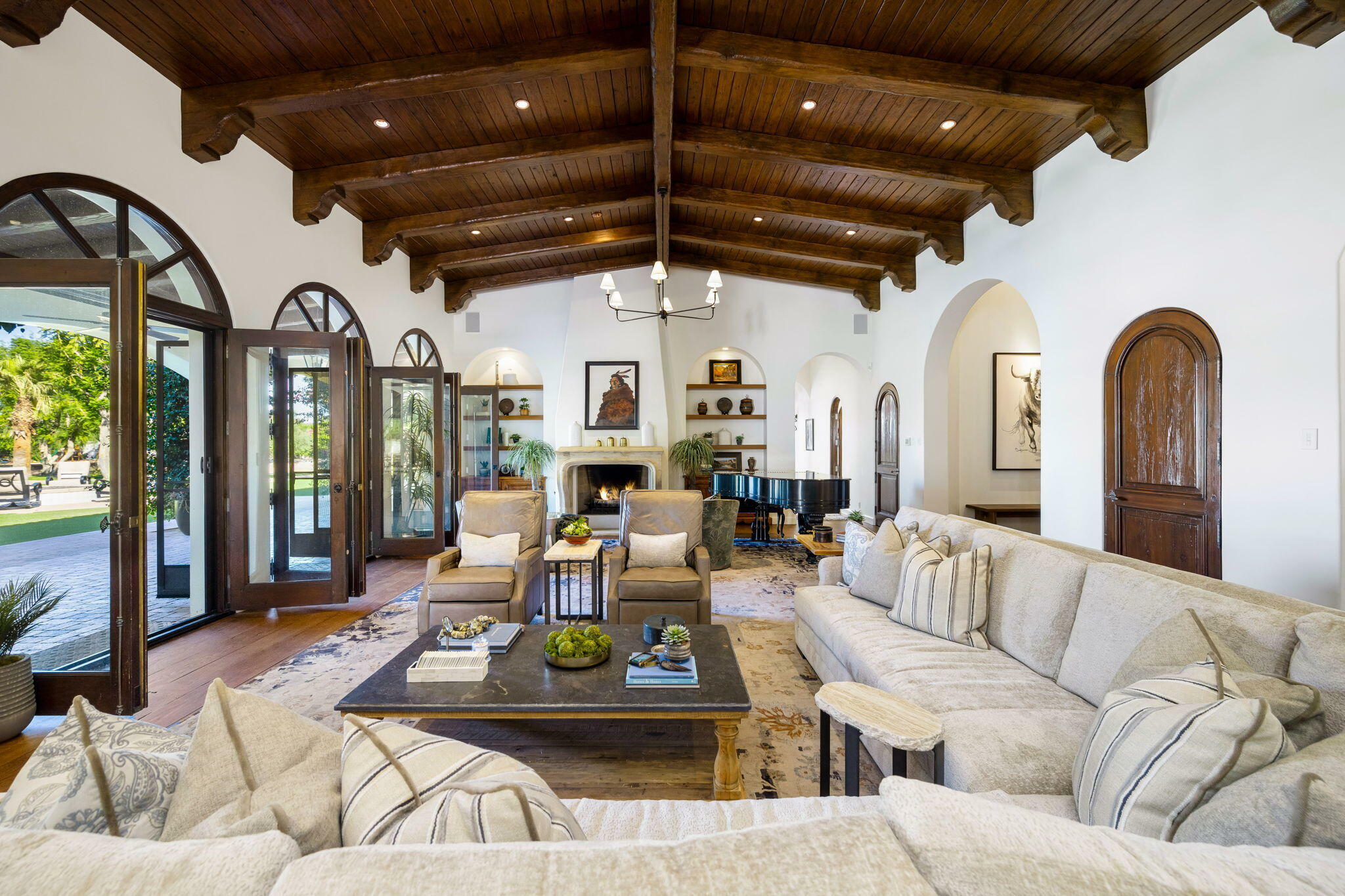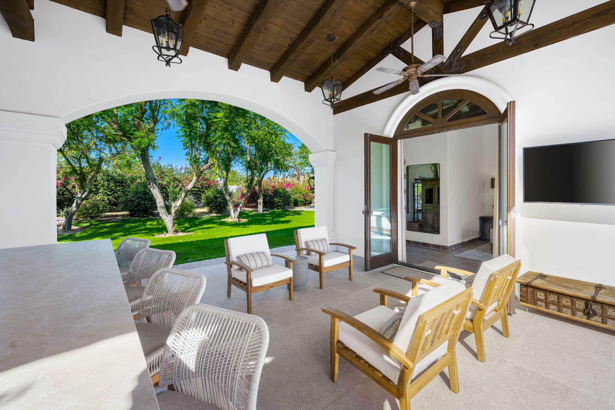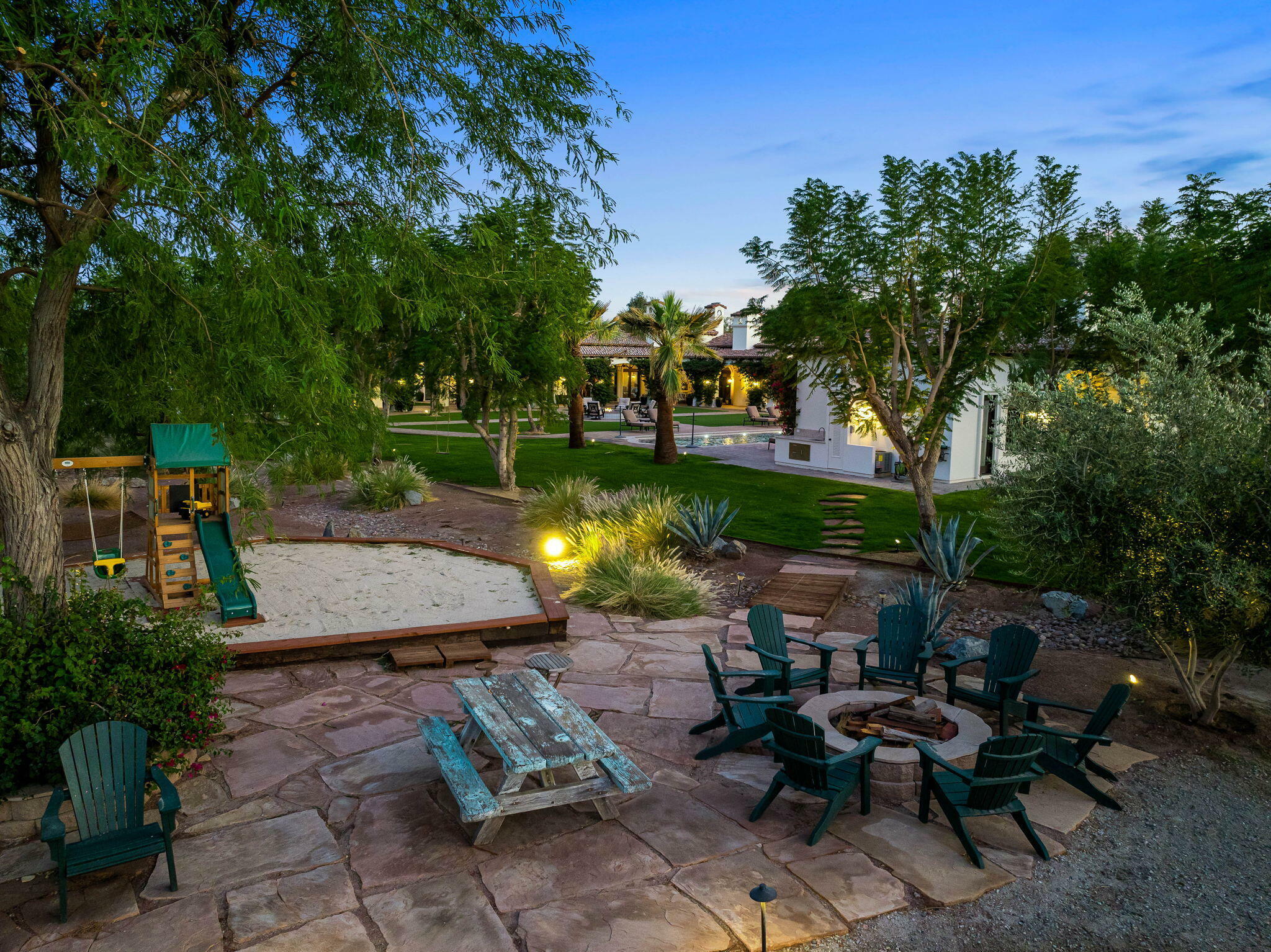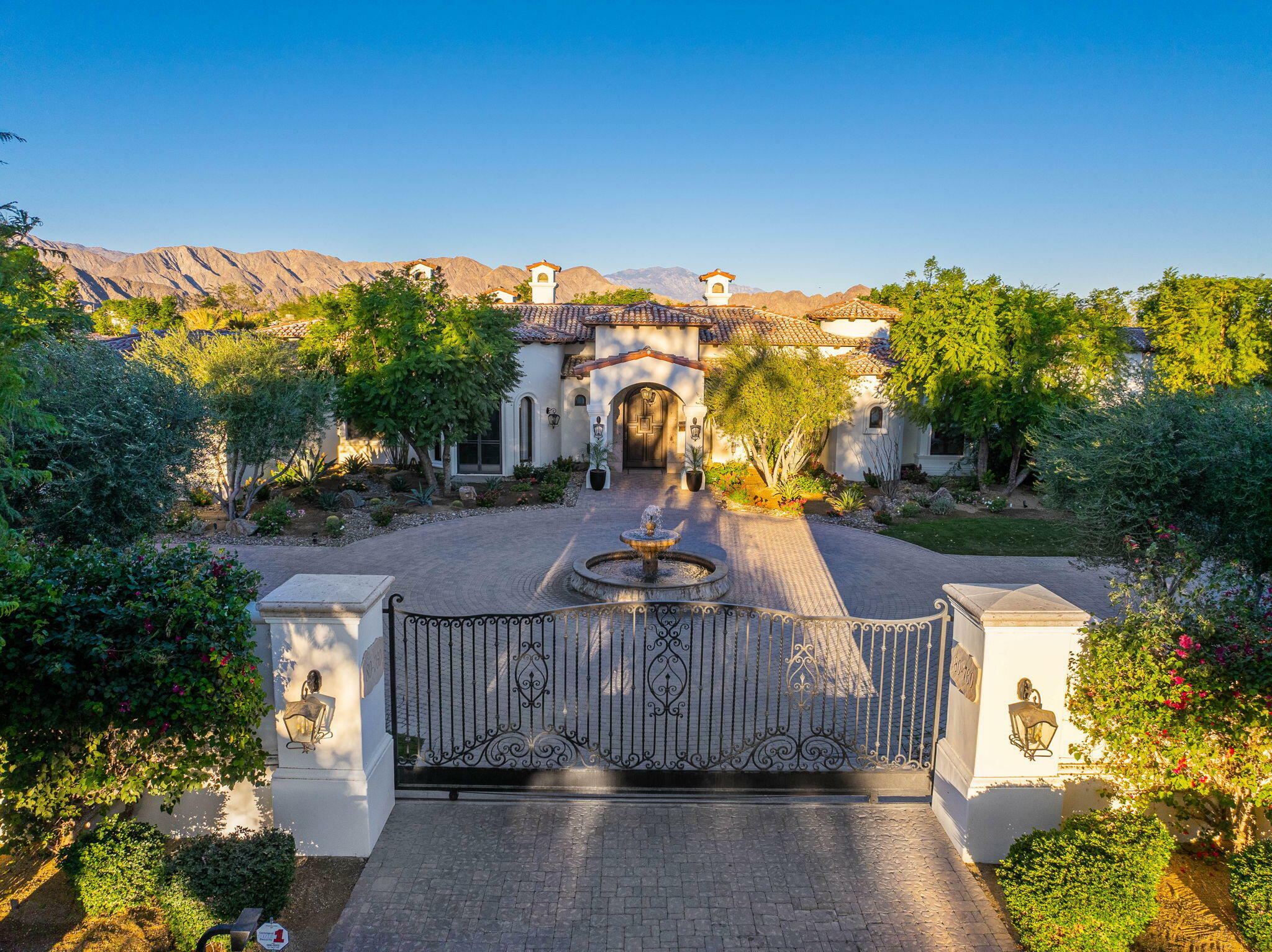 An opportunity to take advantage of rare price improvement in the gated enclave of La Quinta Polo Estates! A luxury estate of uncompromised beauty on over 2 acres and with 7 bedrooms, is a private sanctuary and ones' personal resort with stone walkways, mature palm and citrus trees, bougainvillea, water fountain, swimming pool, spa and firepit, lounge areas and a fireplace. Even a playground for children! The main residence exudes character, with 3 fireplaces, and architecturally designed, interior features such as custom hand hewed beams , doors, windows and floors, built on the site at the time of construction. 4 en-suite bedrooms, each has stately French doors giving access to the loggia and manicured grounds. The heart of the house, the kitchen, connects the living room with the formal dining room and the adjacent walk-in bar for seamless entertaining. A large, private casita can be found at the end of the main residence, with a kitchenette, primary and secondary bedroom, and attached laundry room. Separately, a second guest house resides near an outdoor kitchen and lounge, pool and spa. For gourmet cooks and lovers of entertaining, a custom designed outdoor chef's kitchen pavilion is fully staffed with barbecue, grill, refrigerator, a pizza oven, overhead, built-in heaters, a TV and music, bar seating for 12 and a dining patio for 20 or more. And much, much more. Every possible detail or want has been executed in this impossibly beautiful estate. Numerous major improvements have been completed in 2023 and 2024, a comprehensive list is available upon request. Turnkey Furnished without exception.
