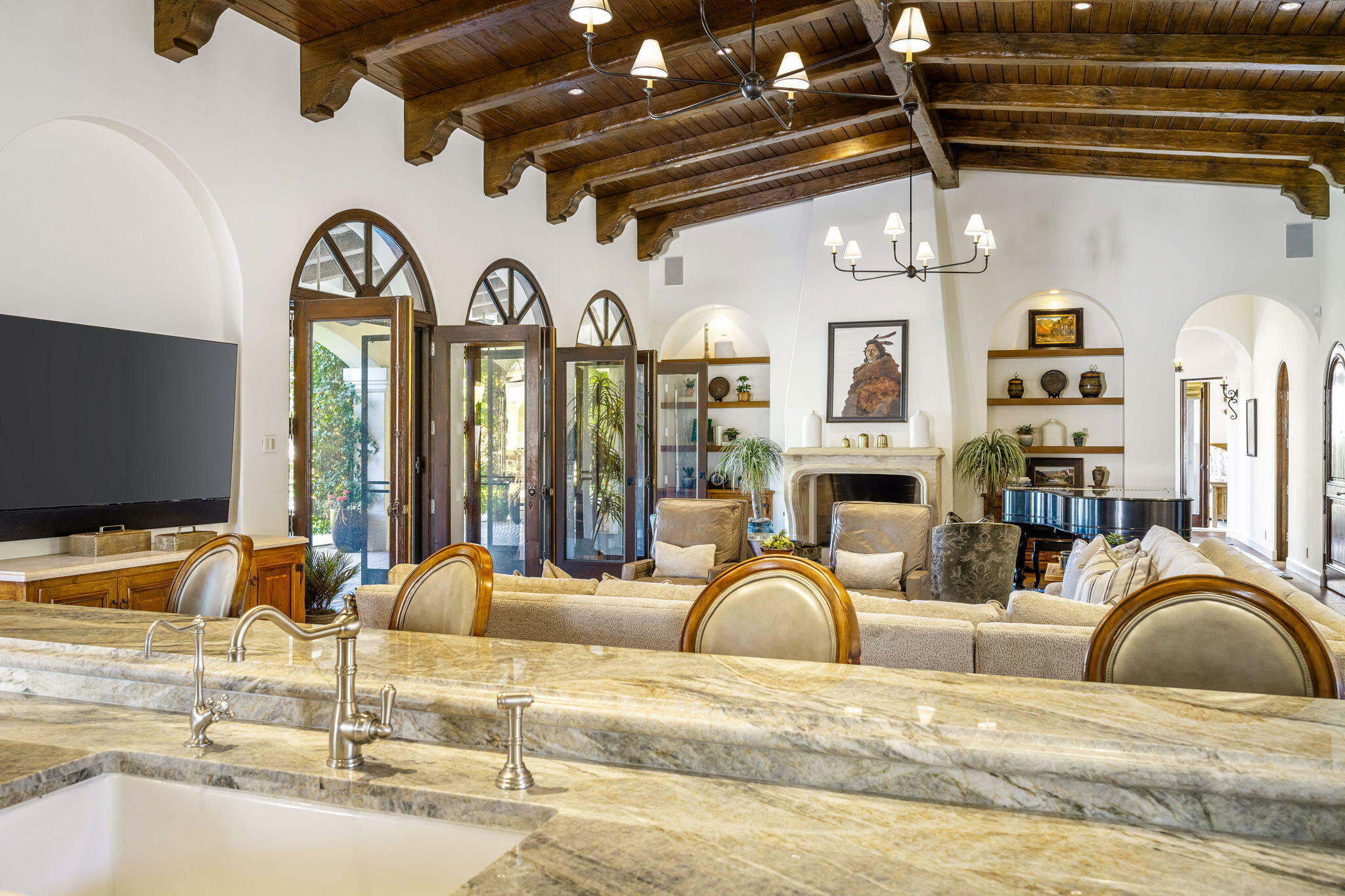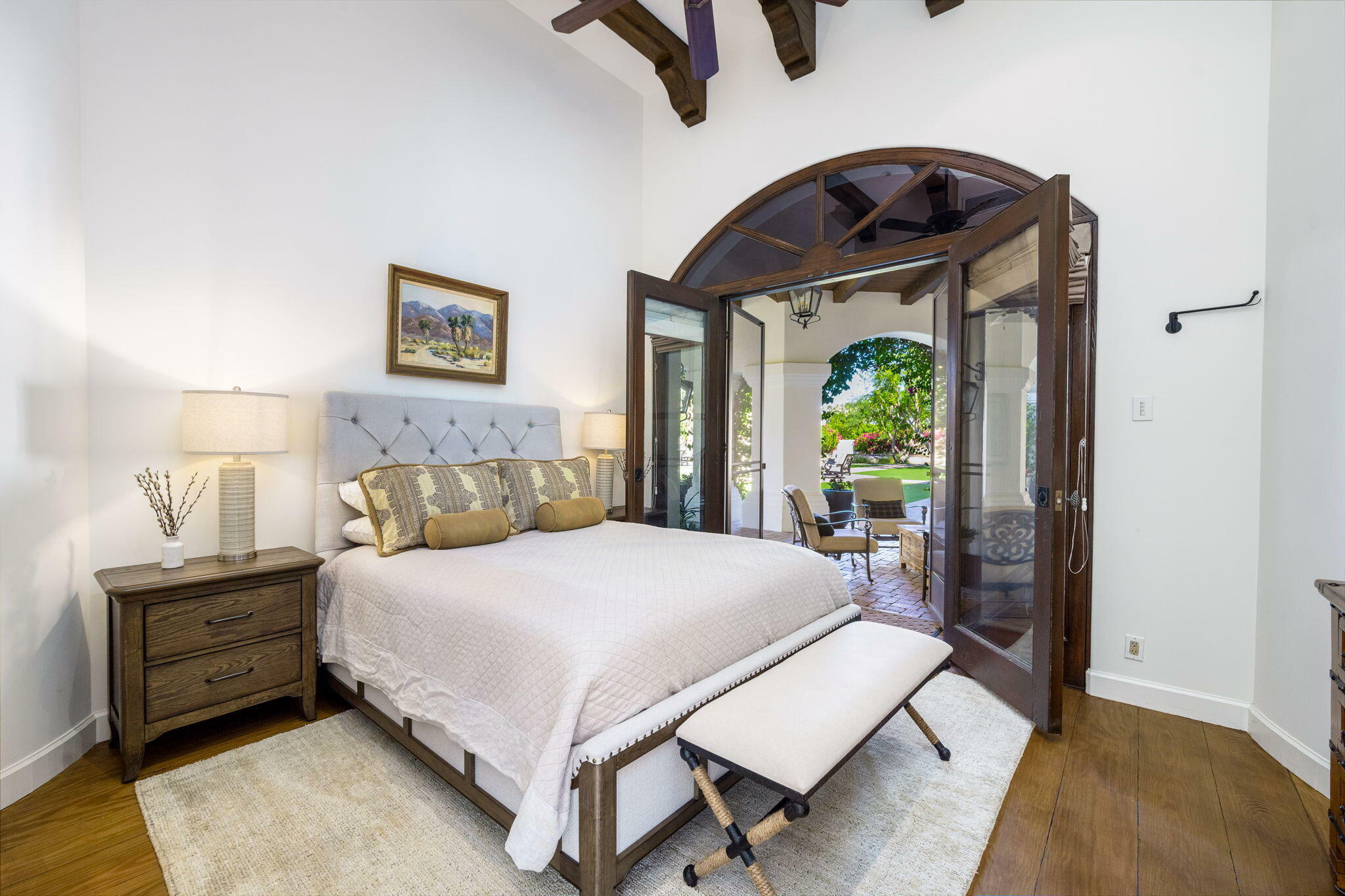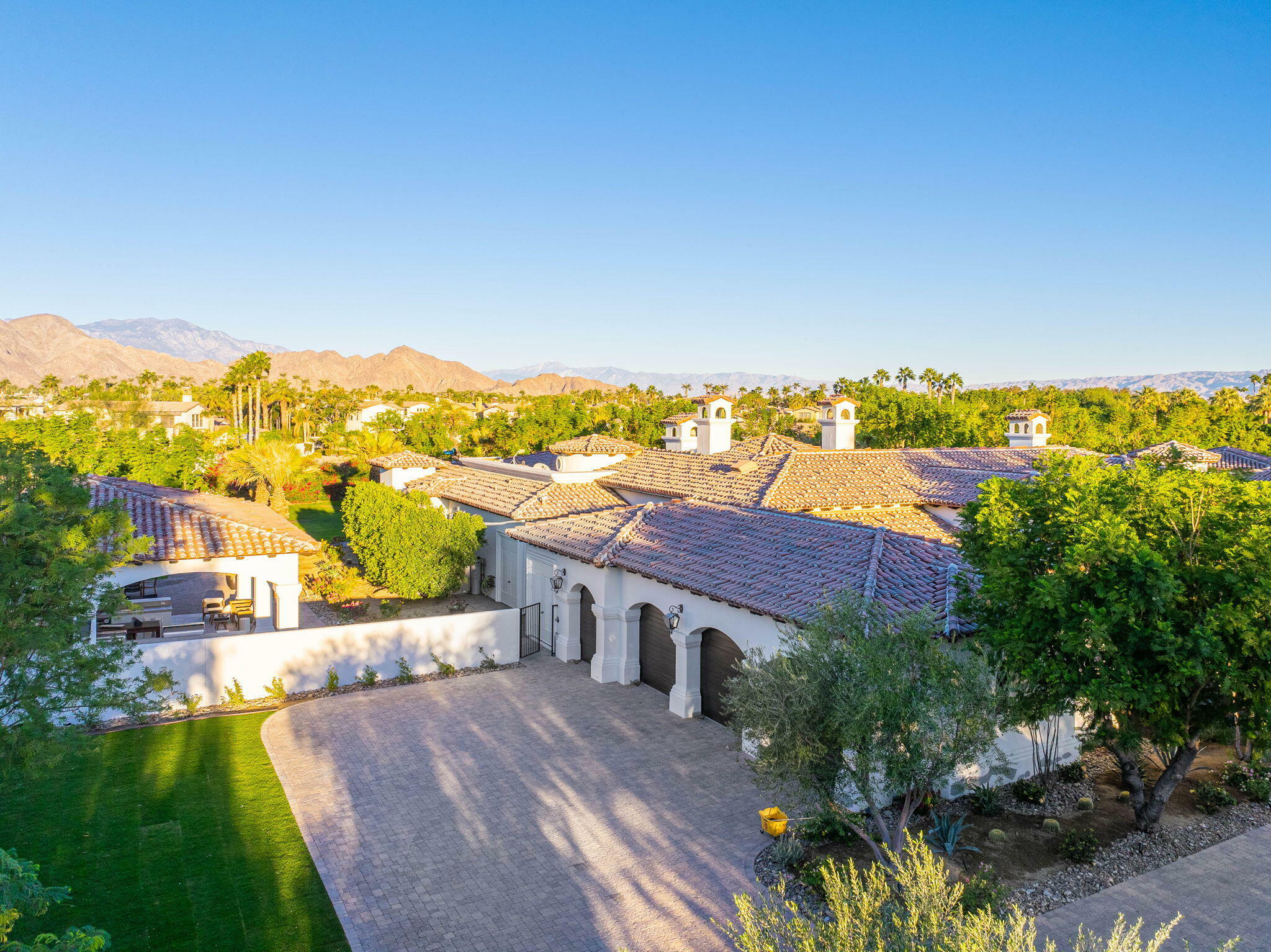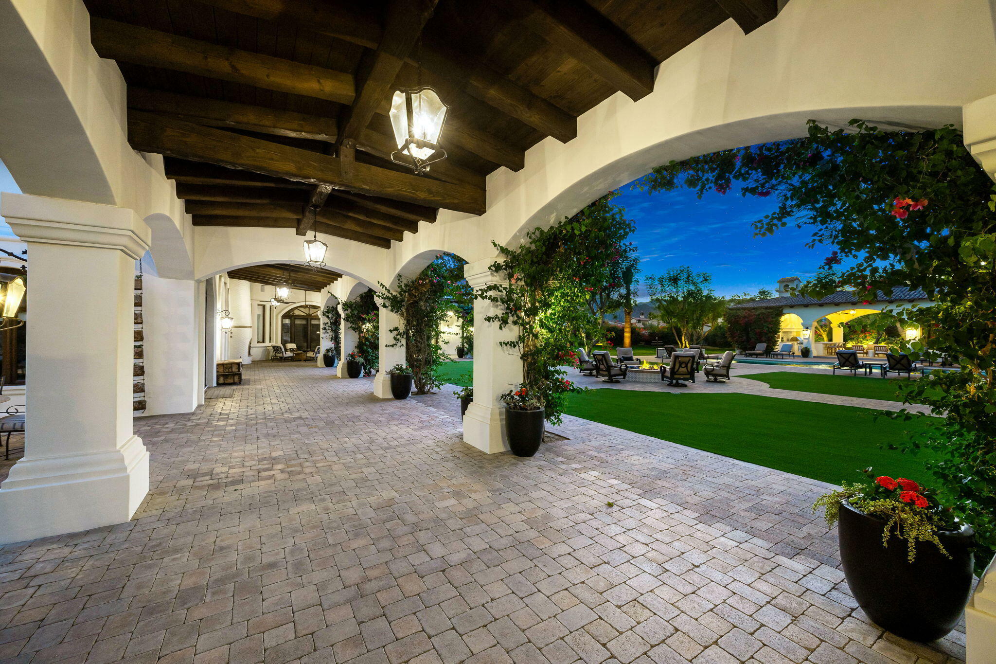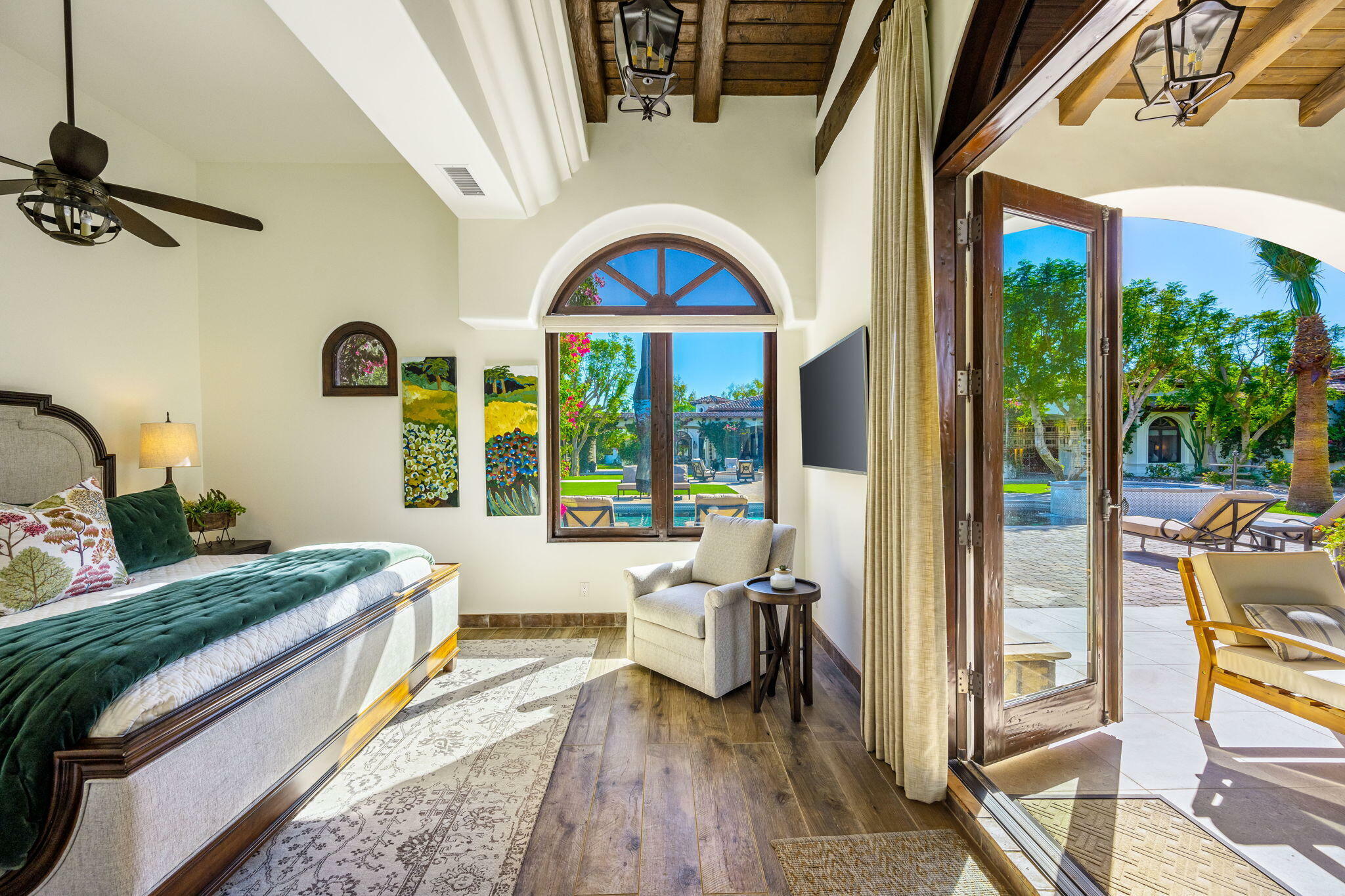 An opportunity to take advantage of rare price improvement in the gated enclave of La Quinta Polo Estates! A luxury estate of uncompromised beauty on over 2 acres and with 7 bedrooms, is a private sanctuary and ones' personal resort with stone walkways, mature palm and citrus trees, bougainvillea, water fountain, swimming pool, spa and firepit, lounge areas and a fireplace. Even a playground for children! The main residence exudes character, with 3 fireplaces, and architecturally designed, interior features such as custom hand hewed beams , doors, windows and floors, built on the site at the time of construction. 4 en-suite bedrooms, each has stately French doors giving access to the loggia and manicured grounds. The heart of the house, the kitchen, connects the living room with the formal dining room and the adjacent walk-in bar for seamless entertaining. A large, private casita can be found at the end of the main residence, with a kitchenette, primary and secondary bedroom, and attached laundry room. Separately, a second guest house resides near an outdoor kitchen and lounge, pool and spa. For gourmet cooks and lovers of entertaining, a custom designed outdoor chef's kitchen pavilion is fully staffed with barbecue, grill, refrigerator, a pizza oven, overhead, built-in heaters, a TV and music, bar seating for 12 and a dining patio for 20 or more. And much, much more. Every possible detail or want has been executed in this impossibly beautiful estate. Numerous major improvements have been completed in 2023 and 2024, a comprehensive list is available upon request. Turnkey Furnished without exception.