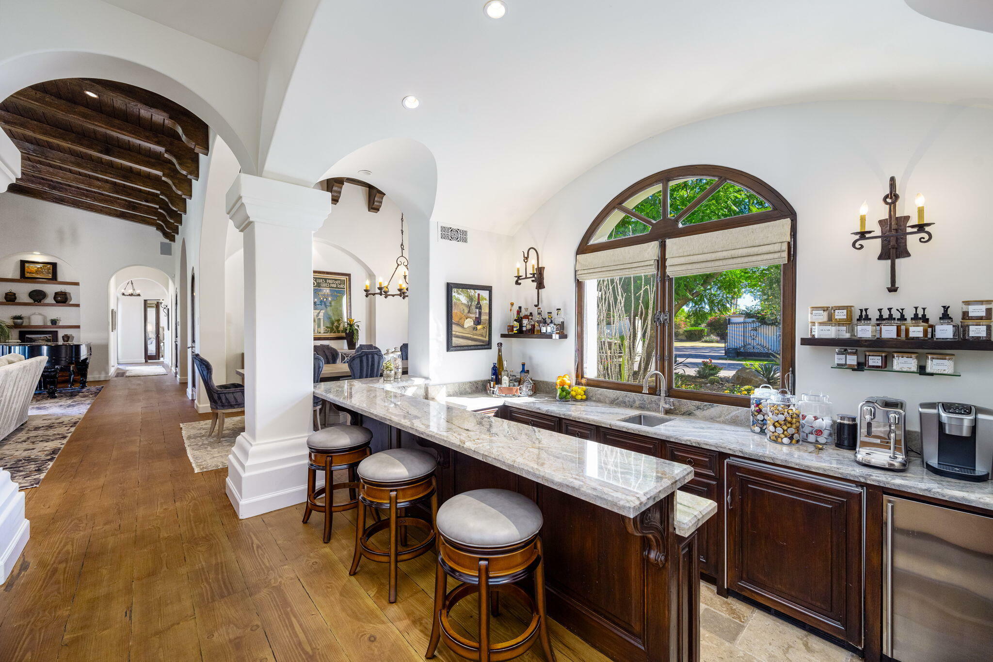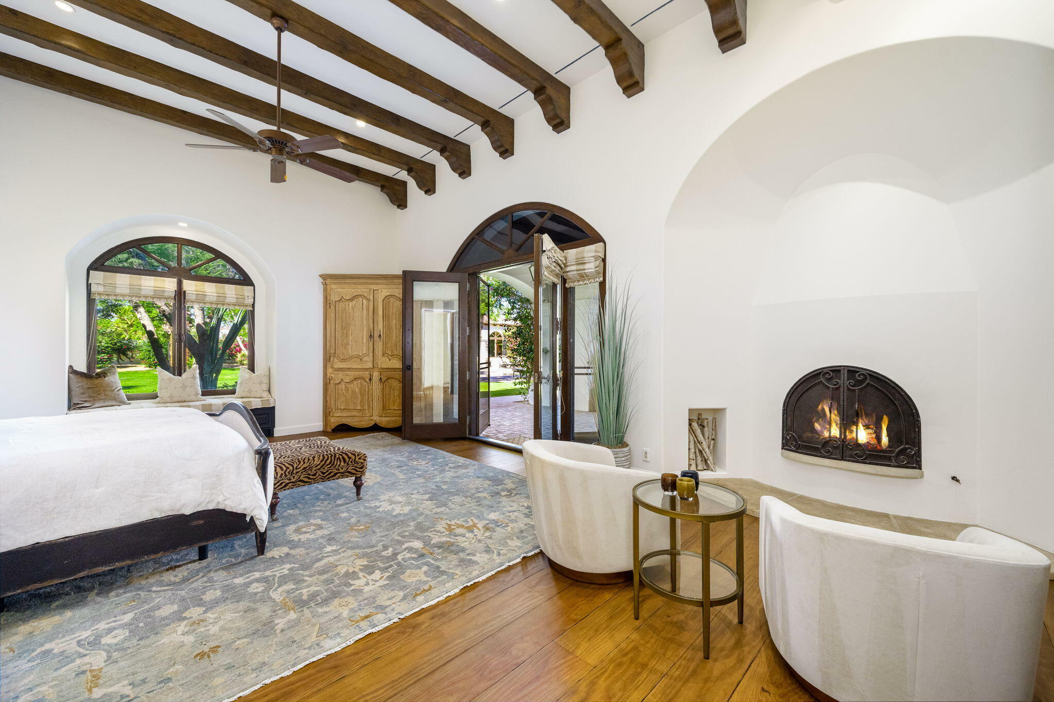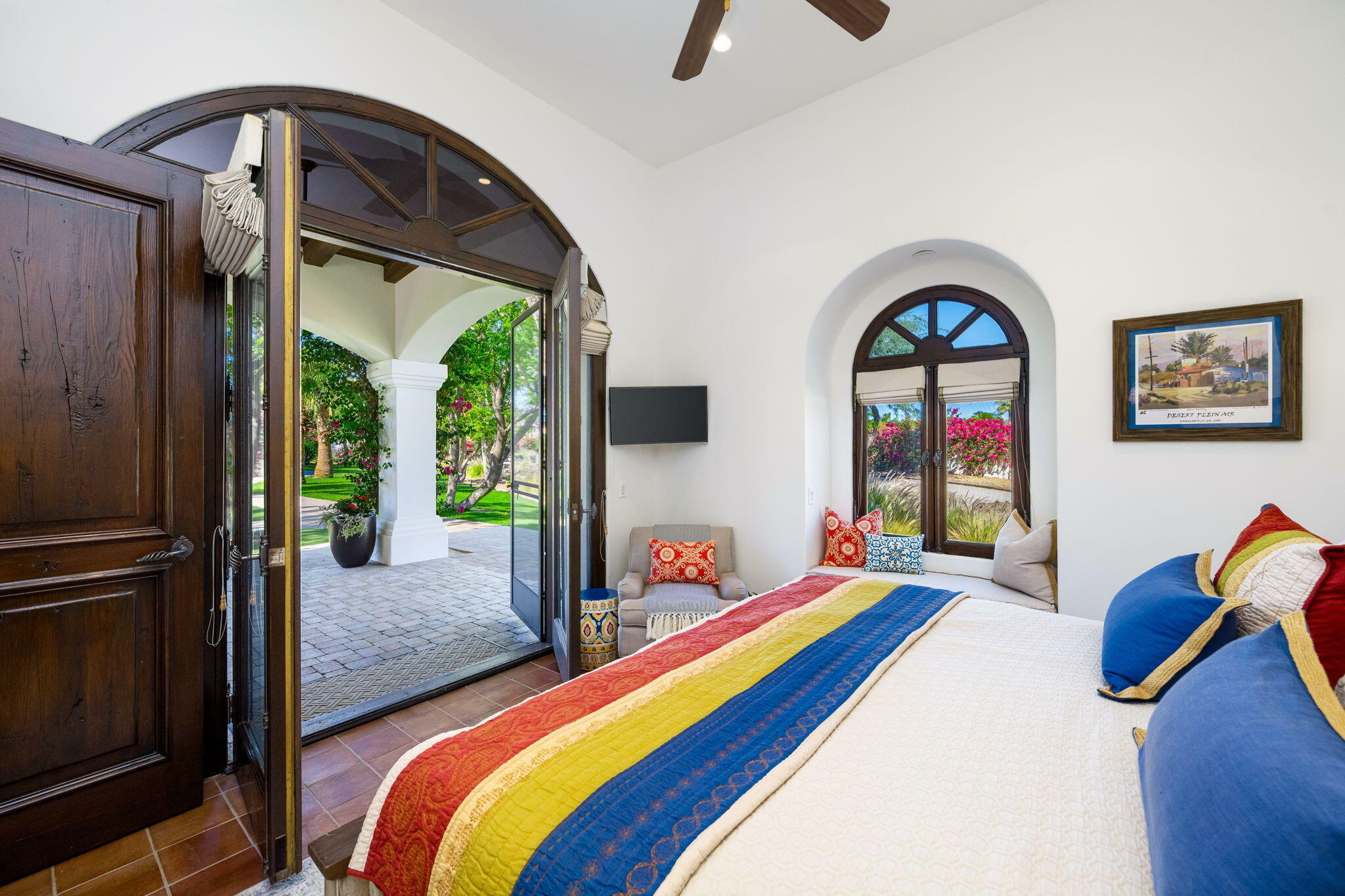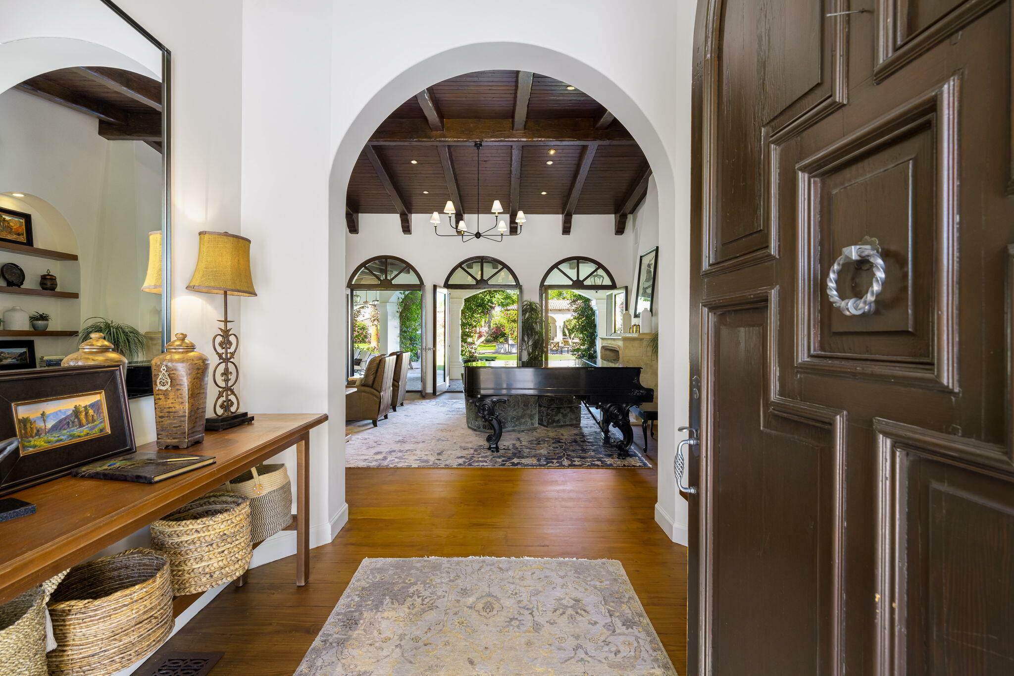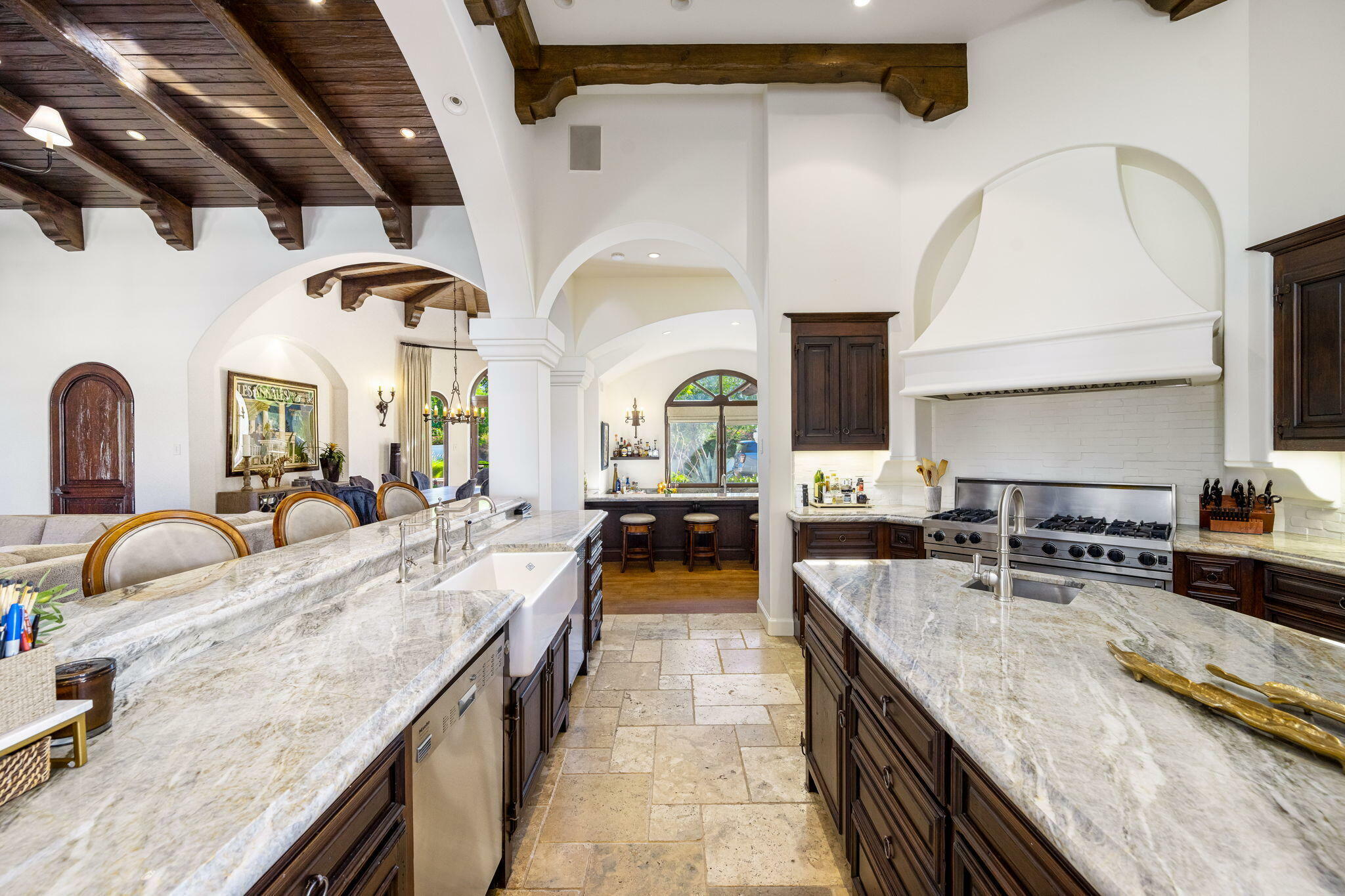 An opportunity to take advantage of rare price improvement in the gated enclave of La Quinta Polo Estates! A luxury estate of uncompromised beauty on over 2 acres and with 7 bedrooms, is a private sanctuary and ones' personal resort with stone walkways, mature palm and citrus trees, bougainvillea, water fountain, swimming pool, spa and firepit, lounge areas and a fireplace. Even a playground for children! The main residence exudes character, with 3 fireplaces, and architecturally designed, interior features such as custom hand hewed beams , doors, windows and floors, built on the site at the time of construction. 4 en-suite bedrooms, each has stately French doors giving access to the loggia and manicured grounds. The heart of the house, the kitchen, connects the living room with the formal dining room and the adjacent walk-in bar for seamless entertaining. A large, private casita can be found at the end of the main residence, with a kitchenette, primary and secondary bedroom, and attached laundry room. Separately, a second guest house resides near an outdoor kitchen and lounge, pool and spa. For gourmet cooks and lovers of entertaining, a custom designed outdoor chef's kitchen pavilion is fully staffed with barbecue, grill, refrigerator, a pizza oven, overhead, built-in heaters, a TV and music, bar seating for 12 and a dining patio for 20 or more. And much, much more. Every possible detail or want has been executed in this impossibly beautiful estate. Numerous major improvements have been completed in 2023 and 2024, a comprehensive list is available upon request. Turnkey Furnished without exception.
