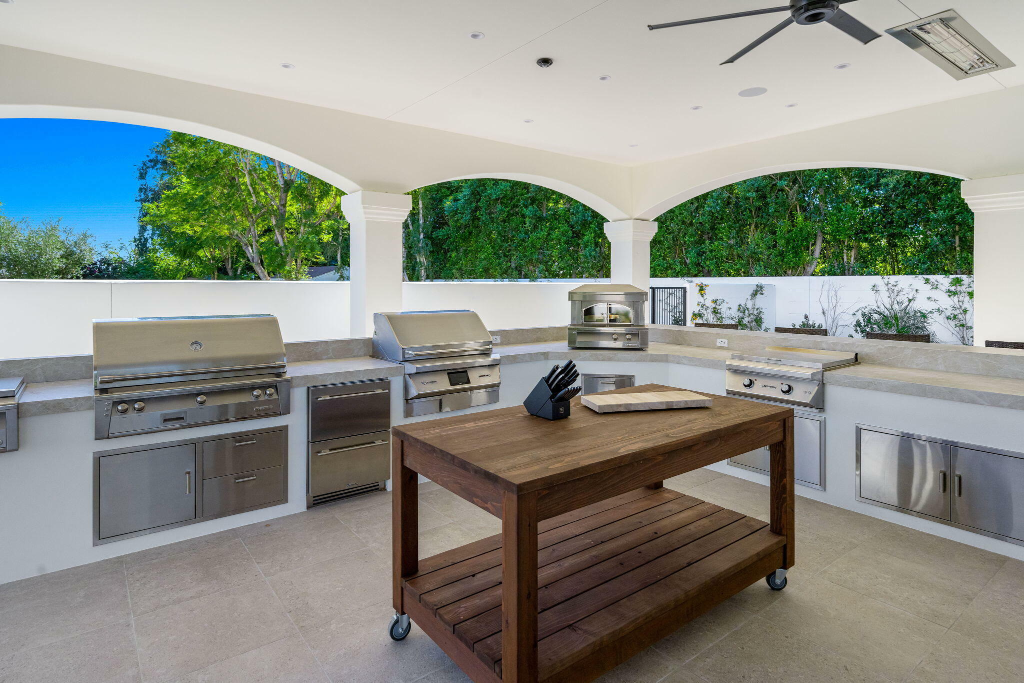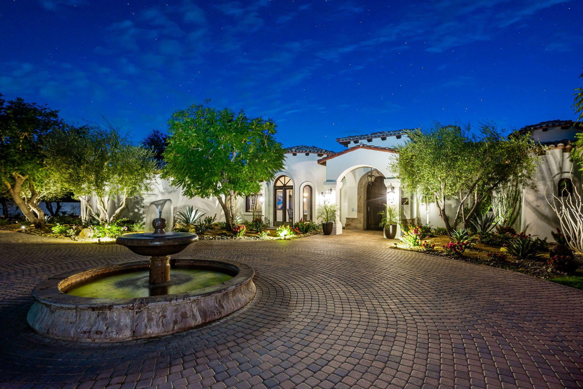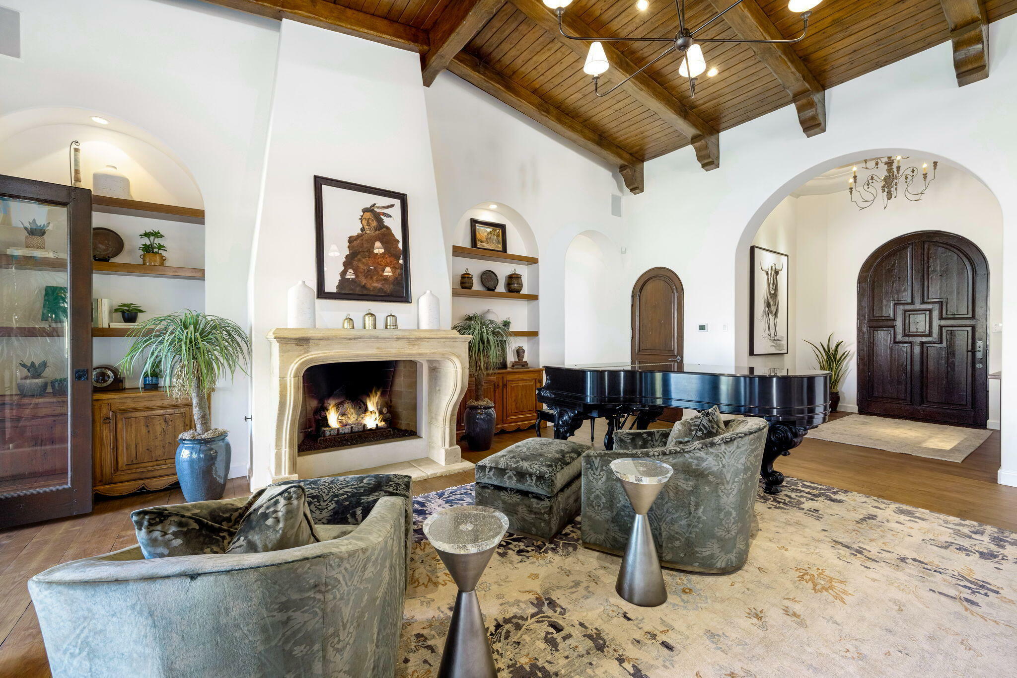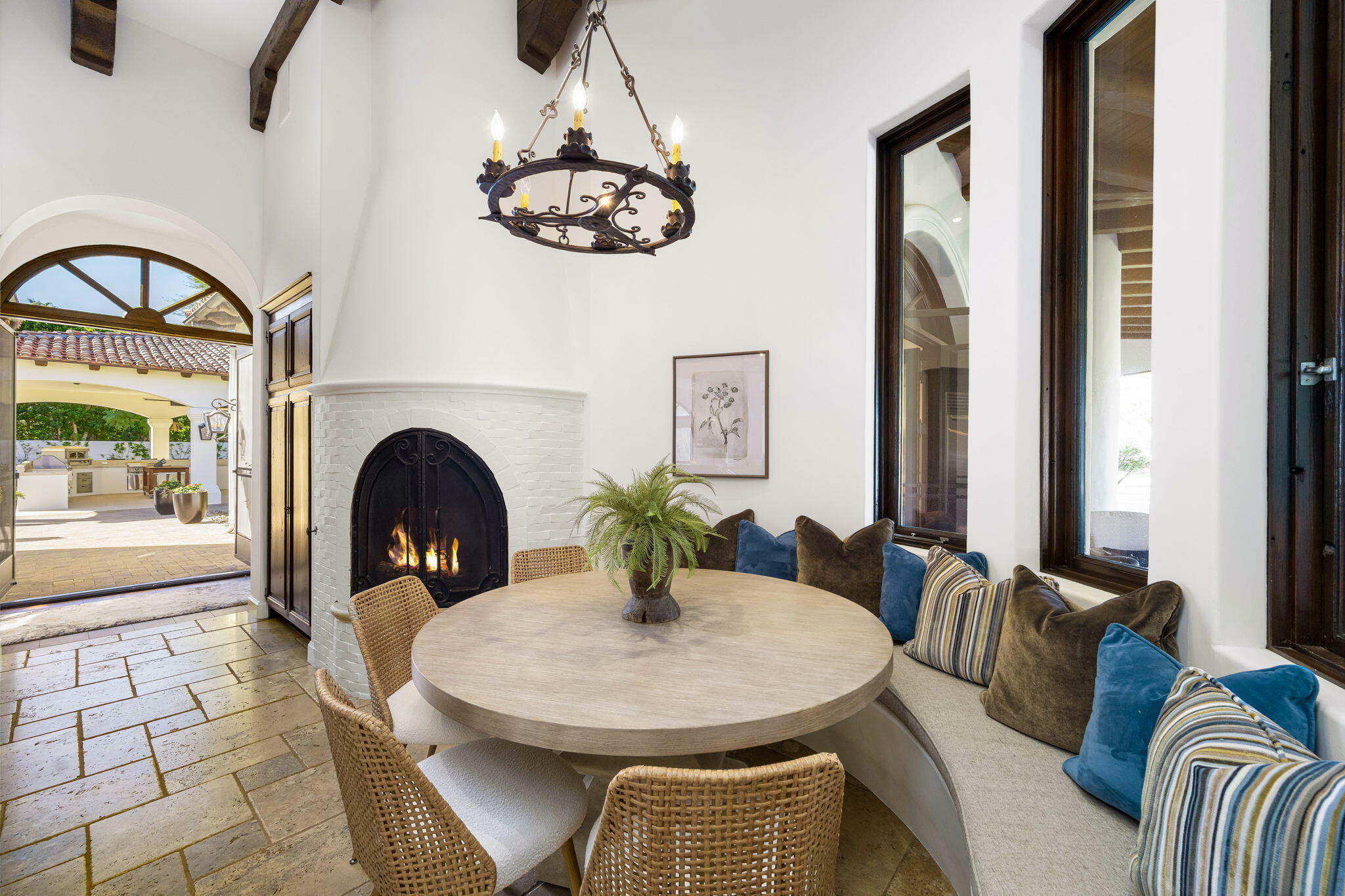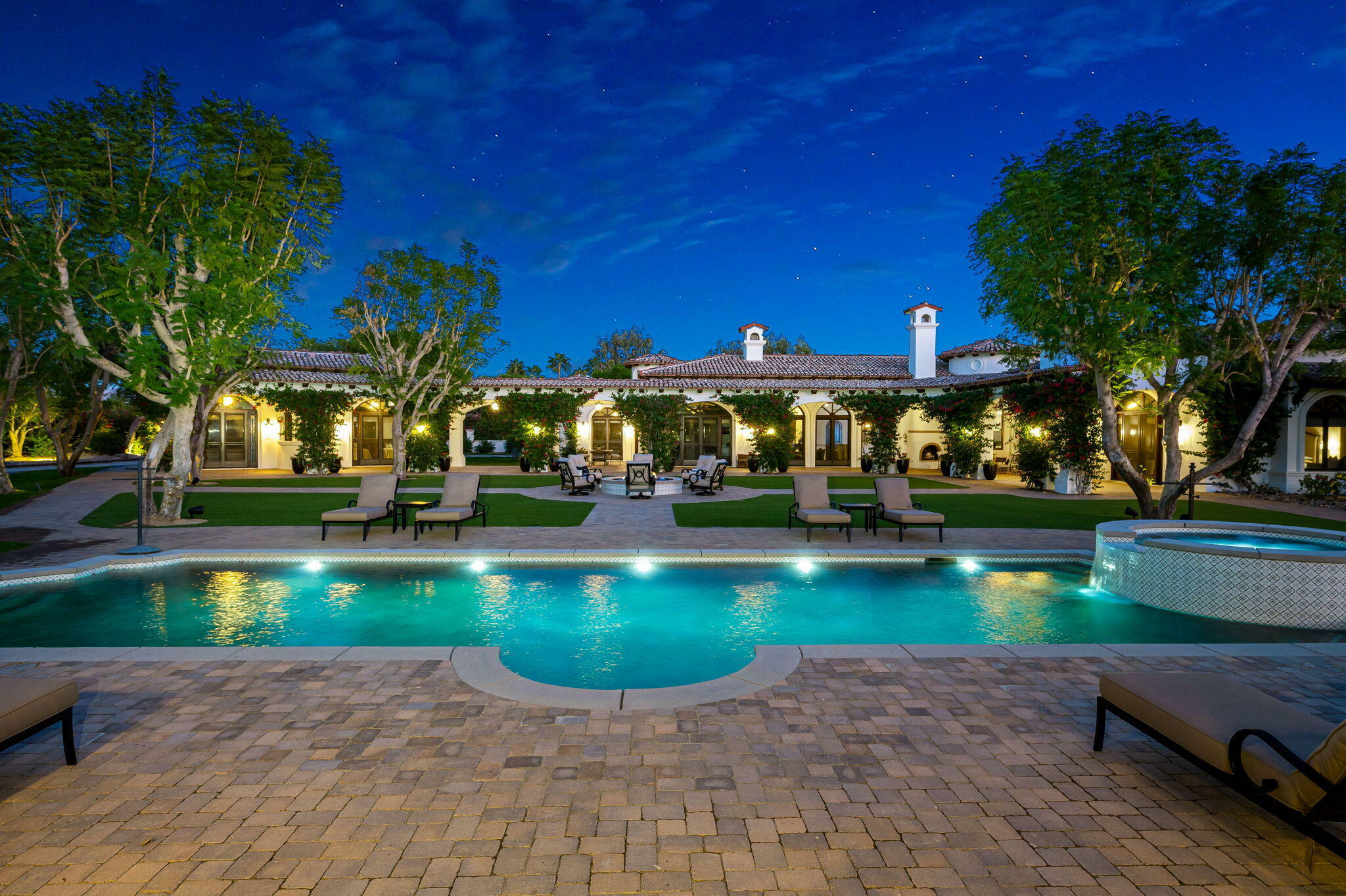 An opportunity to take advantage of rare price improvement in the gated enclave of La Quinta Polo Estates! A luxury estate of uncompromised beauty on over 2 acres and with 7 bedrooms, is a private sanctuary and ones' personal resort with stone walkways, mature palm and citrus trees, bougainvillea, water fountain, swimming pool, spa and firepit, lounge areas and a fireplace. Even a playground for children! The main residence exudes character, with 3 fireplaces, and architecturally designed, interior features such as custom hand hewed beams , doors, windows and floors, built on the site at the time of construction. 4 en-suite bedrooms, each has stately French doors giving access to the loggia and manicured grounds. The heart of the house, the kitchen, connects the living room with the formal dining room and the adjacent walk-in bar for seamless entertaining. A large, private casita can be found at the end of the main residence, with a kitchenette, primary and secondary bedroom, and attached laundry room. Separately, a second guest house resides near an outdoor kitchen and lounge, pool and spa. For gourmet cooks and lovers of entertaining, a custom designed outdoor chef's kitchen pavilion is fully staffed with barbecue, grill, refrigerator, a pizza oven, overhead, built-in heaters, a TV and music, bar seating for 12 and a dining patio for 20 or more. And much, much more. Every possible detail or want has been executed in this impossibly beautiful estate. Numerous major improvements have been completed in 2023 and 2024, a comprehensive list is available upon request. Turnkey Furnished without exception.