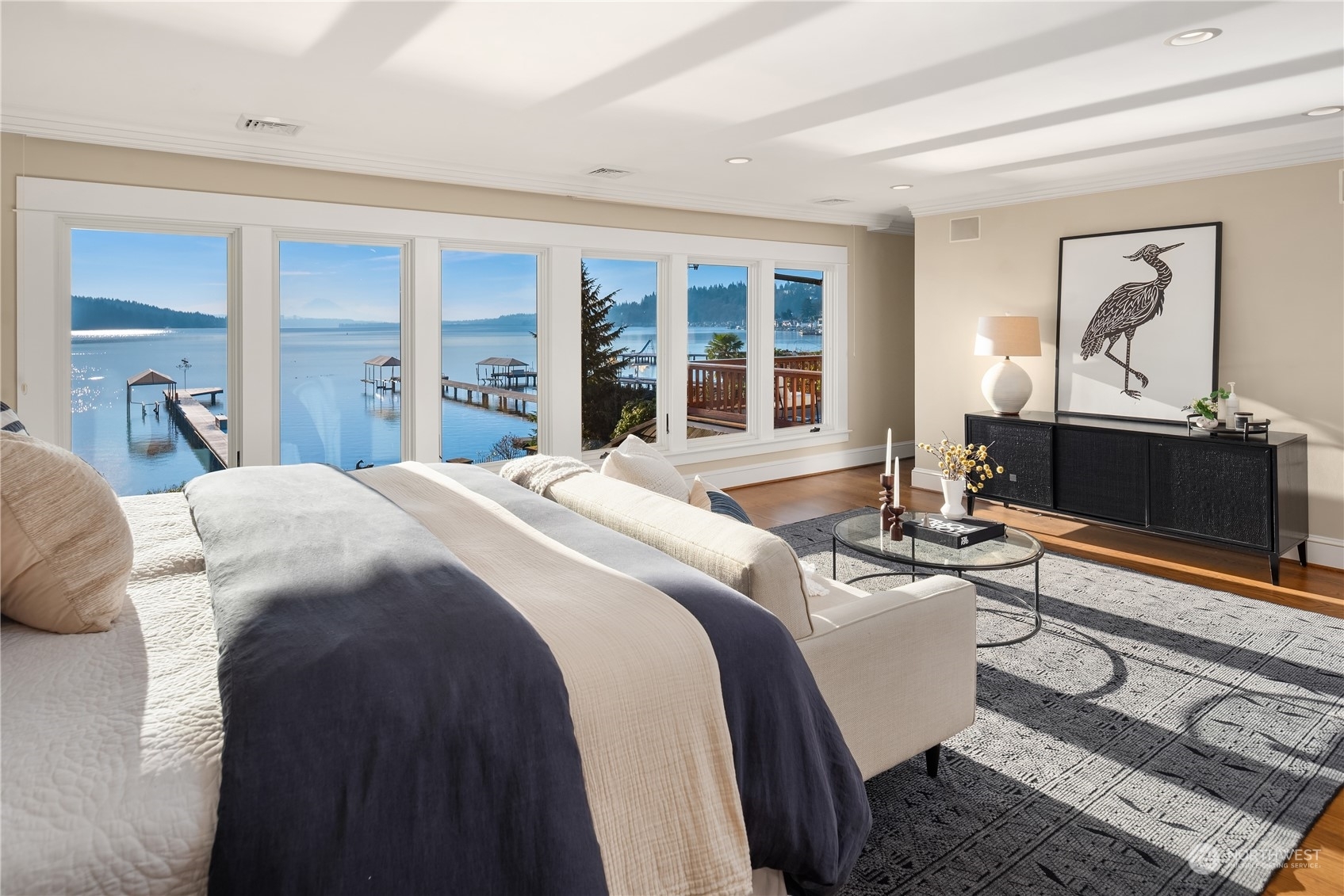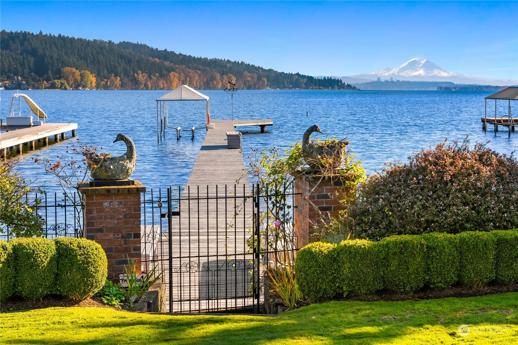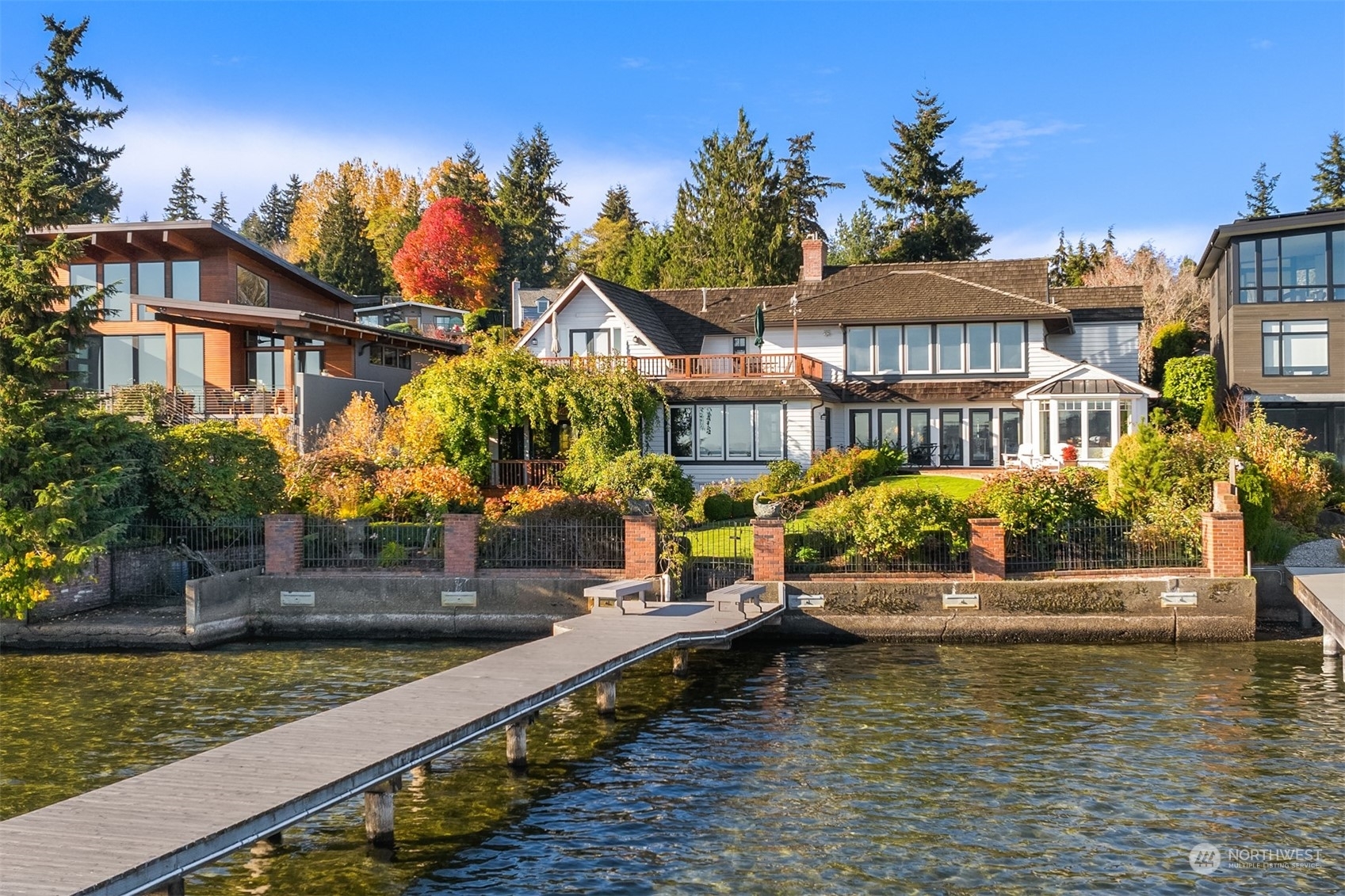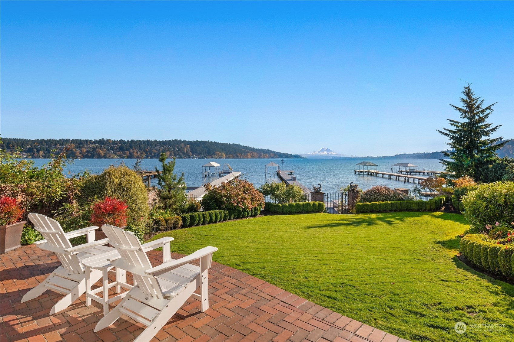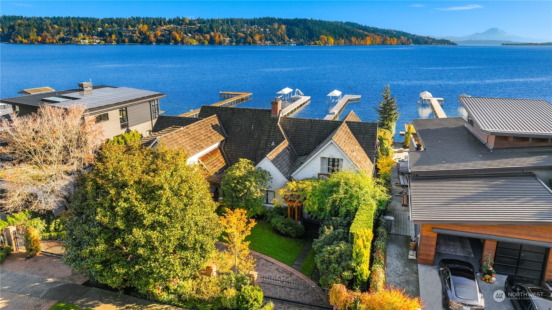 Timeless French charm designed by famous Seattle architect, Paul Thiry. 80 FT of WATERFRONT and private dock. Serene and calming views of Lake Washington, Mt. Rainier, and Cascades. Prepare to be enchanted with classic French architecture, coffered ceilings, detailed millwork and Juliet balconies. Large picture windows capture unobstructed Lake views of the ever-changing PNW seasons. Upstairs breath-taking primary bedroom offers stunning vistas & ample space to retreat. Kitchen and Baths finished in elegant white marble. Huge bonus space, can be a second garage (6 cars), a Home Gym, a Rec Room or an event space! Fully gated property with beautifully landscaped grounds, on sought after Shore drive, nestled in the community of Sheridan Beach.