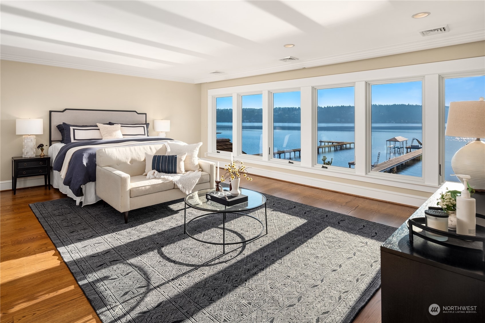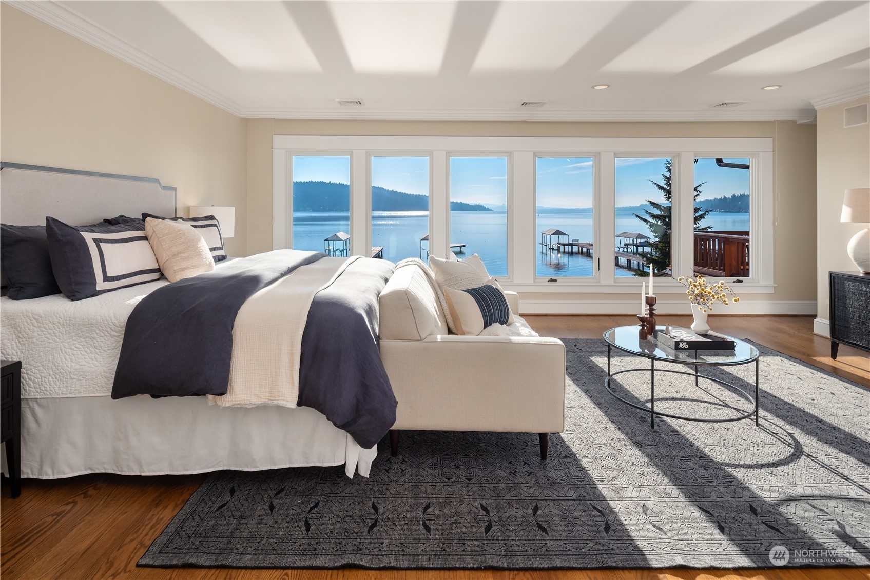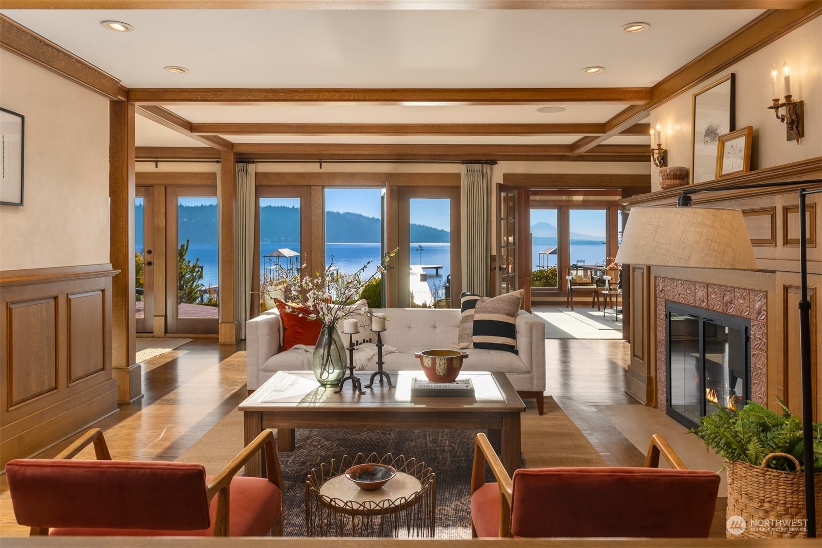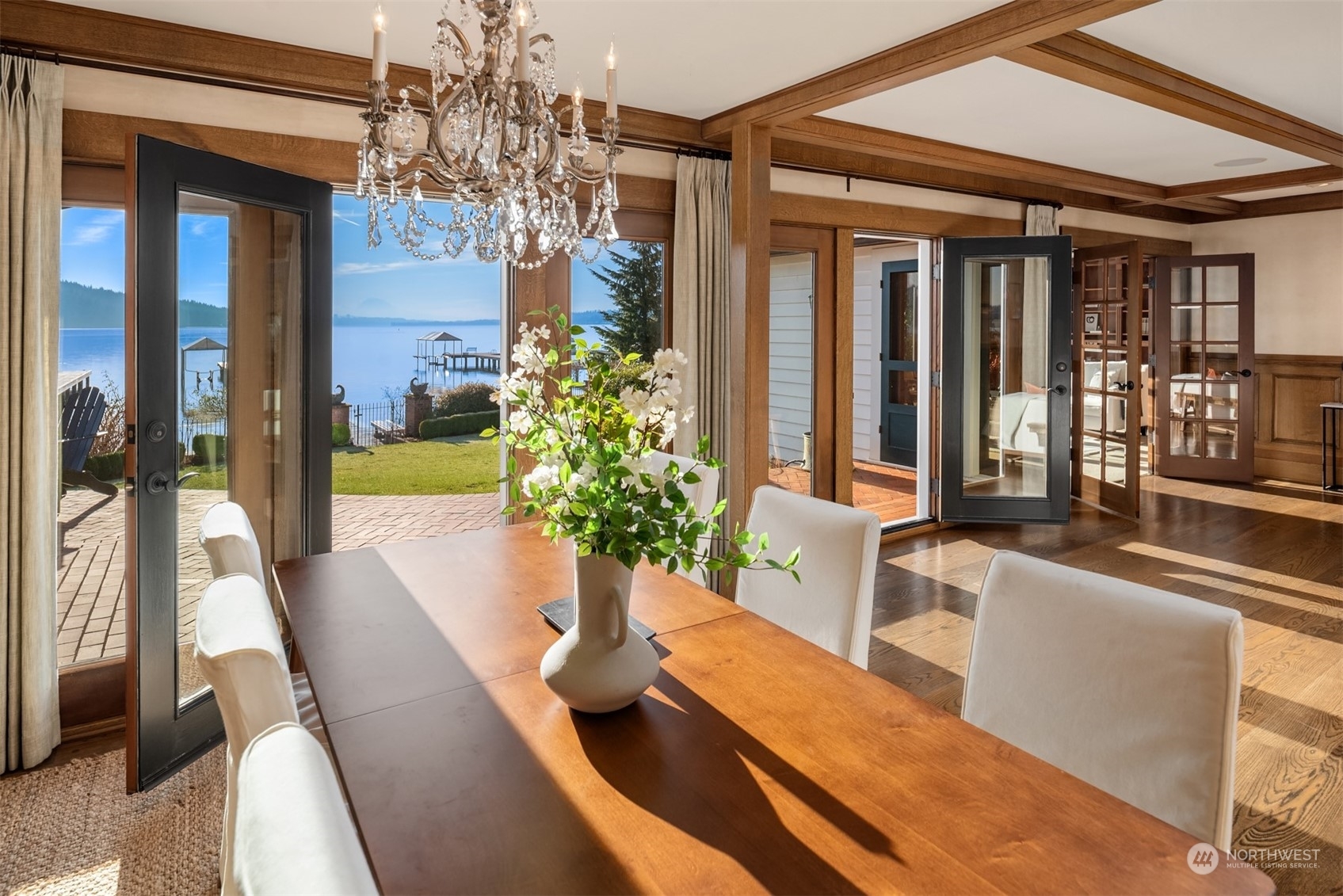 Timeless French charm designed by famous Seattle architect, Paul Thiry. 80 FT of WATERFRONT and private dock. Serene and calming views of Lake Washington, Mt. Rainier, and Cascades. Prepare to be enchanted with classic French architecture, coffered ceilings, detailed millwork and Juliet balconies. Large picture windows capture unobstructed Lake views of the ever-changing PNW seasons. Upstairs breath-taking primary bedroom offers stunning vistas & ample space to retreat. Kitchen and Baths finished in elegant white marble. Huge bonus space, can be a second garage (6 cars), a Home Gym, a Rec Room or an event space! Fully gated property with beautifully landscaped grounds, on sought after Shore drive, nestled in the community of Sheridan Beach.