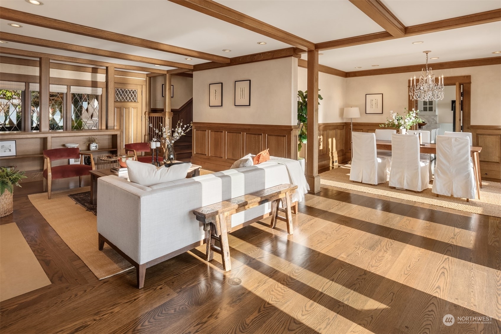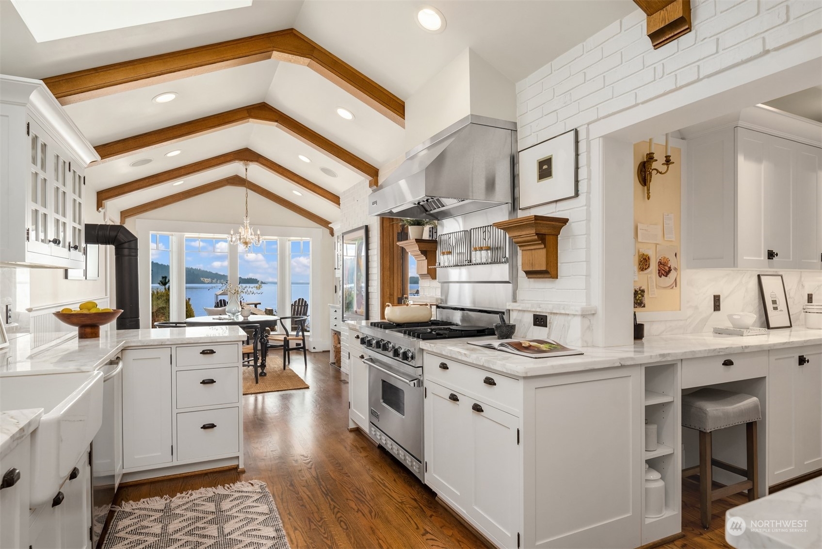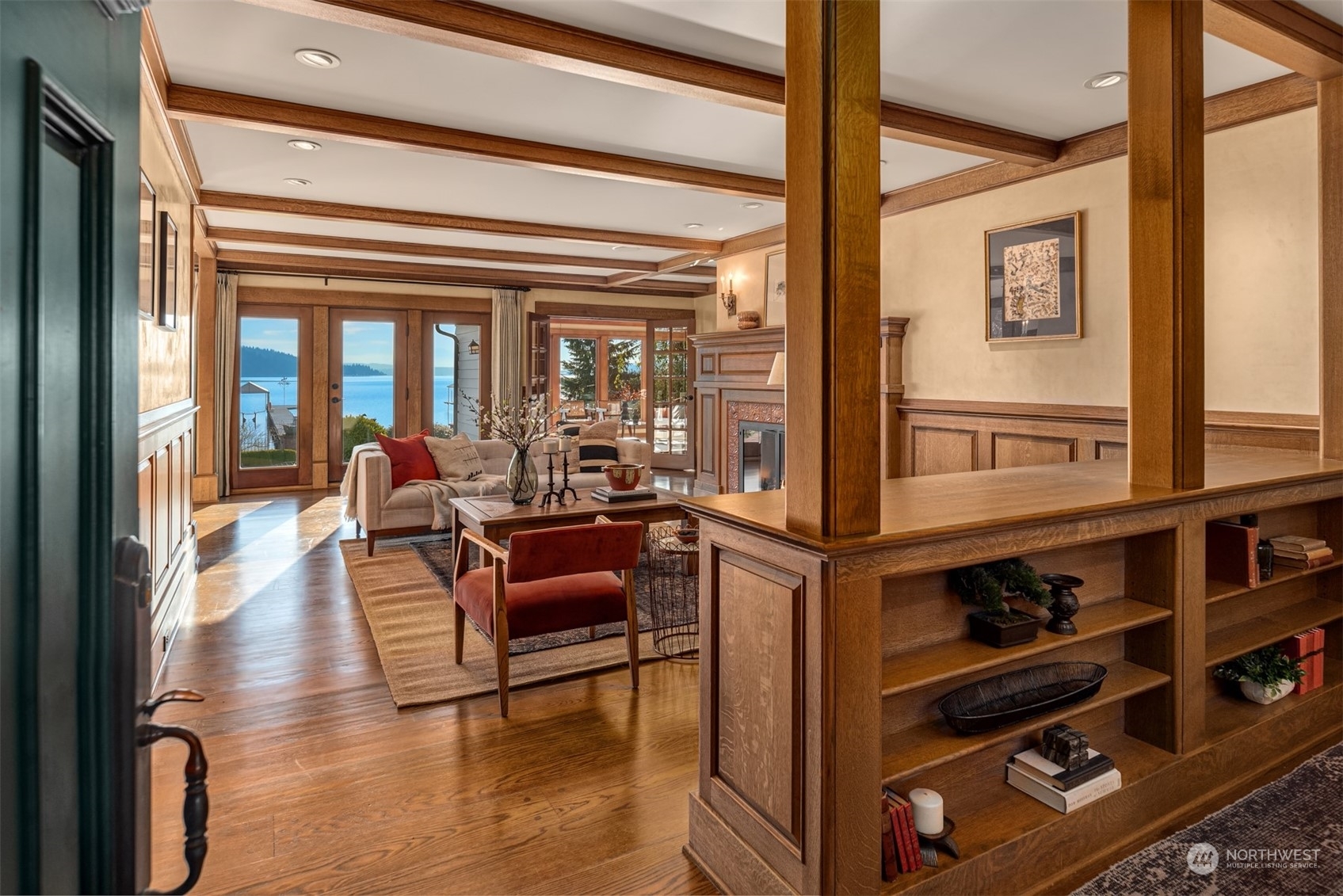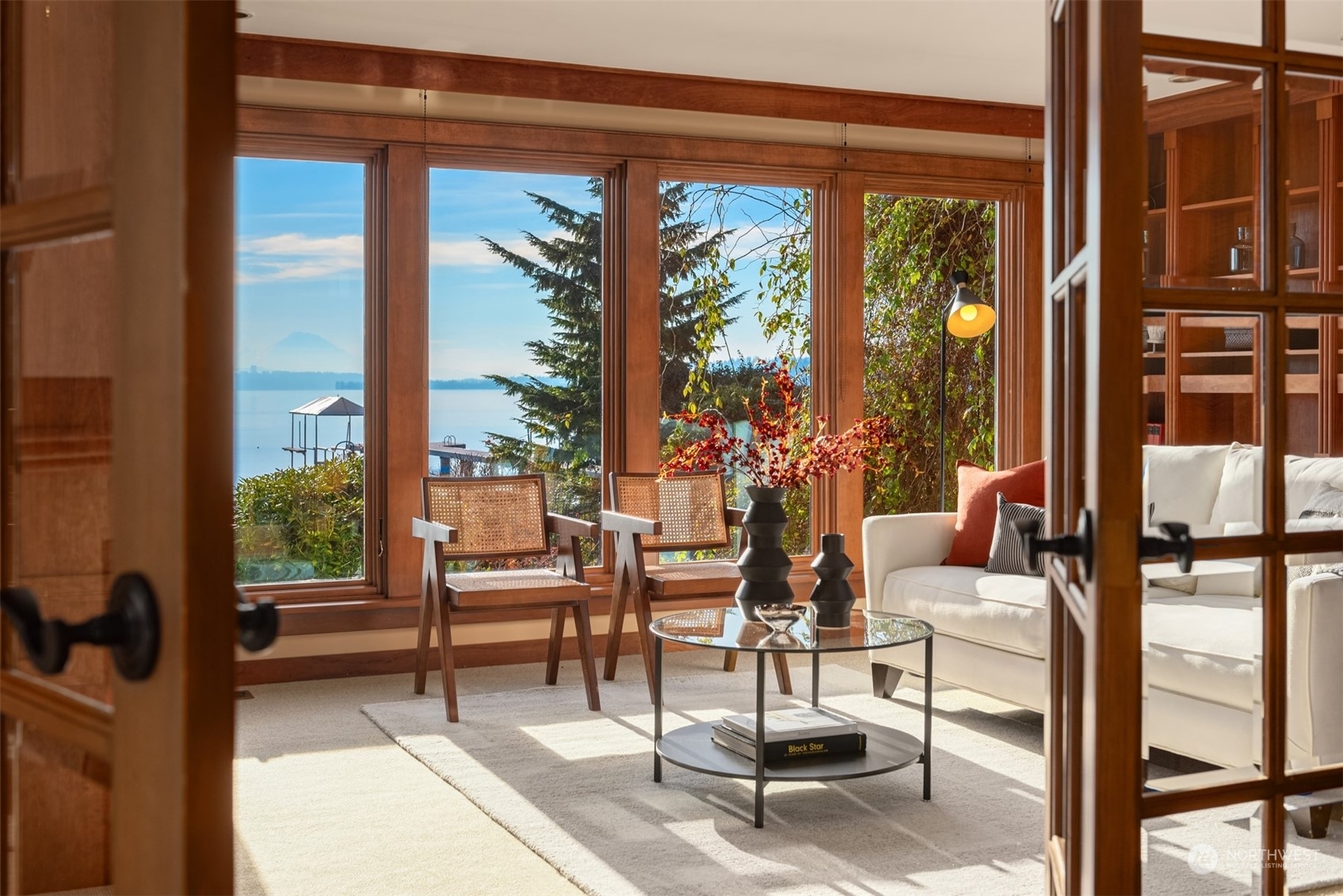 Timeless French charm designed by famous Seattle architect, Paul Thiry. 80 FT of WATERFRONT and private dock. Serene and calming views of Lake Washington, Mt. Rainier, and Cascades. Prepare to be enchanted with classic French architecture, coffered ceilings, detailed millwork and Juliet balconies. Large picture windows capture unobstructed Lake views of the ever-changing PNW seasons. Upstairs breath-taking primary bedroom offers stunning vistas & ample space to retreat. Kitchen and Baths finished in elegant white marble. Huge bonus space, can be a second garage (6 cars), a Home Gym, a Rec Room or an event space! Fully gated property with beautifully landscaped grounds, on sought after Shore drive, nestled in the community of Sheridan Beach.