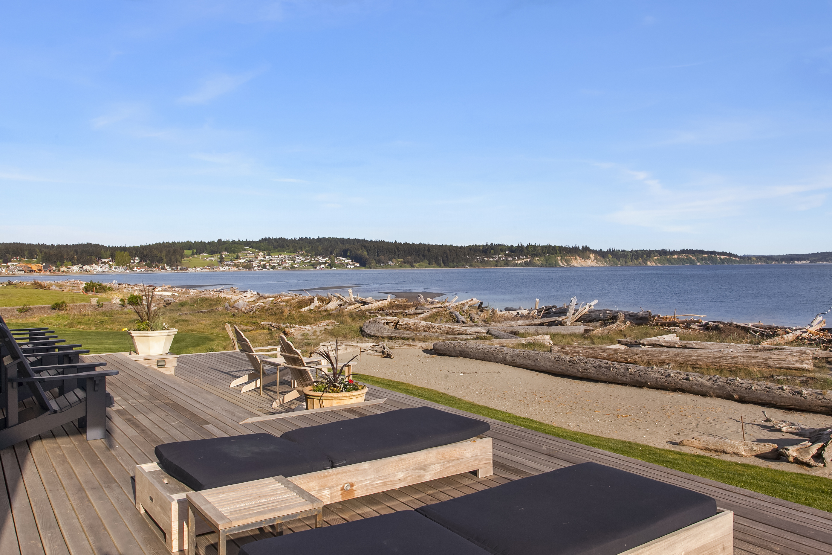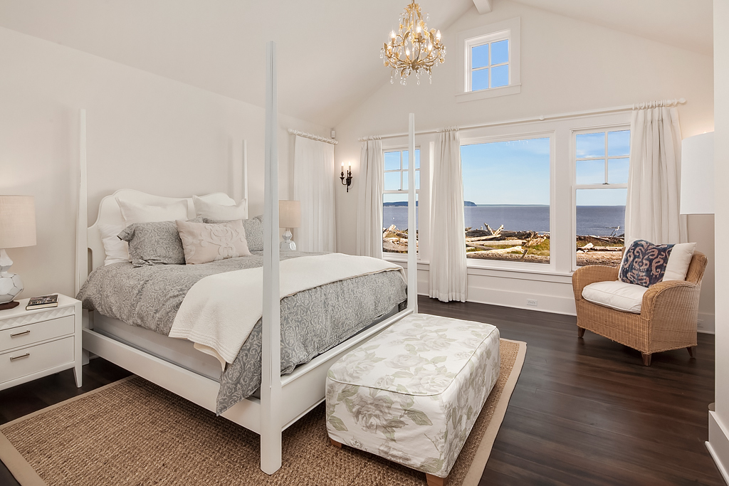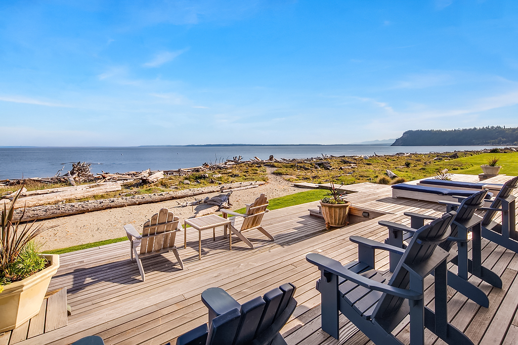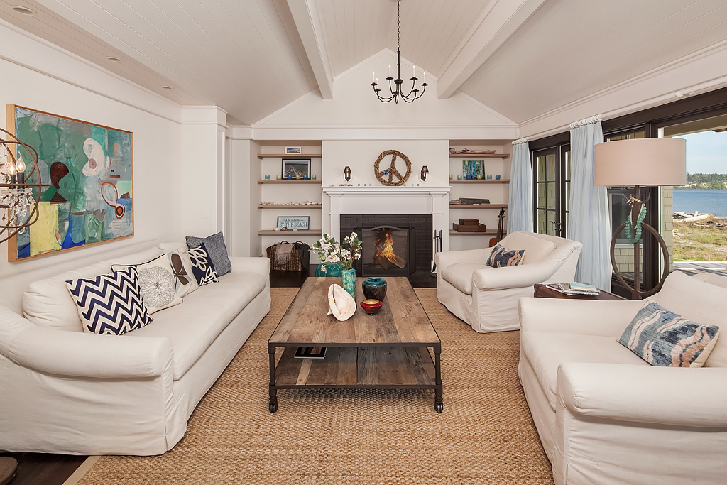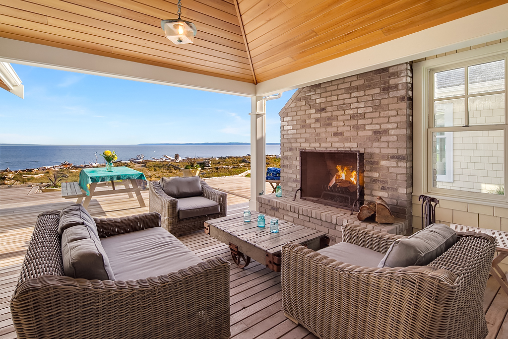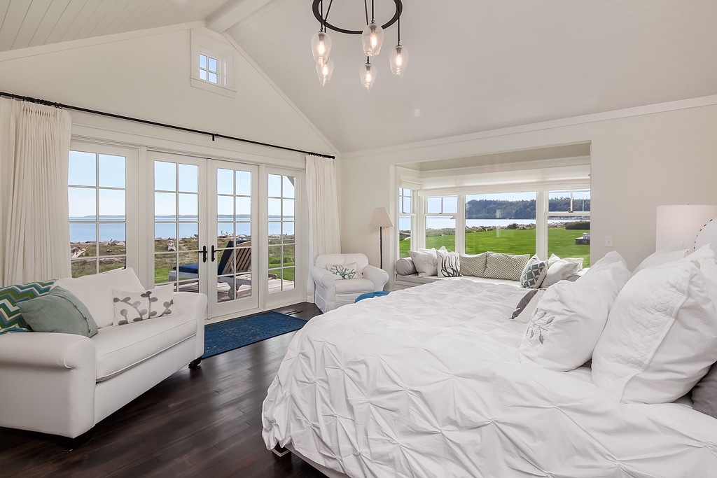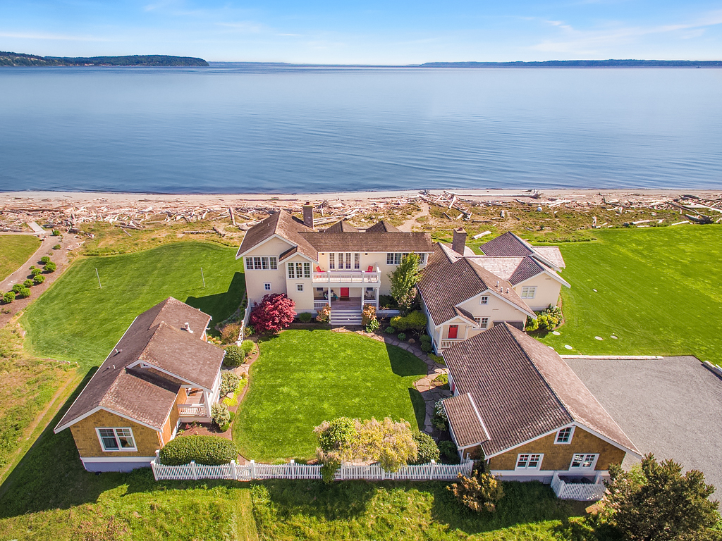 Here on a desirable and rare 14.7 +/- acres of south-facing no-bank waterfront and 225+/- ft of sandy beach, is an idyllic compound arranged to accommodate a romantic weekend for two or a much larger gathering. The master suite opens up to the beach-side veranda which accesses a spa and outdoor room complete with wood burning fireplace. Your guests will enjoy a delightful 774 +/- sq ft private guest cottage while others gather in an 894 +/- sq ft garage, game room and loft bunkhouse.