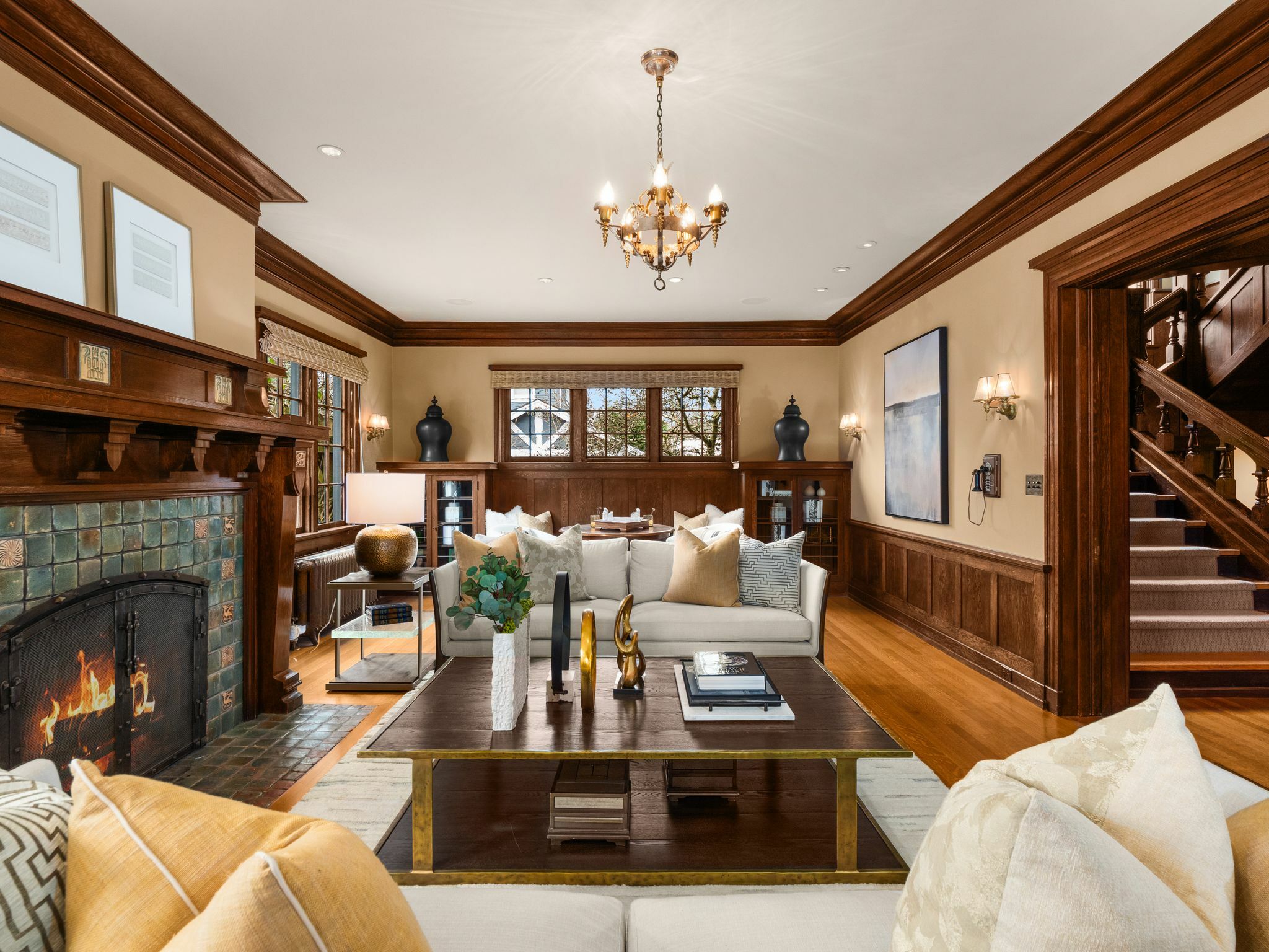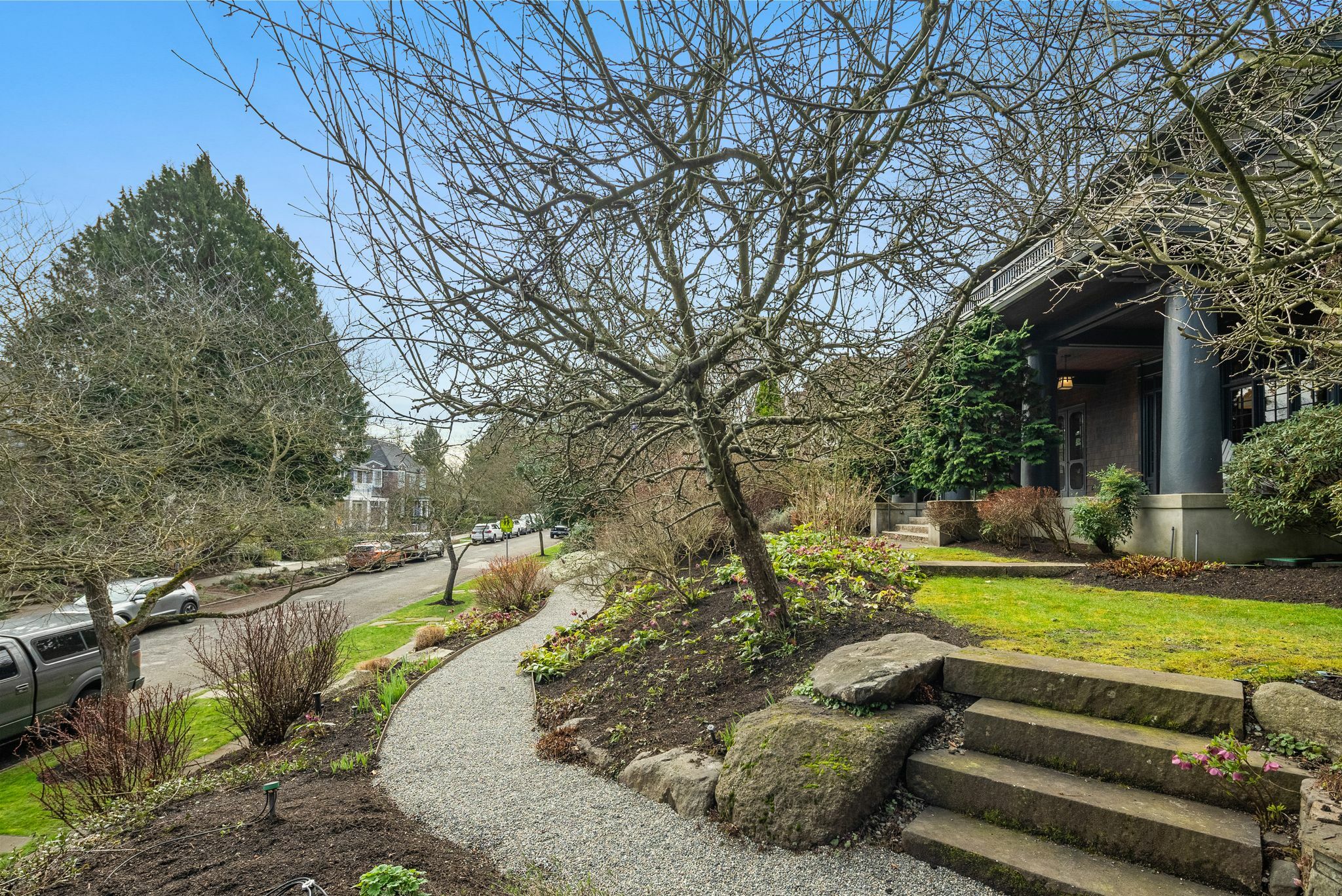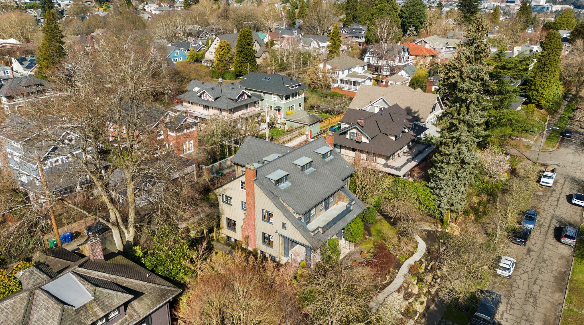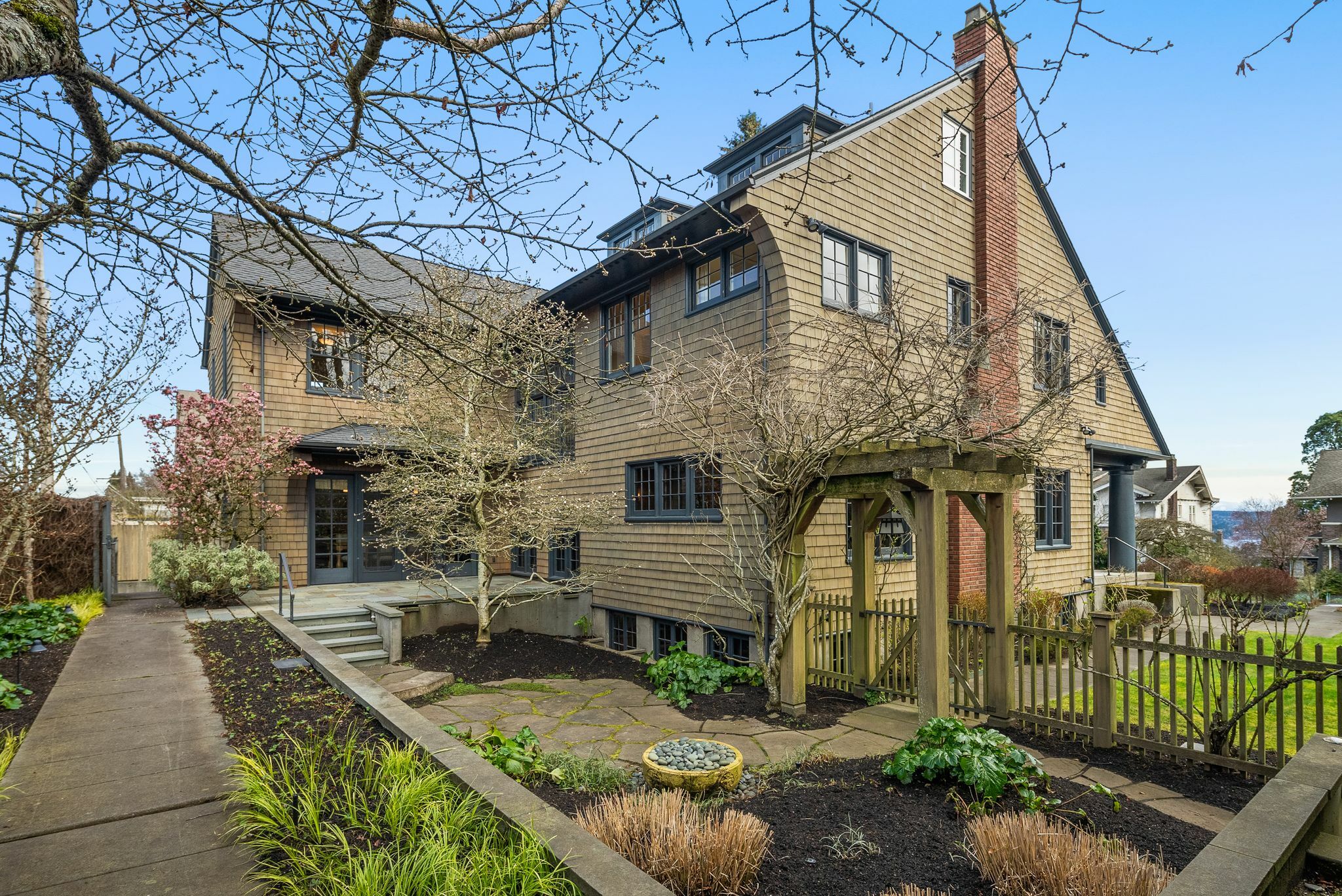 Exceptional 1909 craftsman home is a rare blend of exquisite period detail and modern convenience. Excellently preserved, this architecturally significant home proudly sits on a double lot above the street affording privacy, abundant natural light and views of Lake Washington and the Cascades. Built for a timber baron by Schack & Huntington, the house extols quality, with original wood paneling, hardwood floors, Quezal Art glass chandeliers, large windows and amenities that assure a comfortable lifestyle. Re-wired and re-plumbed in 2002. 2 car garage with 2 Tesla chargers and a 3rd parking spot. Beautiful and abundant gardens and private spaces. Excellent floorplan and grand original details, this classic home has stood the test of time!