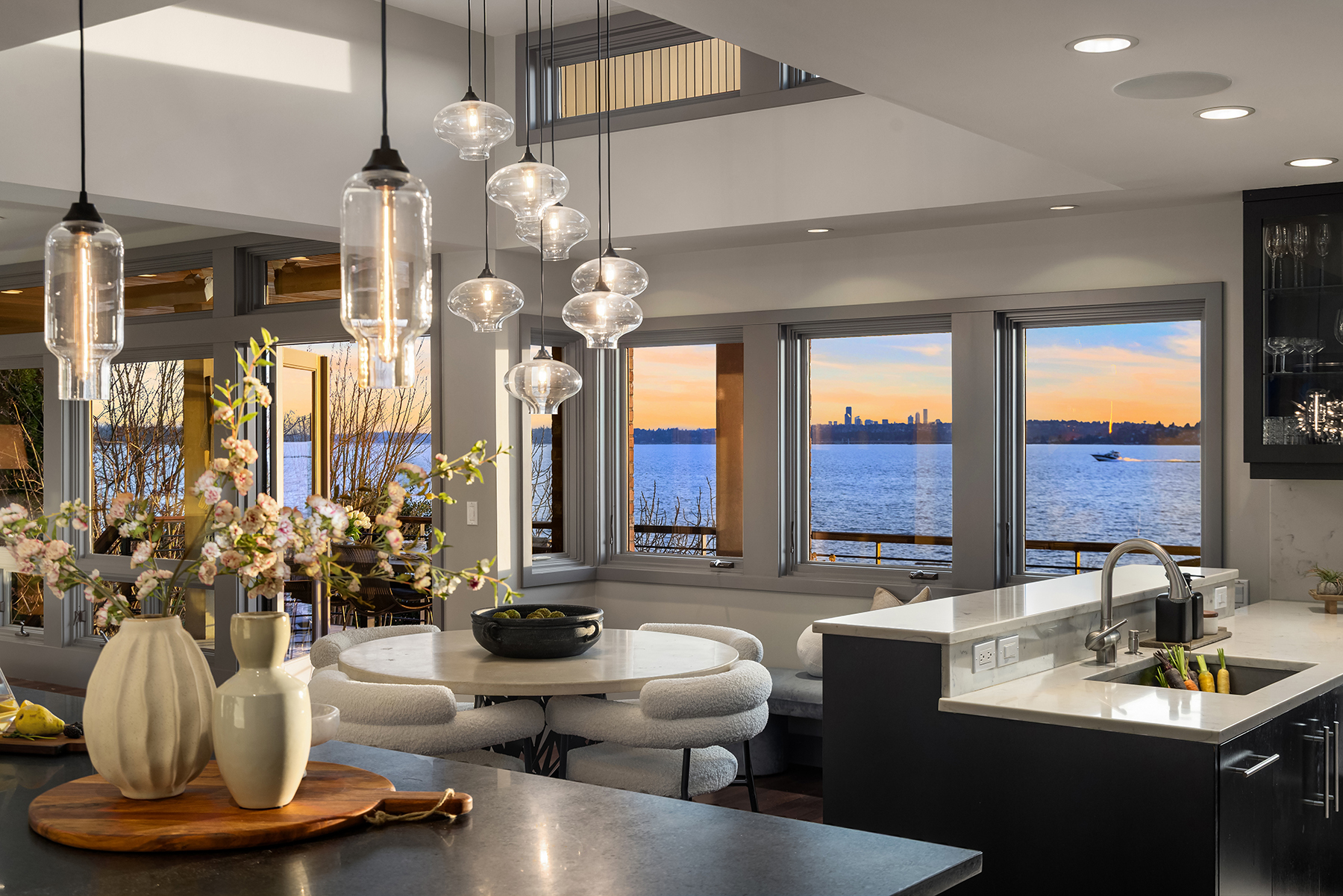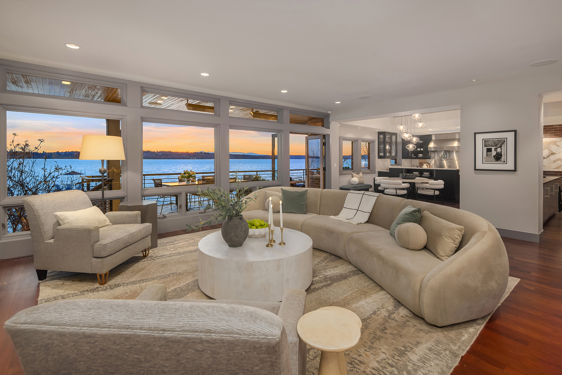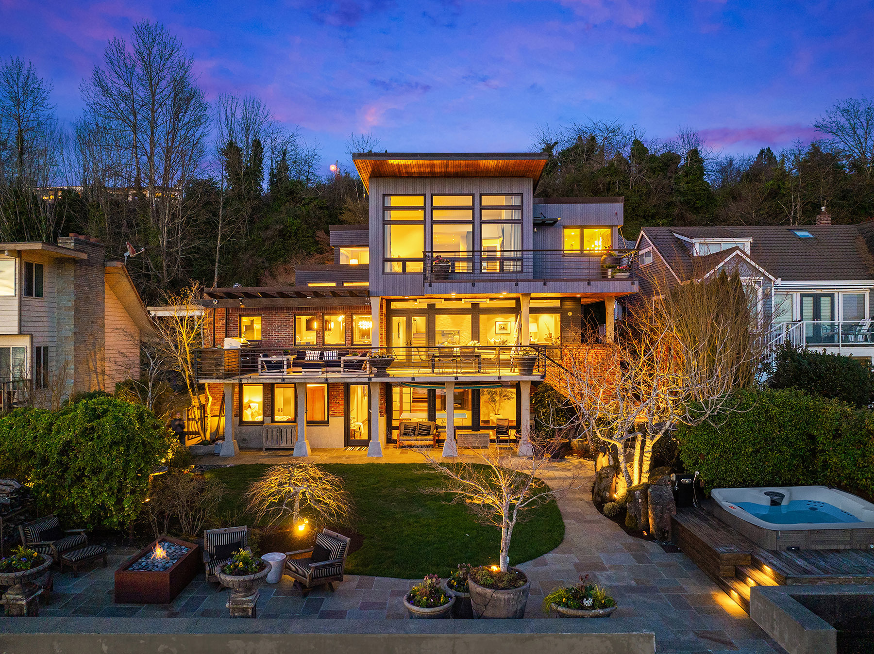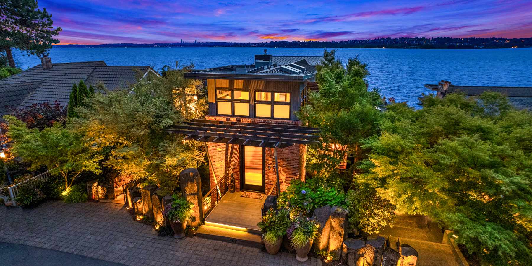Lakeside serenity & modern sophistication! Designed by Thielsen Architects, this Lake WA wtf estate, off West of Market’s gold coast, is a NW industrial modern hm w/views of Seattle, Olympic Mtns & Lake WA. 6550 SF built w/concrete & structural steel. The 5539 SF main home incls open-concept living, 4 BR 3.5 BA, a chef’s kitchen w/caterer’s wing, primary suite & spa-like BA, rec room, guest suite & kitchenette, multiple view decks & int/ext entertaining areas, incl lakeside patio w/pizza oven - perfect for summer gatherings! Det 2 BR 2 BA, 1011 SF guest home w/cathedral ceilings, wall of windows & rooftop deck. A 4-car garage, new dock & priv upper garden w/fruit trees & raised beds all of which make this an unparalleled waterfront retreat.