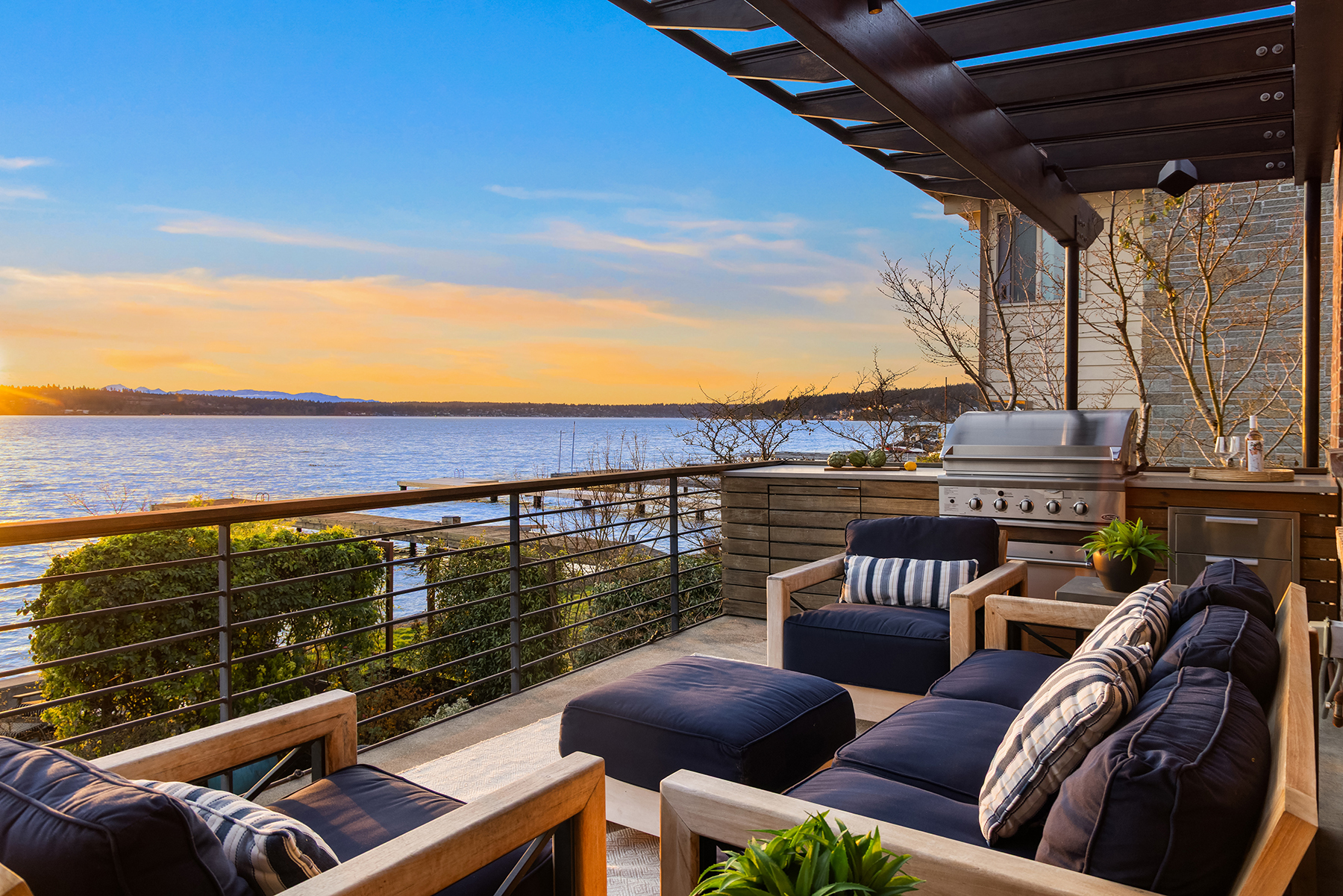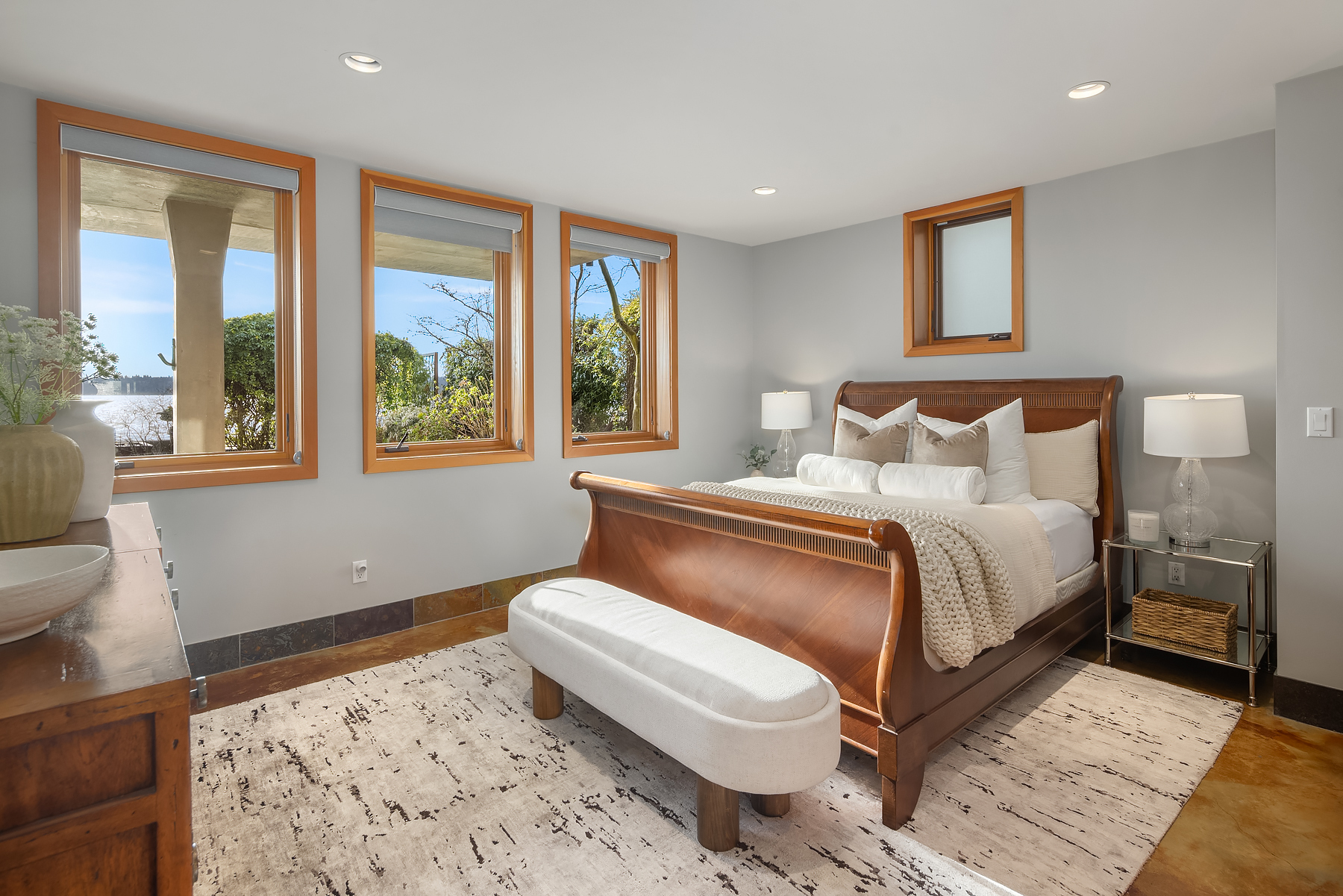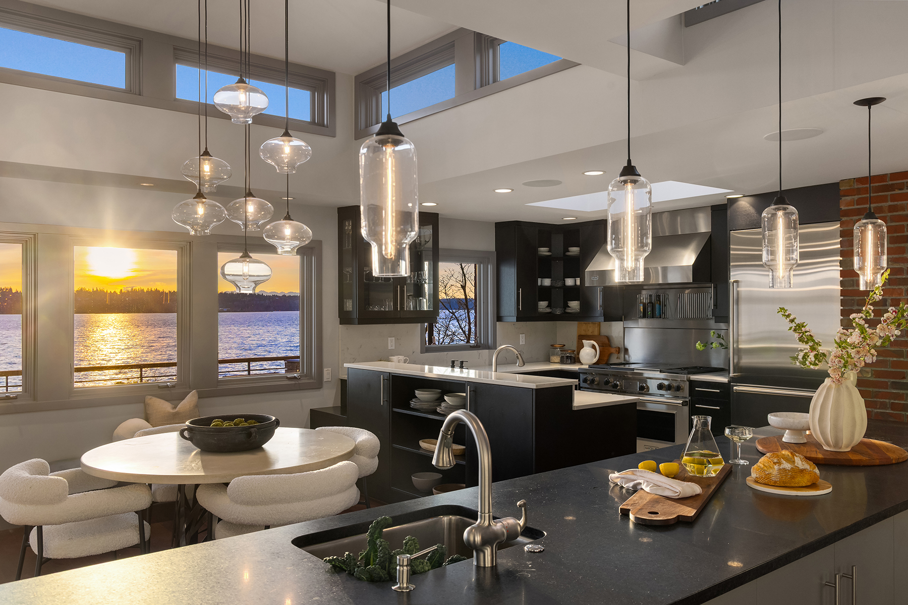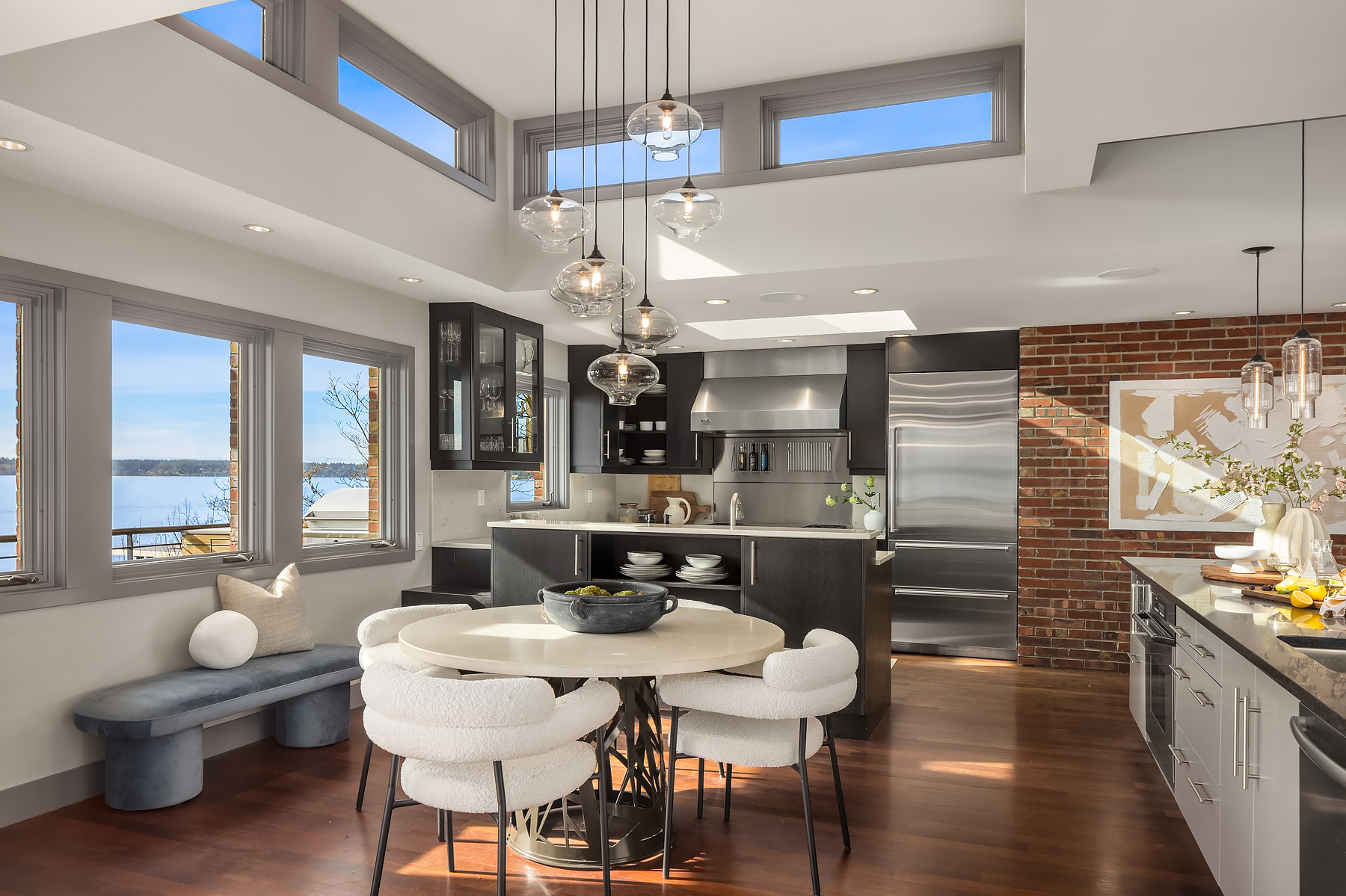 Lakeside serenity & modern sophistication! Designed by Thielsen Architects, this Lake WA wtf estate, off West of Market’s gold coast, is a NW industrial modern hm w/views of Seattle, Olympic Mtns & Lake WA. 6550 SF built w/concrete & structural steel. The 5539 SF main home incls open-concept living, 4 BR 3.5 BA, a chef’s kitchen w/caterer’s wing, primary suite & spa-like BA, rec room, guest suite & kitchenette, multiple view decks & int/ext entertaining areas, incl lakeside patio w/pizza oven - perfect for summer gatherings! Det 2 BR 2 BA, 1011 SF guest home w/cathedral ceilings, wall of windows & rooftop deck. A 4-car garage, new dock & priv upper garden w/fruit trees & raised beds all of which make this an unparalleled waterfront retreat.