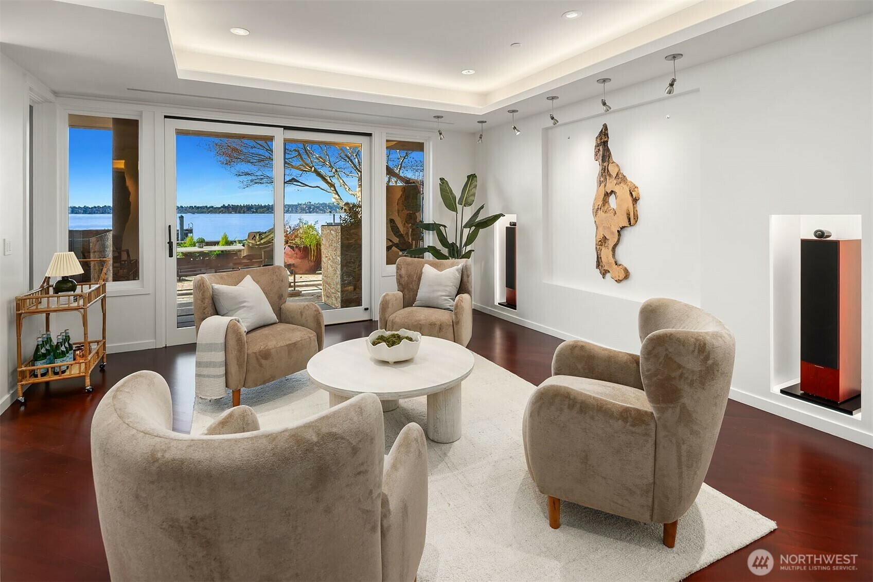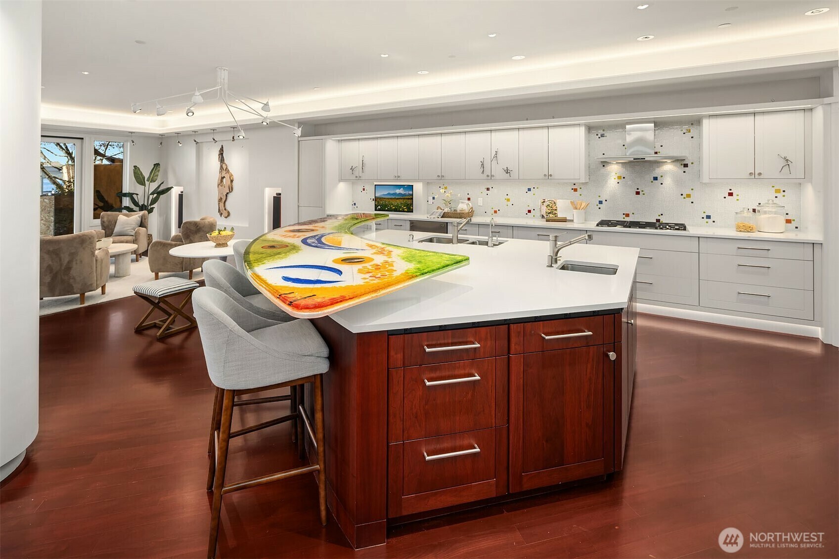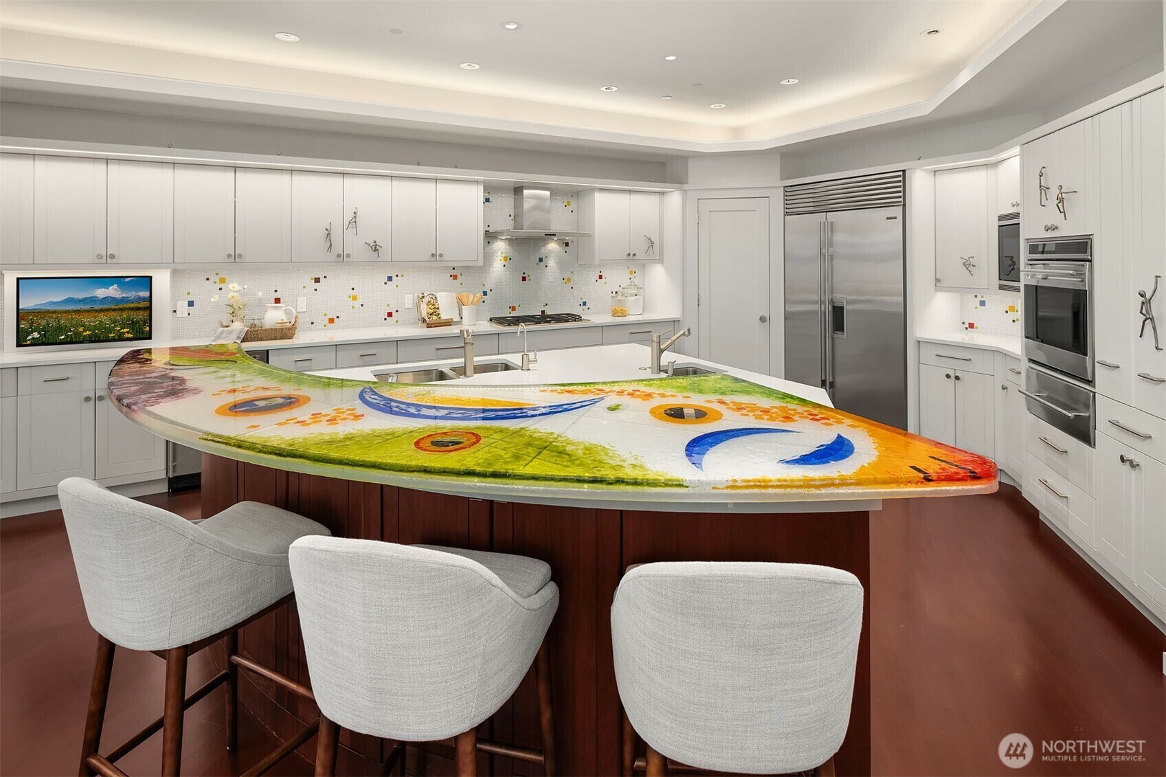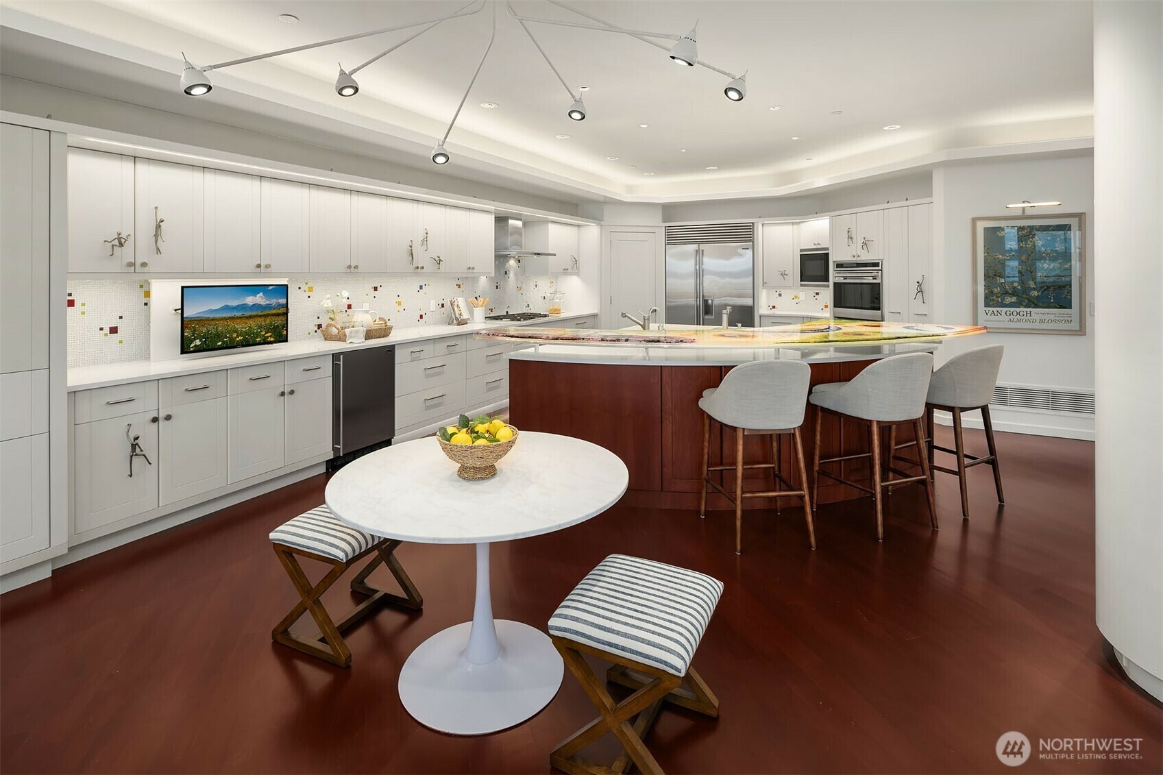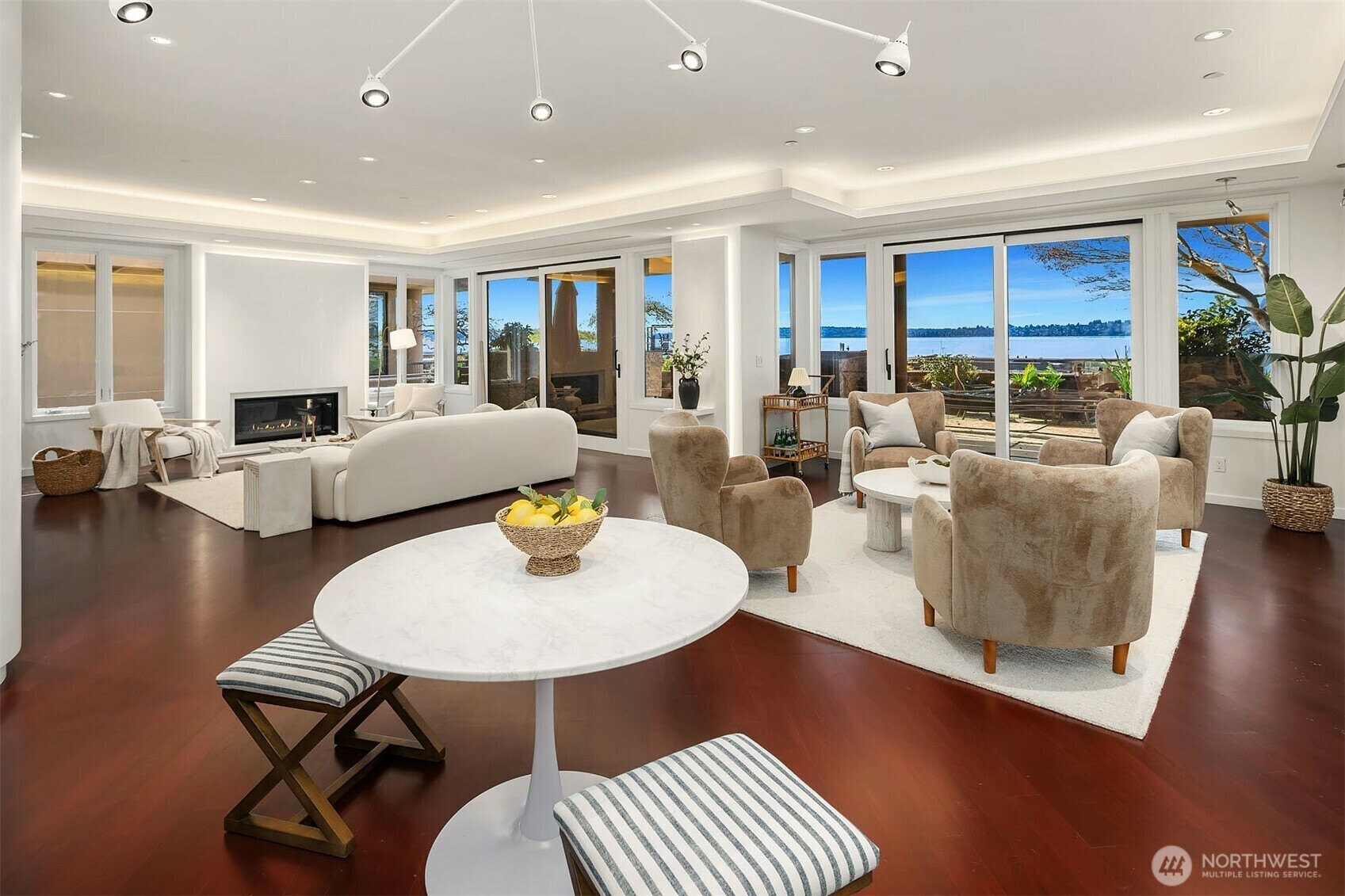Waters Edge is a Premier Luxury Community on the shores of LK Wash w/ 280' of community shoreline. One of only a few concrete & steel buildings in Kirkland. $700K remodel of main living space was inspired by one of the pioneers of abstraction in Western Art, Russian painter/ theorist Wassily Kandinsky and designer Kay Stewart. Underlit glass counter created by Glassworks of Seattle. Open floorpan to maximize entertainment spaces and sweeping lake, city & mtn views. End unit, walls of windows and high ceilings. Lakeside patio. Deeded moorage w/10,000 lb boat lift. Unit opens directly into the your parking spaces for total convenience with an electric charger. Minutes to all DT Kirkland has to enjoy- shopping, dining, parks and so much more.