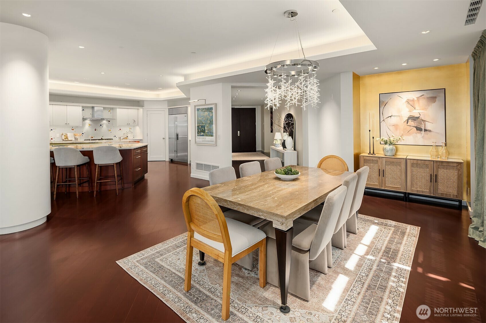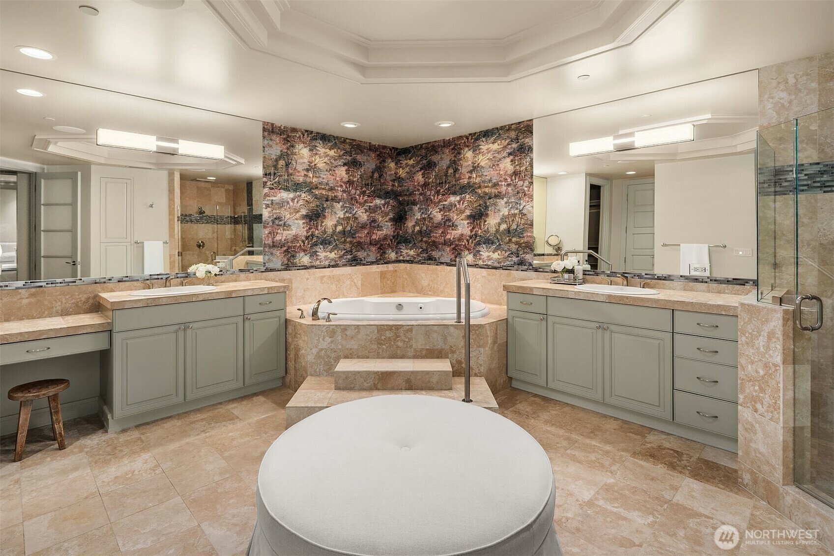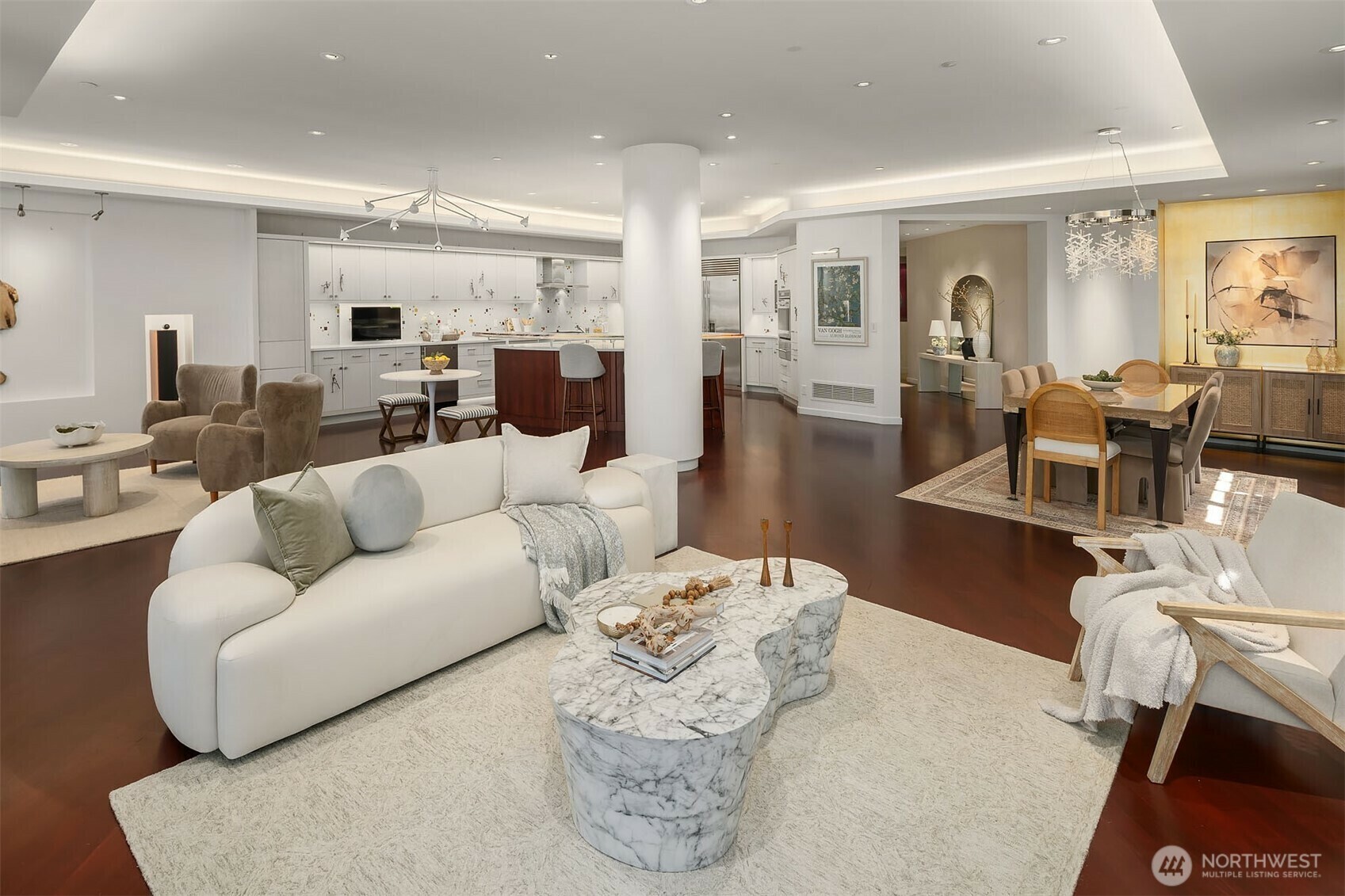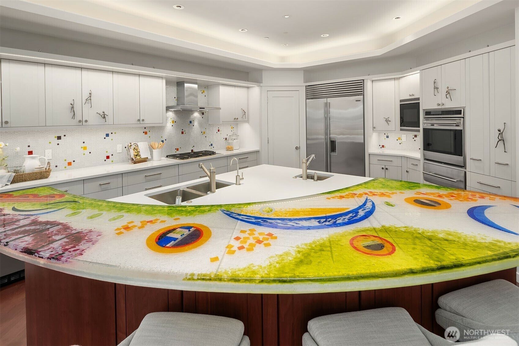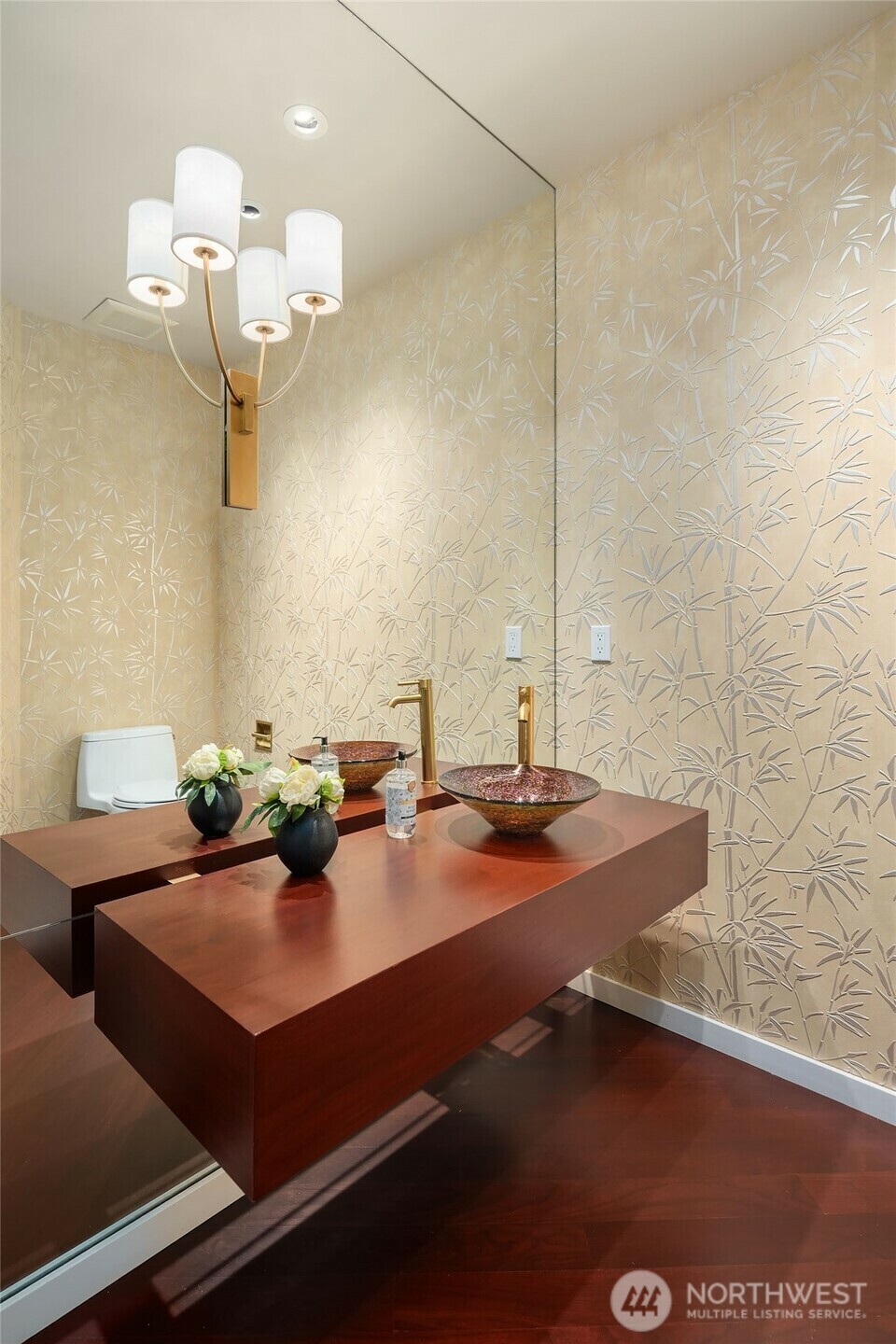 Waters Edge is a Premier Luxury Community on the shores of LK Wash w/ 280' of community shoreline. One of only a few concrete & steel buildings in Kirkland. $700K remodel of main living space was inspired by one of the pioneers of abstraction in Western Art, Russian painter/ theorist Wassily Kandinsky and designer Kay Stewart. Underlit glass counter created by Glassworks of Seattle. Open floorpan to maximize entertainment spaces and sweeping lake, city & mtn views. End unit, walls of windows and high ceilings. Lakeside patio. Deeded moorage w/10,000 lb boat lift. Unit opens directly into the your parking spaces for total convenience with an electric charger. Minutes to all DT Kirkland has to enjoy- shopping, dining, parks and so much more.