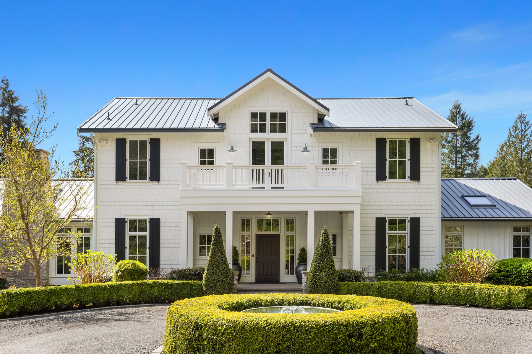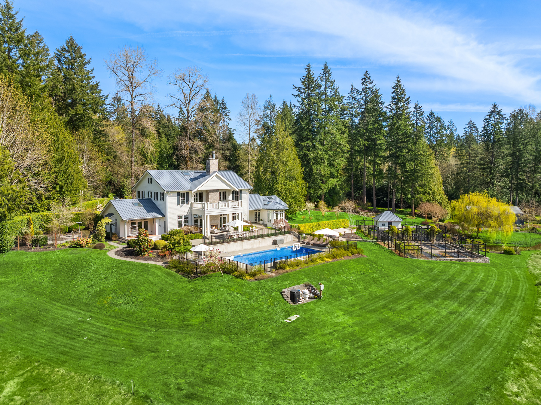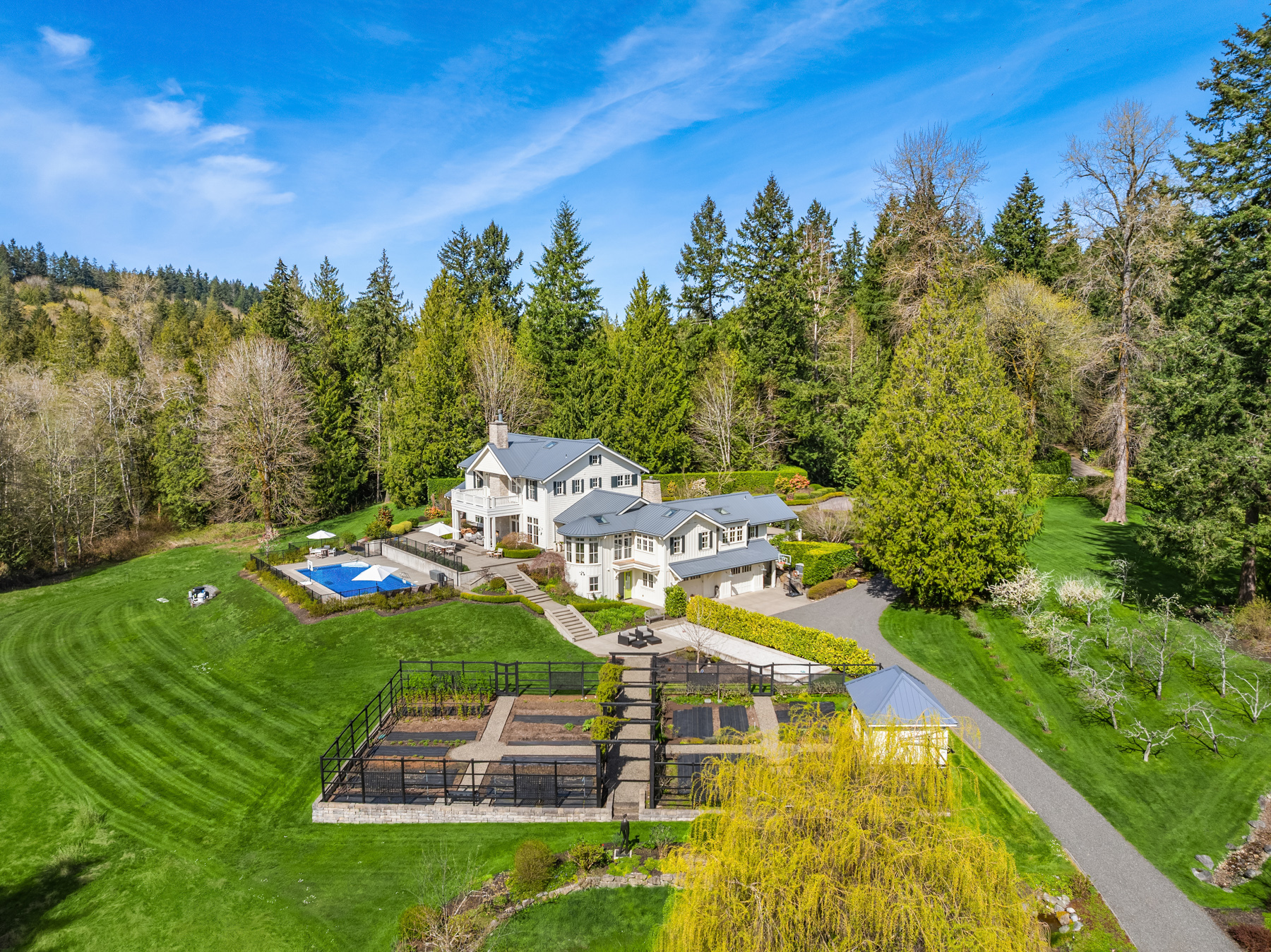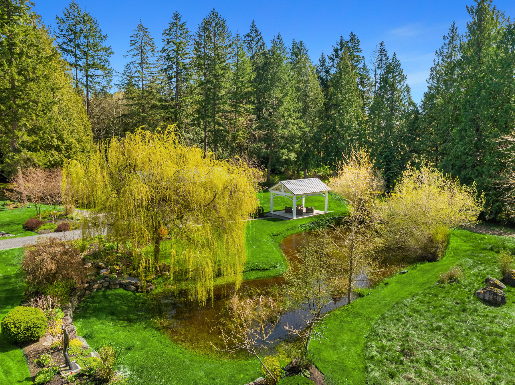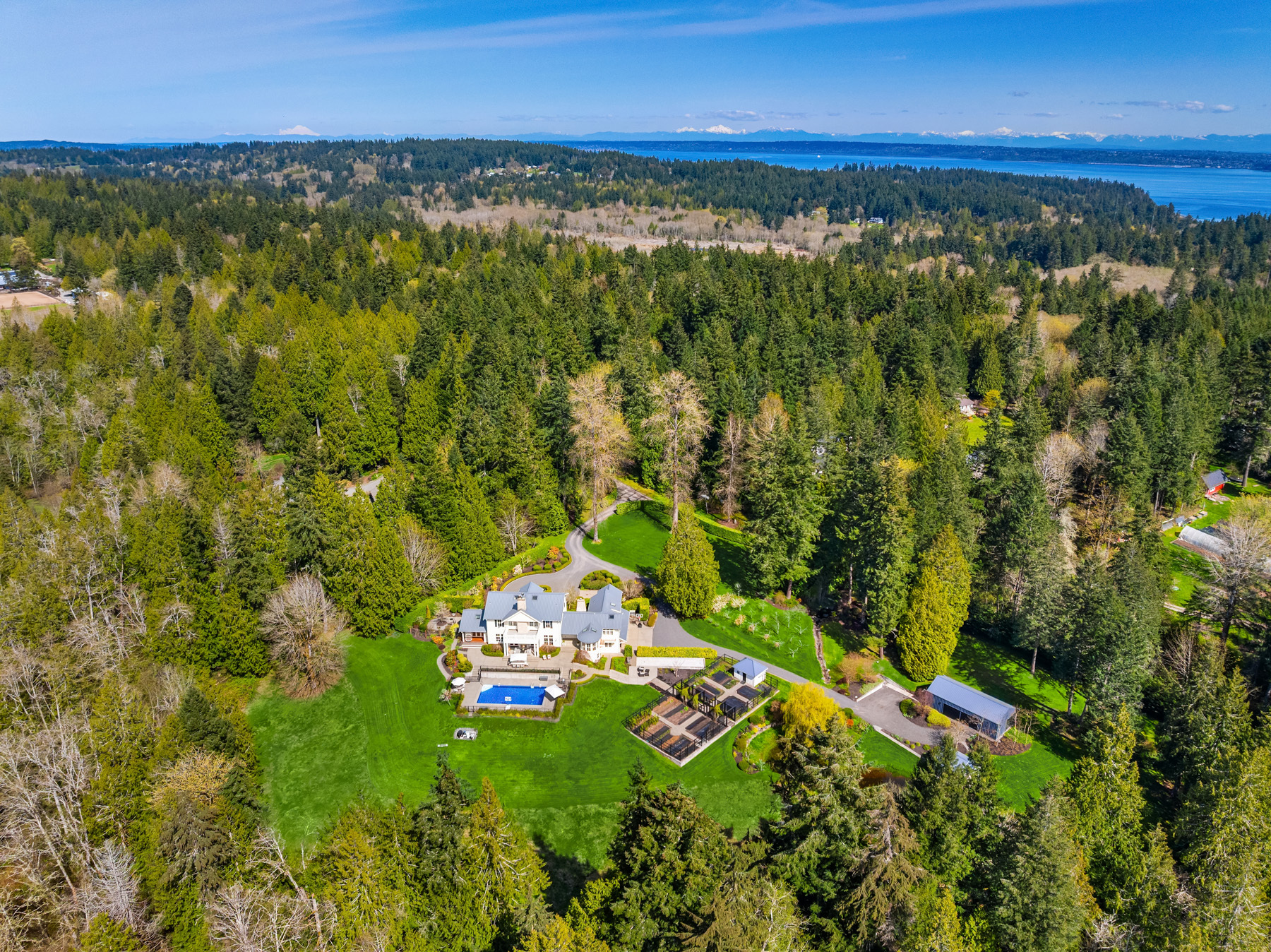 This gracious and timeless estate, set on 9.97 sunny acres, offers privacy yet is a short drive to the ferry and town. Custom built with exquisite attention to detail, the home features an open and sophisticated layout, with a main floor primary suite, 3 additional ensuite bedrooms and an attached 3-car garage. French doors lead from the living, dining and family rooms to the south facing patio, with an outdoor fireplace and swimming pool. The chef’s kitchen features a 60”Viking stove, a glass front Sub-Zero refrigerator and a dreamy pantry. Explore this special property with its peaceful territorial views and stunning gardens, a seasonal pond and an orchard with fruit trees, a bocce ball court and a modern shop/studio rebuilt in 2020.