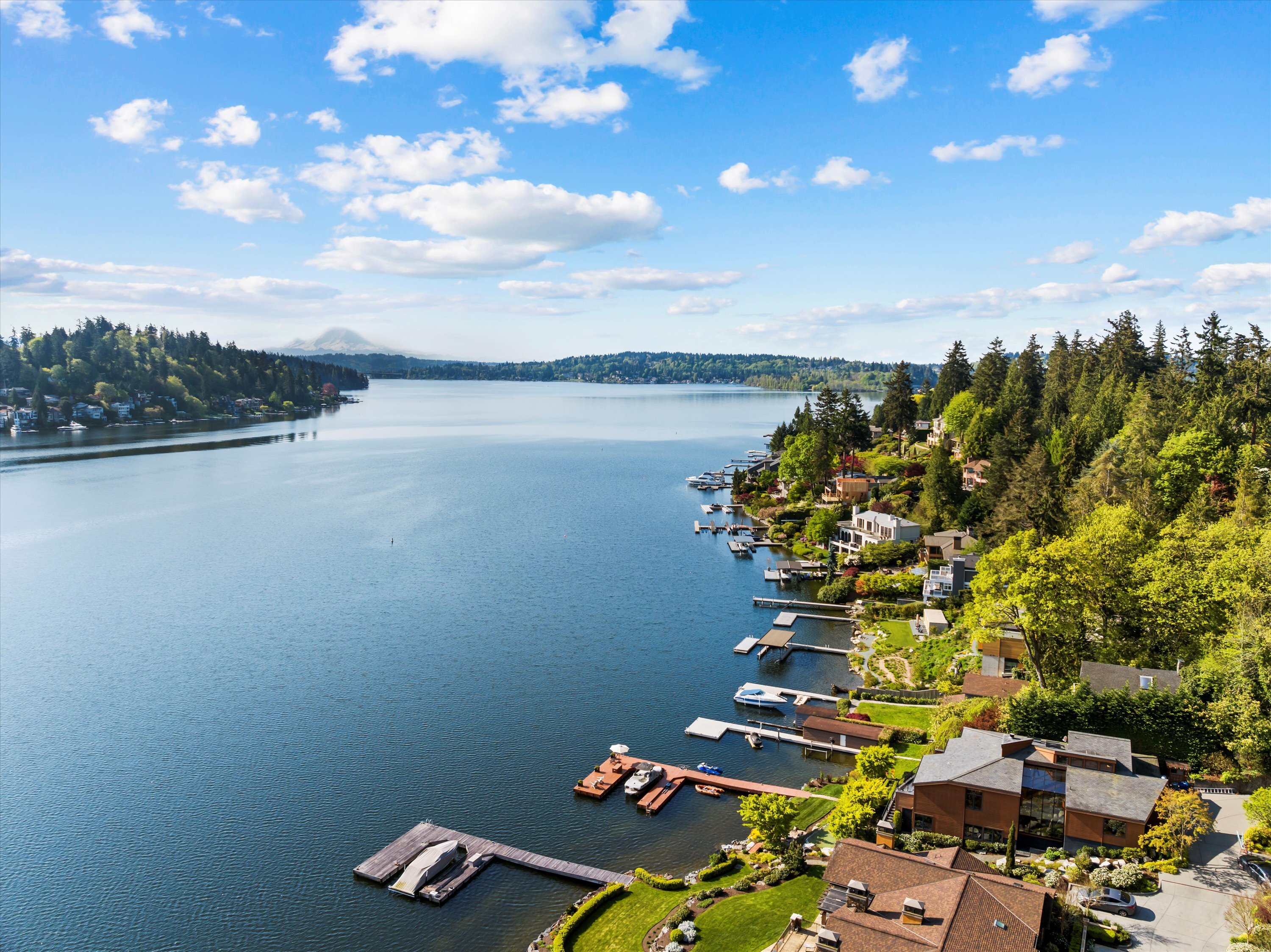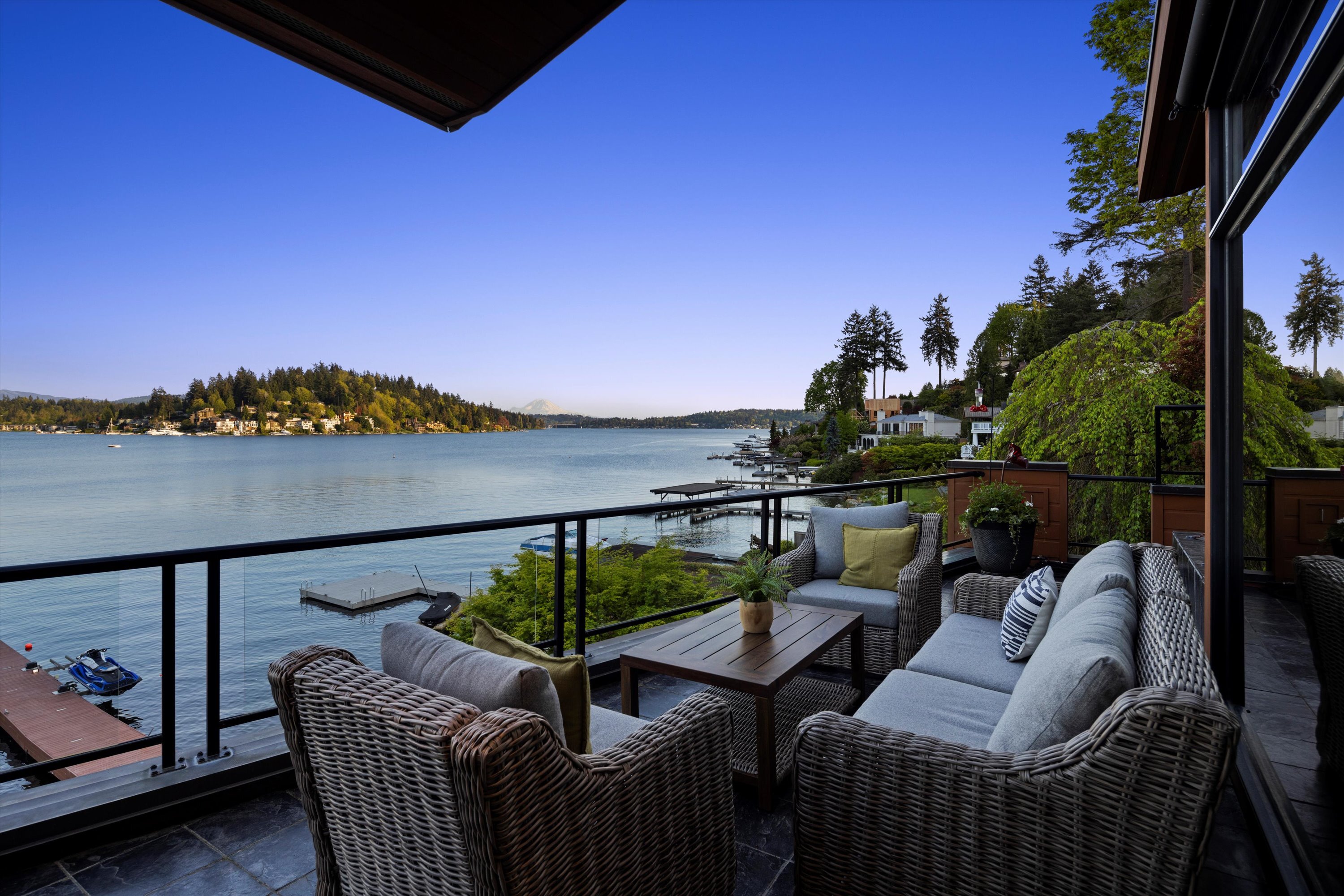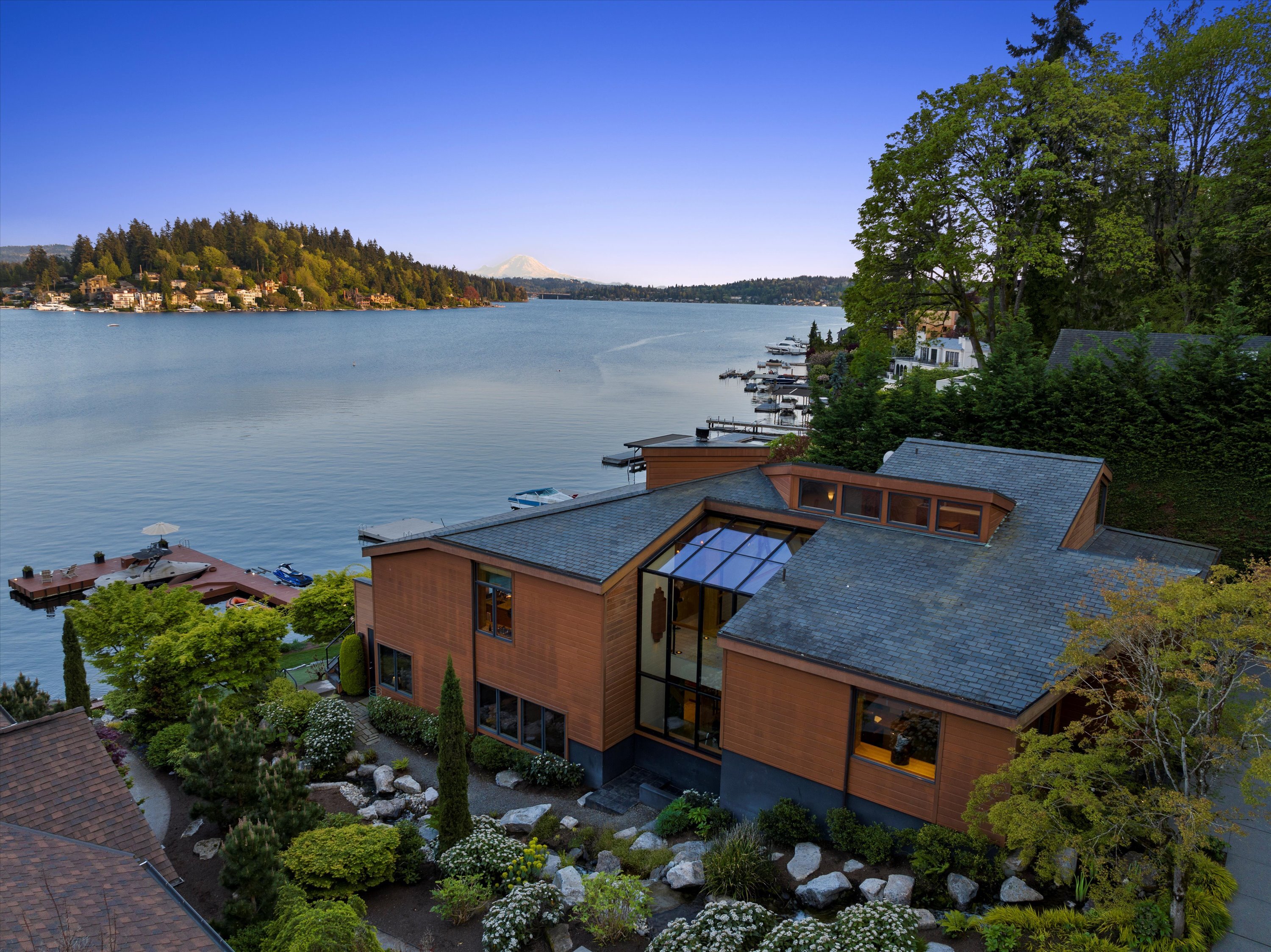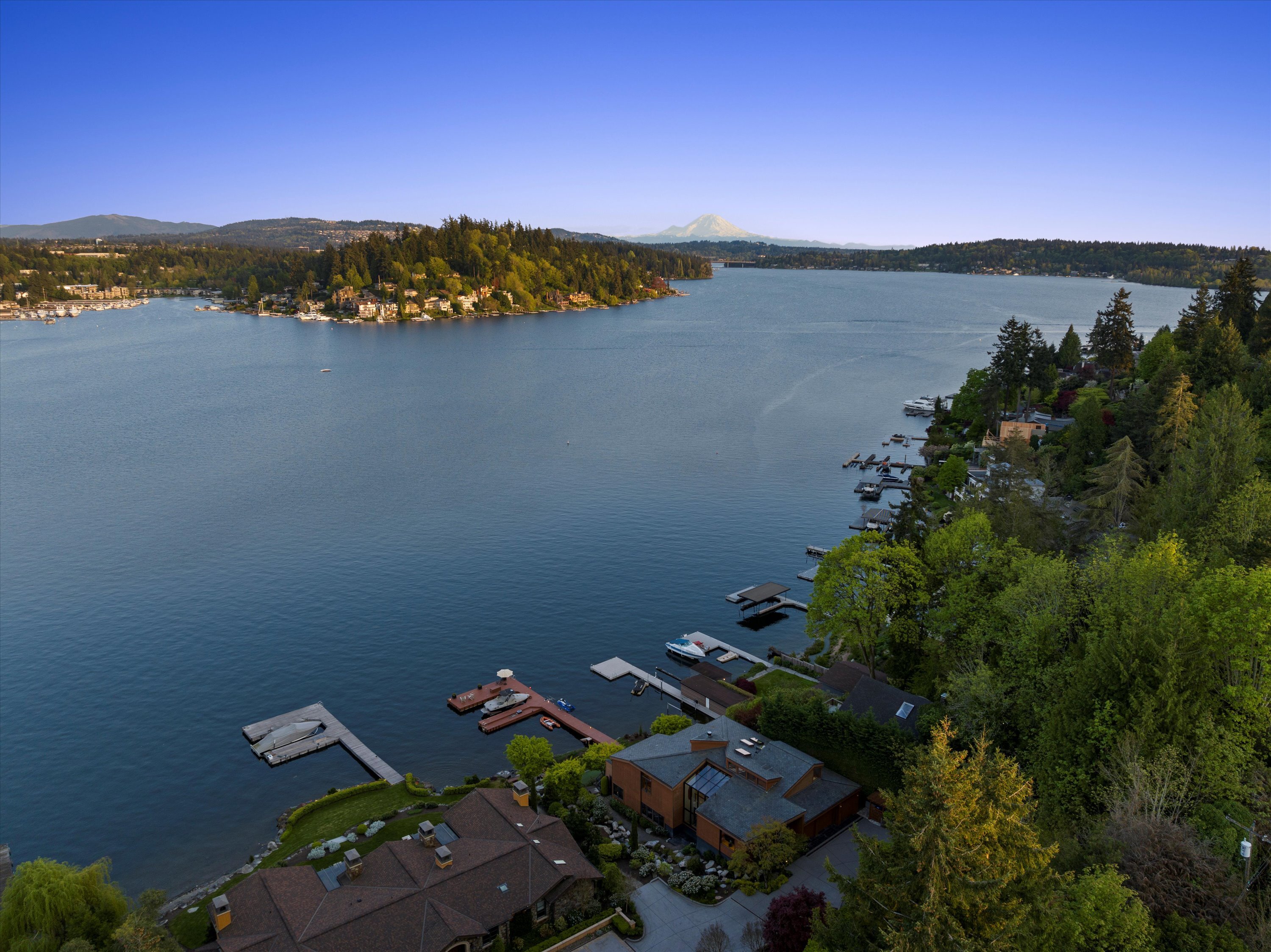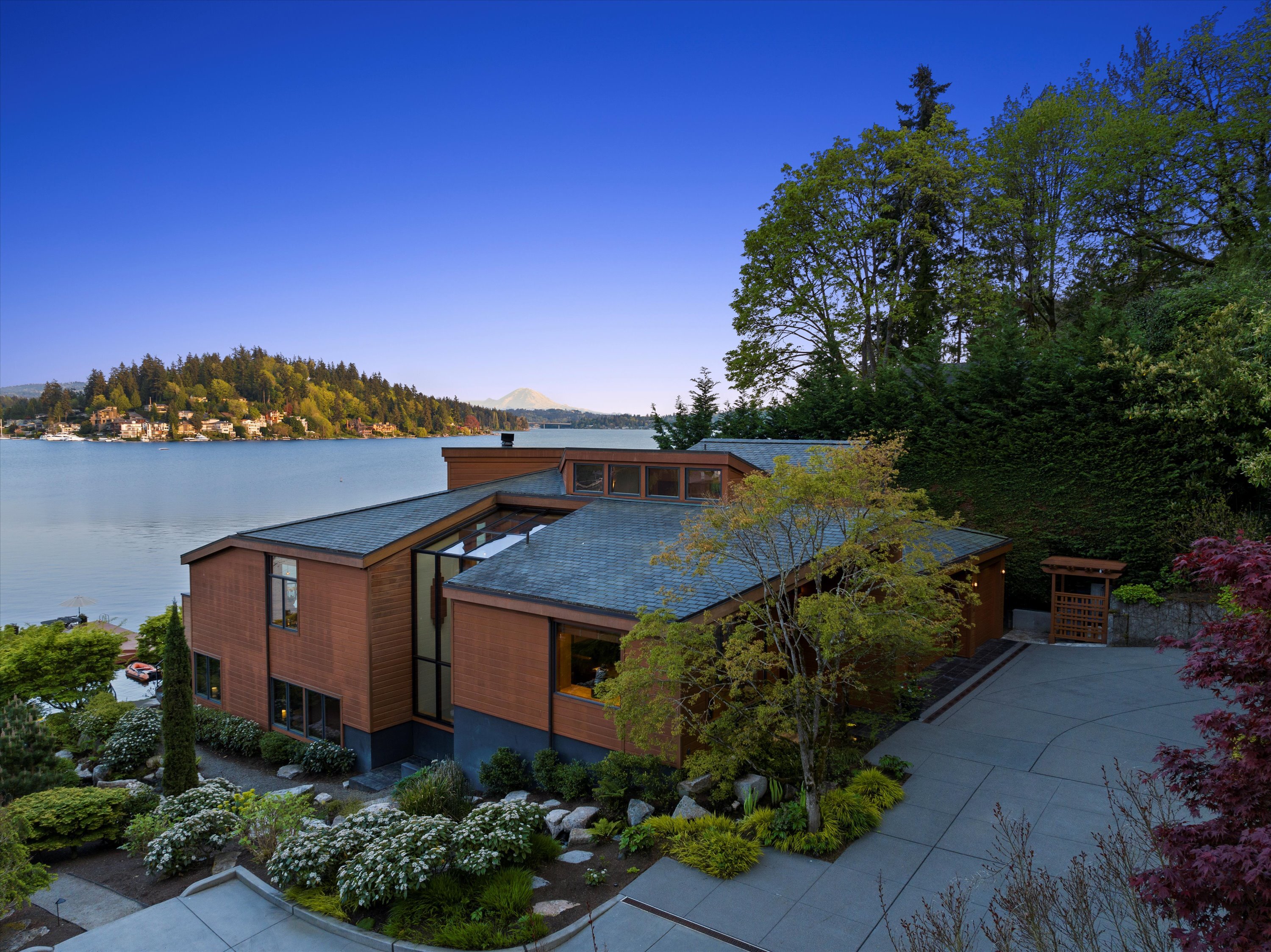 Exceptional Meydenbauer Bay south-facing waterfront work of art! Captivating views of Mt Rainier, Bellevue & the glistening waters of Lk WA. Architectural masterpiece w/cedar ceilings, walls of windows & open, light-filled floorplan. 5,580SF w/5BRs & 4BAs & view deck perfect for entertaining. Chef’s island kitchen open to living areas - all w/ exceptional lake views. Primary w/deck & spa. 2nd kitchen, wine cellar, sauna, work/flex rm & patio w/built-in BBQ. Lush grounds w/incredible waterfall, lakeside firepit & putting green. 87’ dock w/multiple lifts. A+ location 2 mins to downtown Bellevue, parks & top rated schools. Curated for effortless living & unforgettable moments, a truly extraordinary retreat where waterfront dreams are realized!